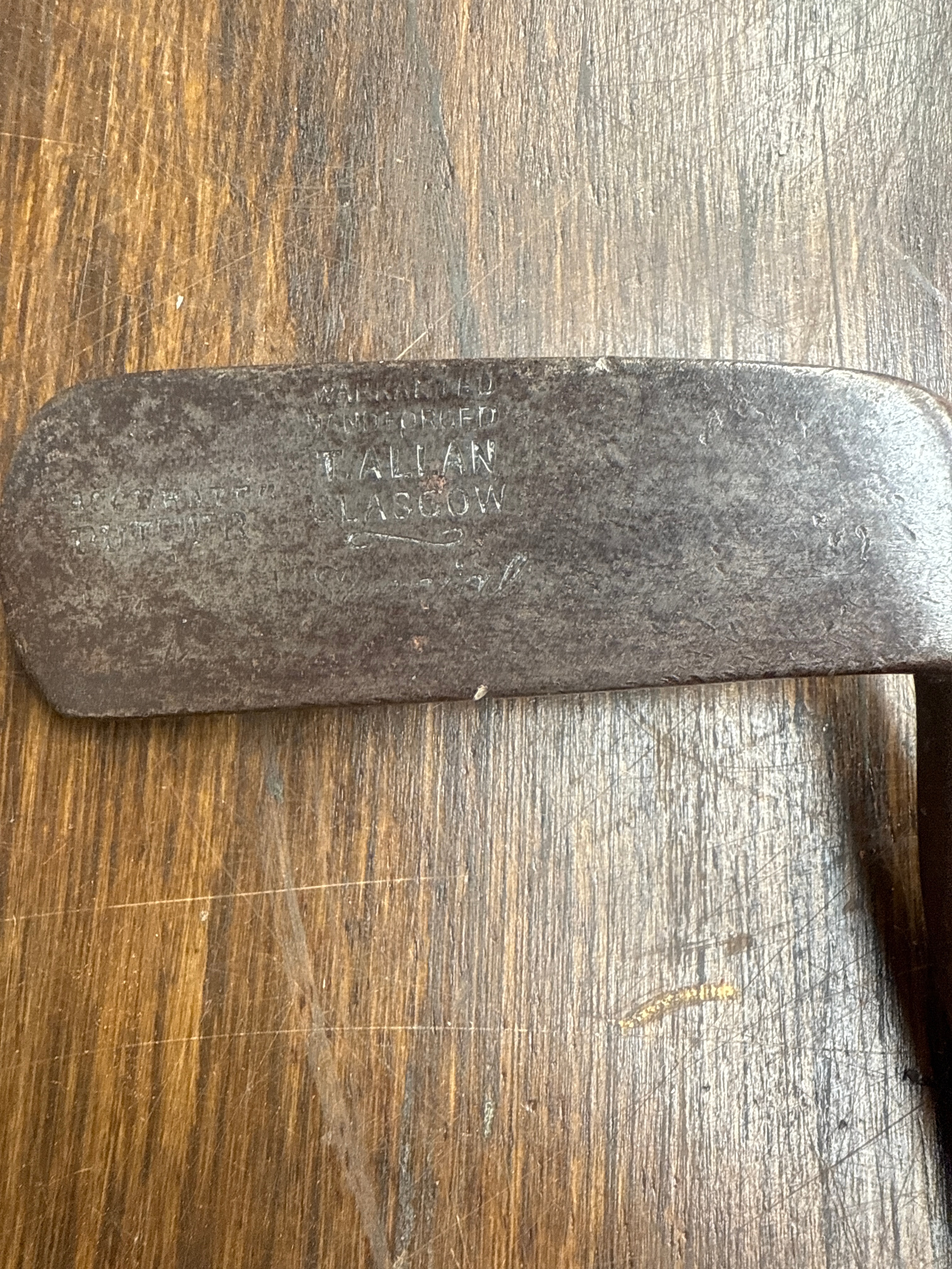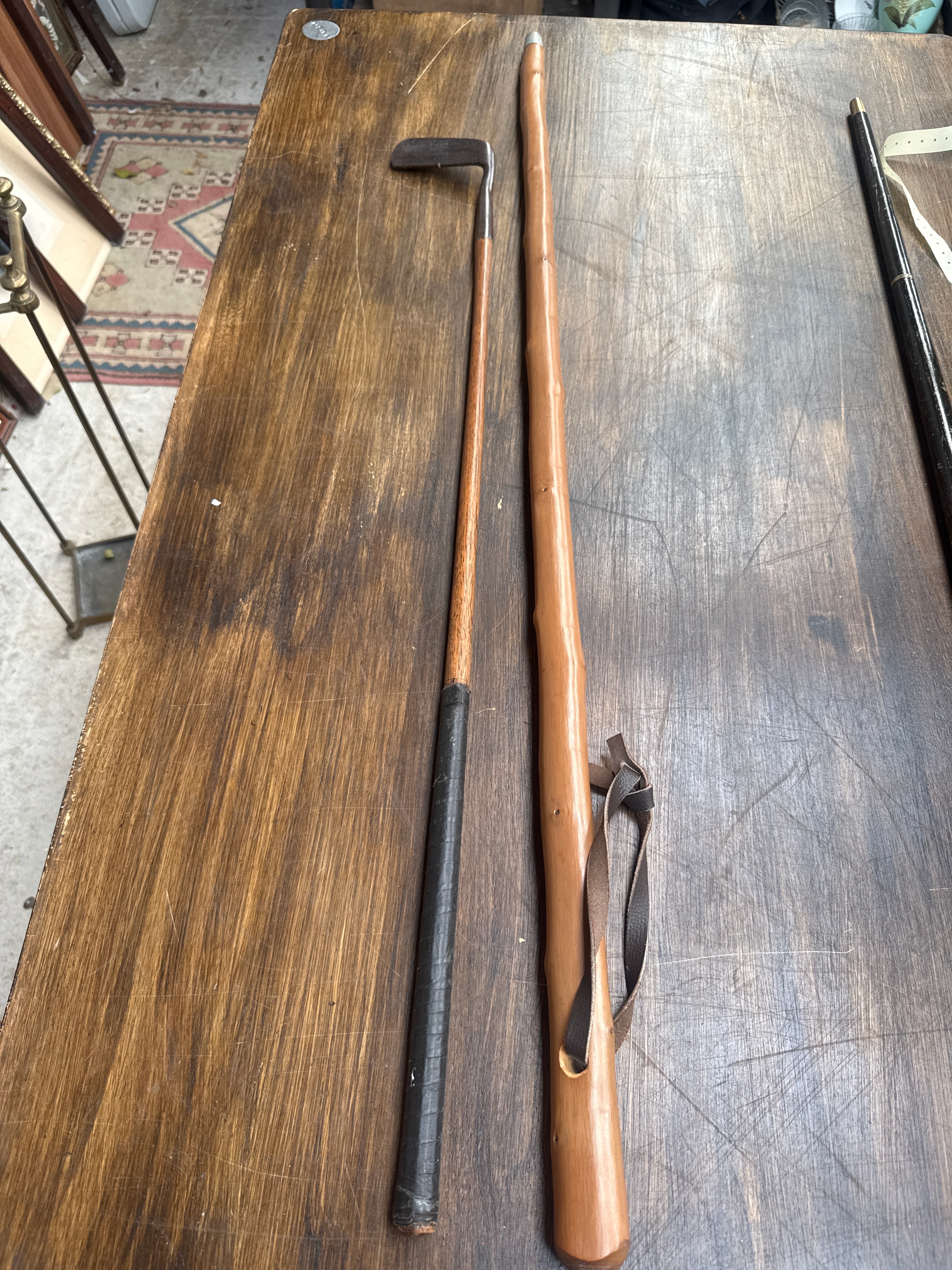 A J. Allan Glasgow Warranted Hand Forged Antique Golf Putter, featuring a wooden shaft with a black wrapped grip and a flat, oxidized metal head. The head is visibly stamped ‘WARRANTED,’ ‘HAND FORGED,’ ‘J. ALLAN,’ and ‘GLASGOW,’ with additional faint text potentially reading ‘PUTTER.’ Accompanied by a rustic walking stick, crafted from a natural piece of gnarled wood, and including a worn leather wrist strap.