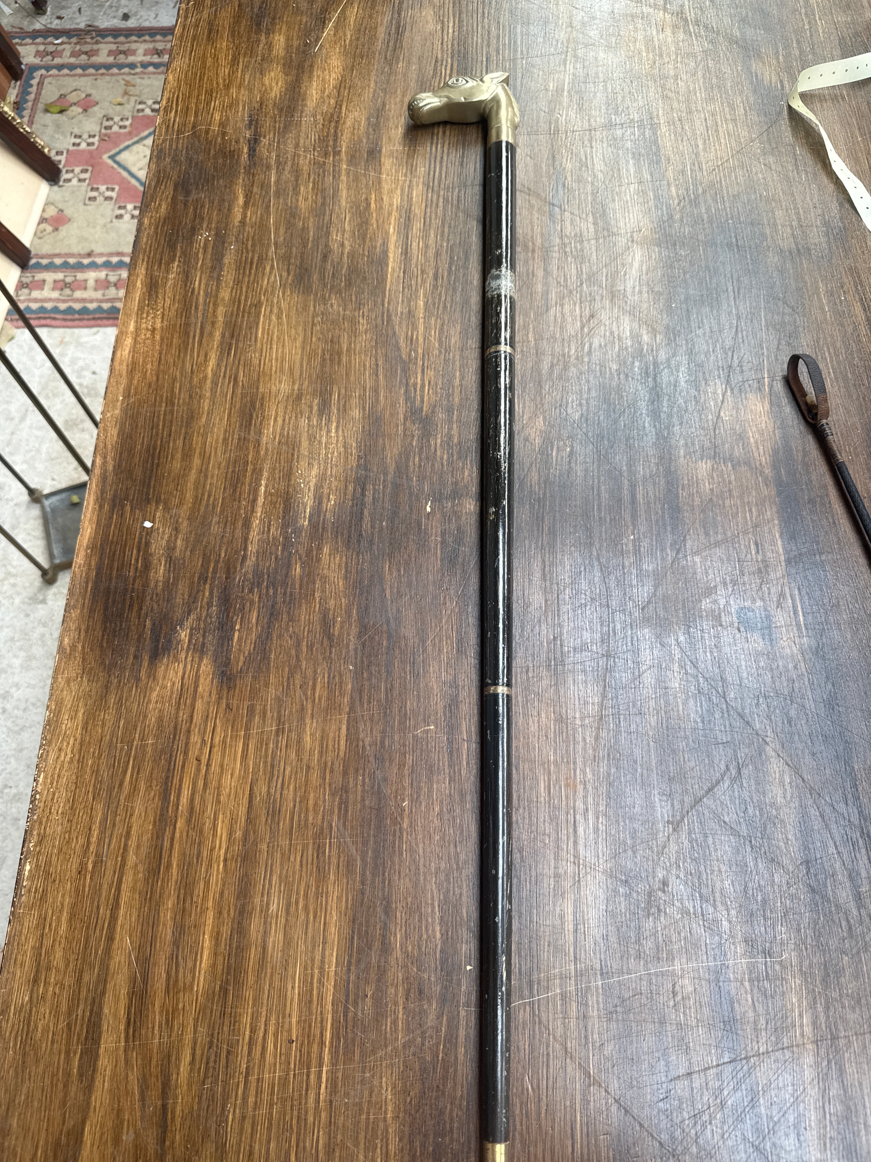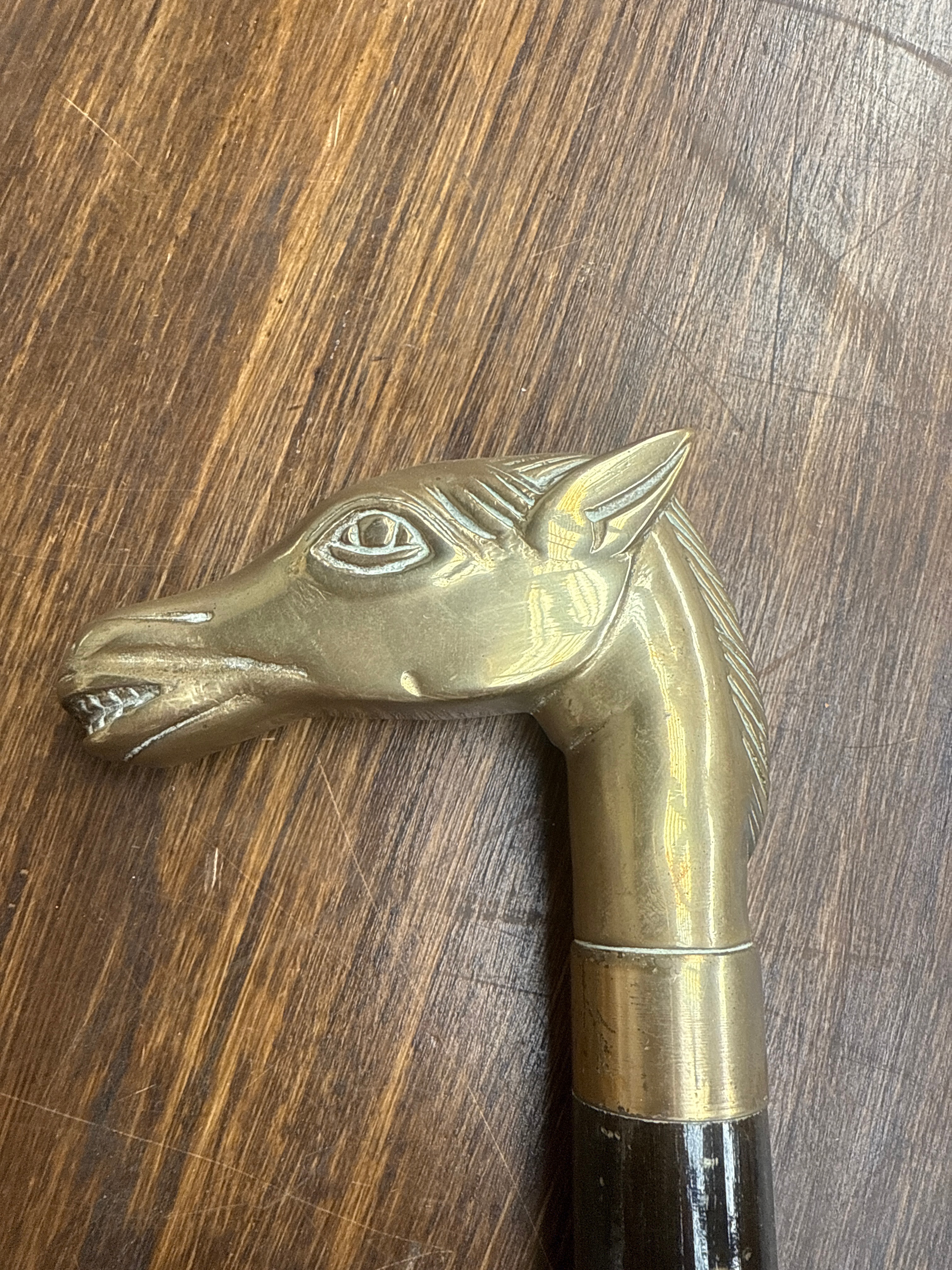 A vintage walking stick featuring a figural horse head handle, crafted from brass or a similar yellow metal, exhibiting detailed features such as eyes, ears, mane, and bared teeth. The shaft is dark, possibly lacquered or painted wood, adorned with several narrow brass bands along its length and a broader brass collar beneath the handle.