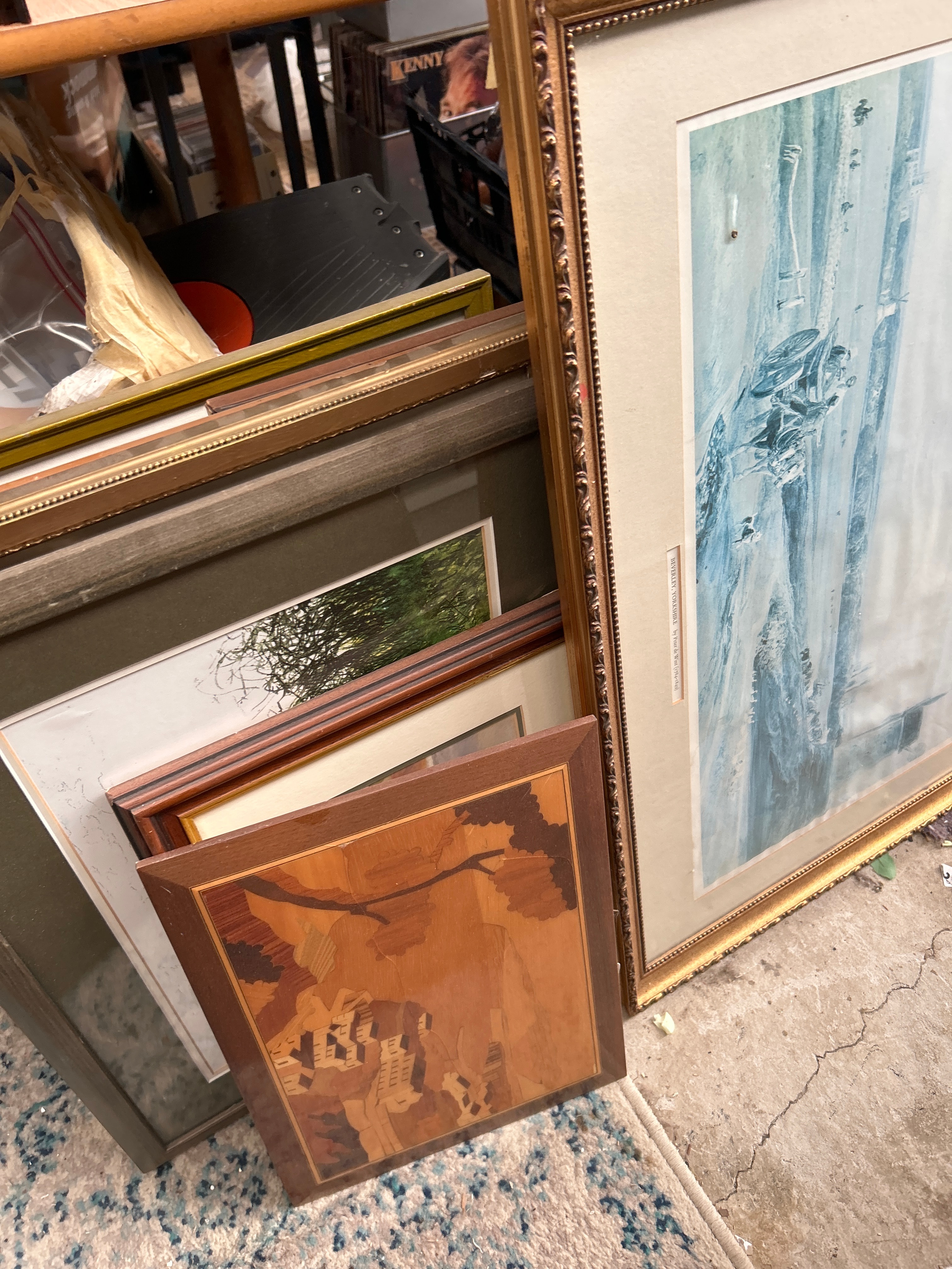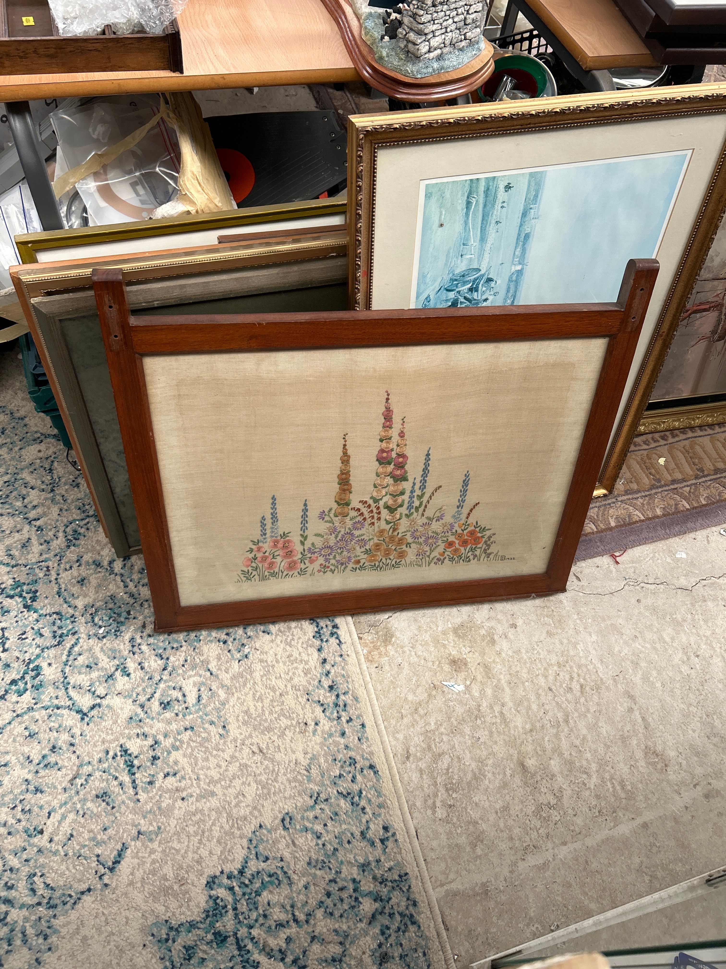 An Antique Wood Fireplace Screen featuring a rectangular dark reddish-brown wooden frame with vertical extensions at the top corners. The central panel consists of a light-colored textile, likely linen, adorned with a colorful needlepoint artwork depicting stylized floral arrangements or topiaries and scattered smaller flowers in muted pastel tones. No visible text or markings are apparent on the screen itself.