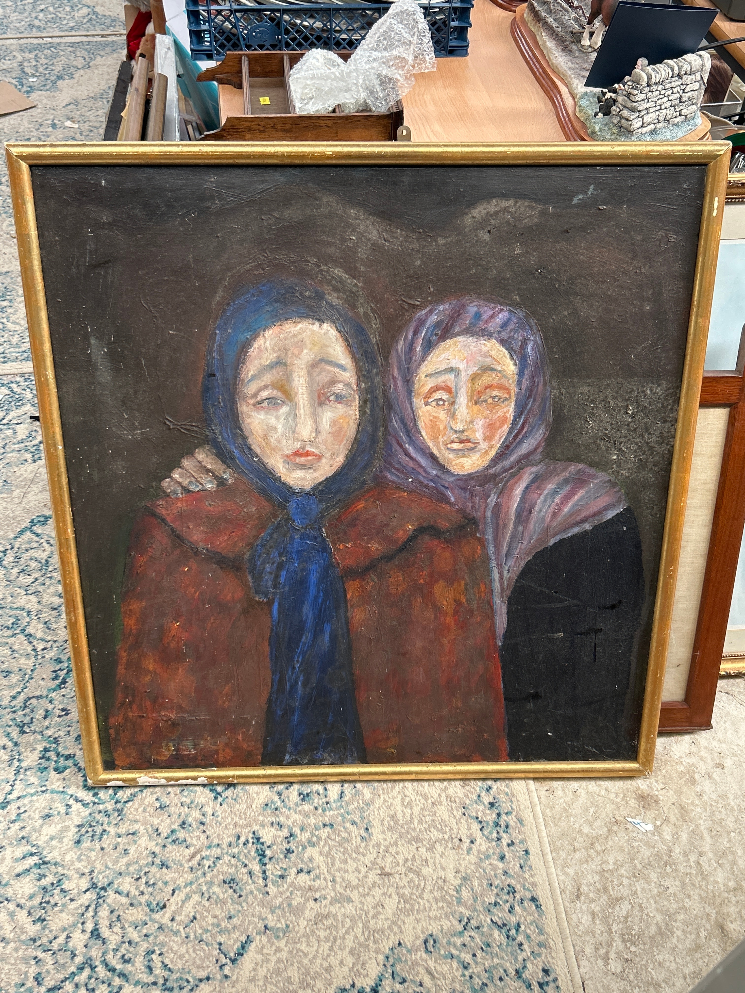 An expressive, figurative oil painting depicting a double portrait of two figures, likely women, from the 20th century. The medium appears to be oil on canvas or board, characterized by visible brushstrokes and impasto in areas. Both figures wear head coverings and coats, with one figure’s arm resting on the other’s shoulder. The painting is housed in a simple, gilded wooden frame.