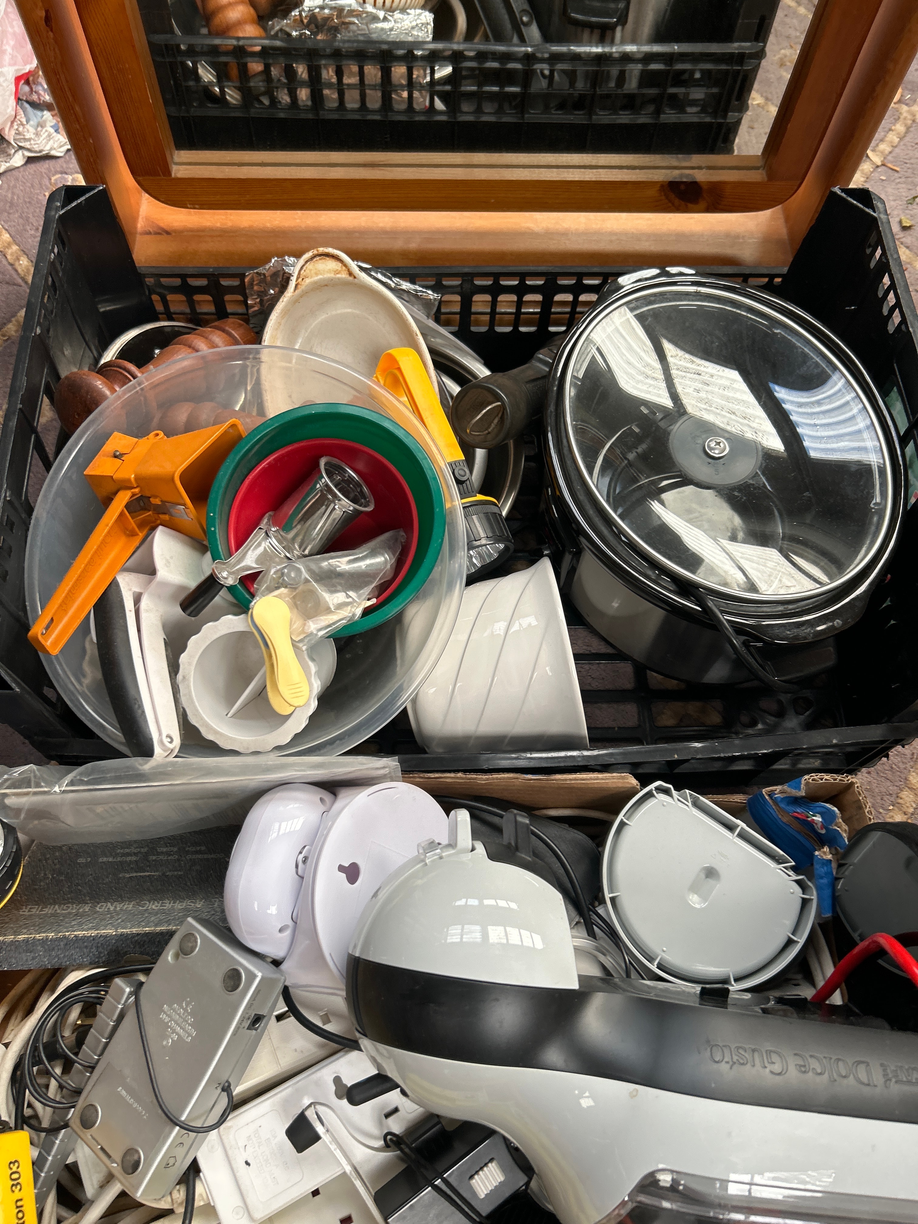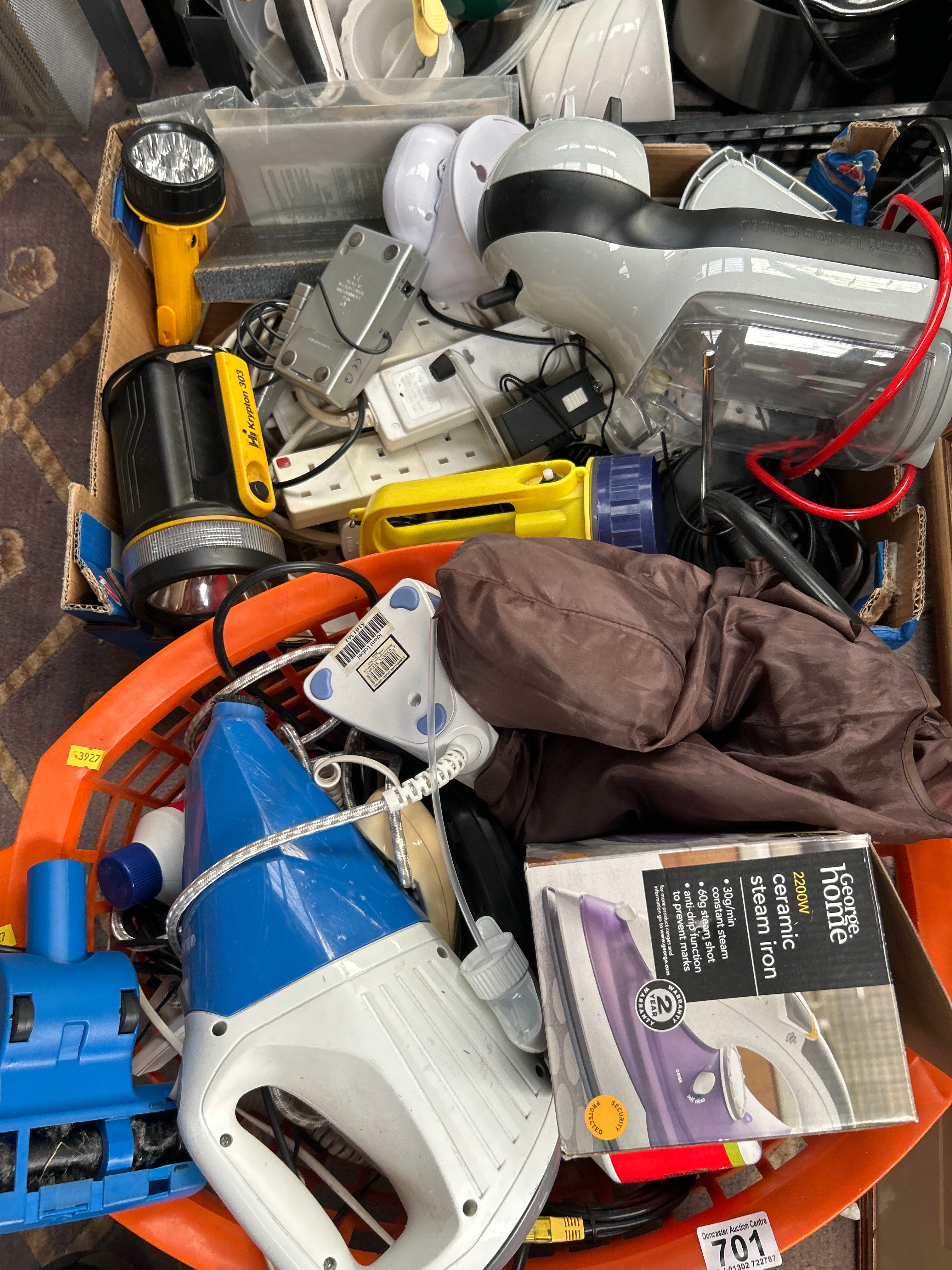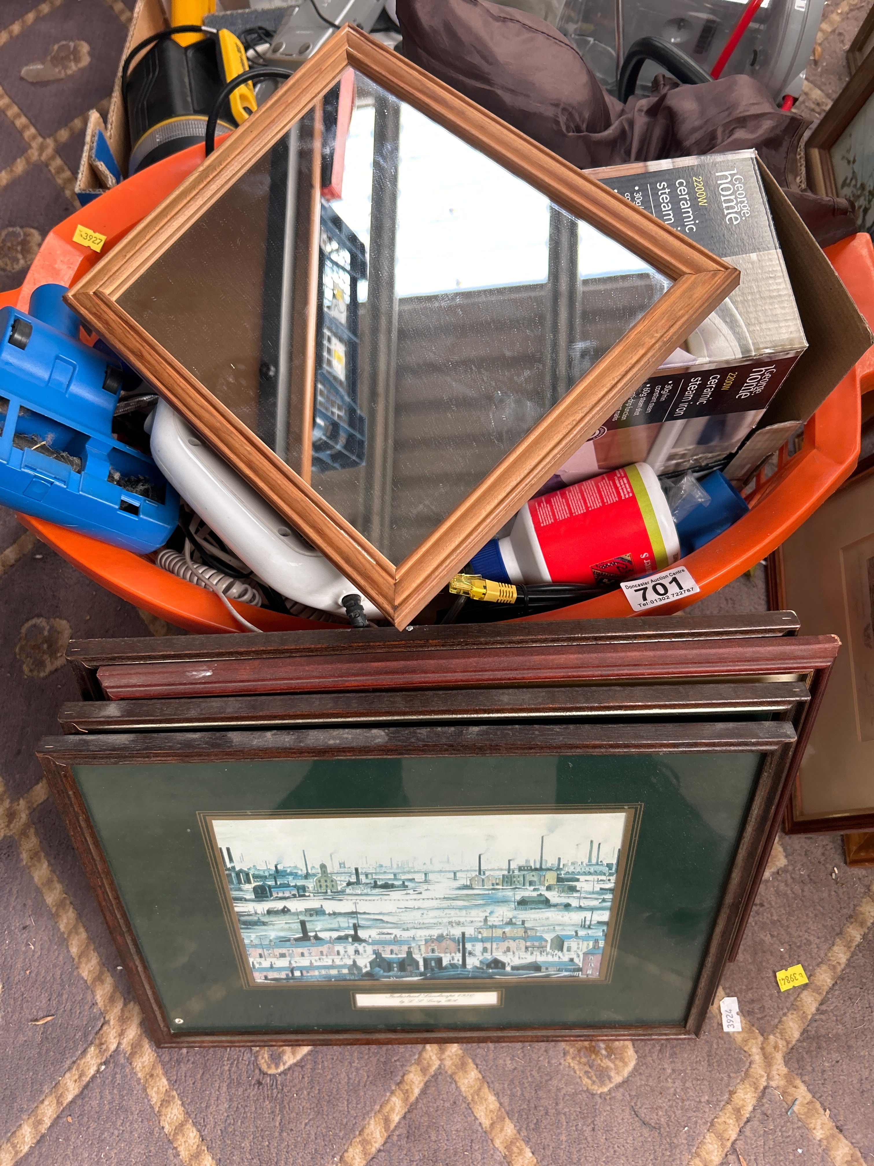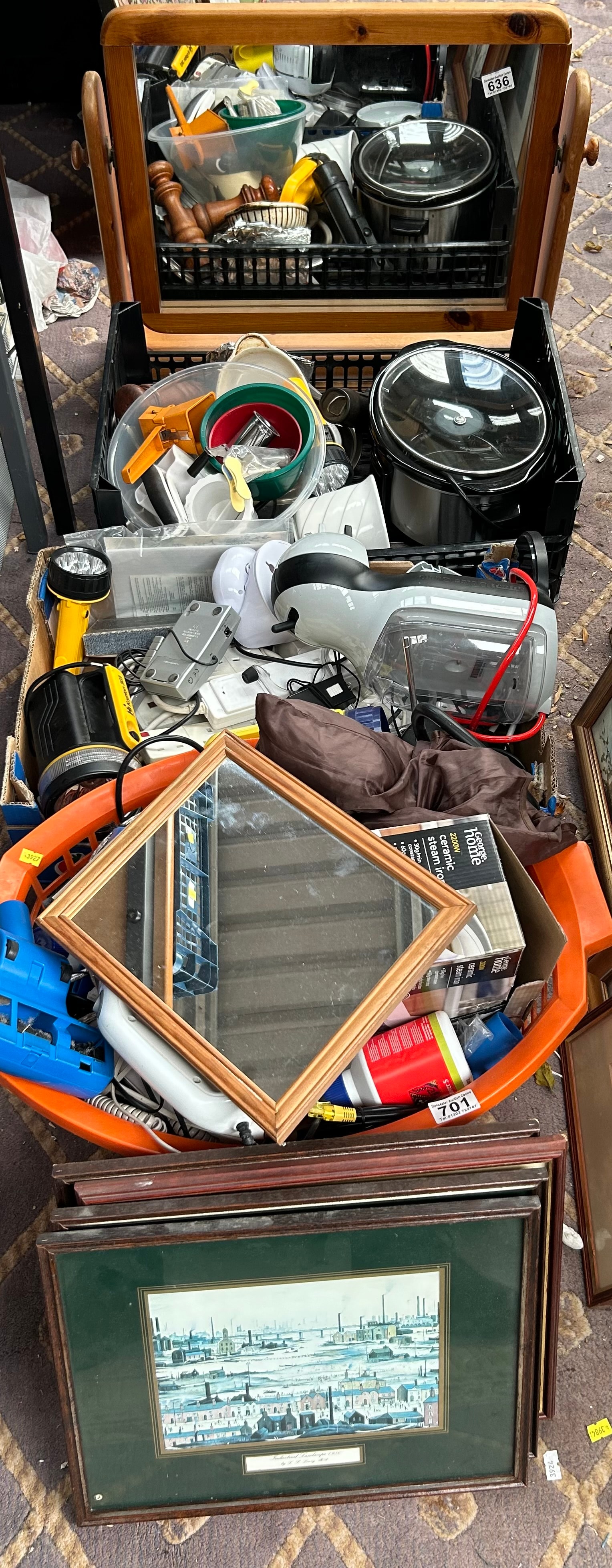 An Anthony Forster print titled ‘Teapot Factory, Longport’, pencil signed, depicting an urban or industrial landscape, presented with a green mat and a dark wood frame. Also included is a diverse collection of contemporary household goods, primarily from the late 20th to early 21st century. This encompasses various small kitchen appliances and electronics, including a slow cooker, a Dolce Gusto coffee machine, multiple flashlights, power strips, a handheld vacuum or steamer, and a boxed ‘George Home 2200W ceramic steam iron’. Further items comprise a selection of kitchenware such as plastic bowls and utensils, a square mirror with a light wood frame, and a stack of additional framed artworks. Auction lot numbers ‘636’ and ‘701’ are visible on parts of the collection.