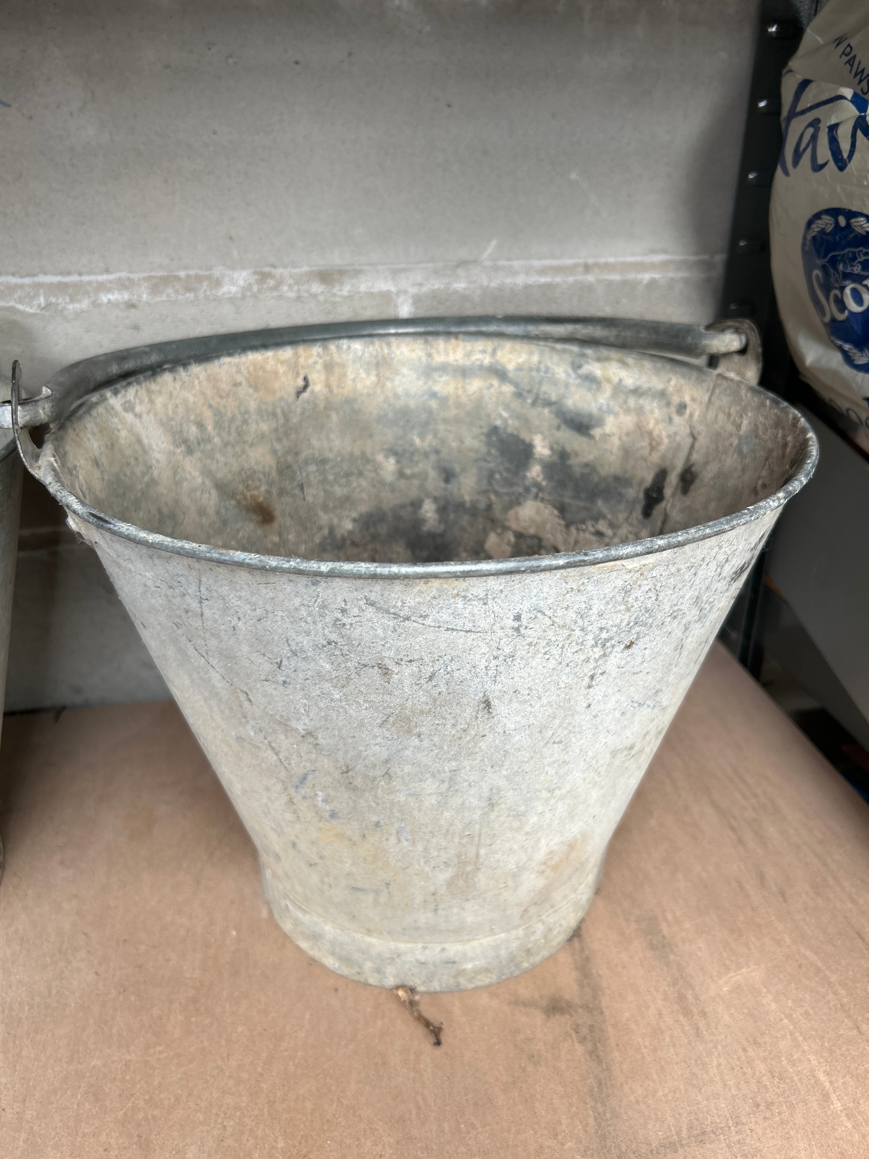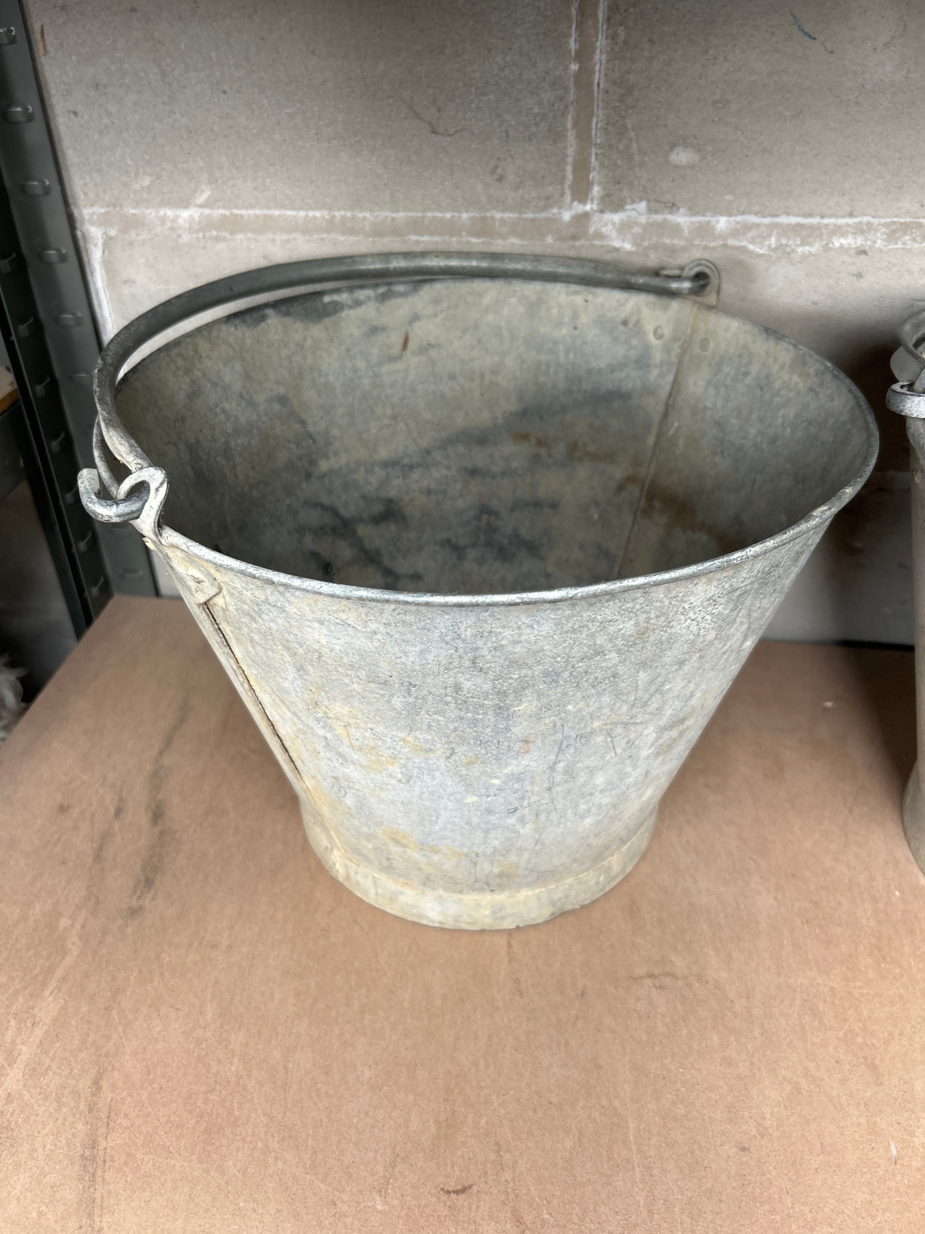 This lot comprises two utilitarian, tapered metal buckets, constructed from galvanized steel, each fitted with a wire bail handle. Their design is simple and functional, consistent with vintage or agricultural use. A partially visible white sack with blue English text, including “W PAWS” and “SCOTT,” is present in the background and is not part of this lot.