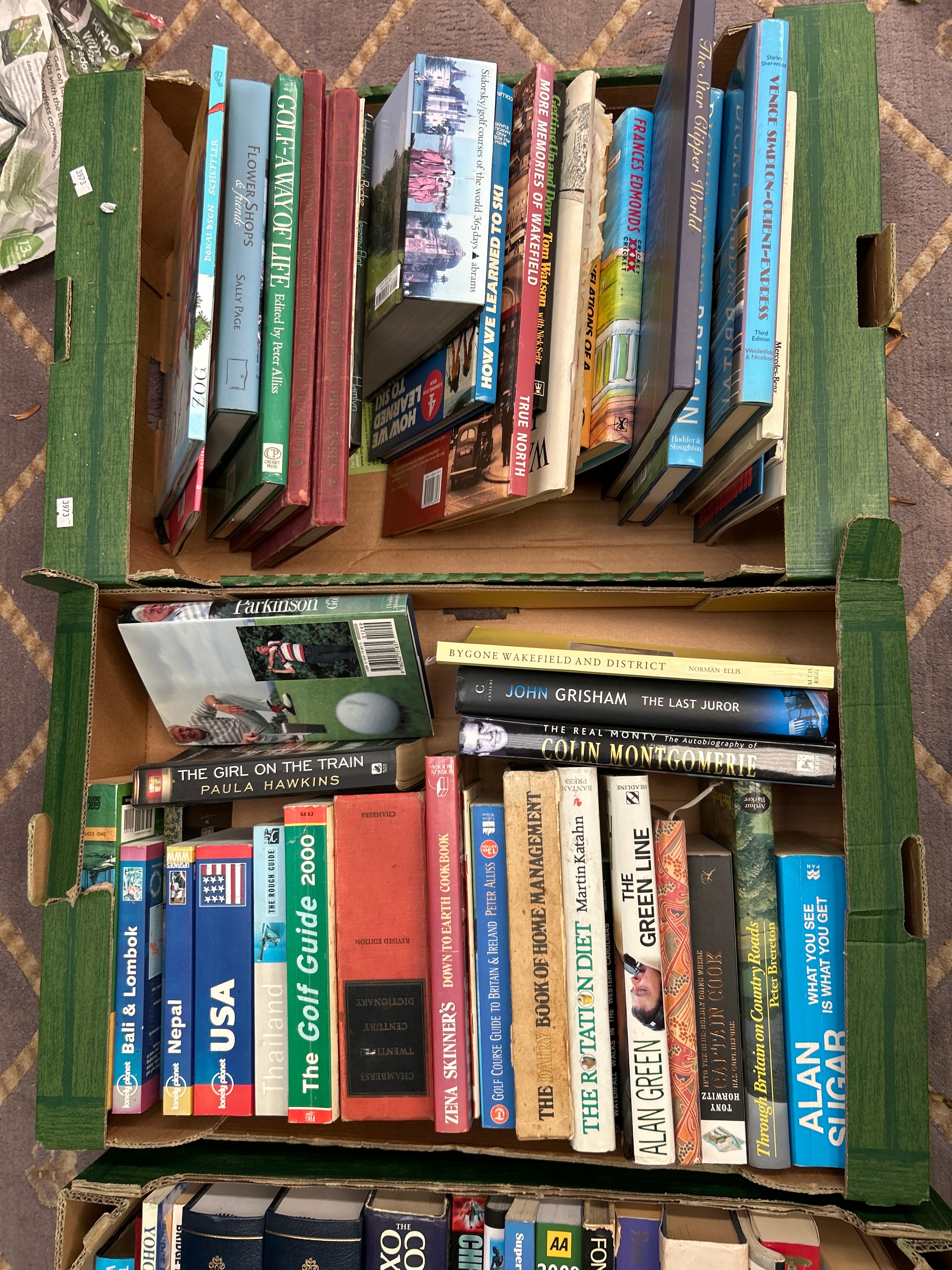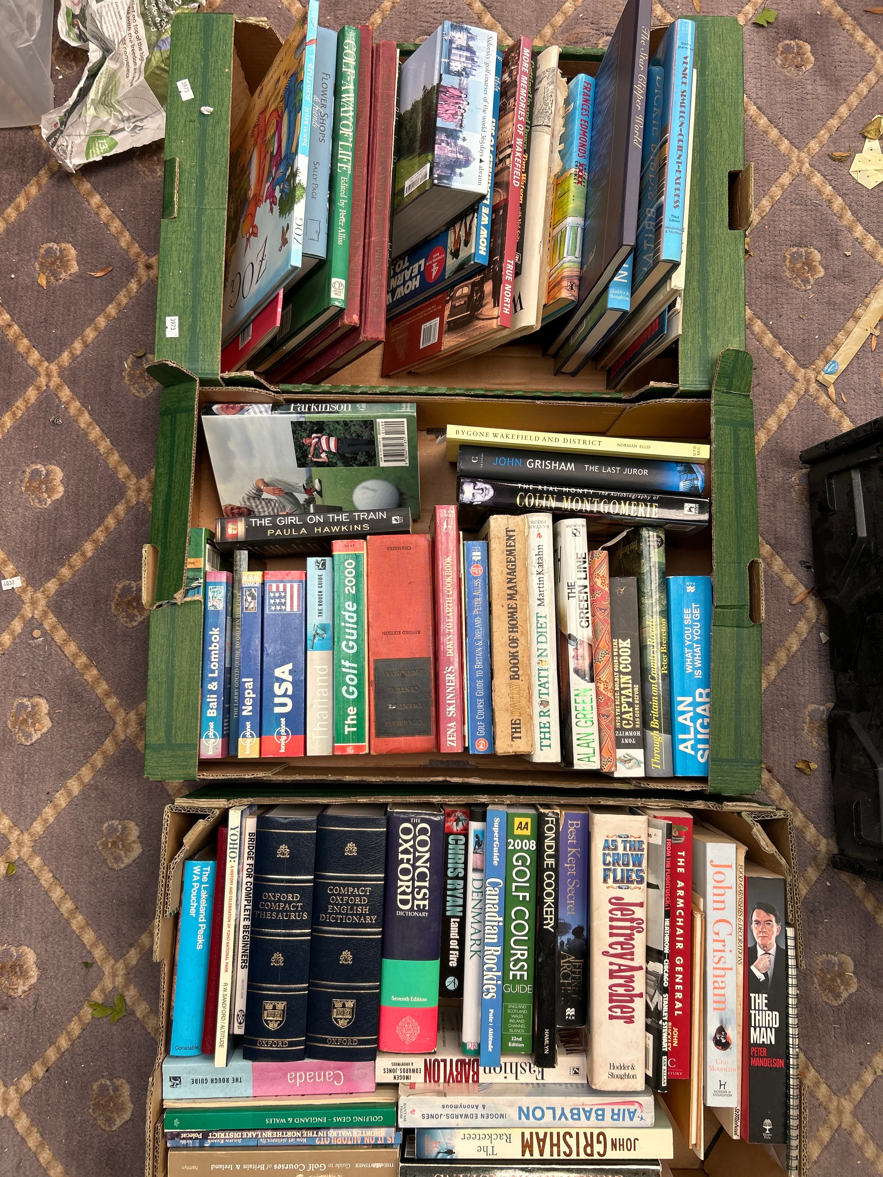 A collection of books contained within three green corrugated cardboard boxes. Comprising primarily paperbacks and hardcovers, predominantly contemporary, dating from the late 20th to early 21st century. Genres include popular fiction (e.g., Paula Hawkins, John Grisham, Jeffrey Archer), non-fiction (biographies such as Alan Sugar’s ‘What You See Is What You Get’), travel guides (for USA, Nepal, Thailand, Canada), sports guides (‘The Golf Guide 2000,’ ‘AA 2008 Golf Course Guide’), and reference works, including several Oxford dictionaries. Construction materials are standard paper, cardboard, and cloth/laminate for bindings. All visible text is in English.