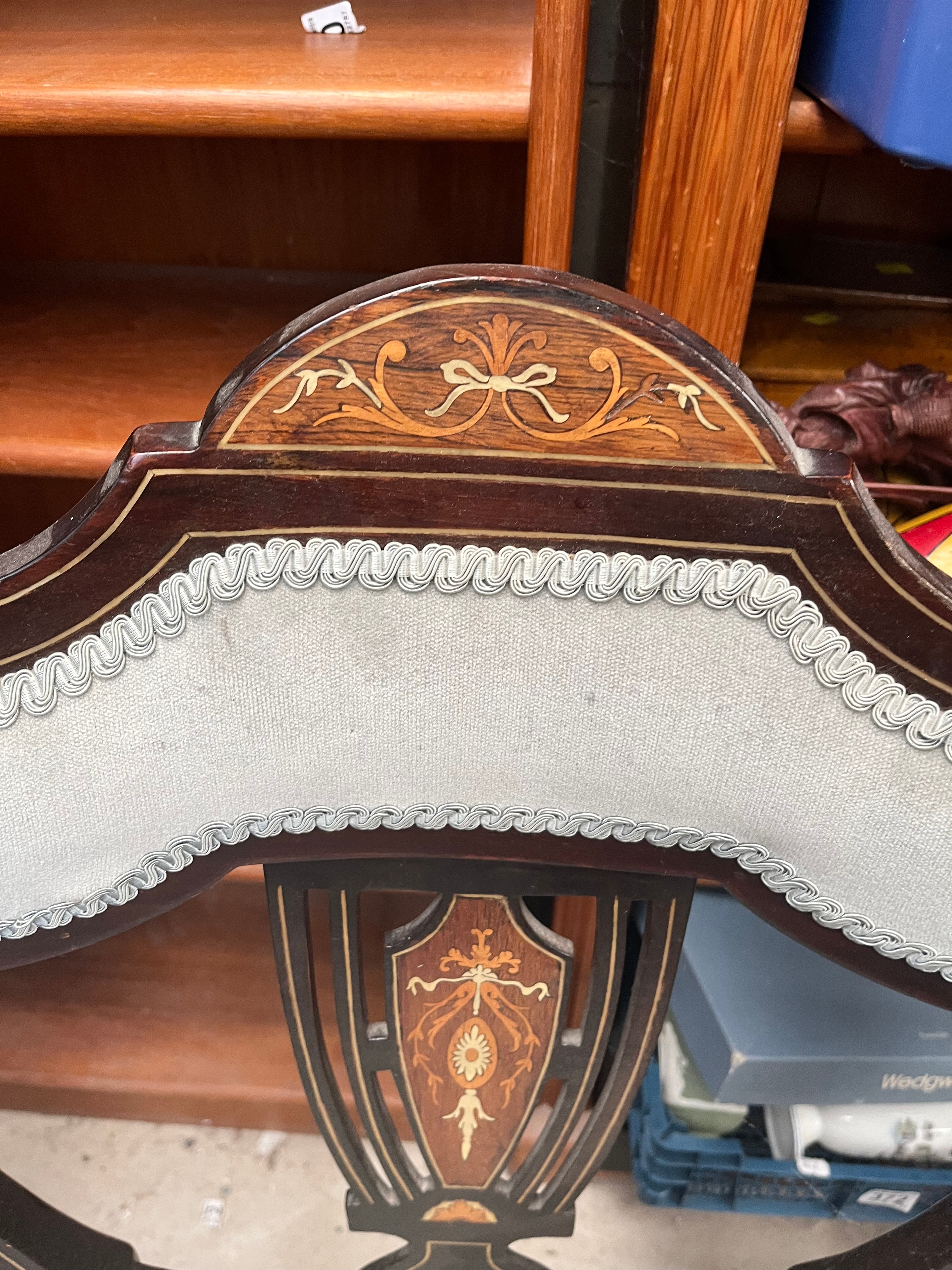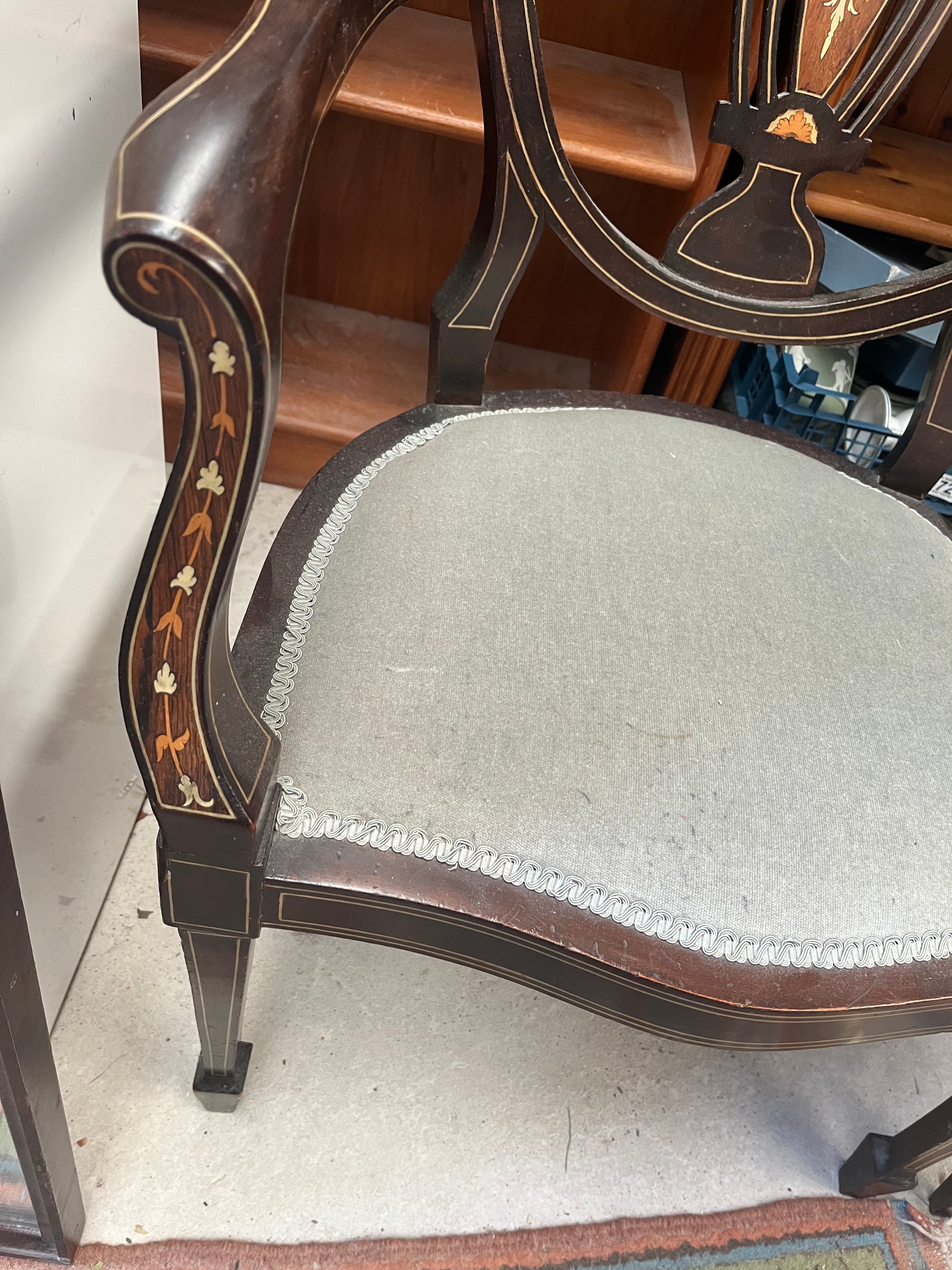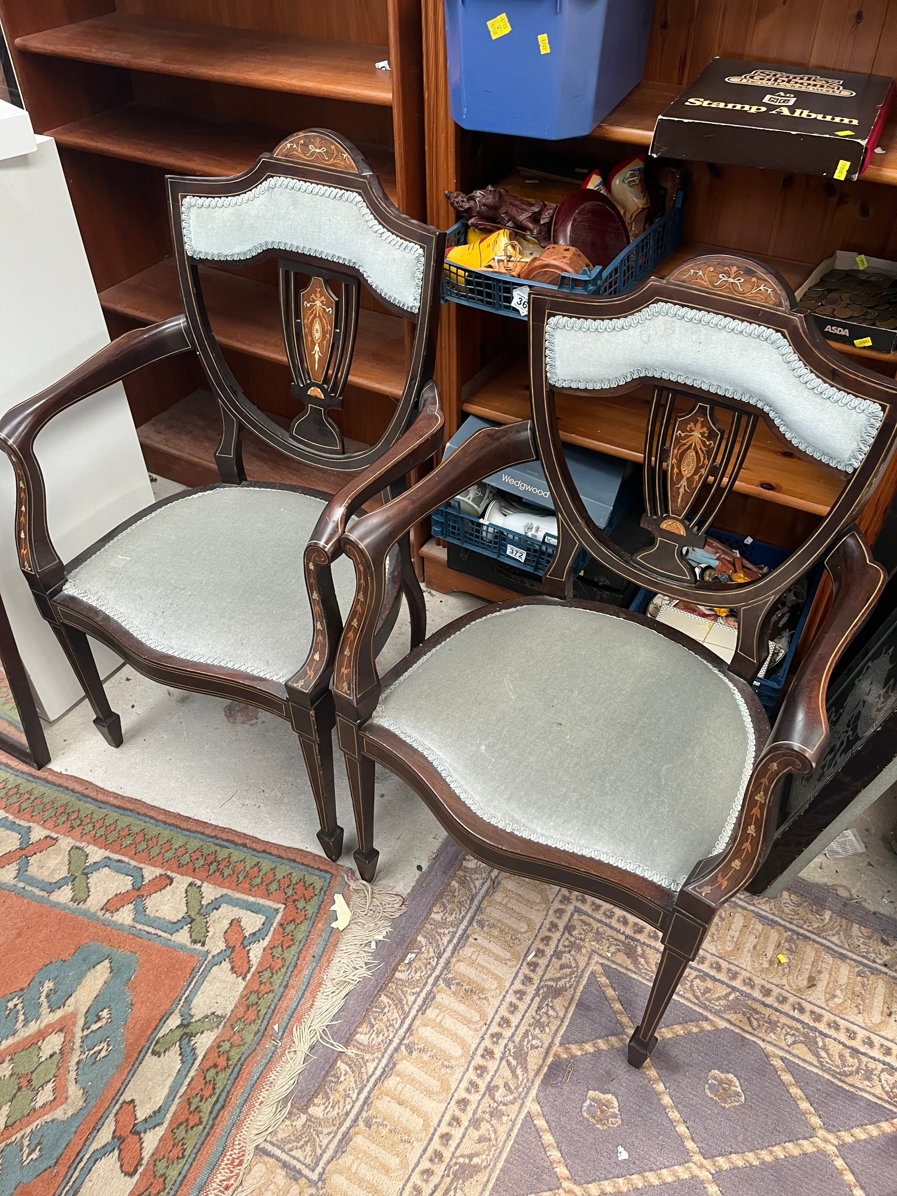 A pair of Edwardian inlaid armchairs, crafted from dark-stained wood in a Neoclassical or Georgian Revival style. Each chair features a shield-back and extensive light-wood inlay depicting floral and foliate motifs on the frames and arms. The chairs are upholstered in a light blue-grey fabric with a decorative trim. Also included is a rustic, red-painted wooden crate with a rusted metal top, marked ‘WALTER LUND LTD’, ‘KIRKGATE MARKET’, ‘LEEDS’, containing various sundry items.