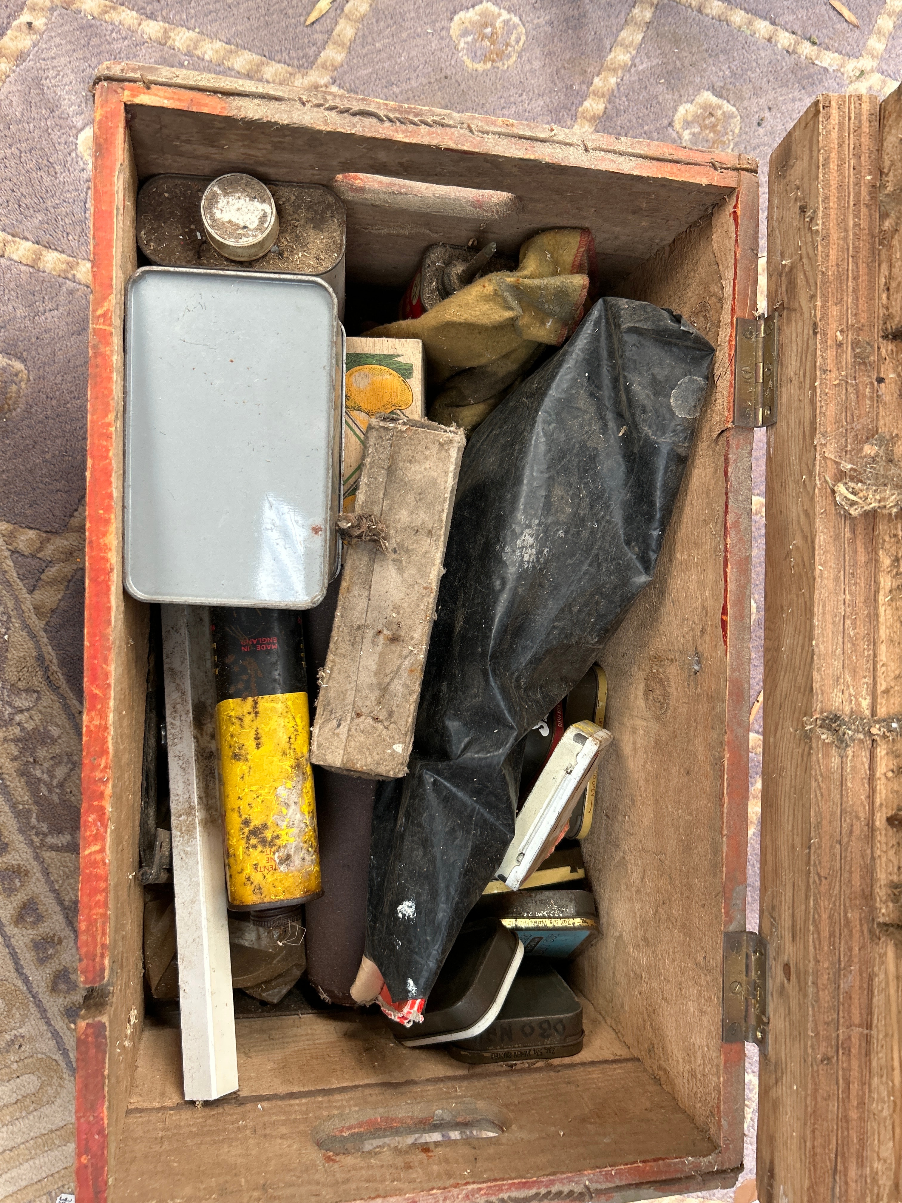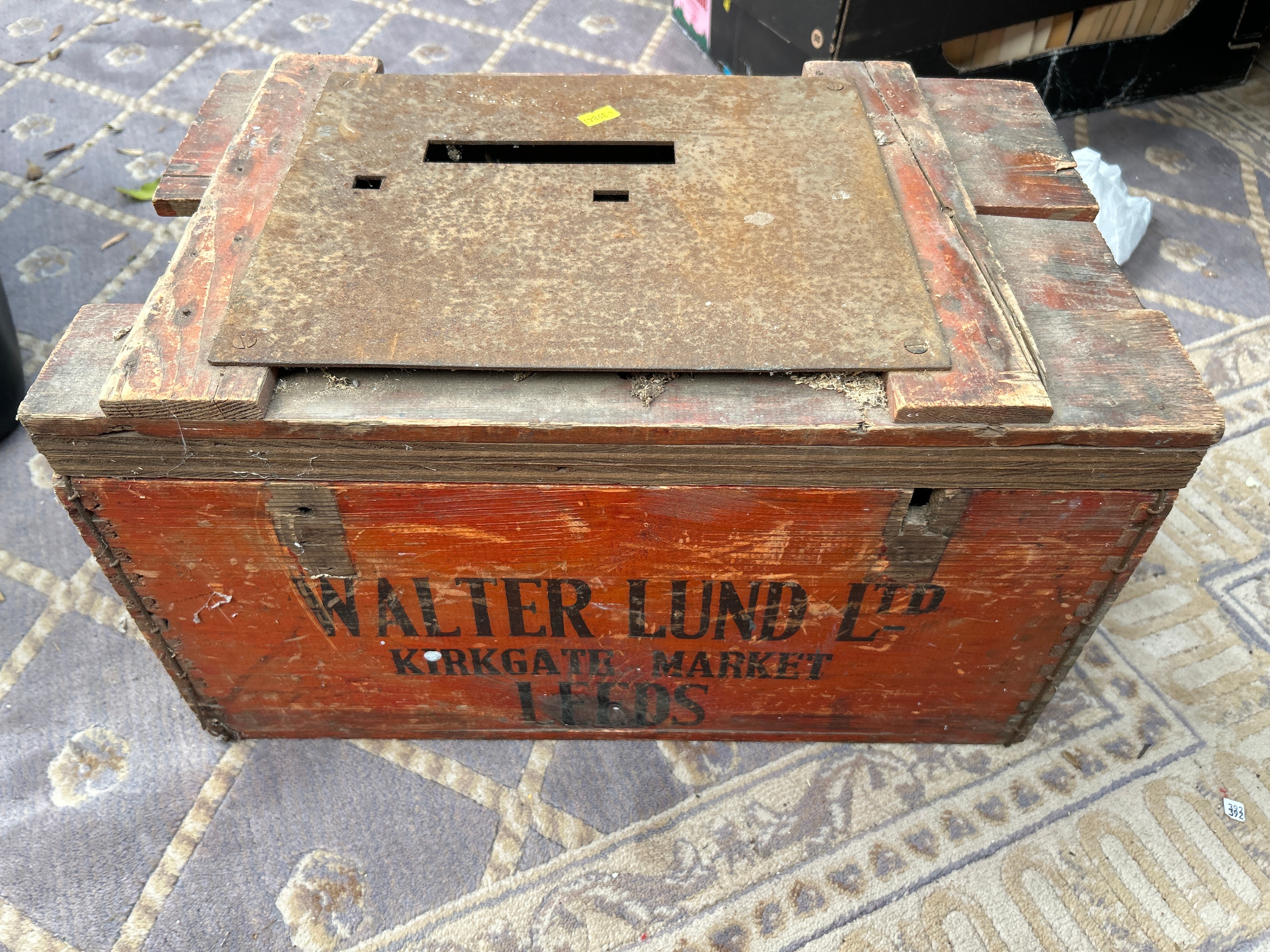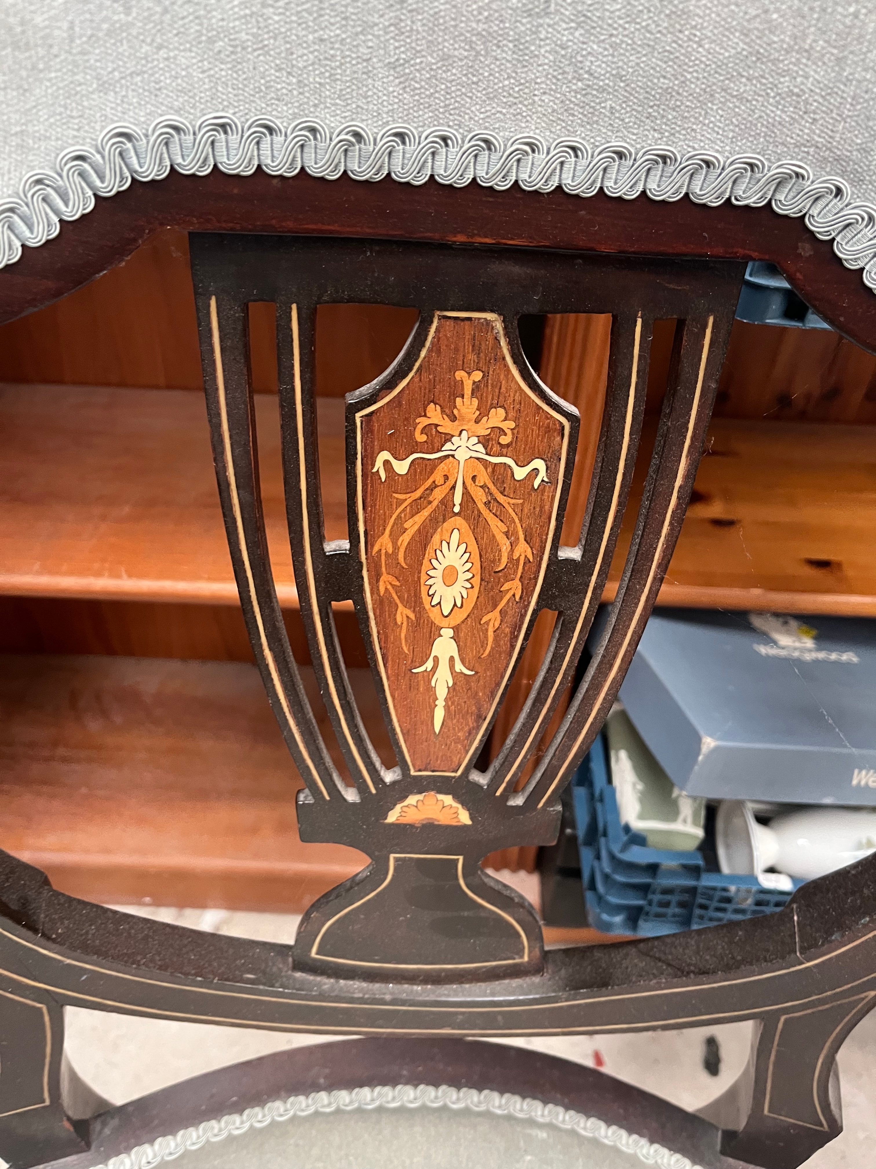 A pair of Edwardian inlaid armchairs, crafted from dark-stained wood in a Neoclassical or Georgian Revival style. Each chair features a shield-back and extensive light-wood inlay depicting floral and foliate motifs on the frames and arms. The chairs are upholstered in a light blue-grey fabric with a decorative trim. Also included is a rustic, red-painted wooden crate with a rusted metal top, marked ‘WALTER LUND LTD’, ‘KIRKGATE MARKET’, ‘LEEDS’, containing various sundry items.