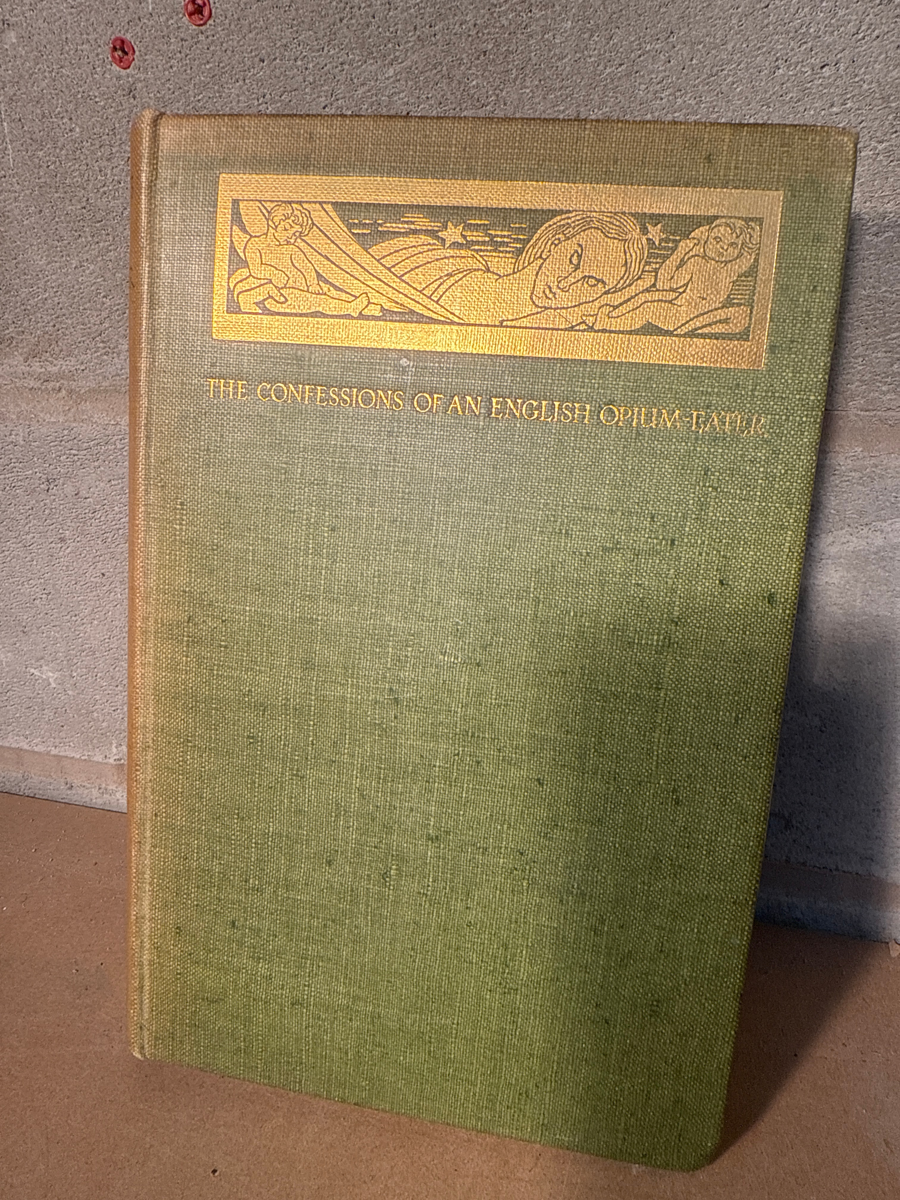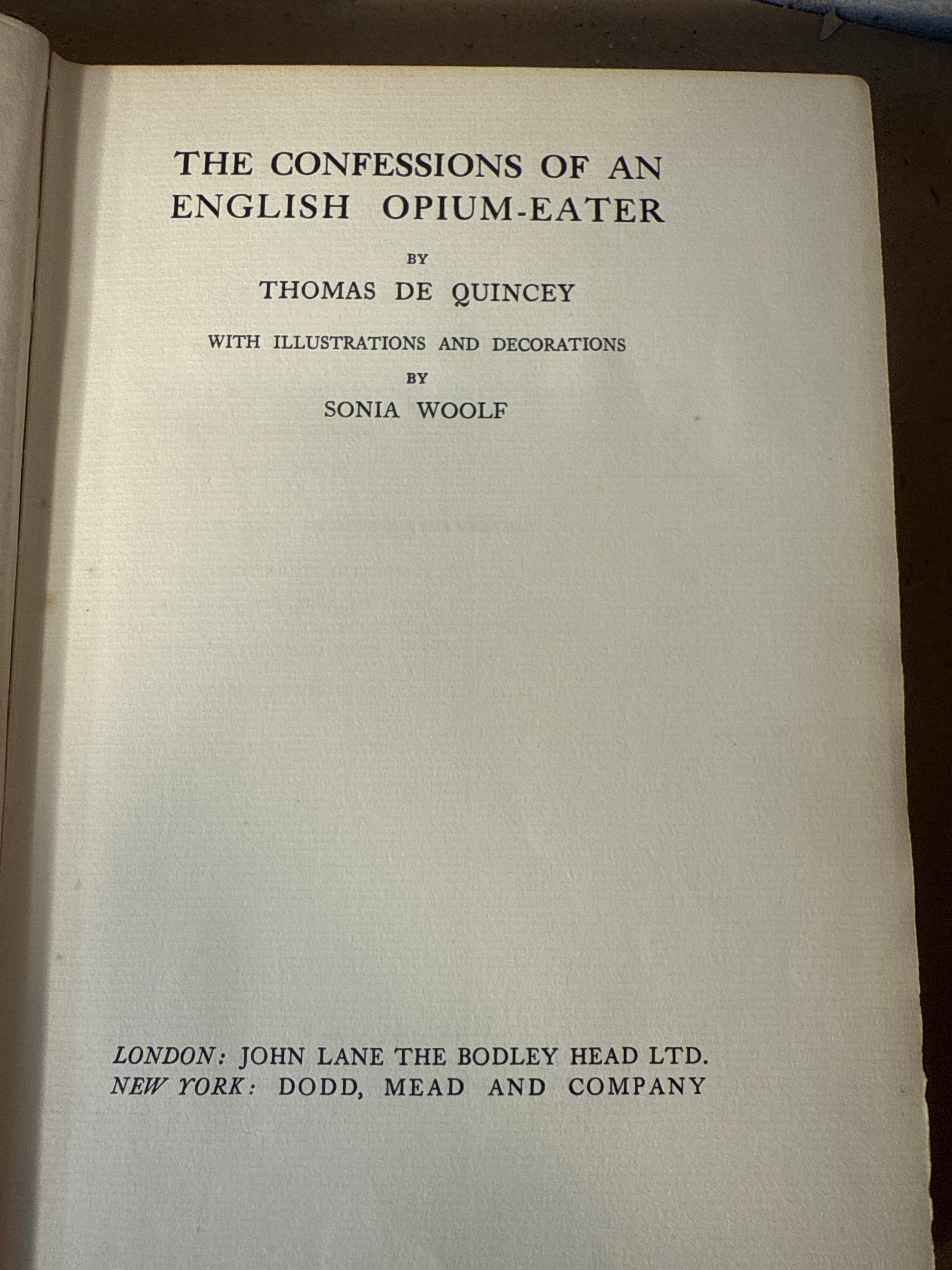 Thomas De Quincey, *The Confessions of an English Opium-Eater*, illustrated and decorated by Sonia Woolf, first edition thus, published in 1930. This green cloth-bound hardcover book features a gilt-stamped title and an ornate decorative panel on the front cover, displaying stylized figures and landscapes consistent with an Art Nouveau or early 20th-century aesthetic. The book was published in London by John Lane The Bodley Head Ltd. and in New York by Dodd, Mead and Company.