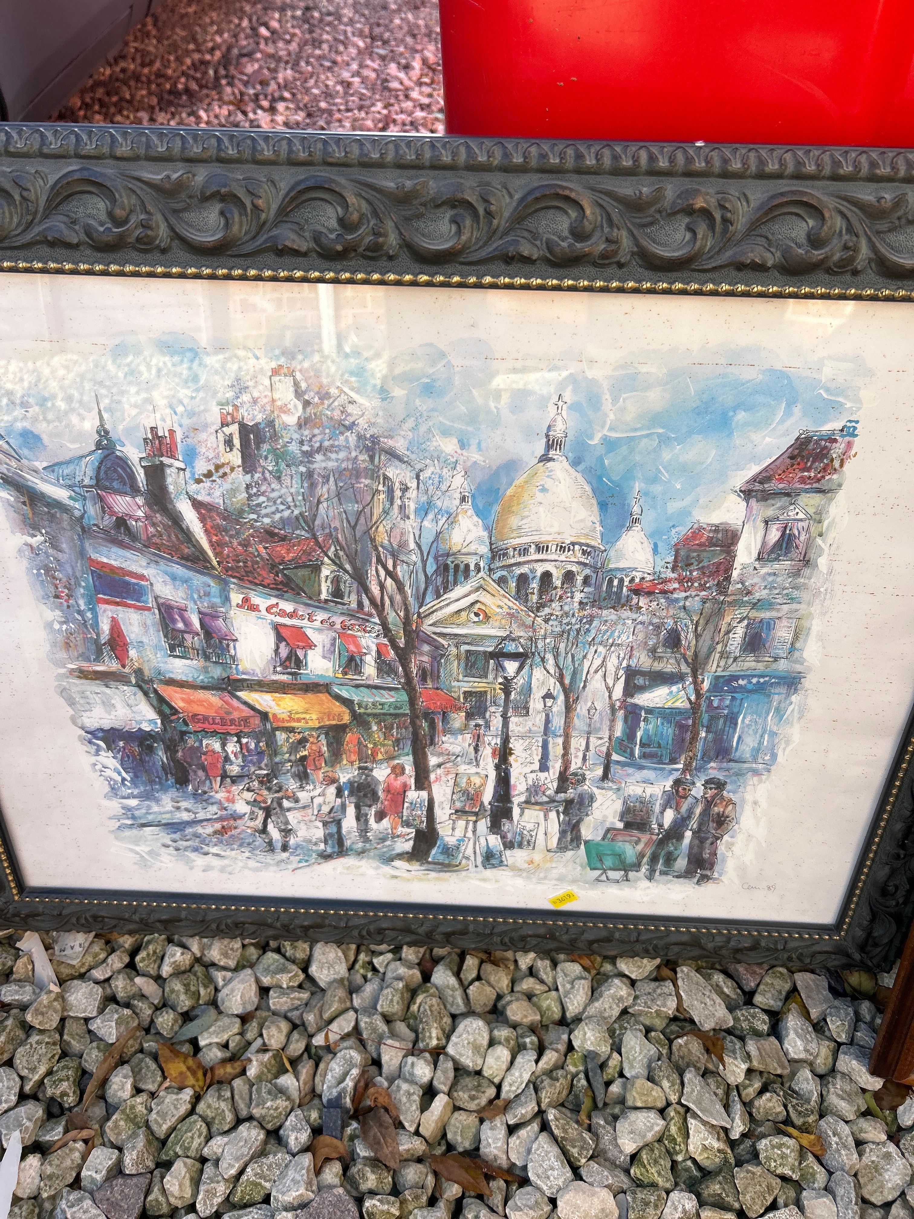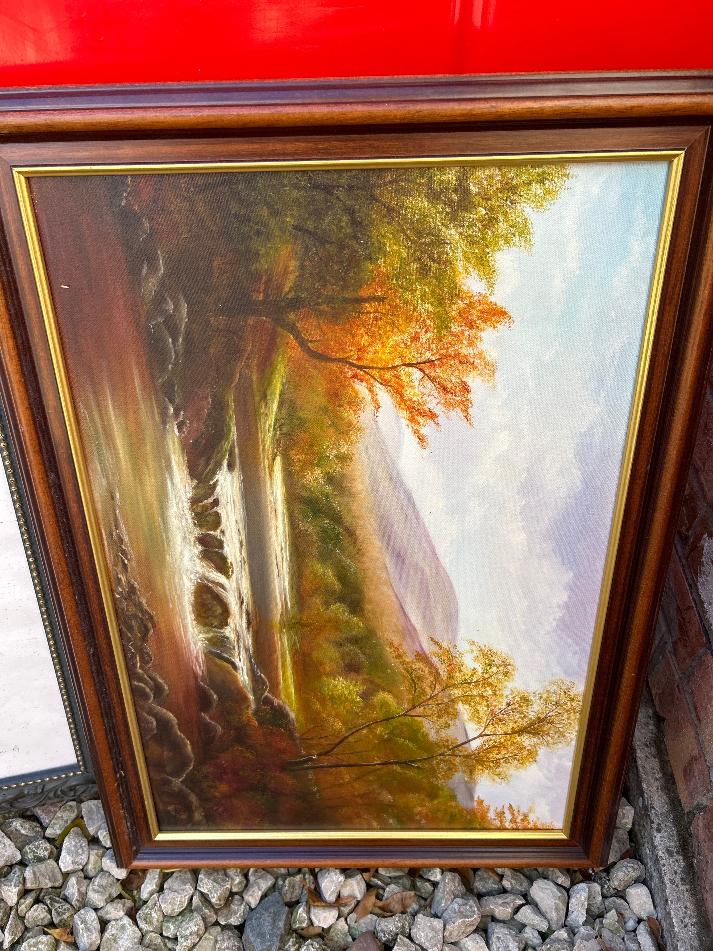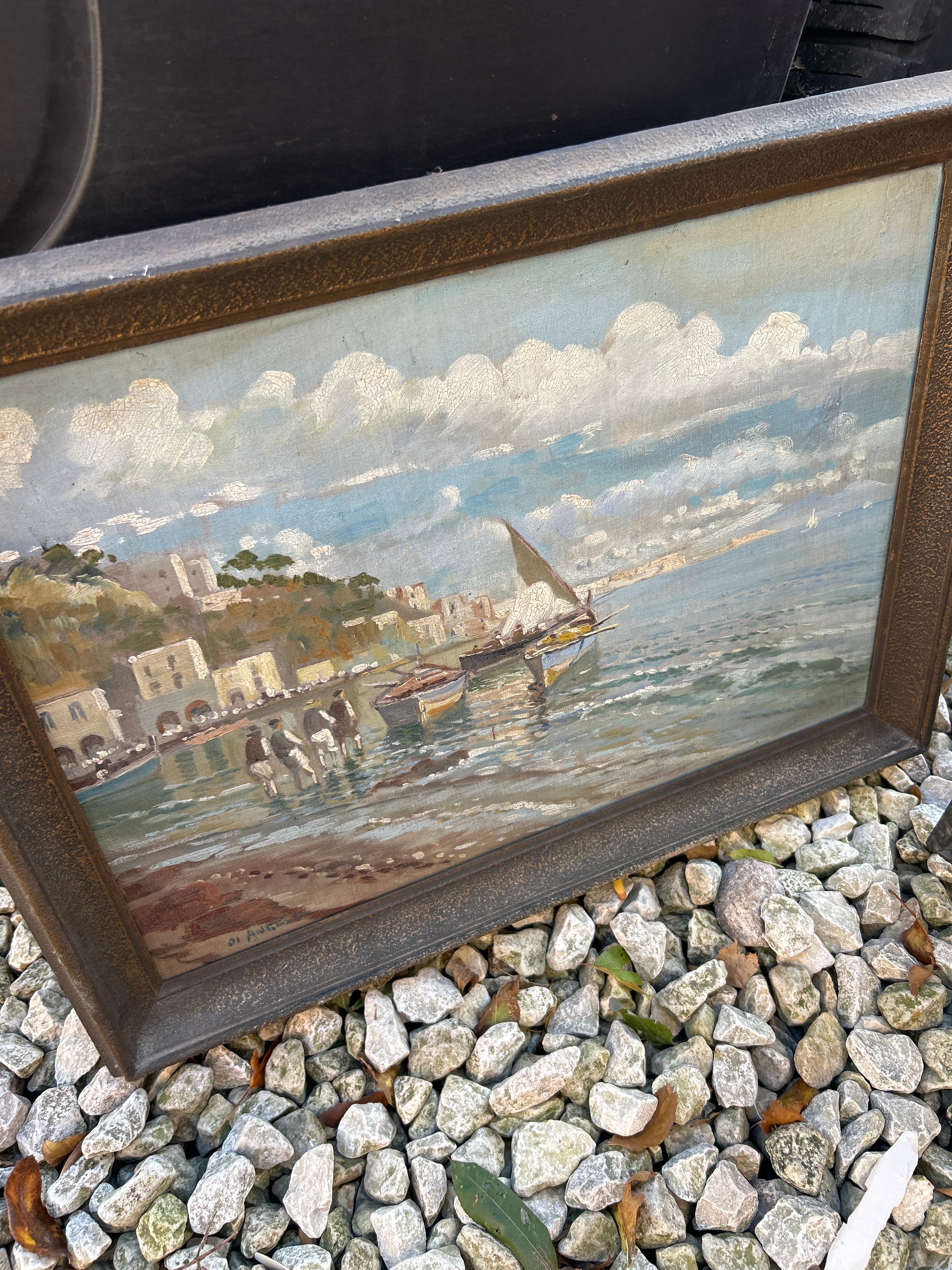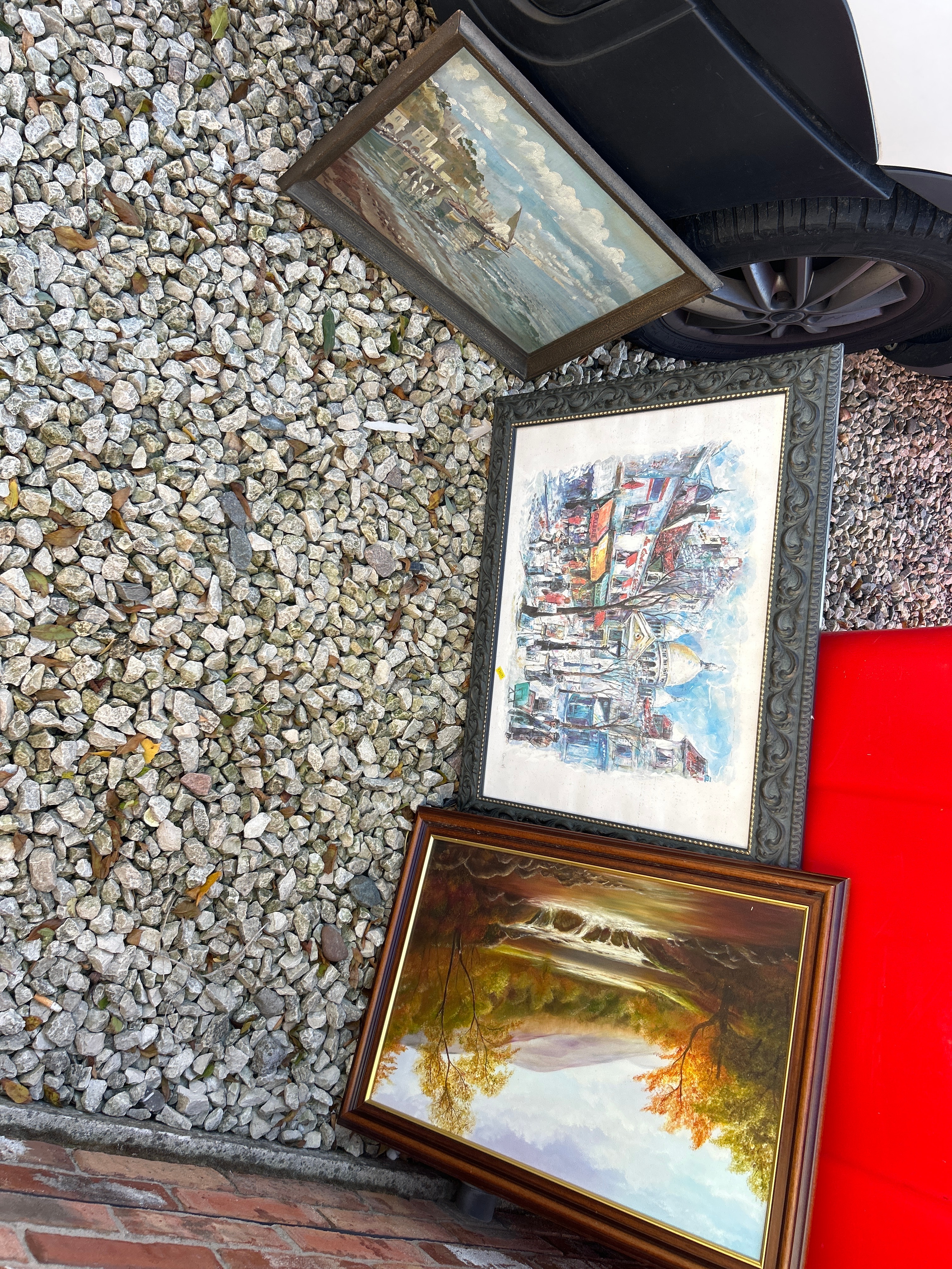 This lot comprises three framed artworks. The first is a traditional autumnal landscape painting, likely oil on canvas, featuring a vibrant river or waterfall cascading through a tree-lined gorge with distant mountains, set within a dark wood frame with a gold inner filet. The second is an impressionistic watercolor or print under glass, illustrating a bustling Parisian street scene centered on the Sacré-Cœur Basilica, with street artists and various shops, one clearly marked “DU SACRE COEUR” and another “GALERIE”; this piece is housed in an ornate dark carved frame and appears signed “G. GASTON”. The third is an impressionistic oil painting, likely on canvas, depicting a sunlit coastal village with boats in calm waters and figures on the shore, signed “Di Pace”, and presented in a dark wood frame with a gold inner filet, similar to the first.