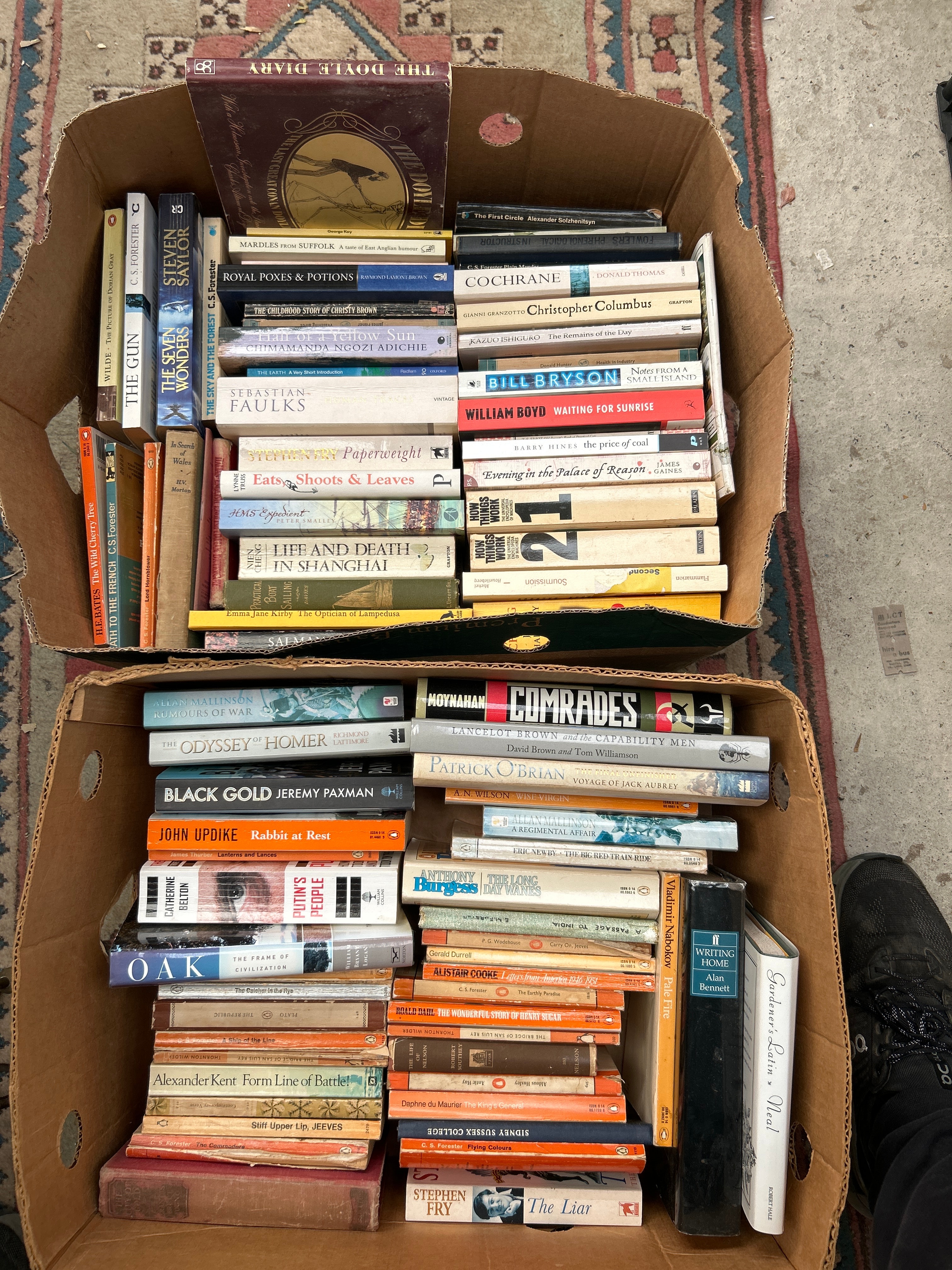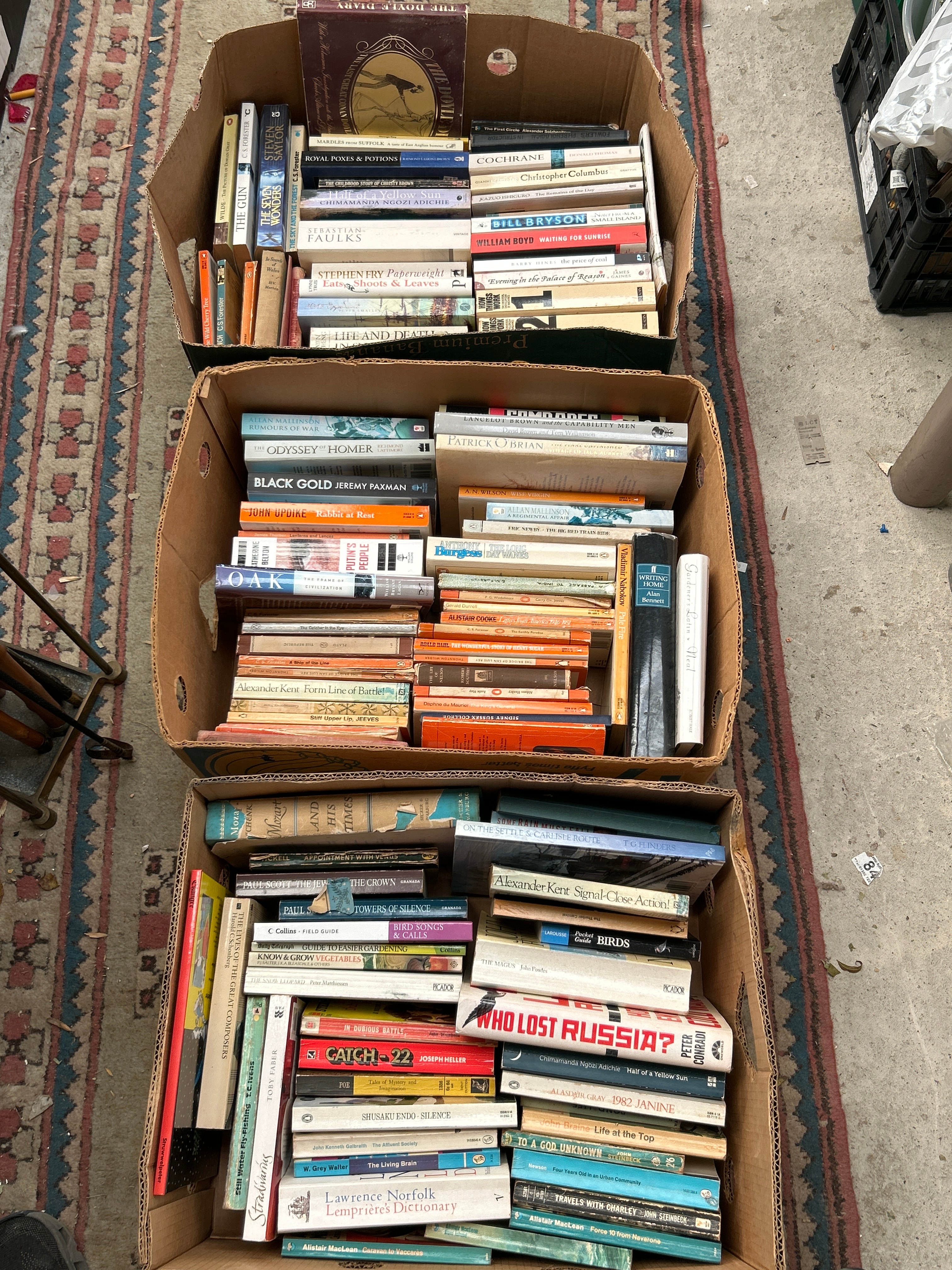 A substantial collection of books, presented in three cardboard boxes, comprising both paperbacks and hardcovers. The collection spans a broad range of genres including fiction, history, biography, and reference. Prominent titles include “The Odyssey Homer,” “Black Gold Jeremy Paxman,” “John Updike Rabbit at Rest,” “Bill Bryson,” “Alexander Kent Form Line of Battle!,” “Who Lost Russia?,” “Comrades,” and “Catch-22 Joseph Heller.” The books are primarily constructed from paper, cardboard, and cloth bindings. No non-English text is prominently visible.