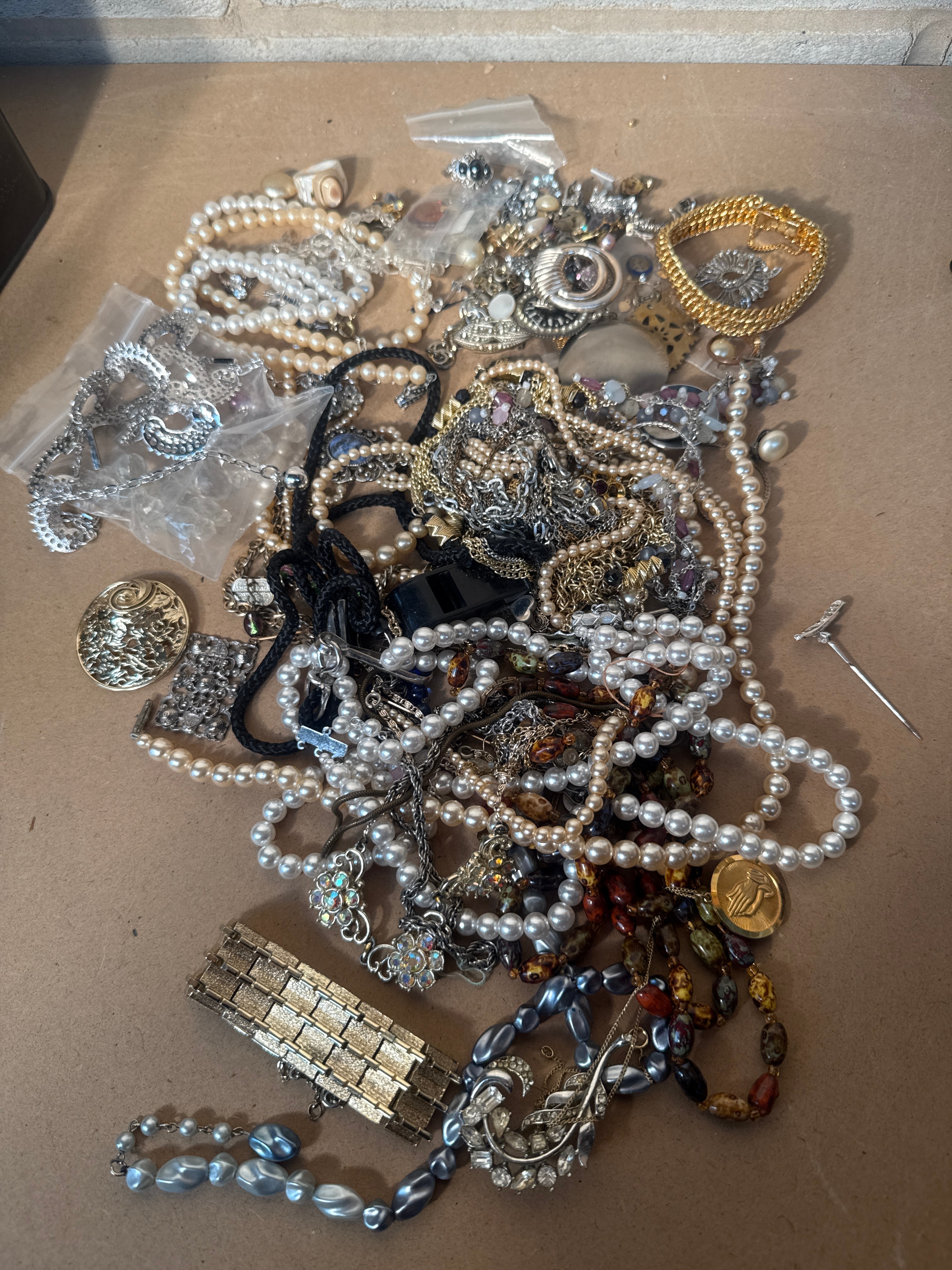 A substantial collection of assorted costume jewelry, primarily comprising necklaces, bracelets, rings, brooches, and pins. The styles range from mid-20th century vintage to more contemporary designs. The collection features numerous faux pearl strands in white, cream, and grey-blue tones, alongside items crafted from silver-tone and gold-tone base metals. Decorations include clear and iridescent rhinestones, various colored glass beads, and braided cords. A notable gold-tone oval pendant depicting a raised hand motif is present. Several smaller items are contained within clear plastic bags.