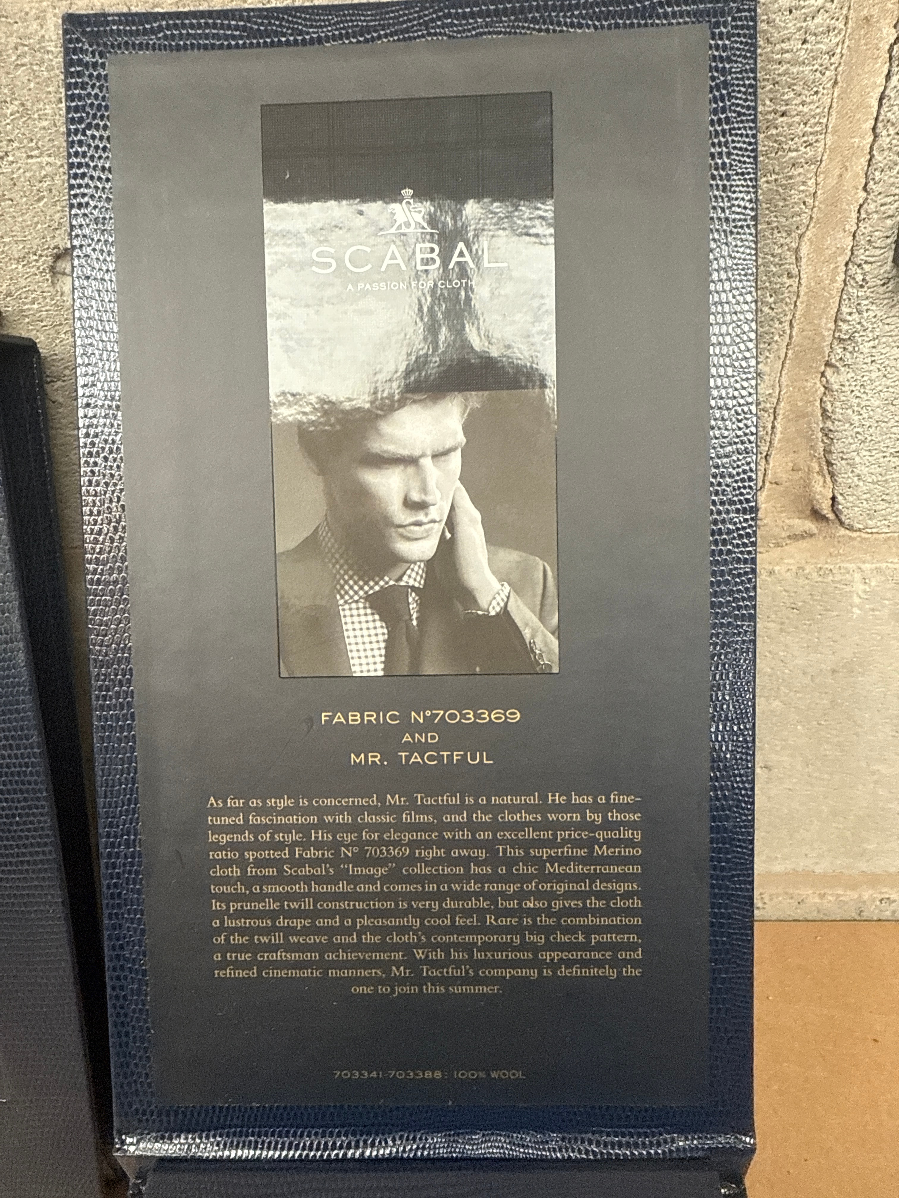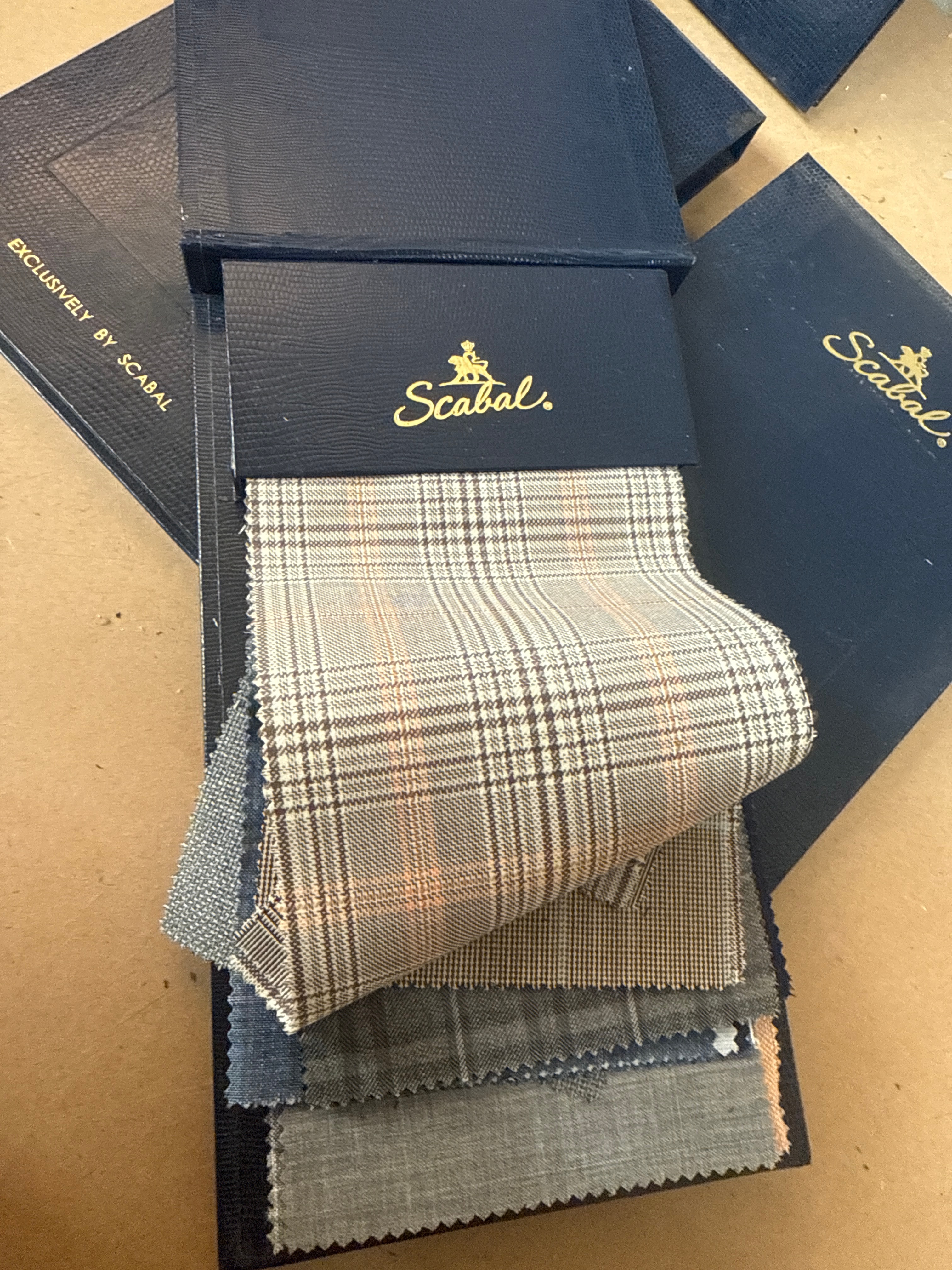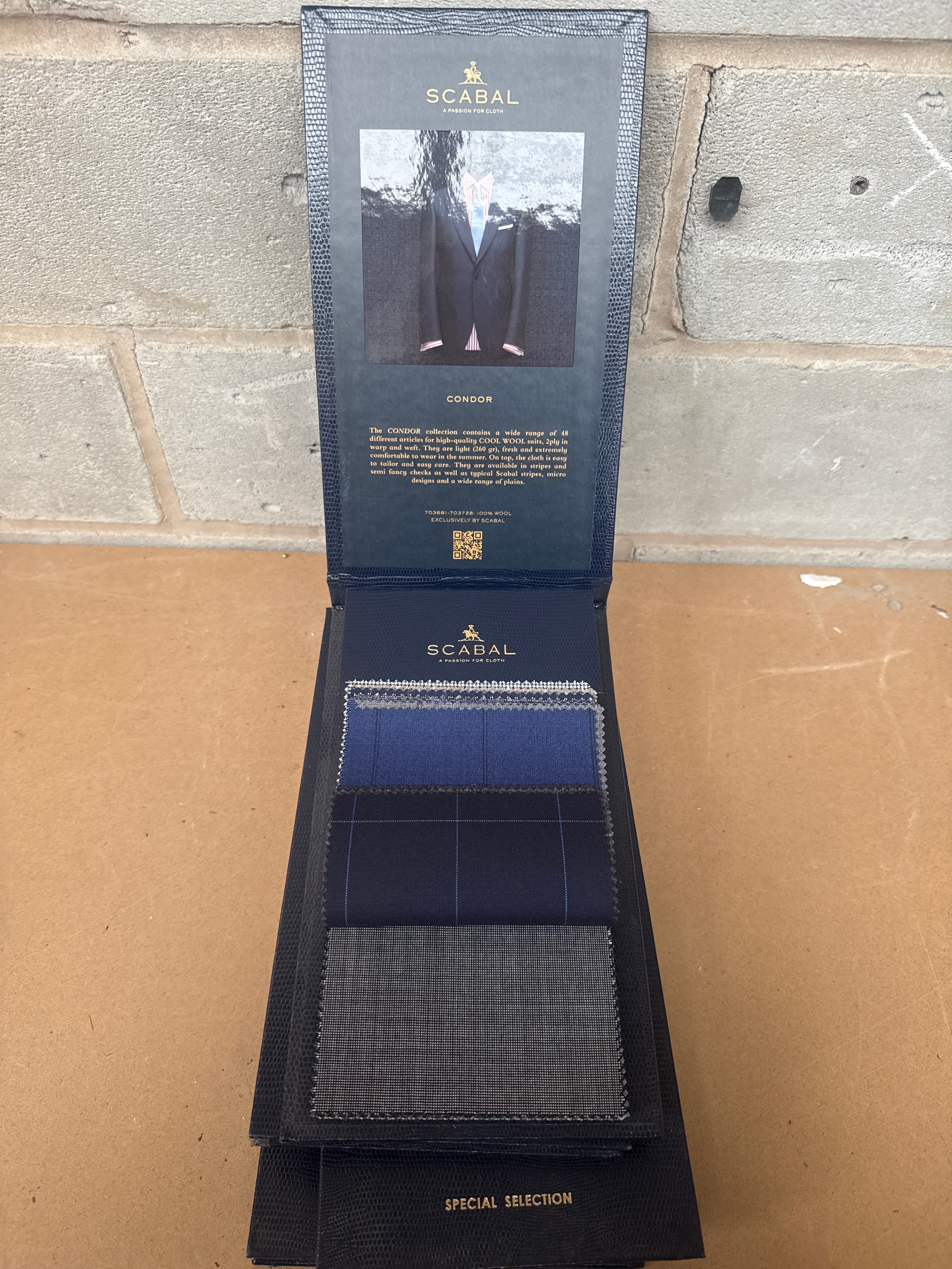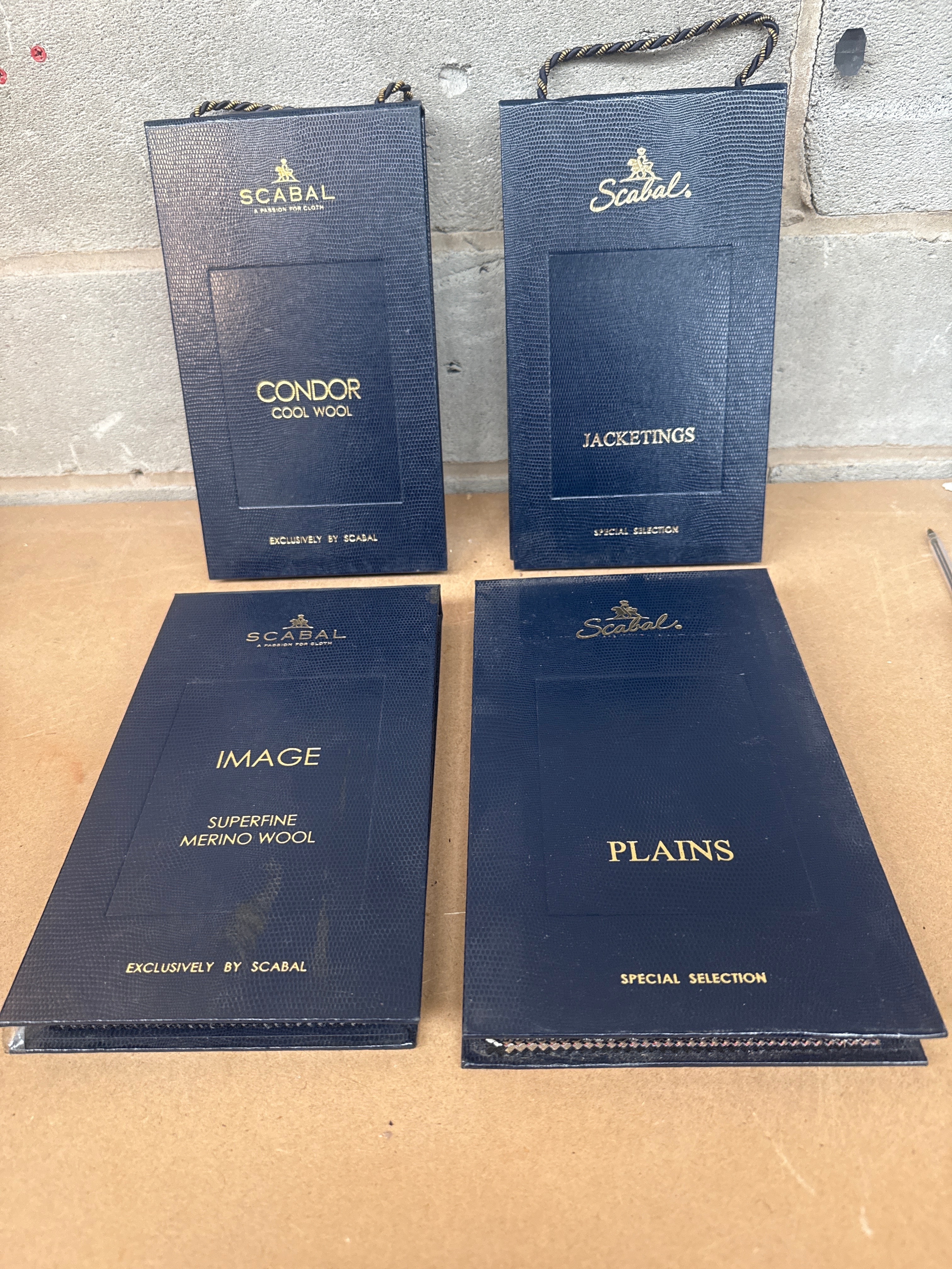 A set of four Scabal fabric swatch books or binders, each featuring a dark blue, textured hardcover with the Scabal logo and “A PASSION FOR CLOTH” embossed in gold. Titles visible on the covers and spines include “CONDOR COOL WOOL,” “JACKETINGS,” “IMAGE SUPERFINE MERINO WOOL,” and “PLAINS.” Additional text such as “EXCLUSIVELY BY SCABAL” and “SPECIAL SELECTION” is also present. The binders contain numerous fabric swatches, primarily identified as wool and superfine merino wool, in a range of patterns including plaids, checks, and solid colors. Specific fabric descriptions mention “Super 130’s wool” and state “100% WOOL” for certain collections like “CONDOR” and “FABRIC N°703369.”