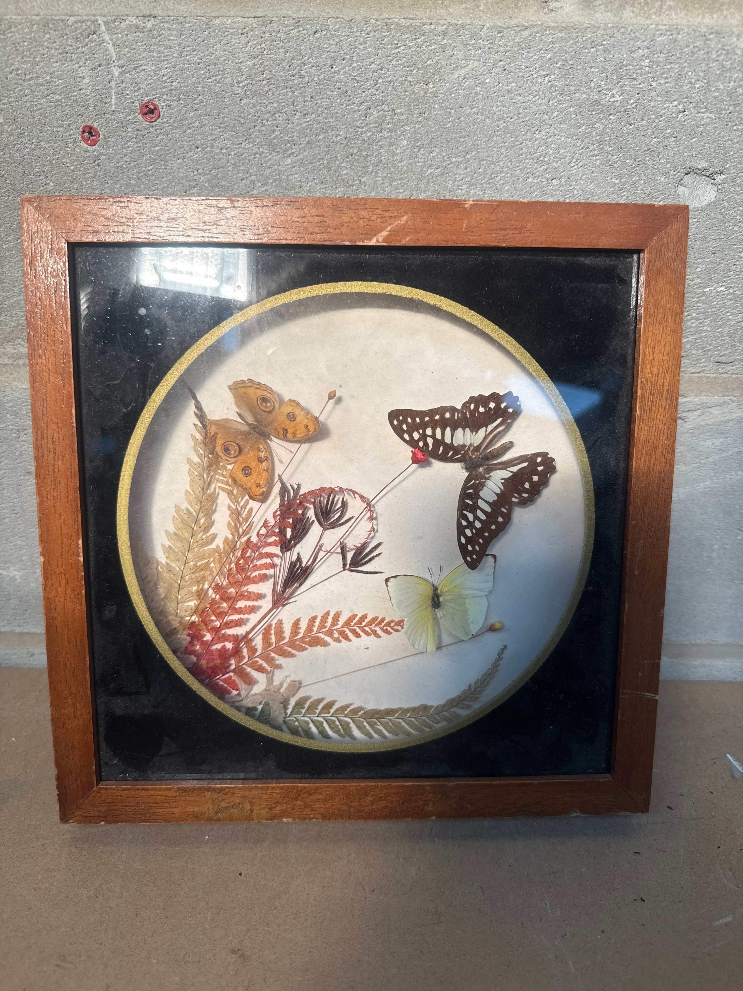 A framed entomological and botanical display featuring five preserved butterflies arranged with dried ferns and other botanical elements. The specimens include two brown-orange butterflies with prominent ocelli, two dark brown and white patterned specimens, and one pale yellow butterfly, all mounted with visible pins against a light-colored background. This central arrangement is bordered by a gold-toned circular band against a black matte, all set within a rectangular natural wood frame with a glass front.