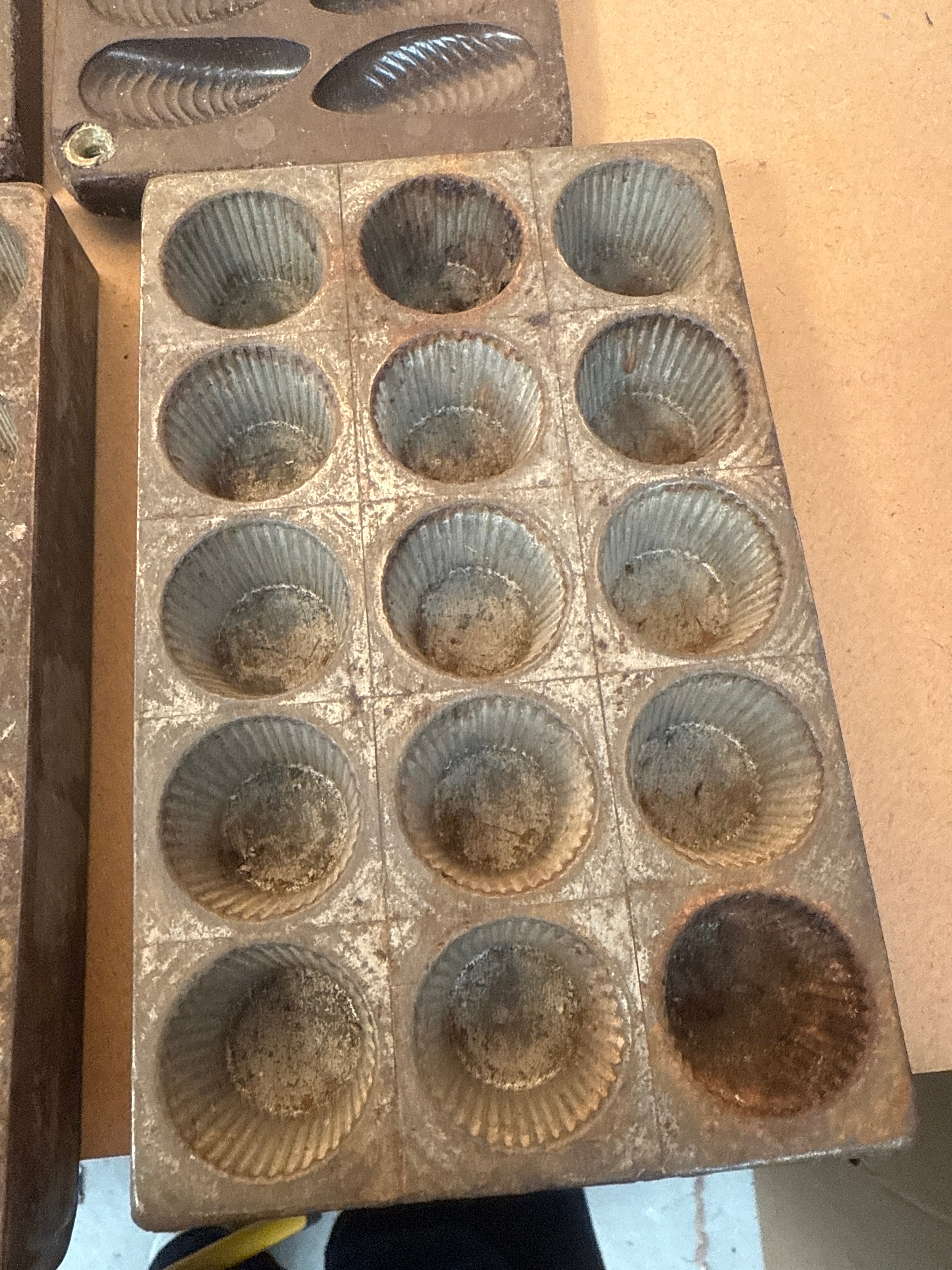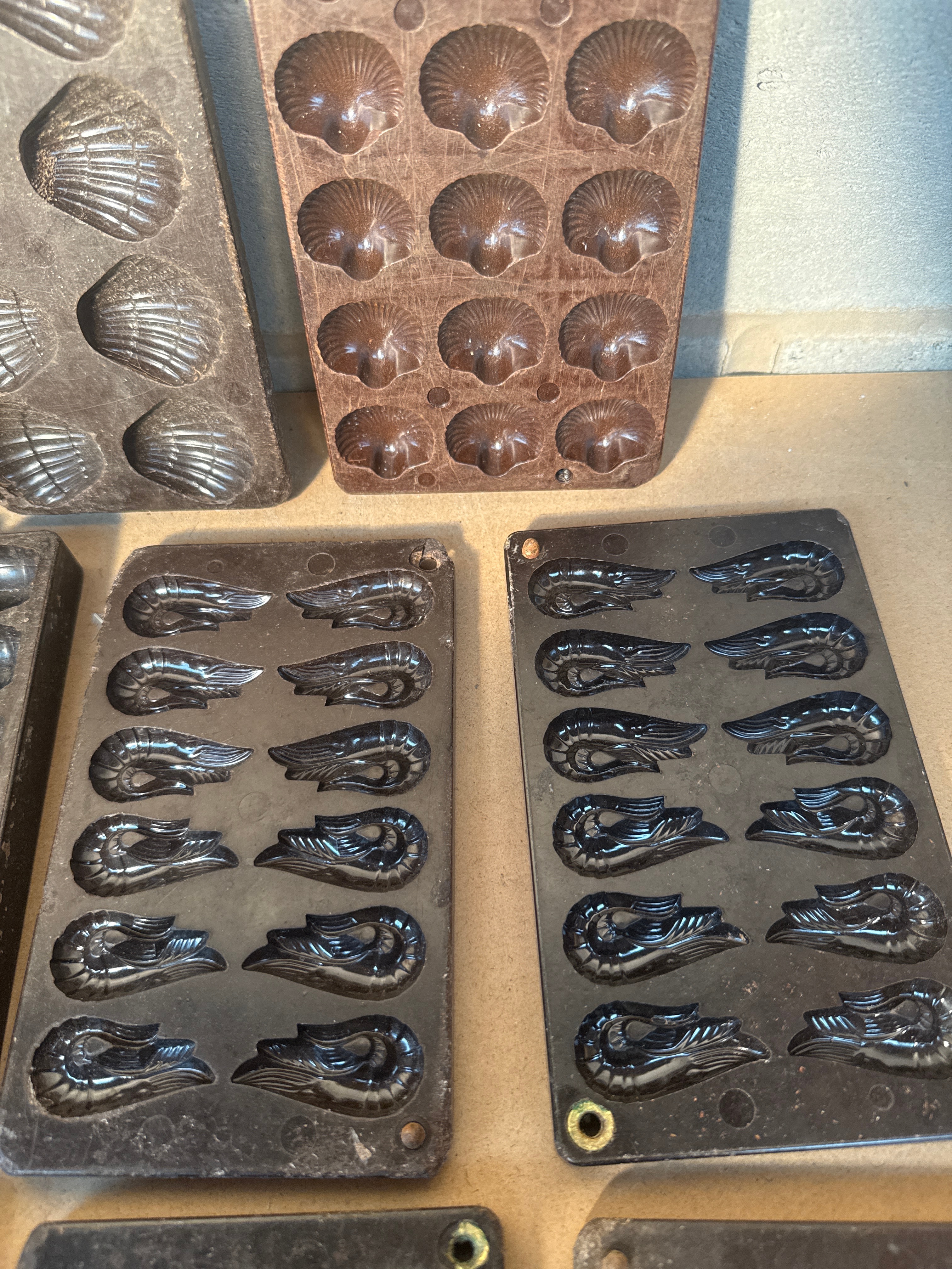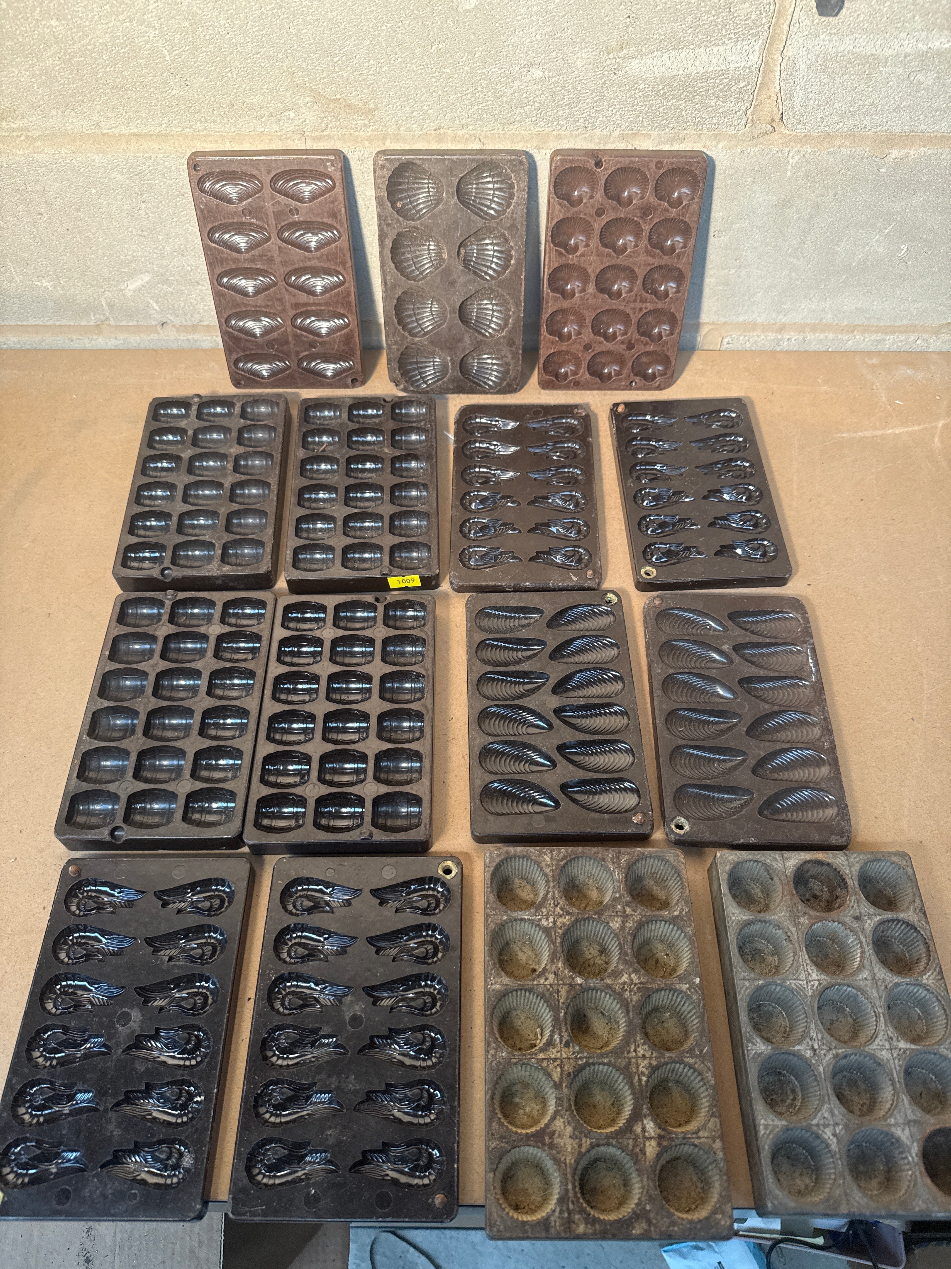 A collection of 17 multi-cavity molds, likely for confectionery or baking, dating from the vintage to antique period. The collection includes three brown 12-cavity shell molds, possibly made of a composite material or tin-plated steel with a dark finish, reminiscent of Bakelite. The majority are dark metal molds, varying in design, with cavities depicting elongated stylized marine animals (shrimp/fish), oval shapes, or oblong forms, typically in counts of 12 or 15 per mold. The lowest two molds are significantly heavier, appearing to be cast iron, featuring 12 and 15 deeply fluted, circular cavities. A small yellow sticker with illegible text is visible on one of the dark metal molds; no other discernible text or manufacturer markings are present.