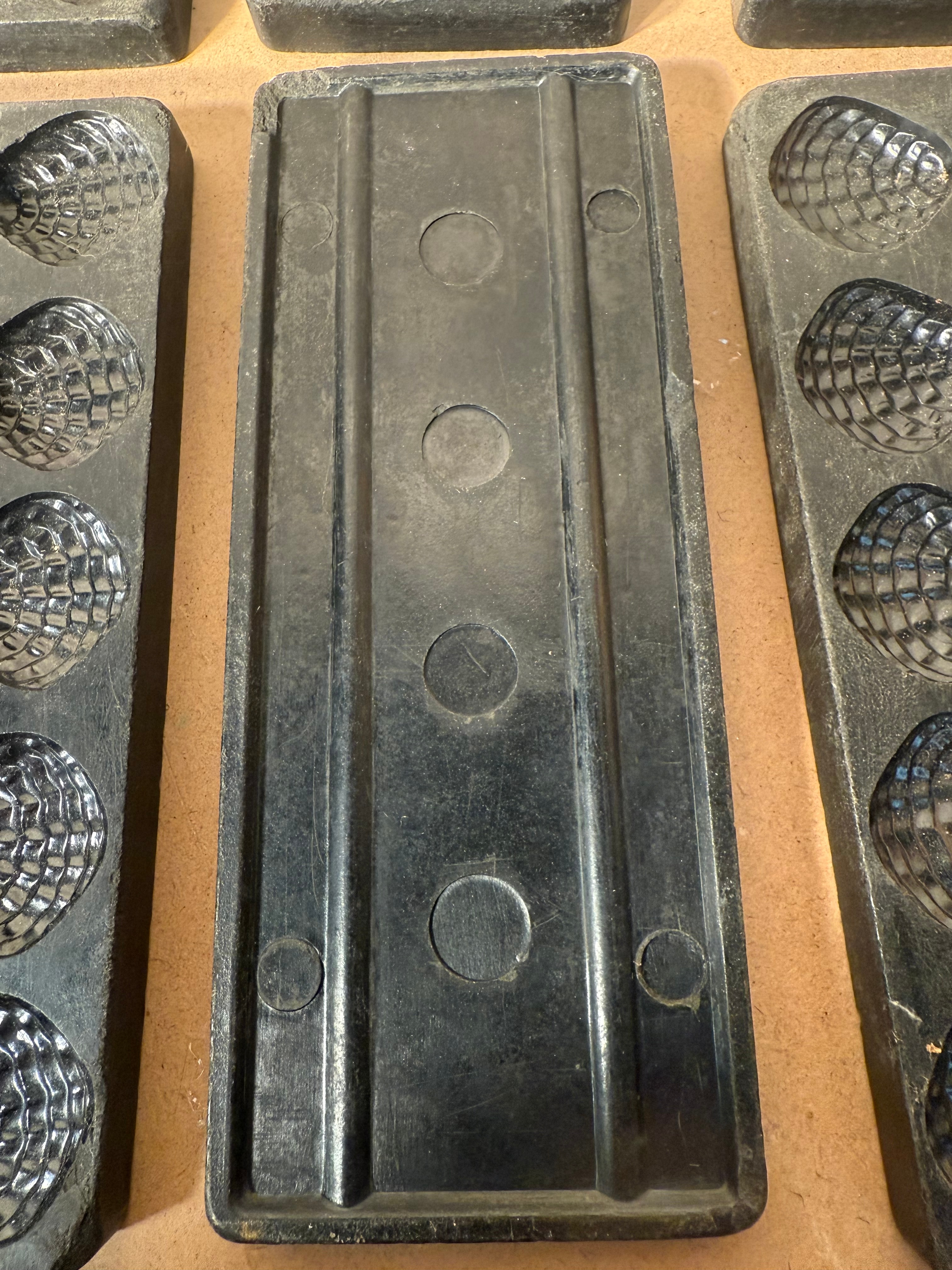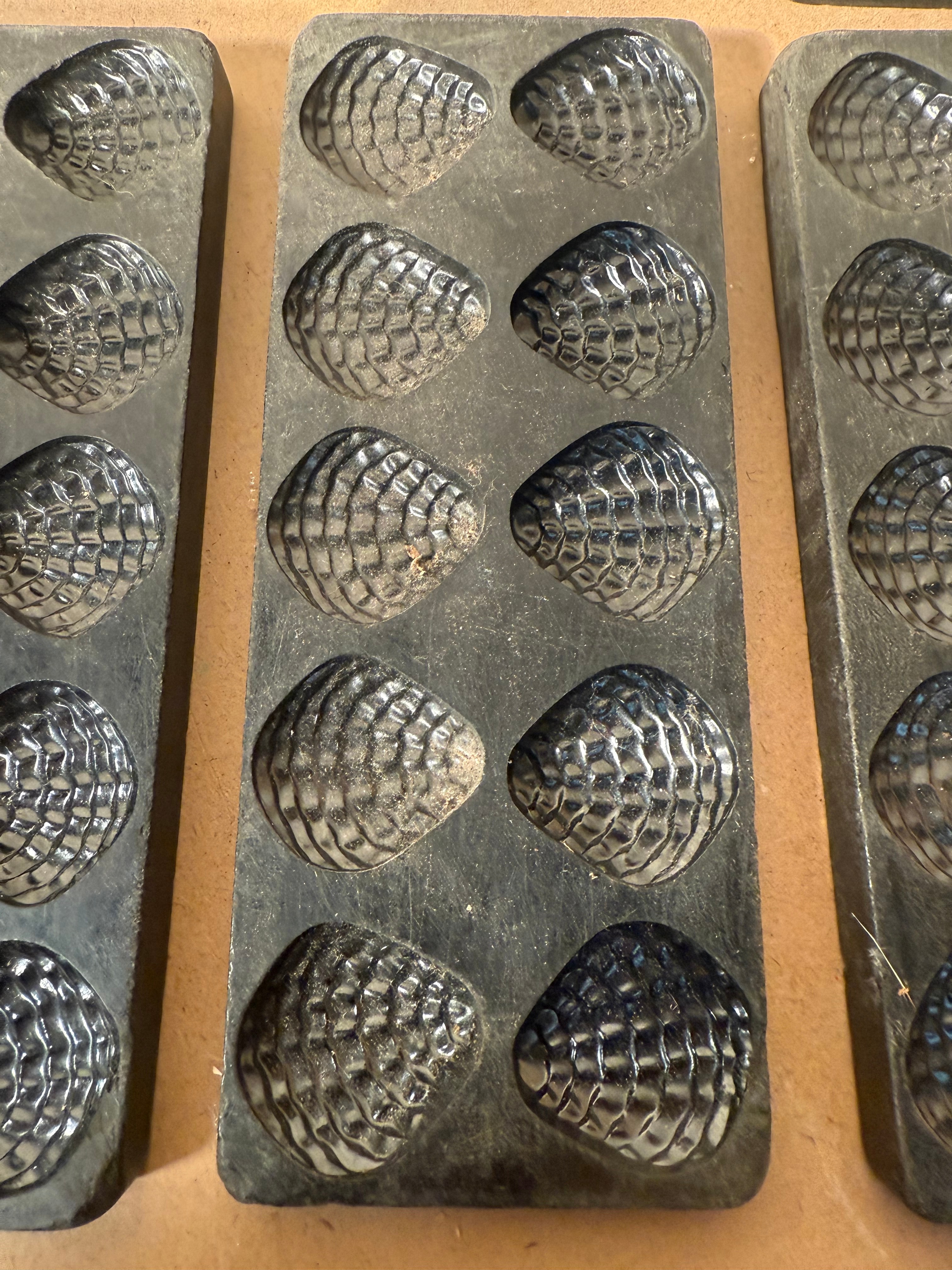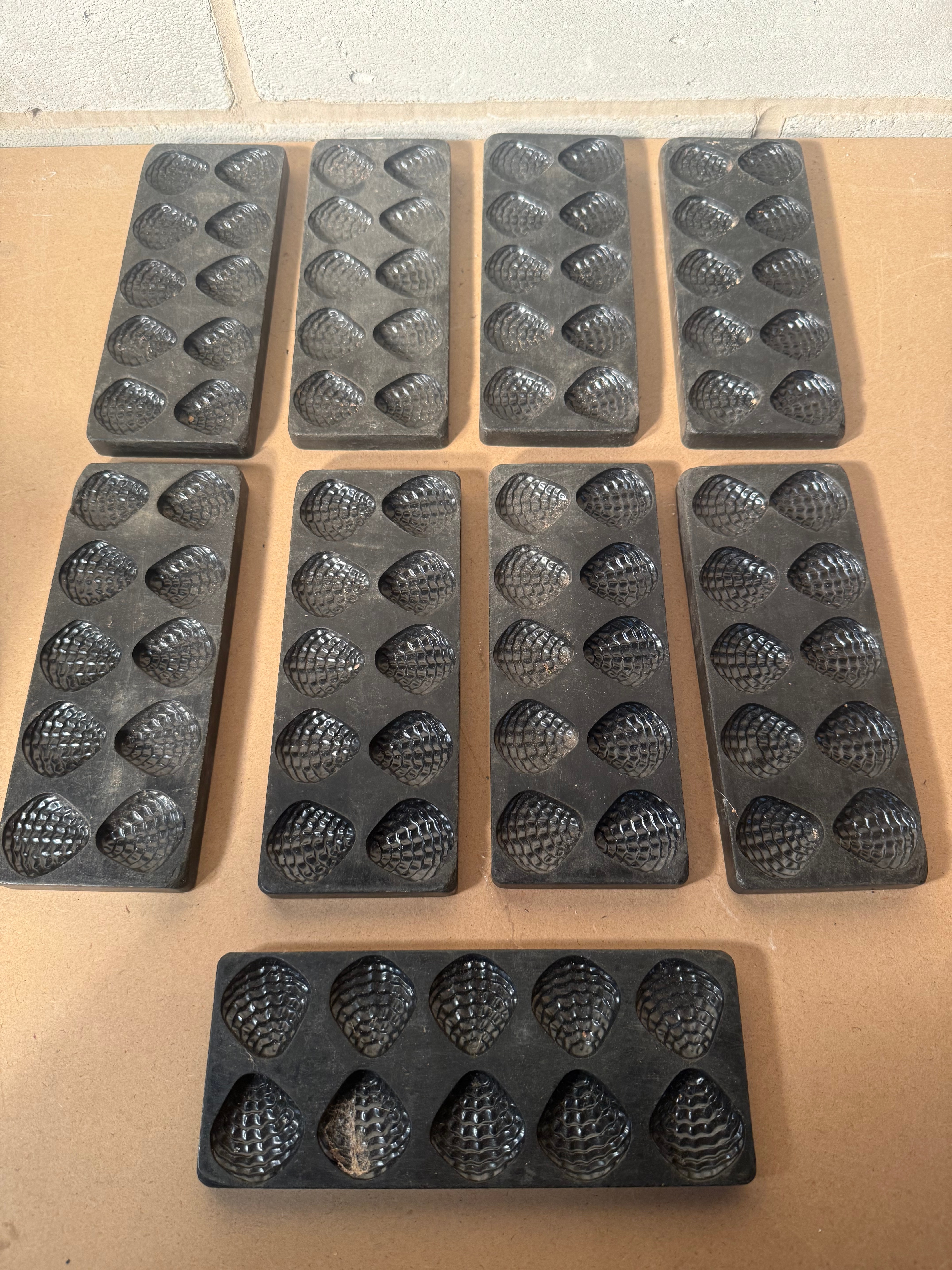 A set of nine antique Victorian cast iron chocolate molds, each featuring a strawberry design. Each rectangular mold is crafted from dark-colored cast metal, likely iron, and features multiple ovate or hemispherical cavities (typically six to twelve per mold) with a textured, segmented surface reminiscent of a raspberry or pine cone. The reverse sides are plain with circular raised elements. No manufacturer’s marks or textual inscriptions are visible. The molds exhibit a utilitarian style.