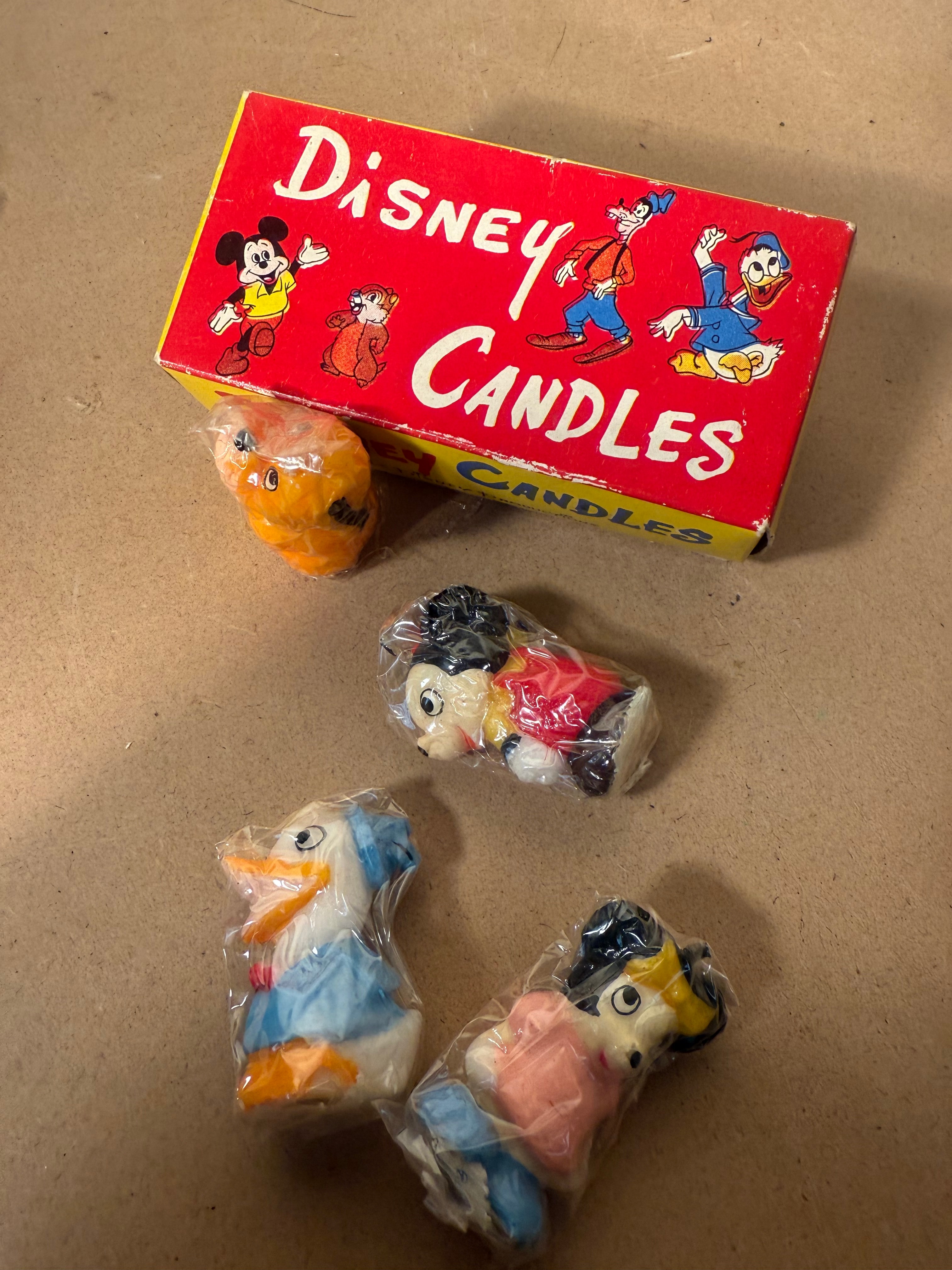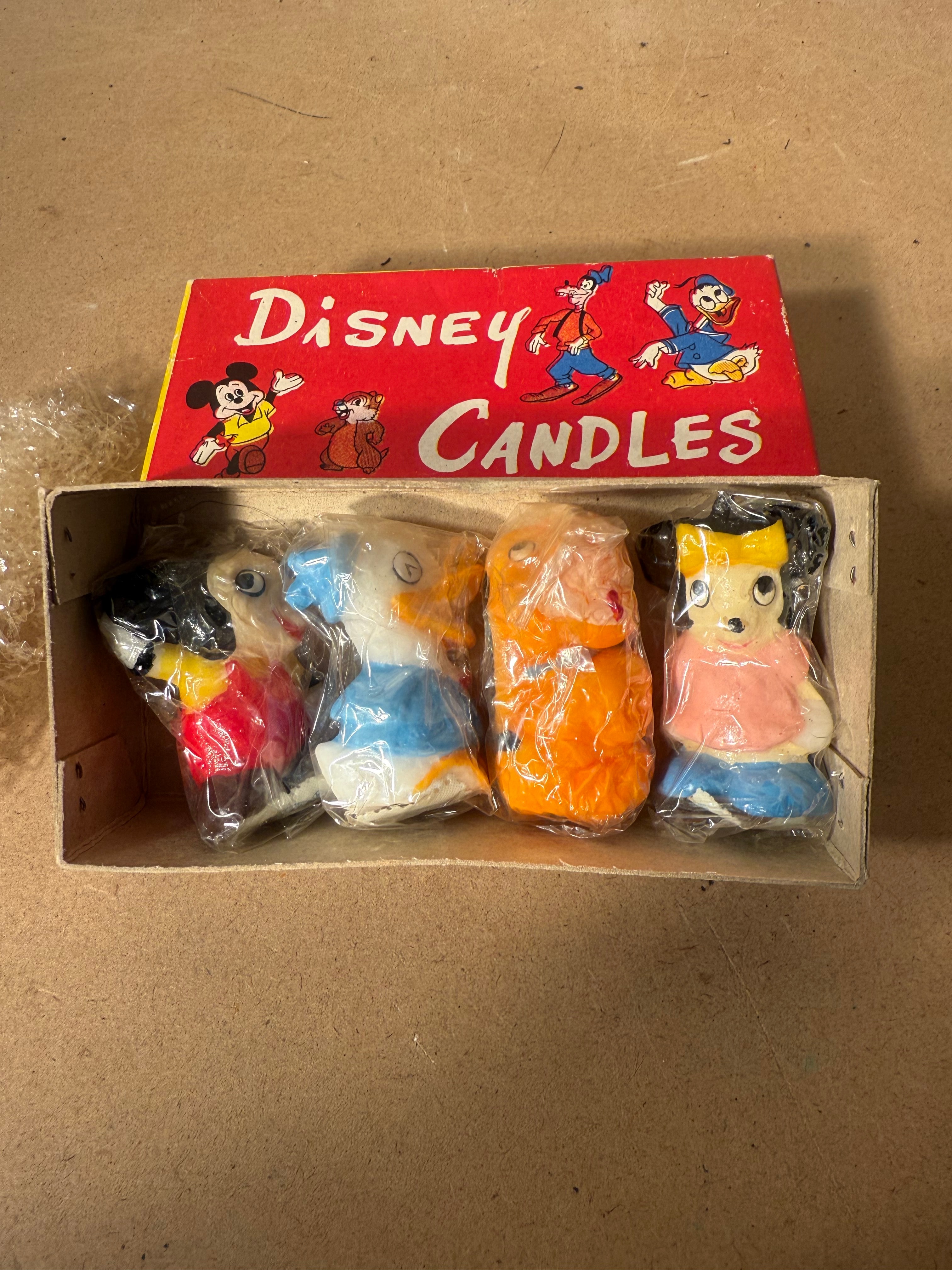 A set of four vintage Walt Disney character candles, likely dating to the 1960s. The candles are presented in their original printed cardboard box, which prominently features “Disney CANDLES” in stylized script and block capitals. The box lid is illustrated with Mickey Mouse, Goofy, Donald Duck, and a character resembling Chip or Dale. Inside, four figural wax candles, including recognizable forms of Mickey Mouse and Donald Duck, along with figures resembling Minnie Mouse and Pluto, are individually sealed in clear plastic.
