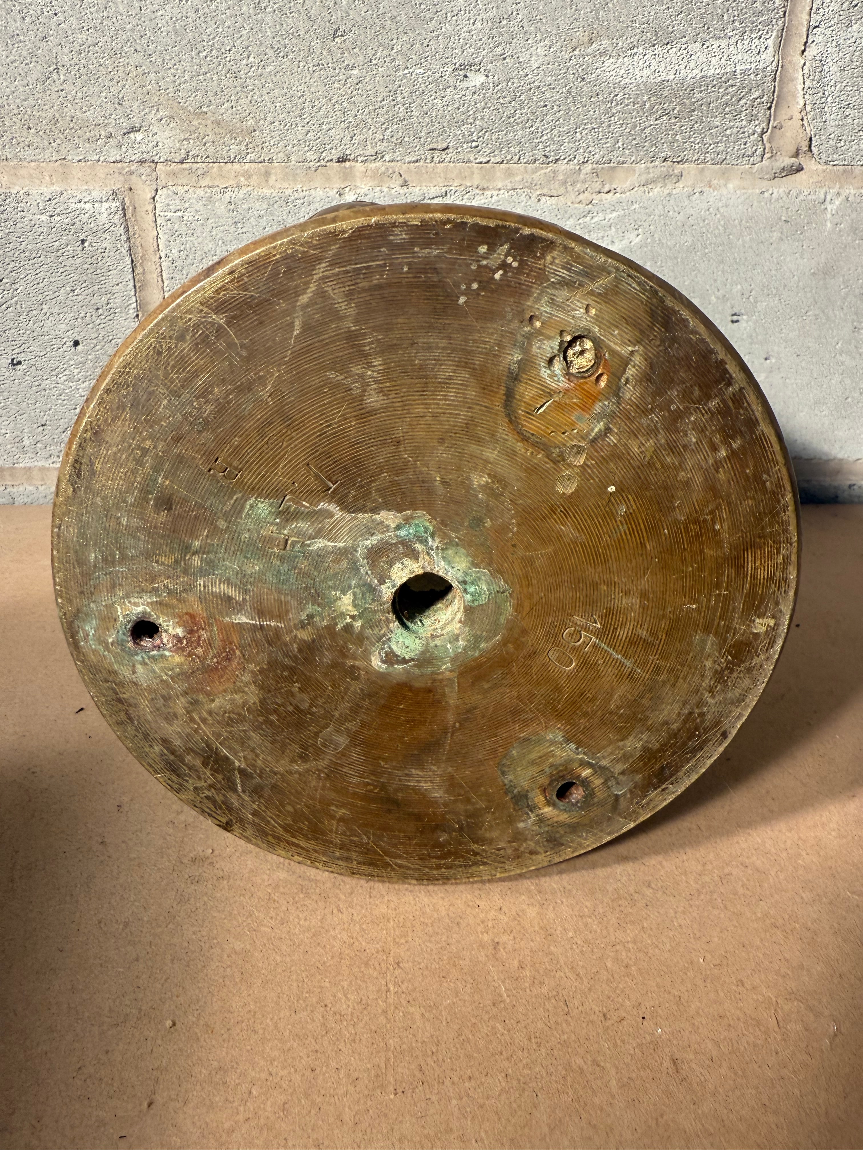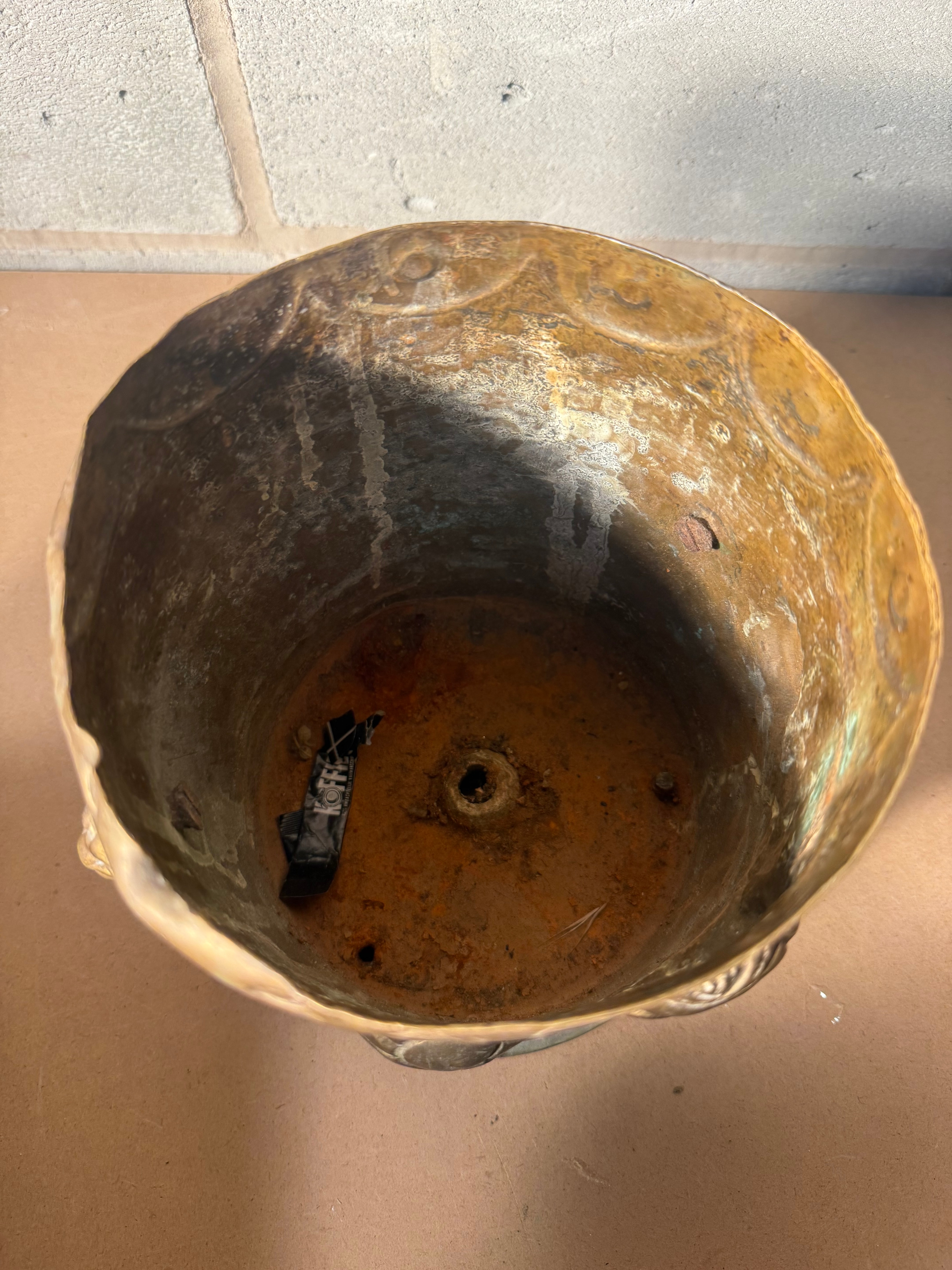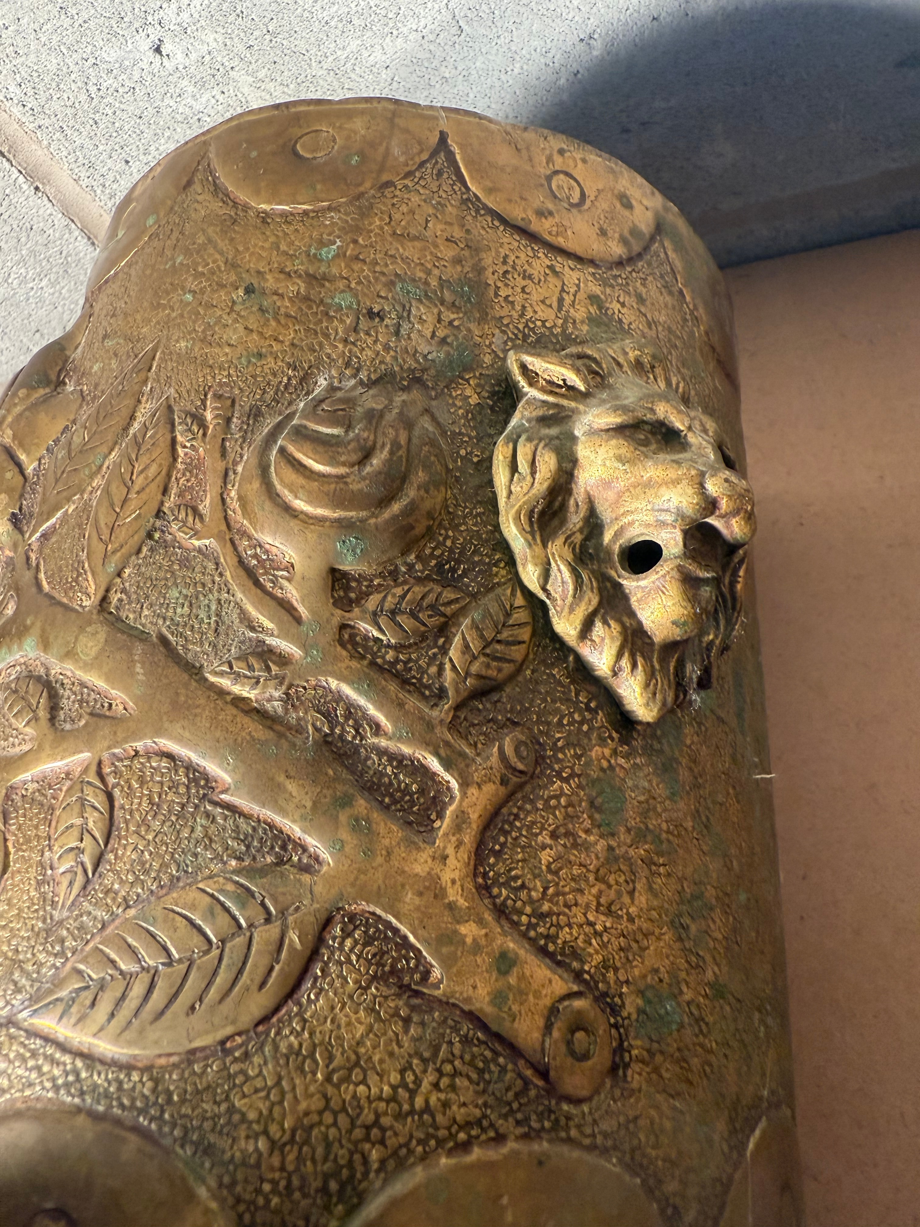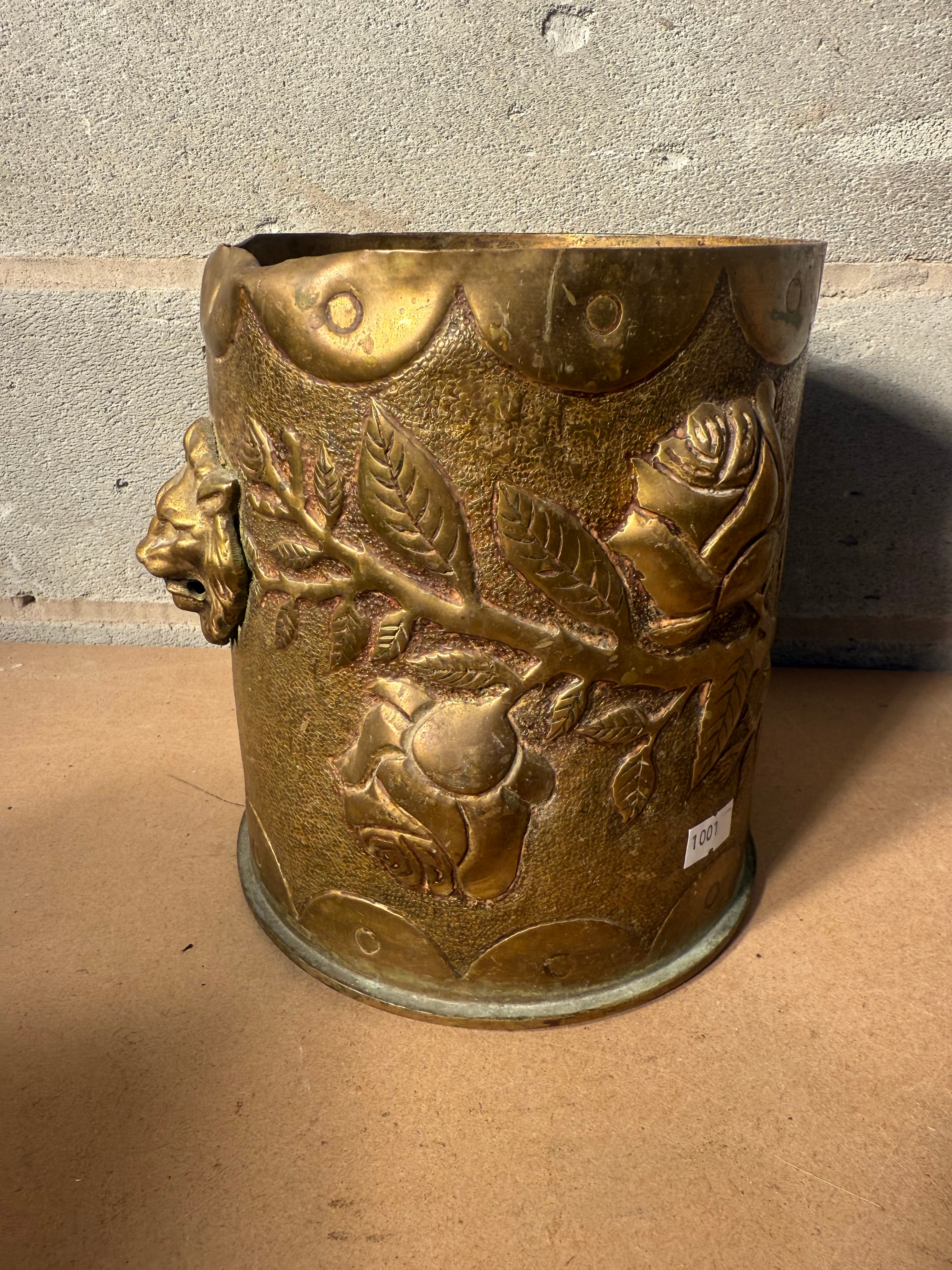 A WW1 Verdun Brass Trench Art Vase of cylindrical form, adorned with extensive repoussé decoration depicting a climbing rose vine motif with prominent blossoms and leaves. The rim features a scalloped or shell-patterned edge, and a cast lion head applique with an open mouth is visible on at least one side. Likely crafted from a repurposed artillery shell, the interior shows significant oxidation and corrosion, particularly at the bottom, which features a central hole and several smaller peripheral holes, suggestive of drainage or former attachment points, indicating its potential use as a planter or jardiniere. A white sticker with “1001” is present on the exterior, and a stamped or etched “150” is visible on the underside.