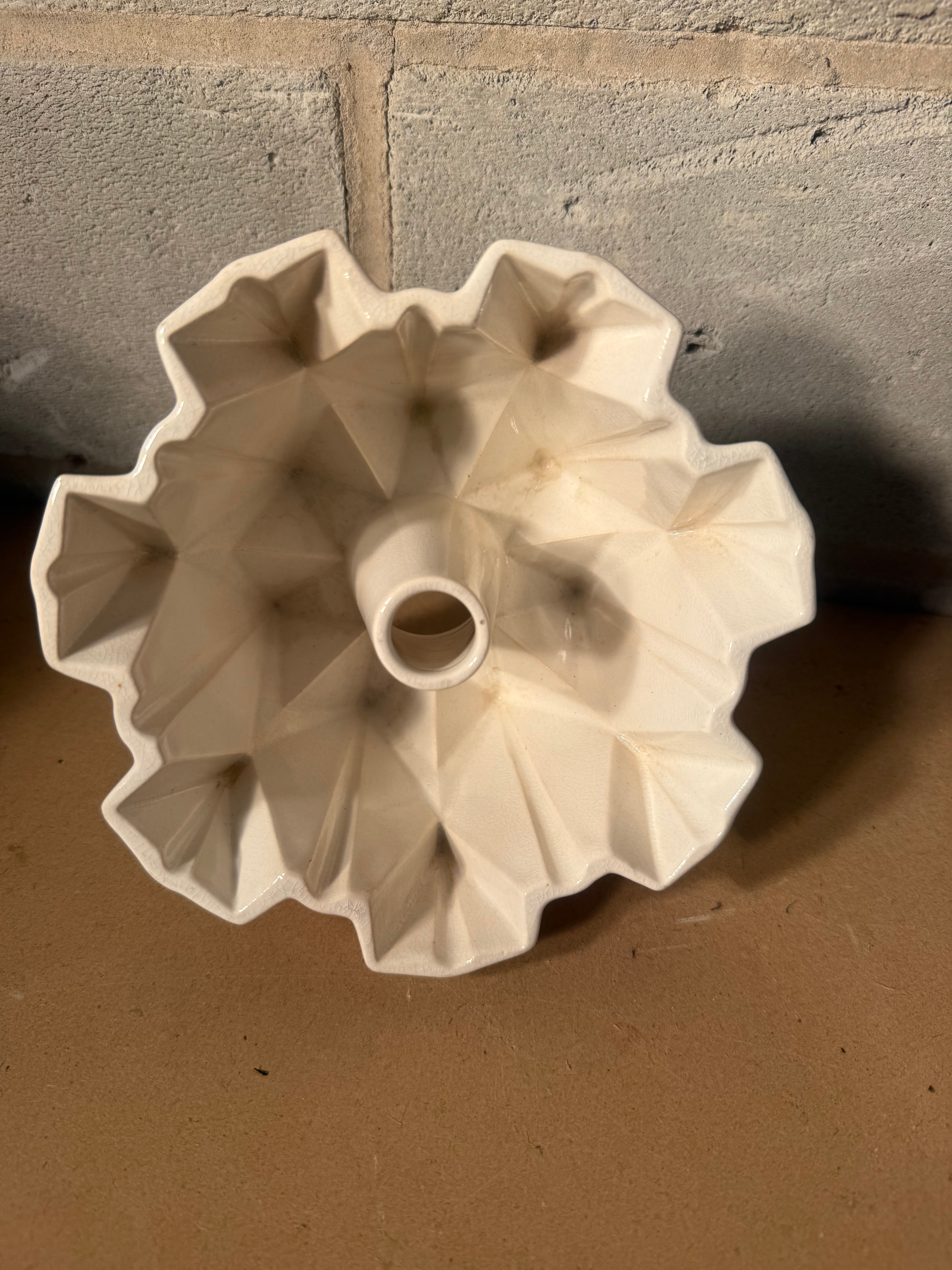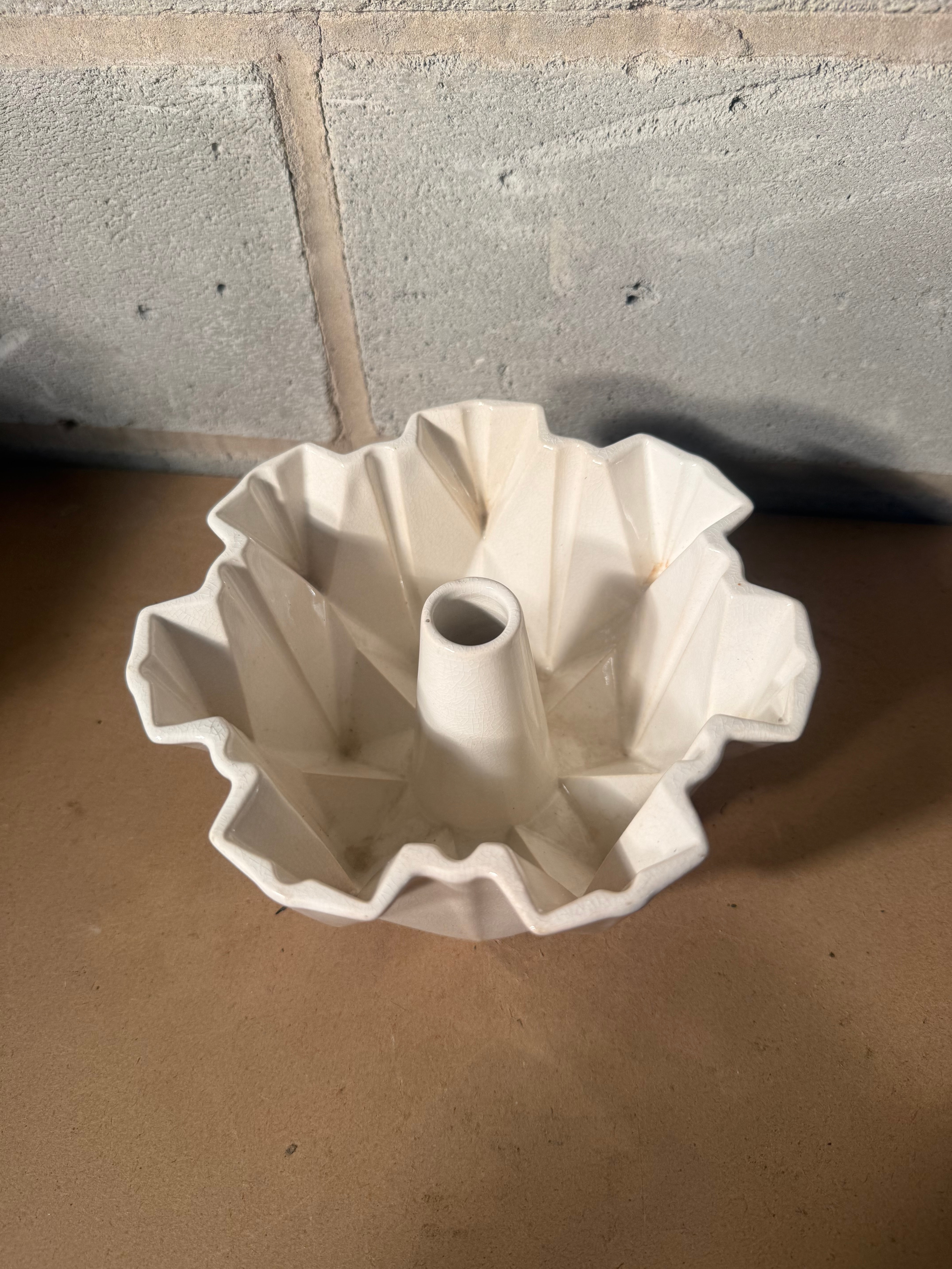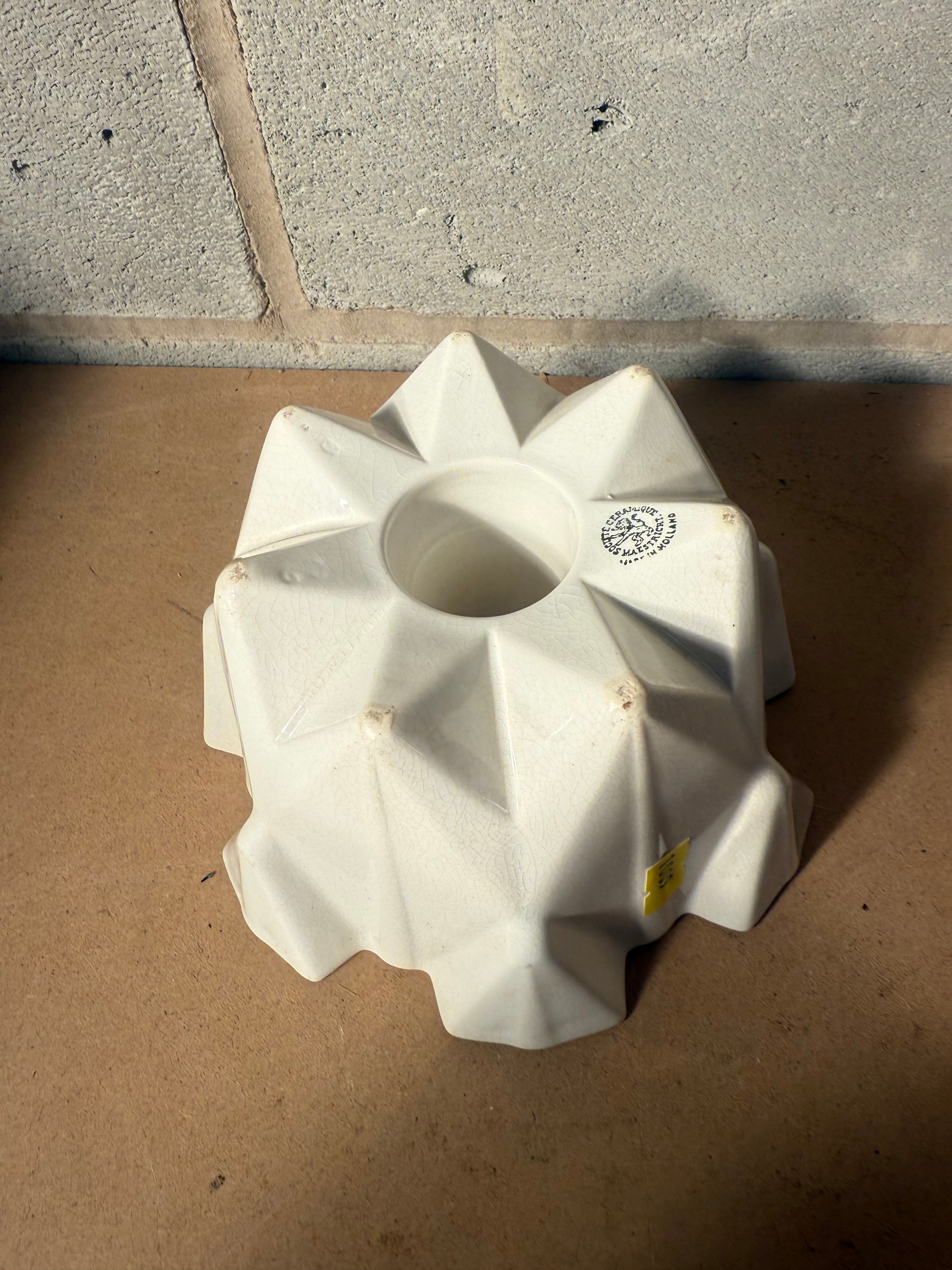 A cream-colored glazed ceramic ring mold by Société Céramique Maastricht, designed in an Art Deco or modernist aesthetic. The form is distinguished by its faceted, geometric design, irregular lobed rim, and central tubular column, characteristic of a bundt pan. The base features a black circular stamped mark reading “SOCIÉTÉ CÉRAMIQUE MAASTRICHT. N.V. HOLLAND” enclosing a rampant lion motif.