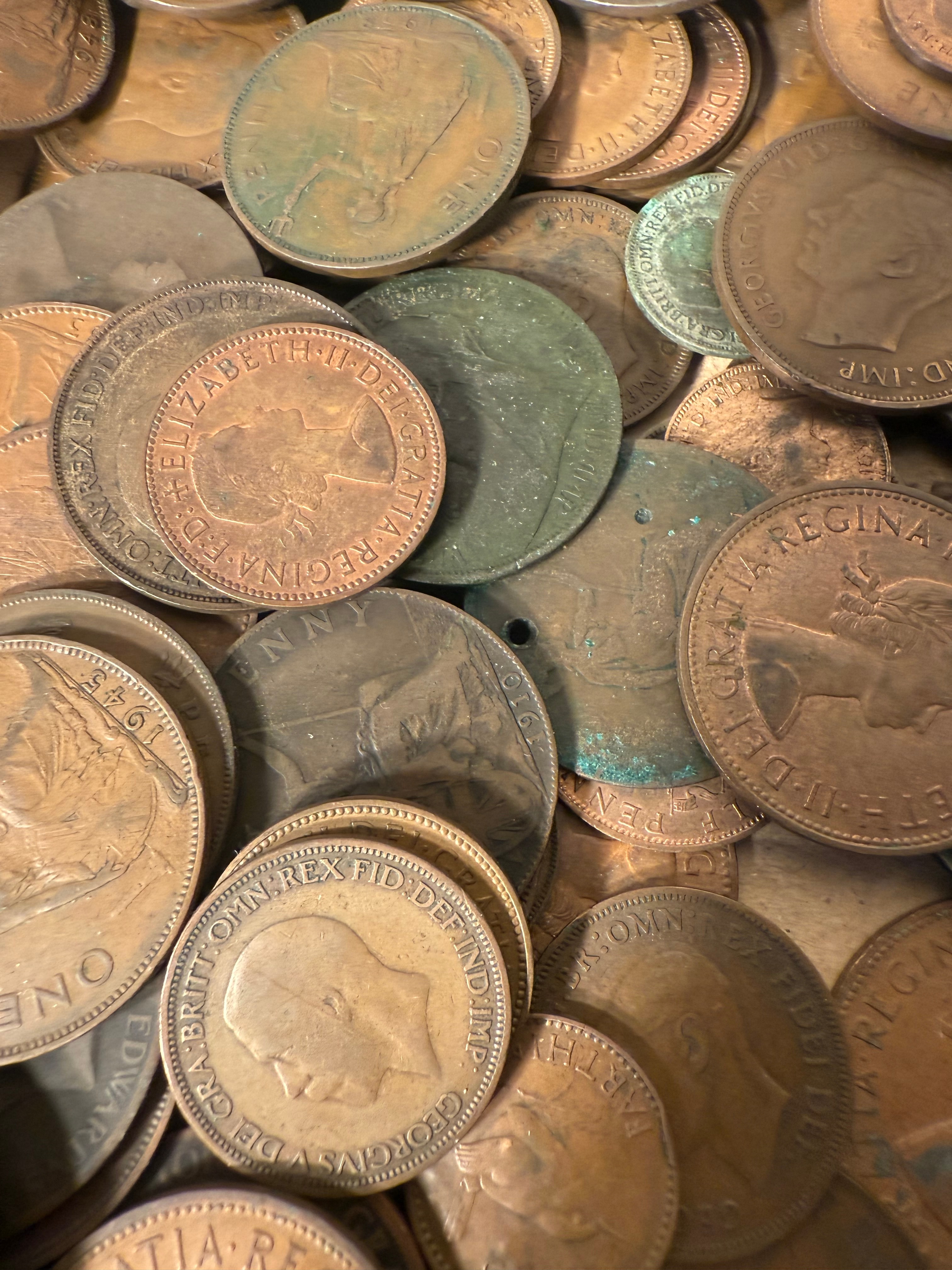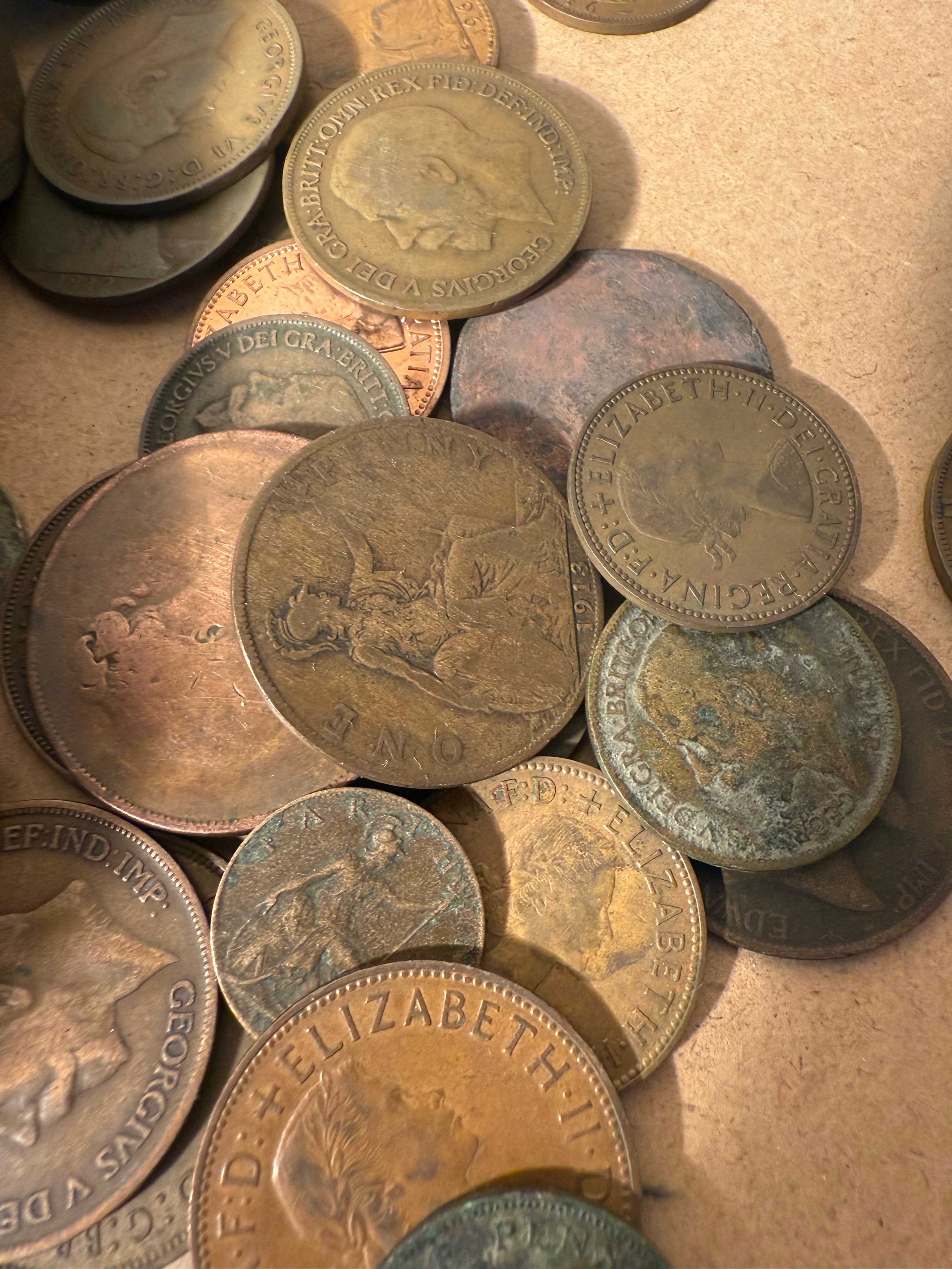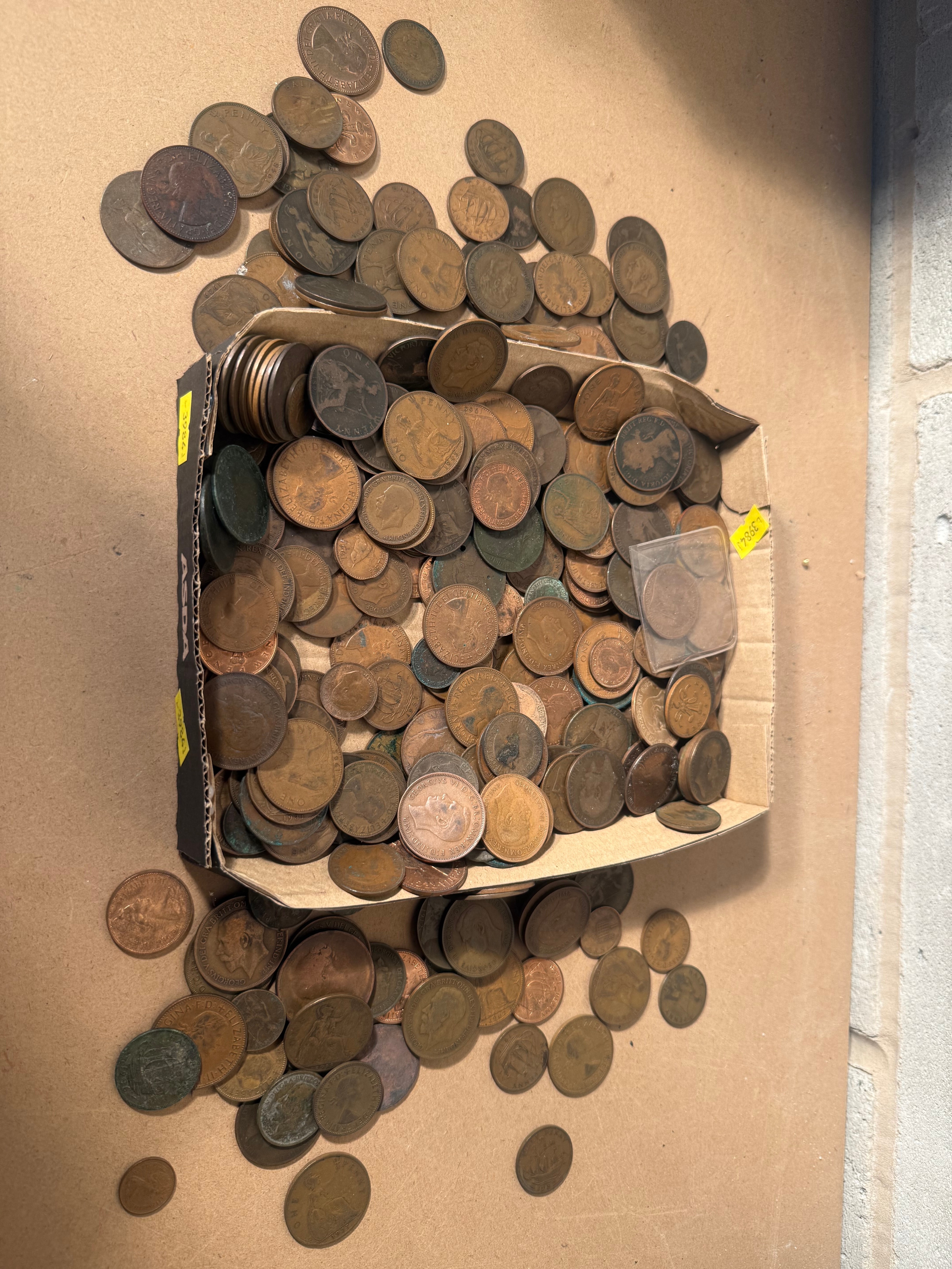 A collection of approximately 150-200 pre-decimal British copper/bronze ‘One Penny’ coins. The lot includes coins spanning multiple reigns, notably Edward VII, George V, and Elizabeth II. Visible inscriptions include “EDWARD VII DEI GRA BRITT OMN REX FID DEF IND IMP”, “GEORGIVS V DEI GRA: BRITT: OMN: REX FID: DEF: IND: IMP:”, and “ELIZABETH II DEI GRATIA REGINA F:D:”. Dates such as “1910” are legible. The coins are presented in and spilled from a small cardboard box.