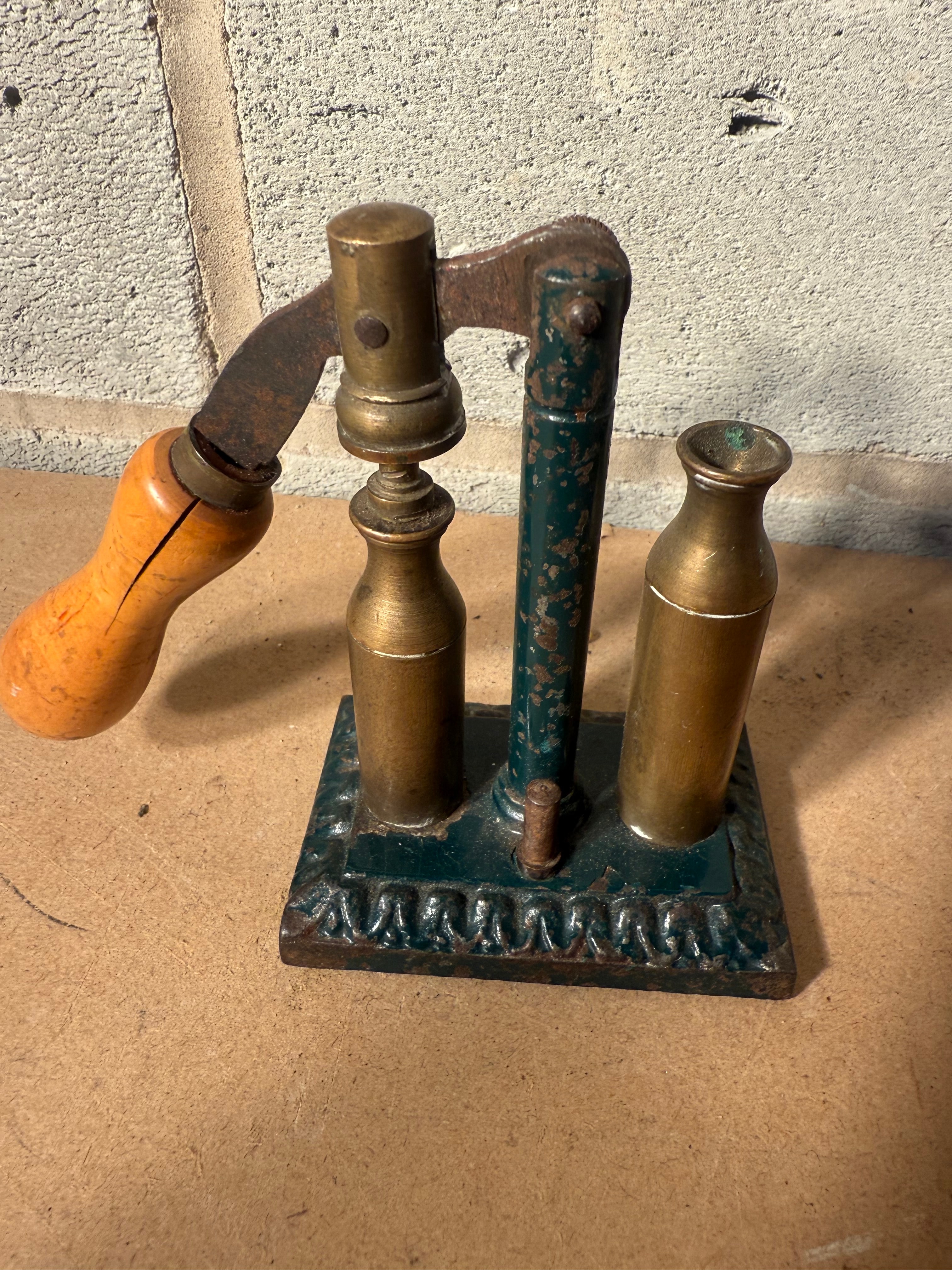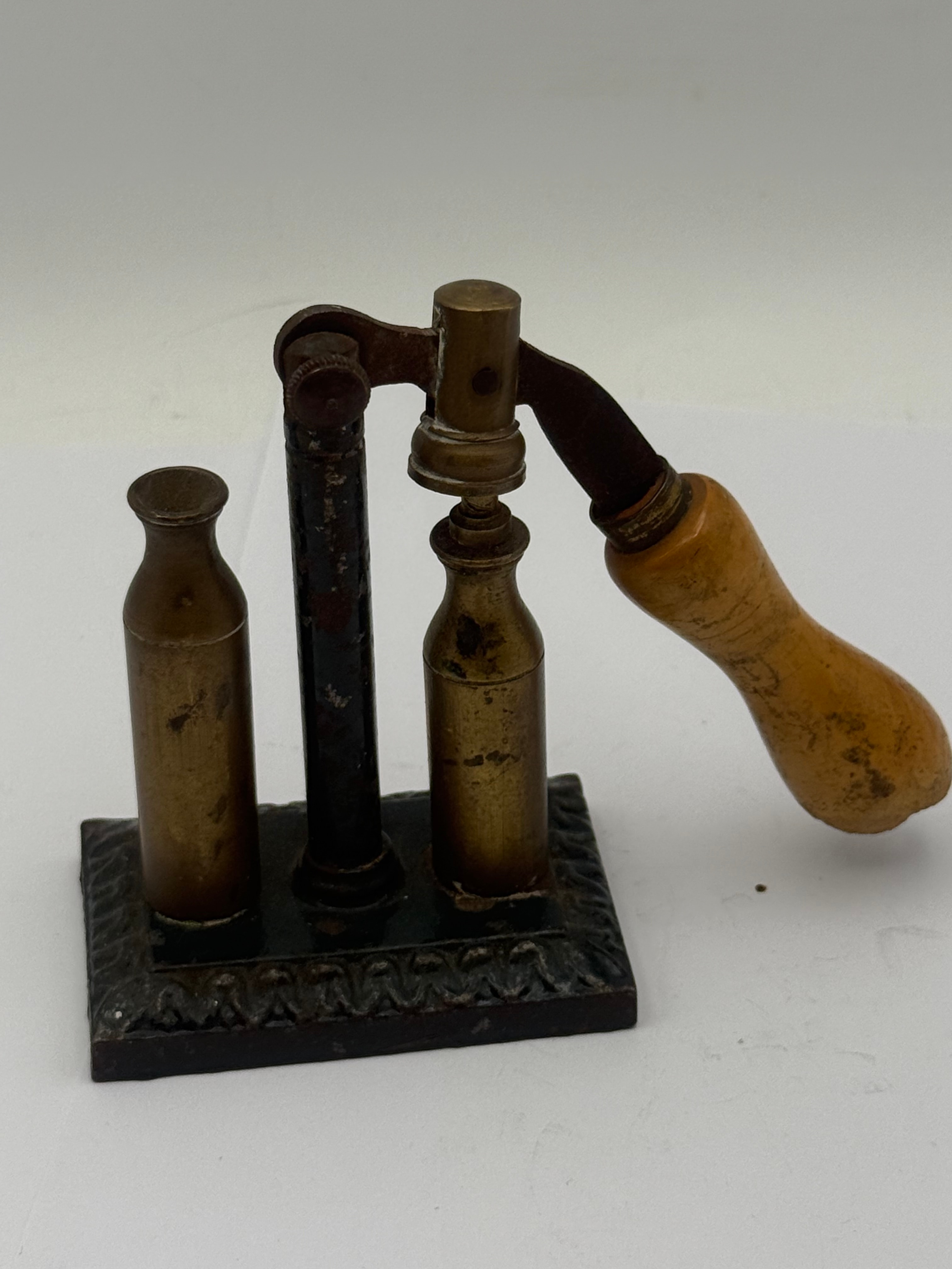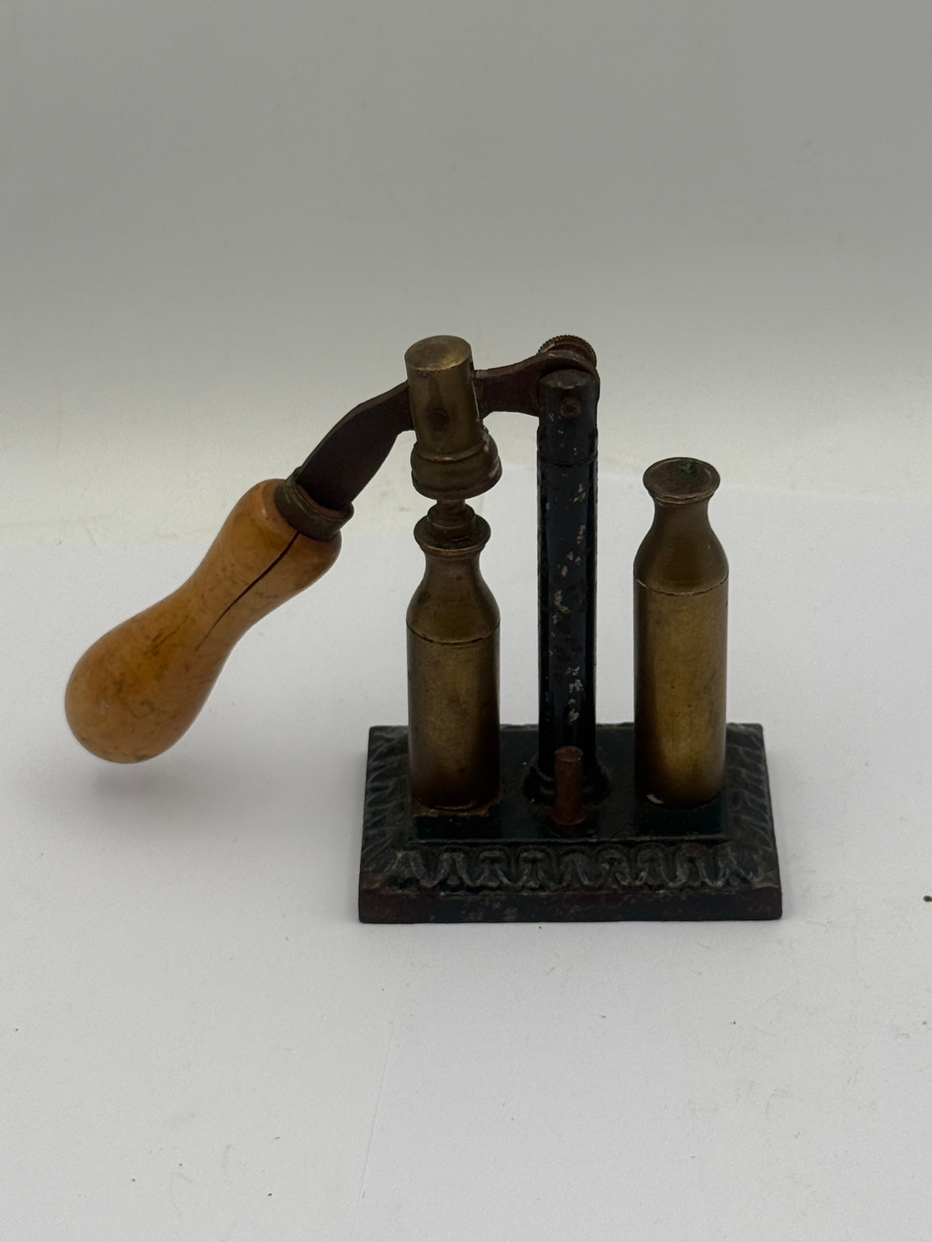 A Vintage Iron and Brass Capper and Decapper Primer Shotgun Tool. This small, mechanical device features a dark-painted cast iron base with decorative molding. An upright dark metal post supports a lever arm with a turned light-wood handle, activating a brass capping mechanism positioned over one of two integrated brass bottle-shaped components. The overall construction suggests a vintage or antique period.