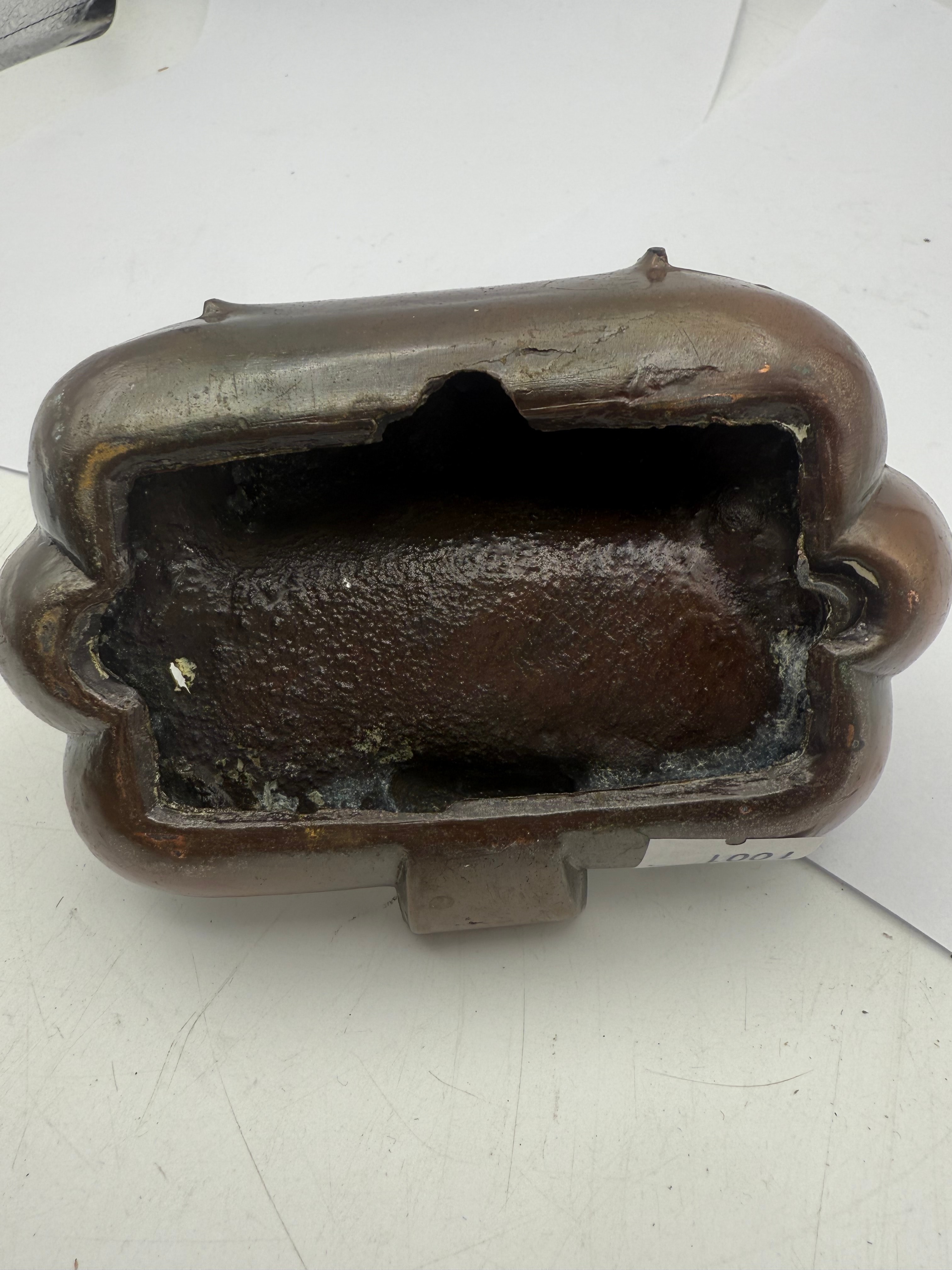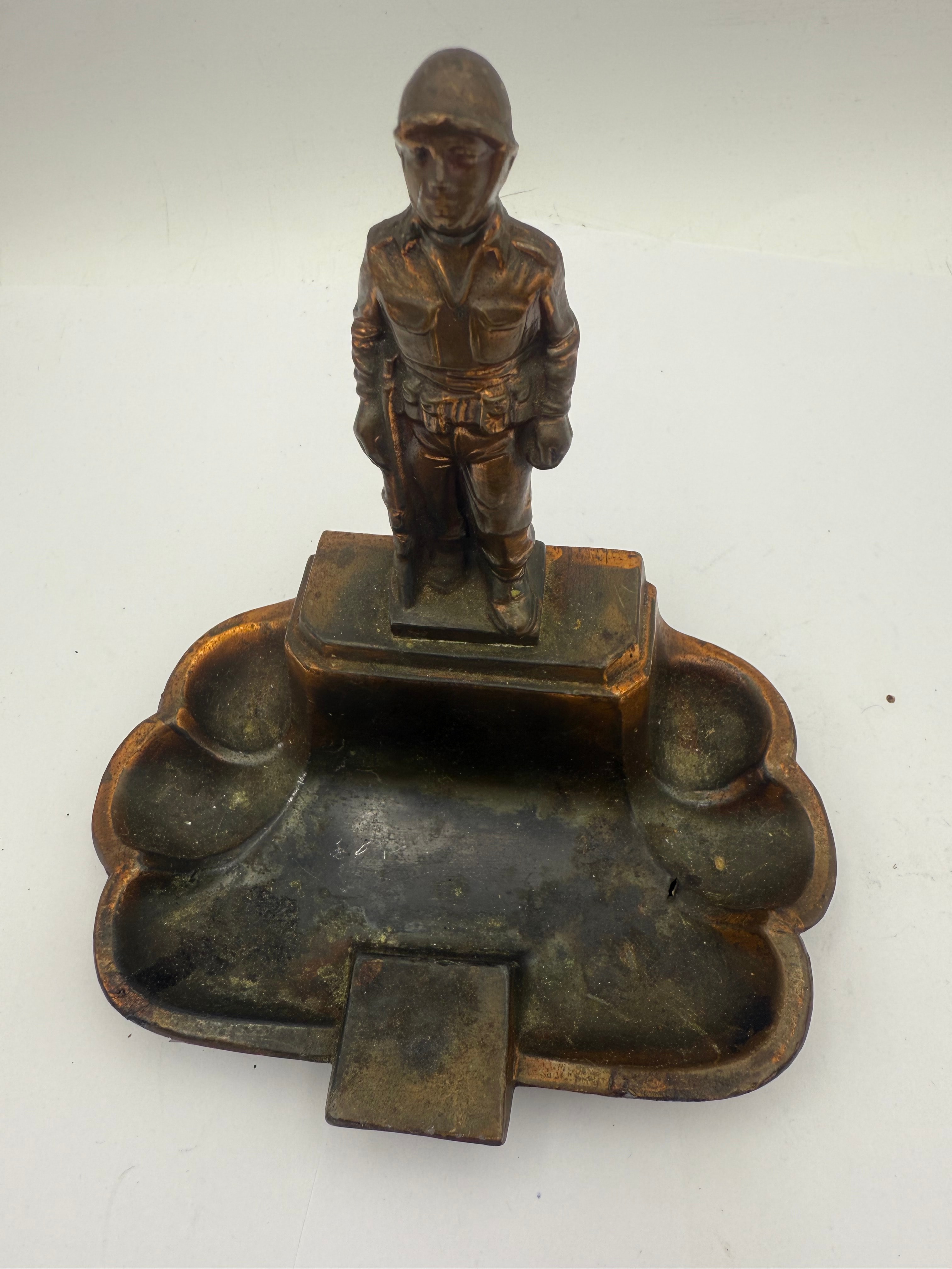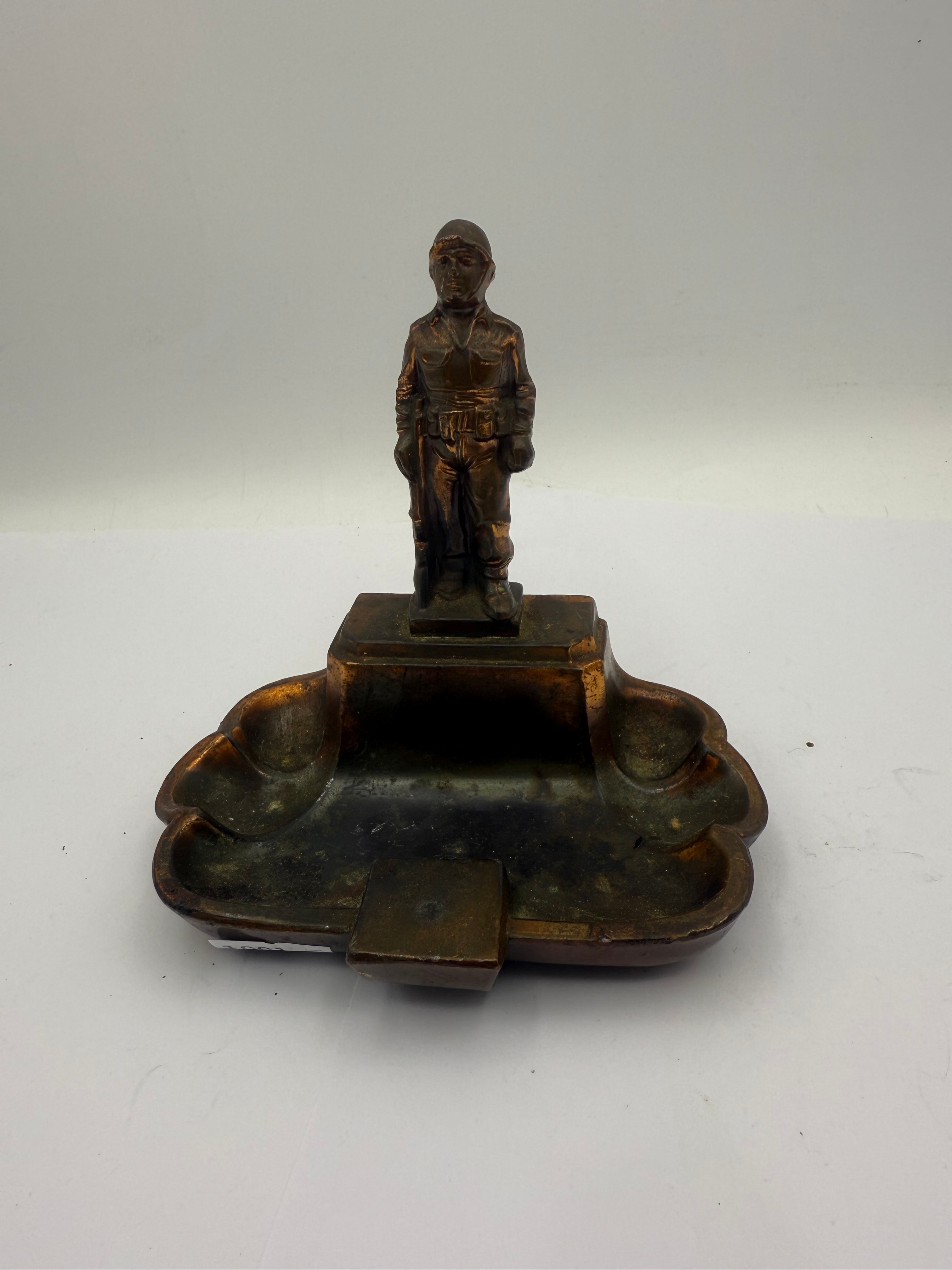 This figural ashtray, dating to the mid-20th century, is constructed from copper. It features a standing soldier figure, depicted in uniform with a helmet, mounted atop a rectangular plinth that rises from the center of a scalloped, multi-well ashtray base. A white inventory sticker marked “1001” is visible on the hollowed underside.