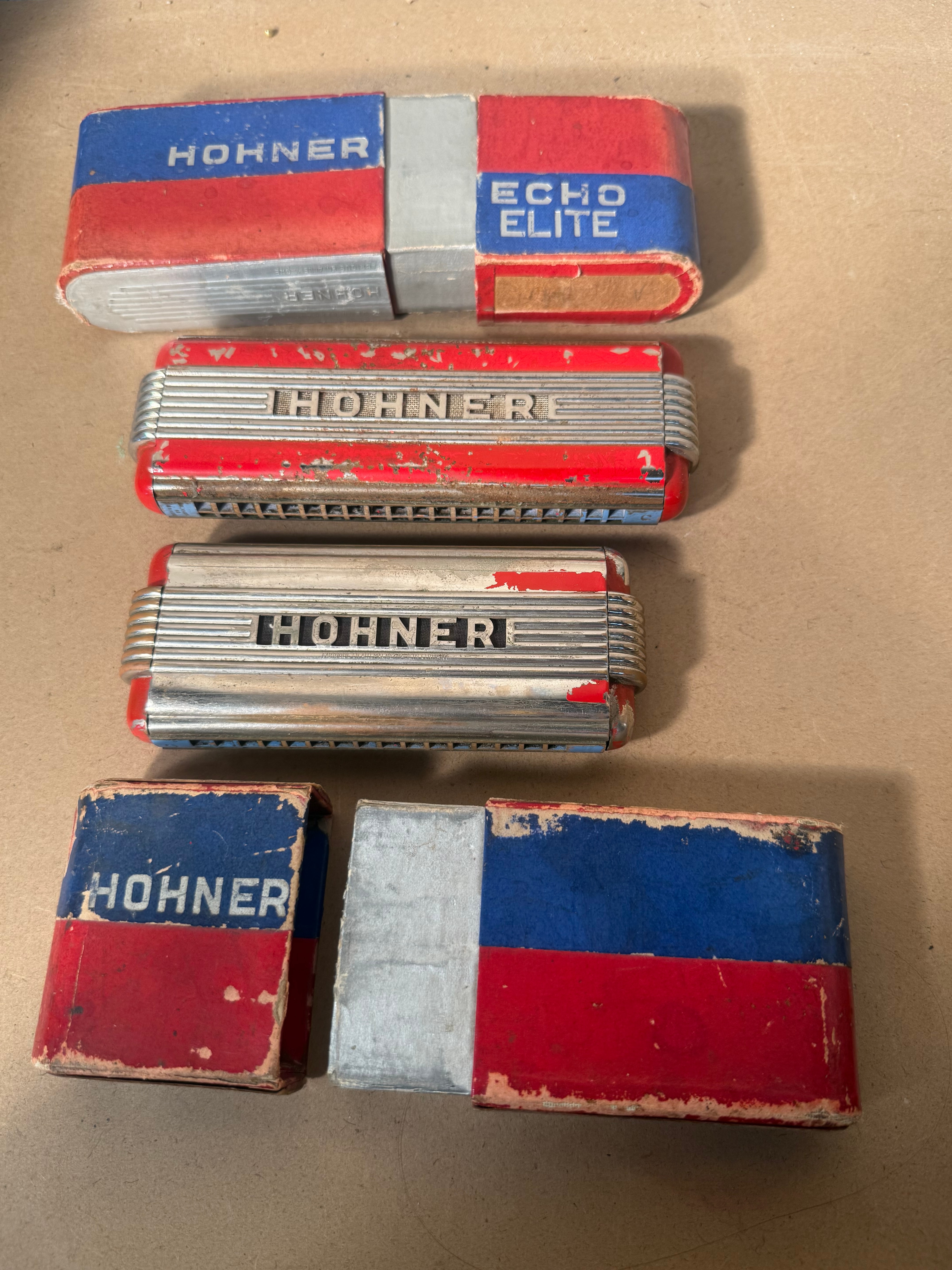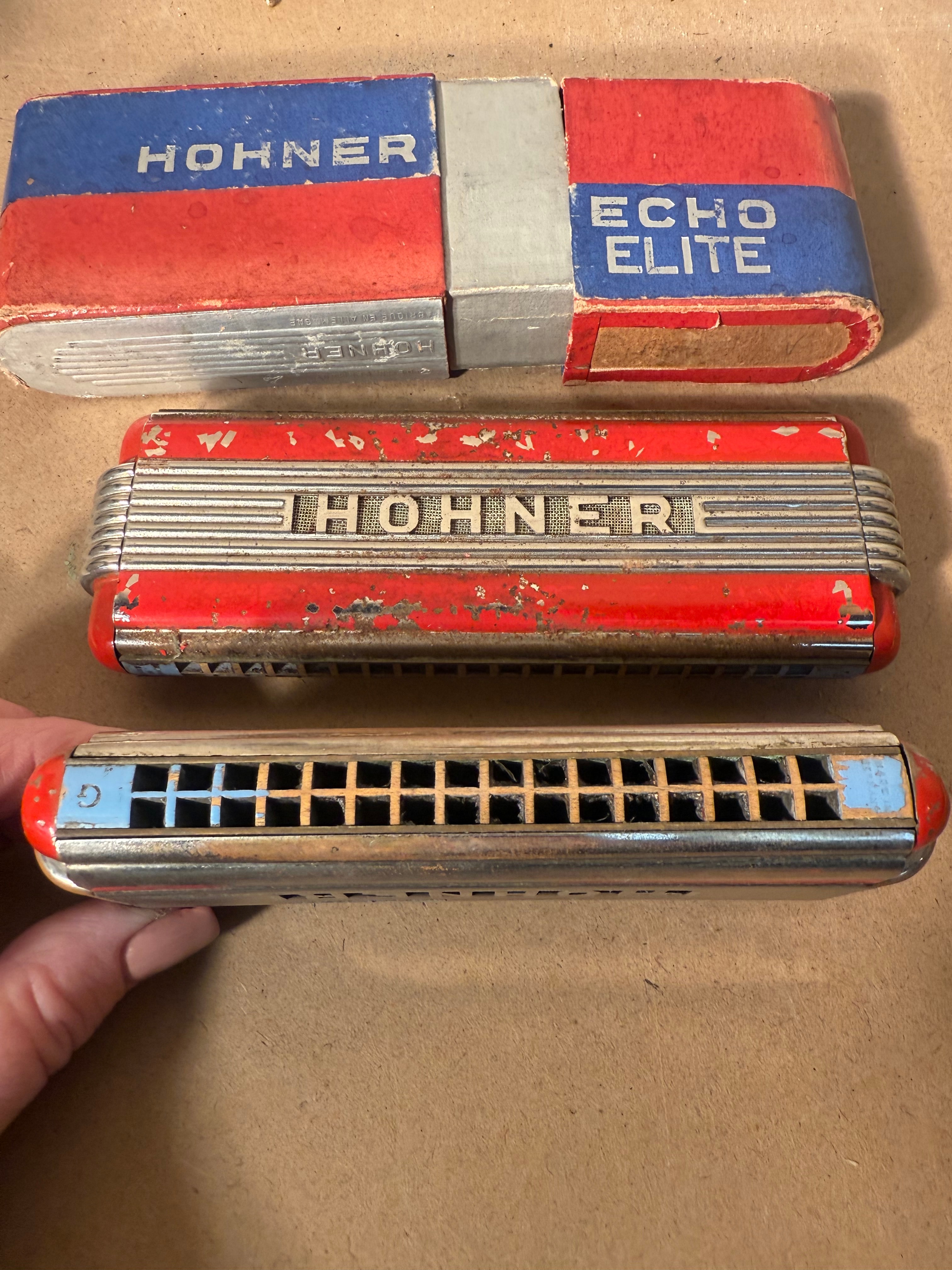 A pair of Hohner Echo Elite harmonicas, each featuring red painted metal covers with horizontal ribbed designs and “HOHNER” embossed centrally. One harmonica is visibly marked “G” on its side. The harmonicas are accompanied by two associated cardboard boxes, primarily red and blue with a silver/white band, marked “HOHNER” and “ECHO ELITE,” with one box also showing “M. HOHNER.”