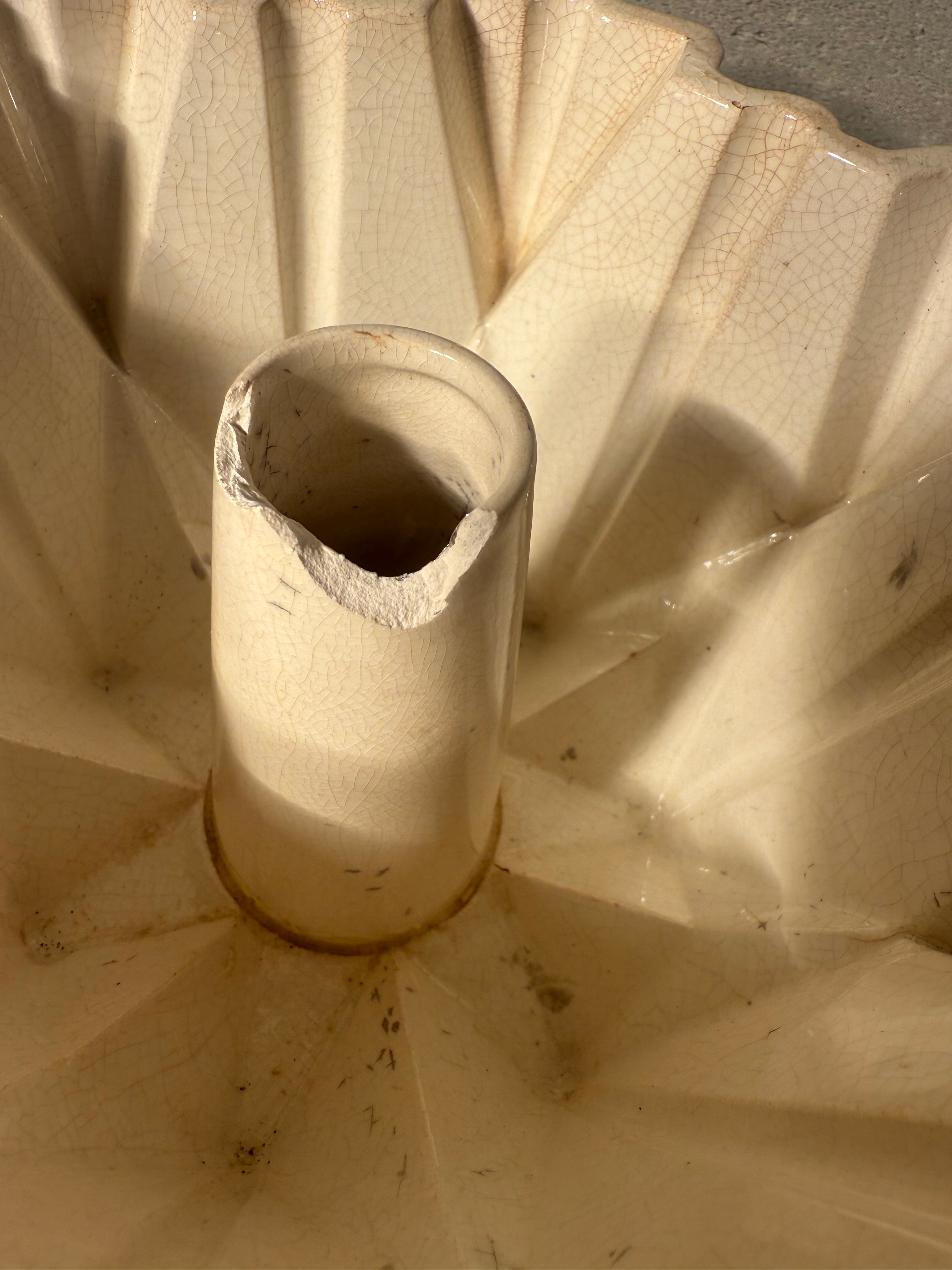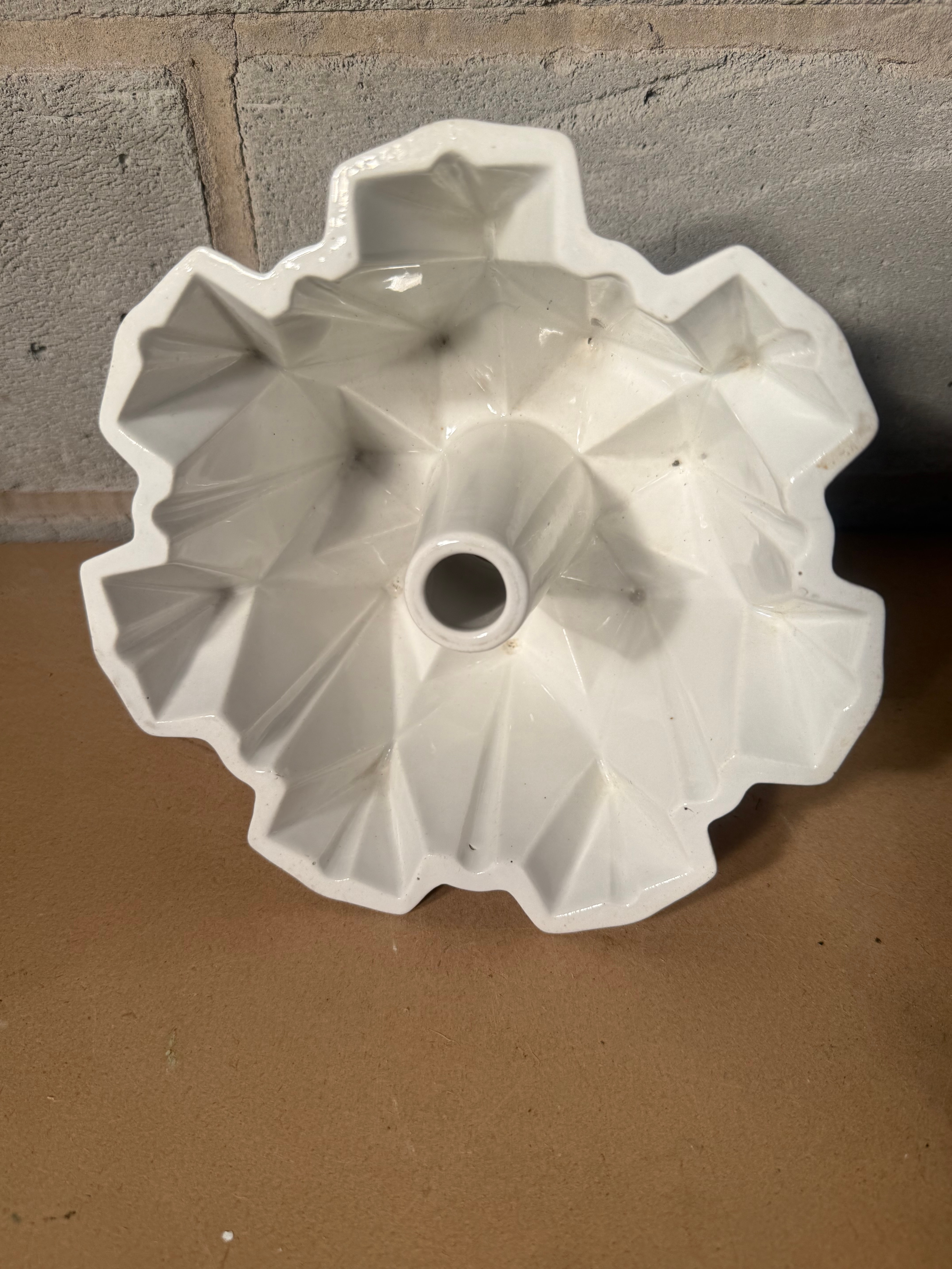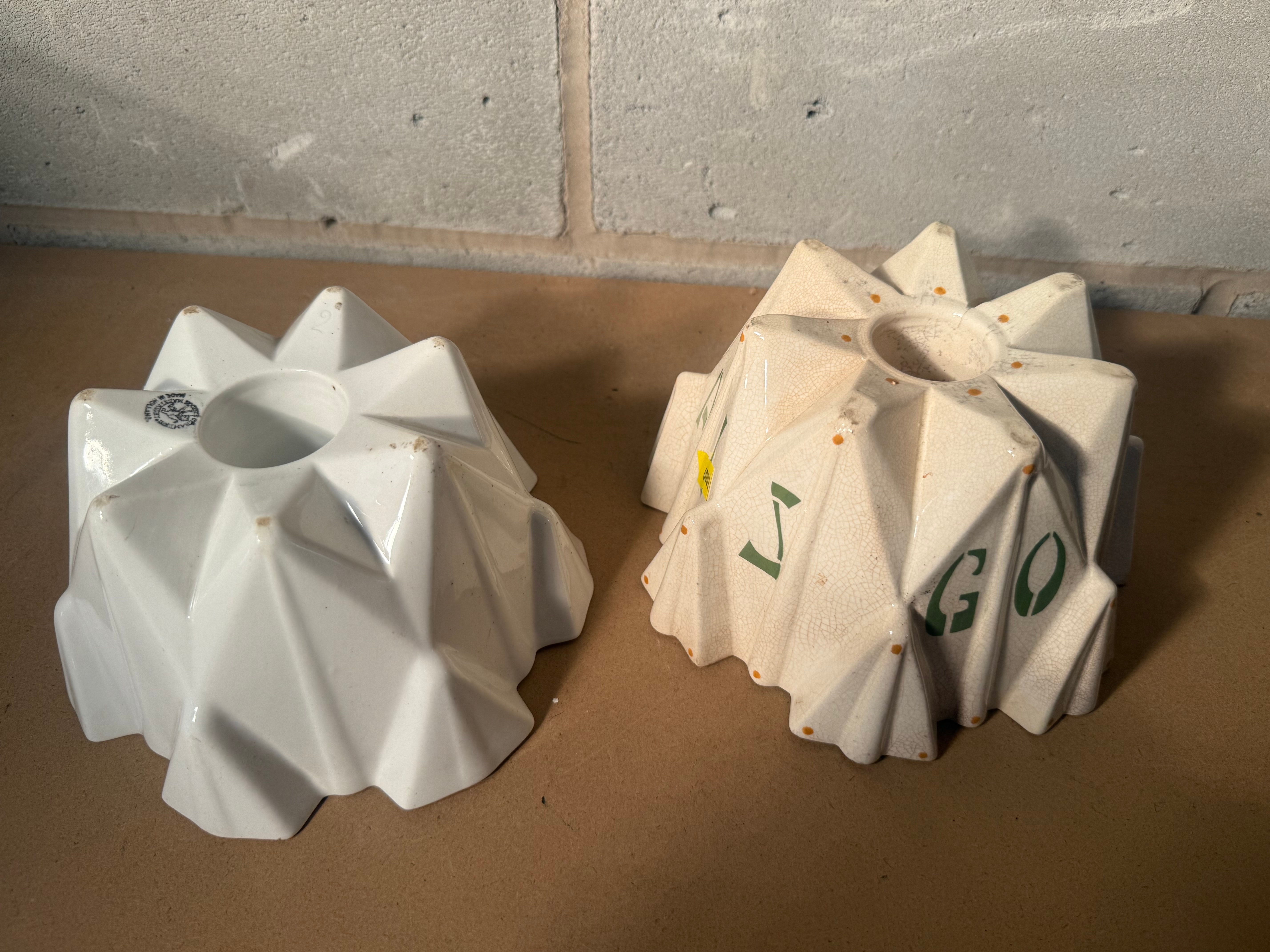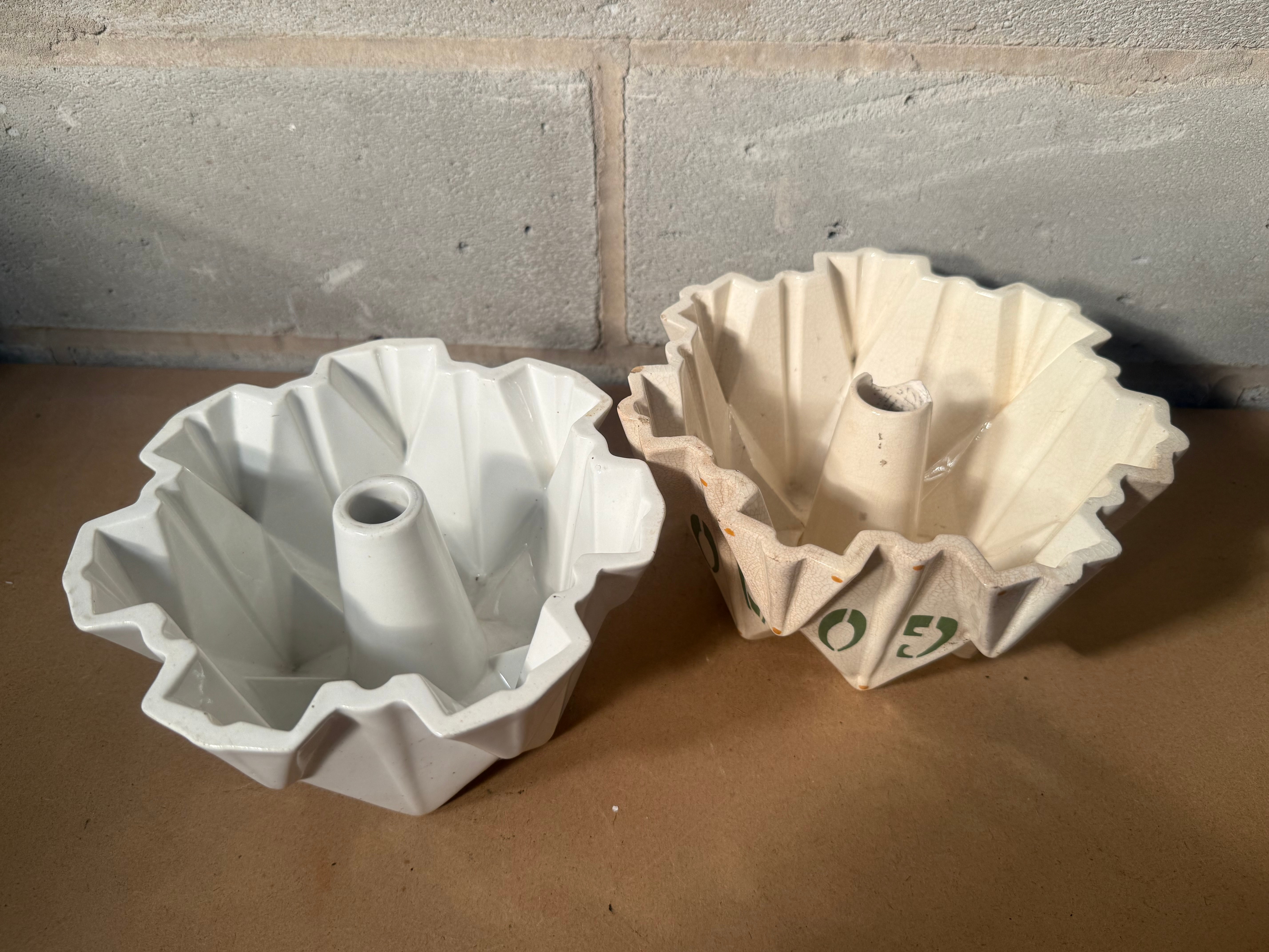 A pair of faceted, geometric, bundt-style baking molds, crafted from glazed ceramic. One mold is white with a glossy finish and features a largely illegible circular manufacturer’s stamp on its base. The second mold is cream-colored and displays green painted markings “52” and “JGO” (or “IGO”/”LGO”) on its exterior base.