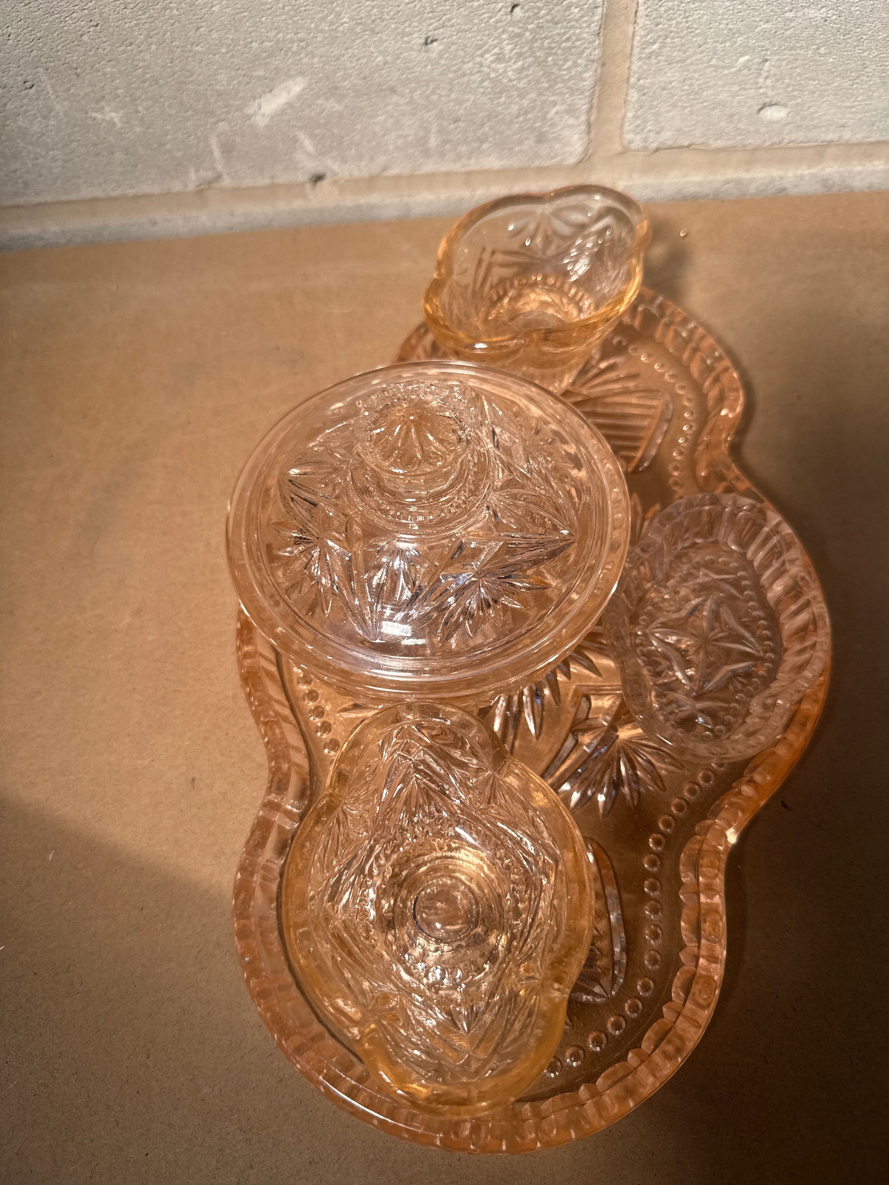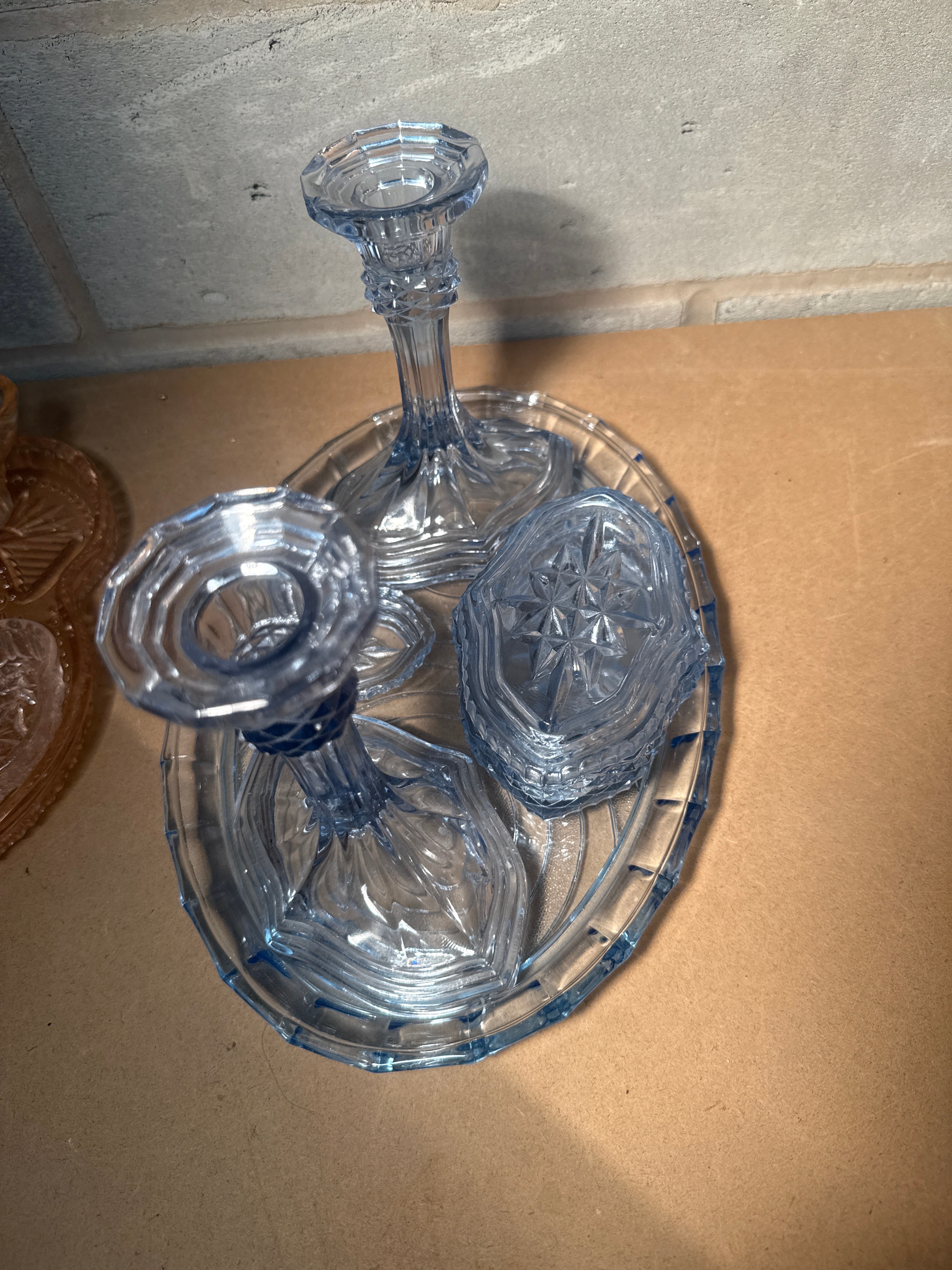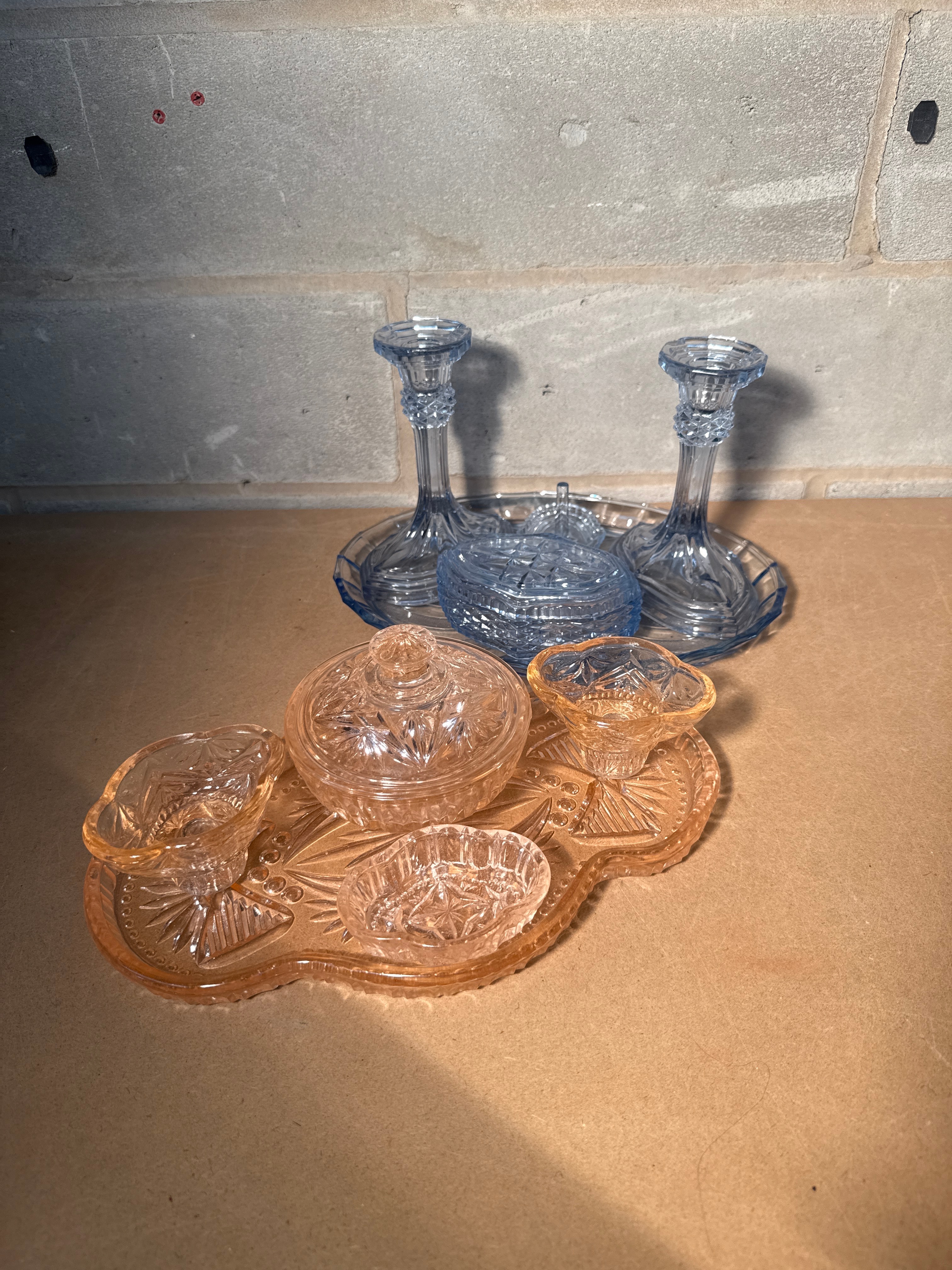 A group of Depression-era pressed glass vanity and accent sets. The pink ensemble comprises an ornate, scalloped-edge tray, a central lidded powder jar, and three smaller open dishes, all featuring a radiating starburst and geometric pattern. This set is characteristic of 1930s vanity or dressing table sets. The blue components include a pair of stemmed candlesticks, similarly adorned with radiating molded designs, and a small, lidded octagonal dish, possibly arranged on an oval tray with a ribbed edge. Both sets are crafted from glass with intricate molded details. No visible text or markings are present.