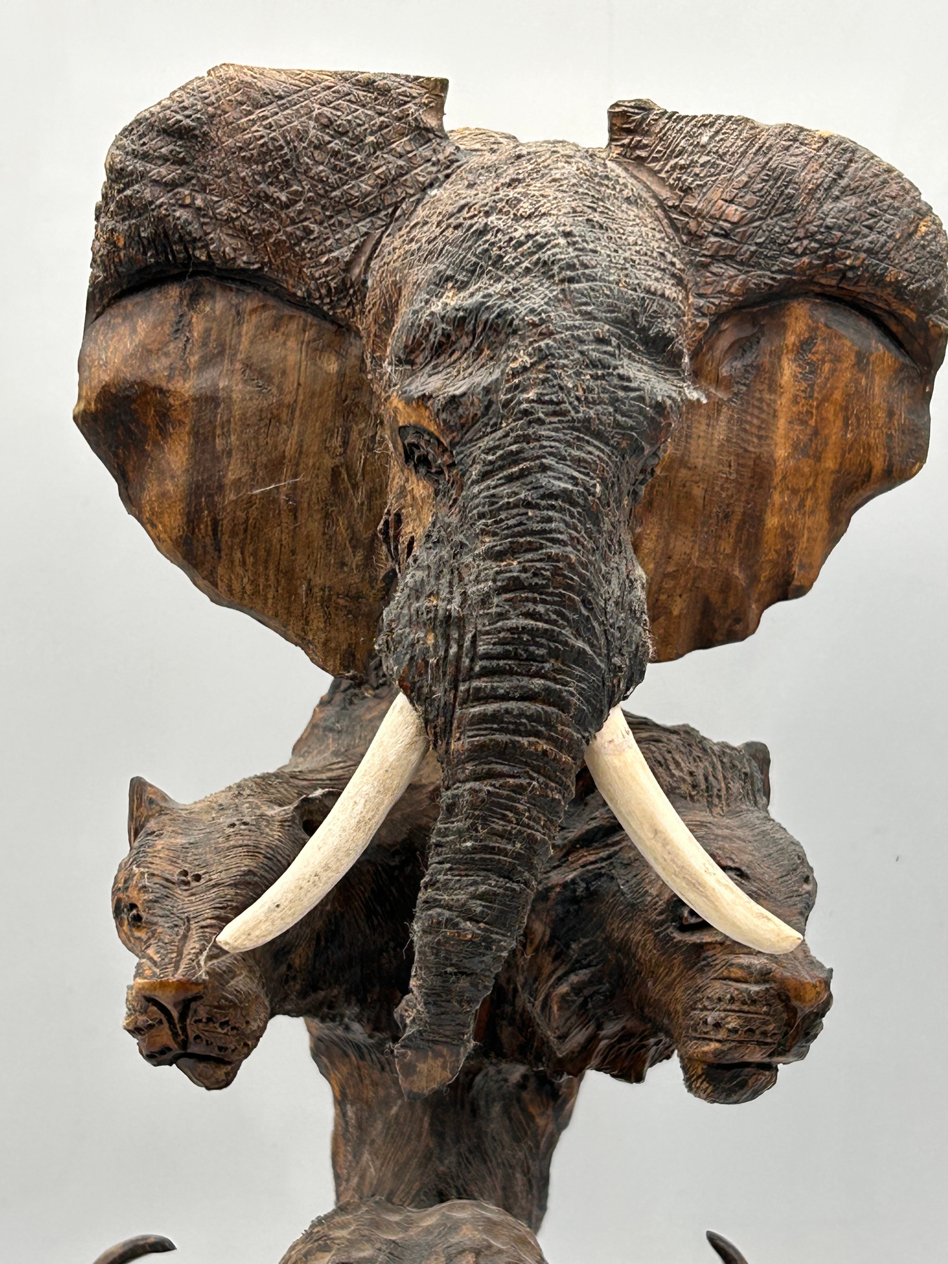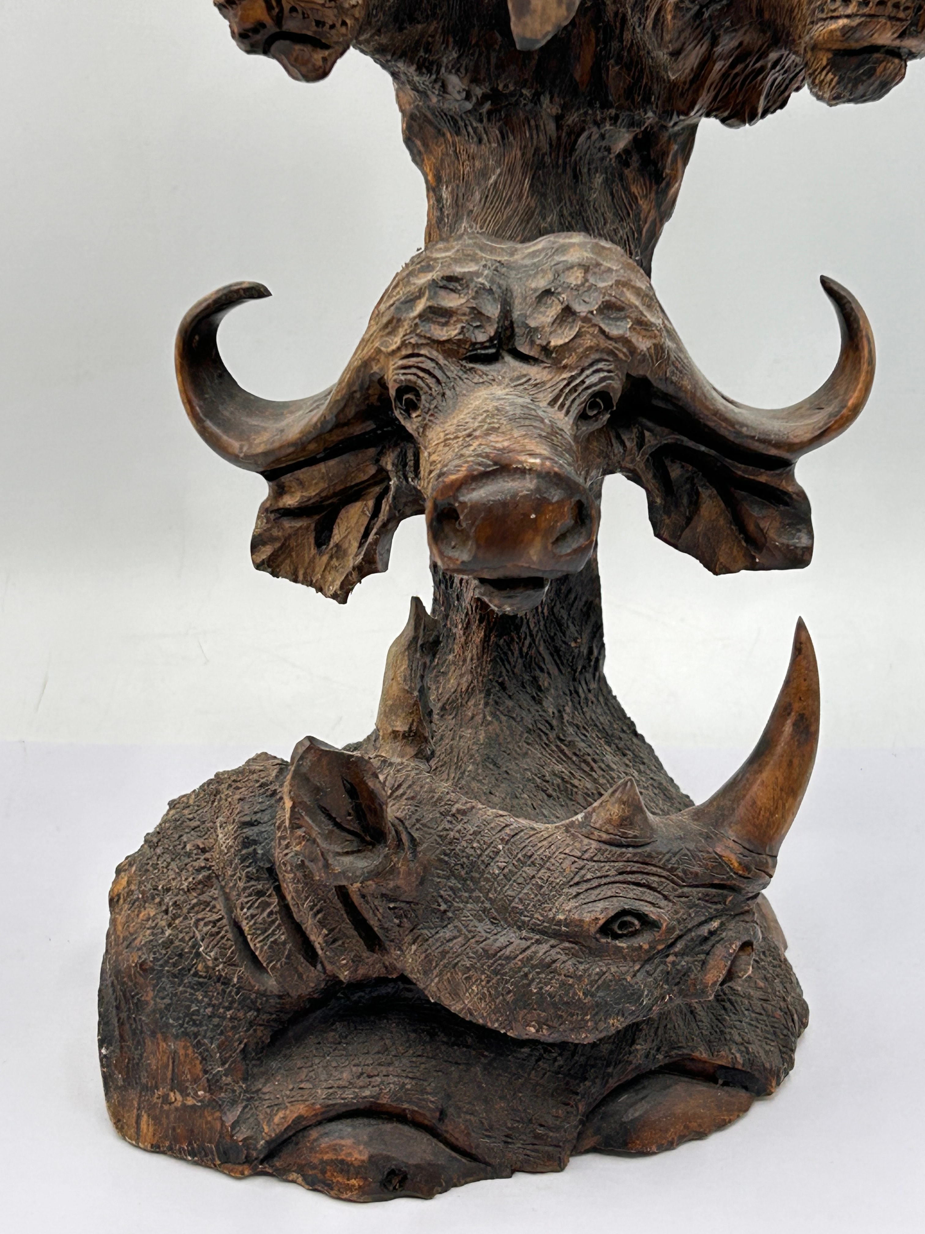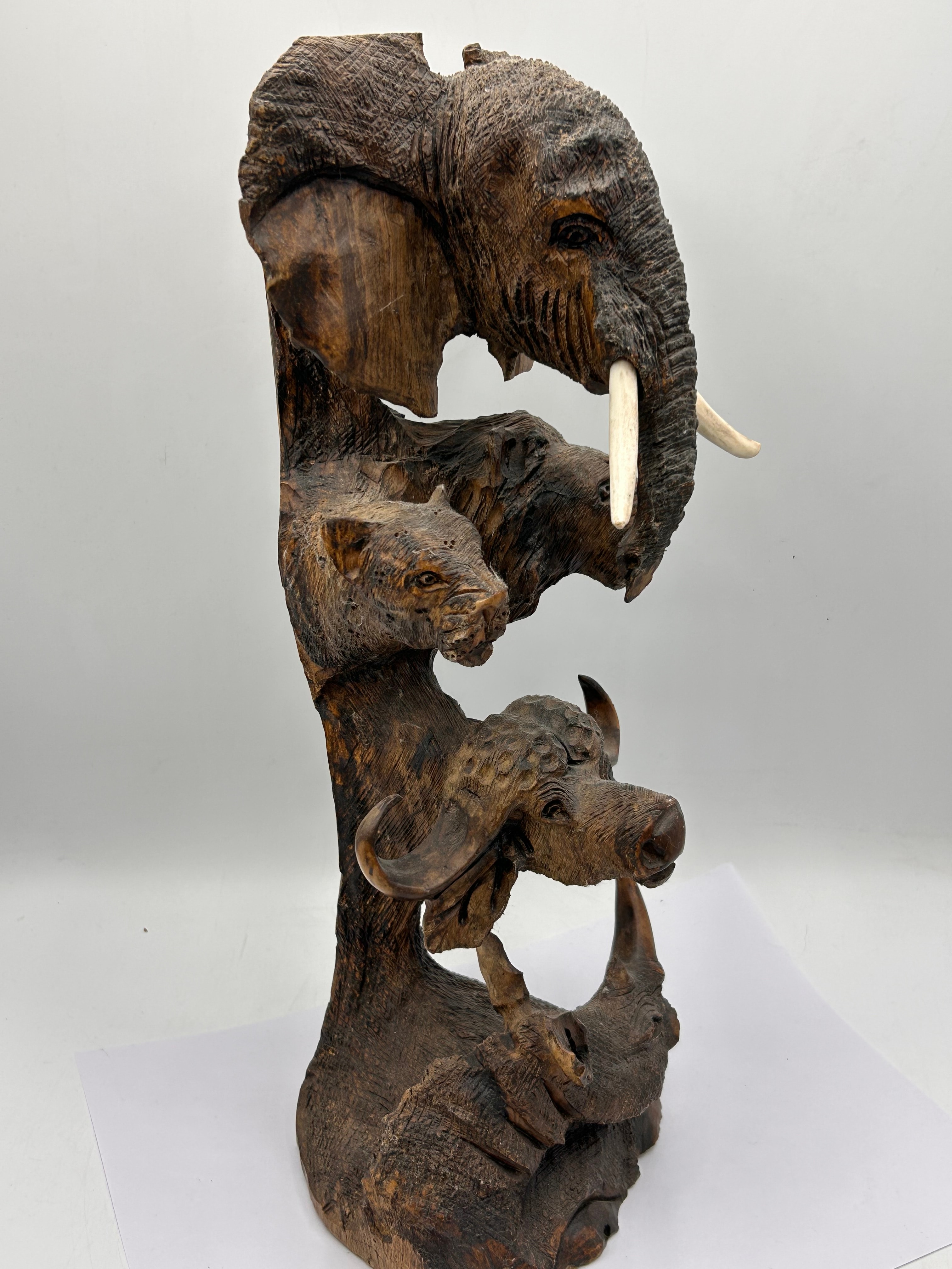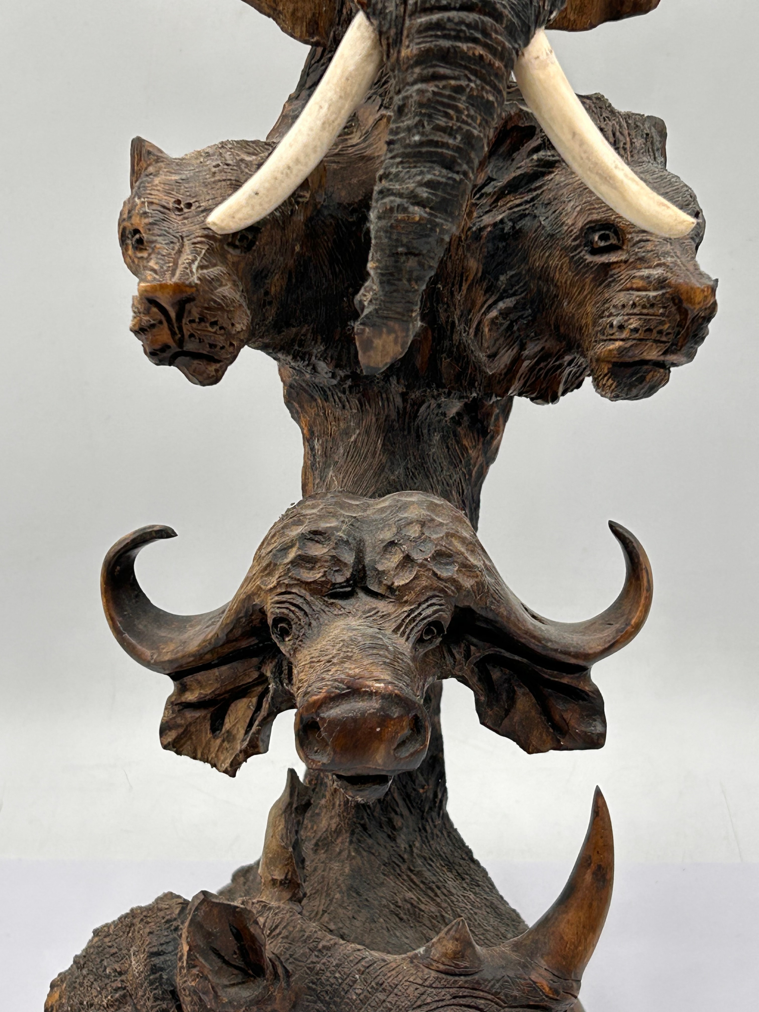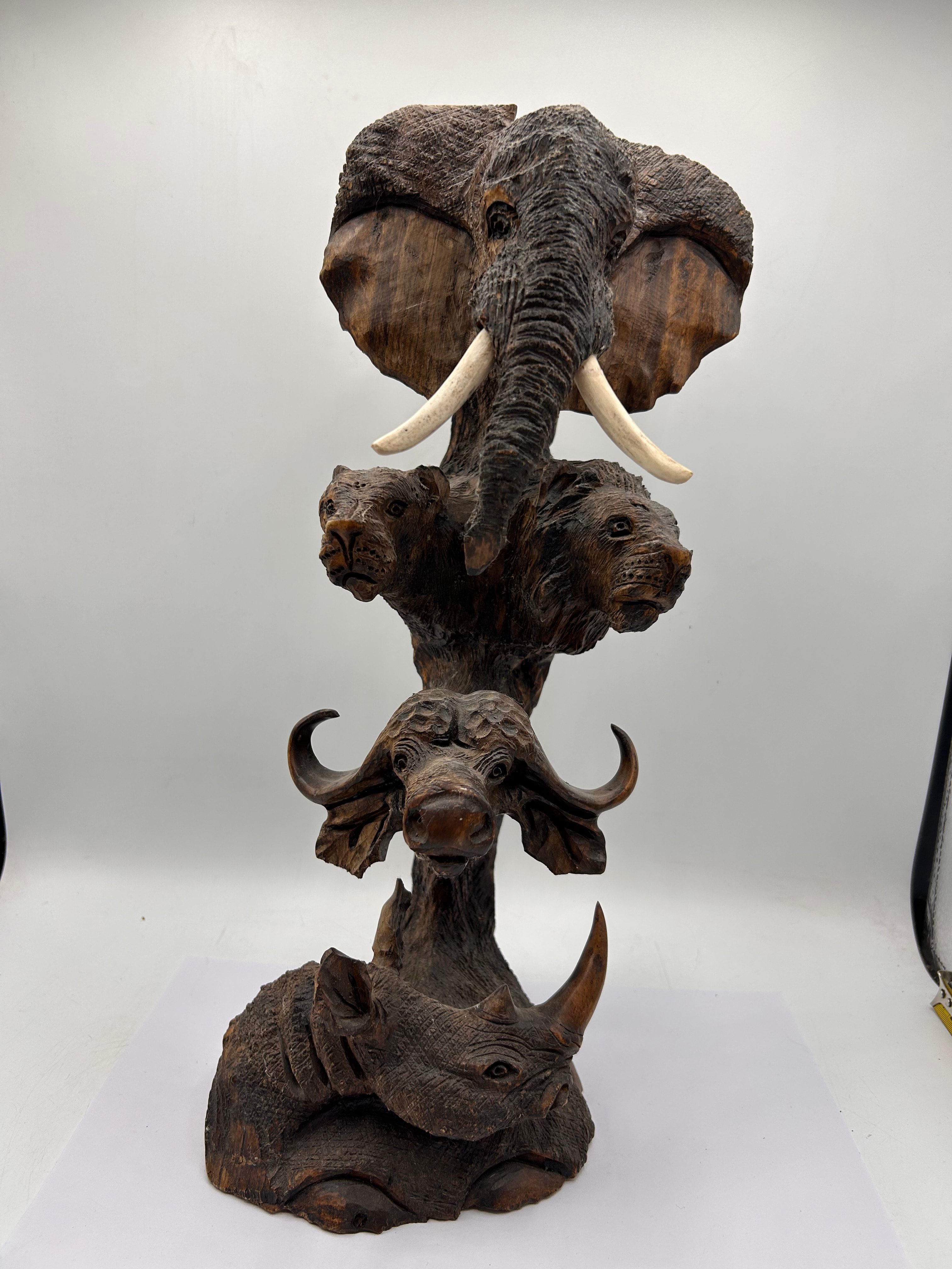 An Ebros carved wood sculpture depicting a stack of African ‘Big Five’ animals. From top to bottom, the sculpture features an elephant head with prominent light-colored tusks, followed by two lion heads, a Cape buffalo head, and a rhinoceros head and shoulders at the base. The carving exhibits a naturalistic style with a textured, dark brown finish. The tusks appear to be made of bone or a resin imitation. This piece is consistent with contemporary folk art or craft, potentially African-inspired.
