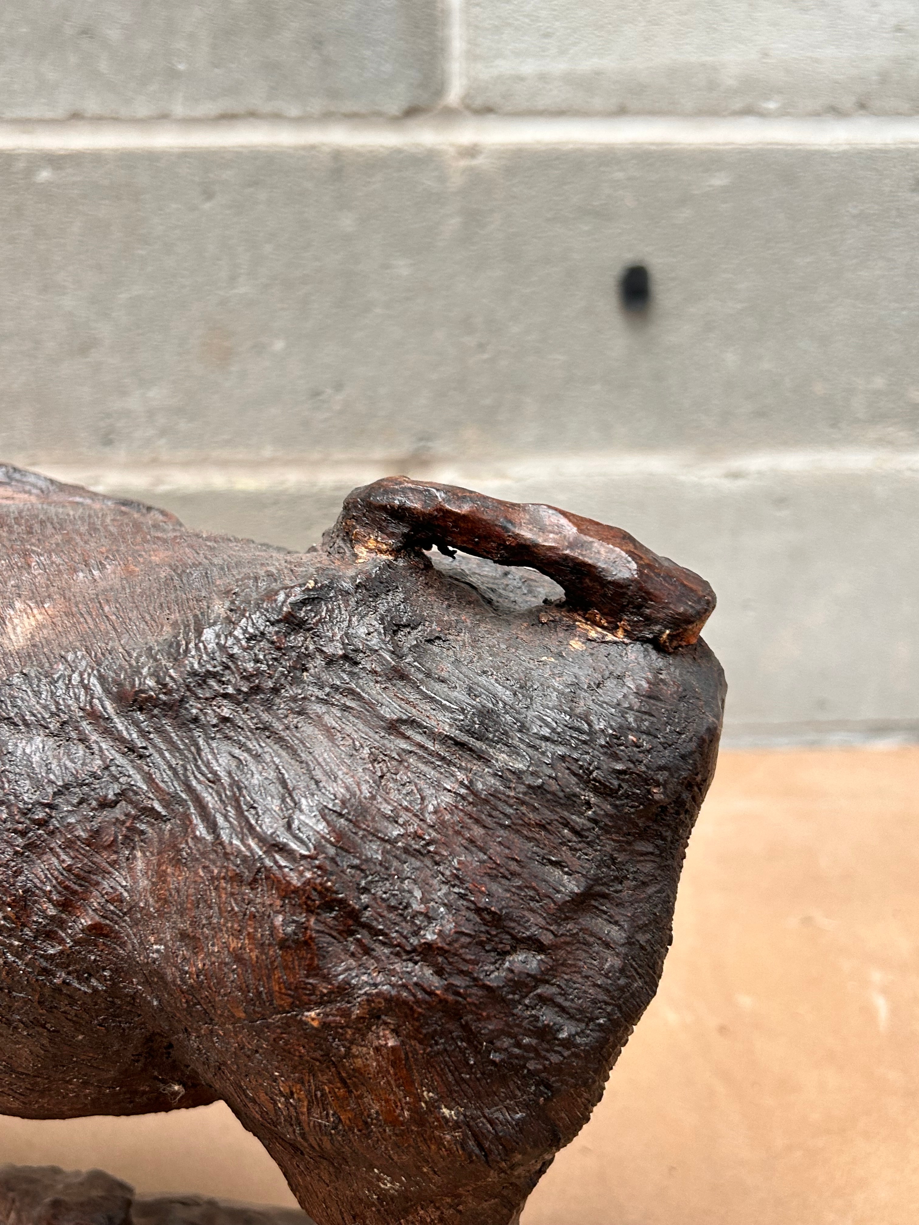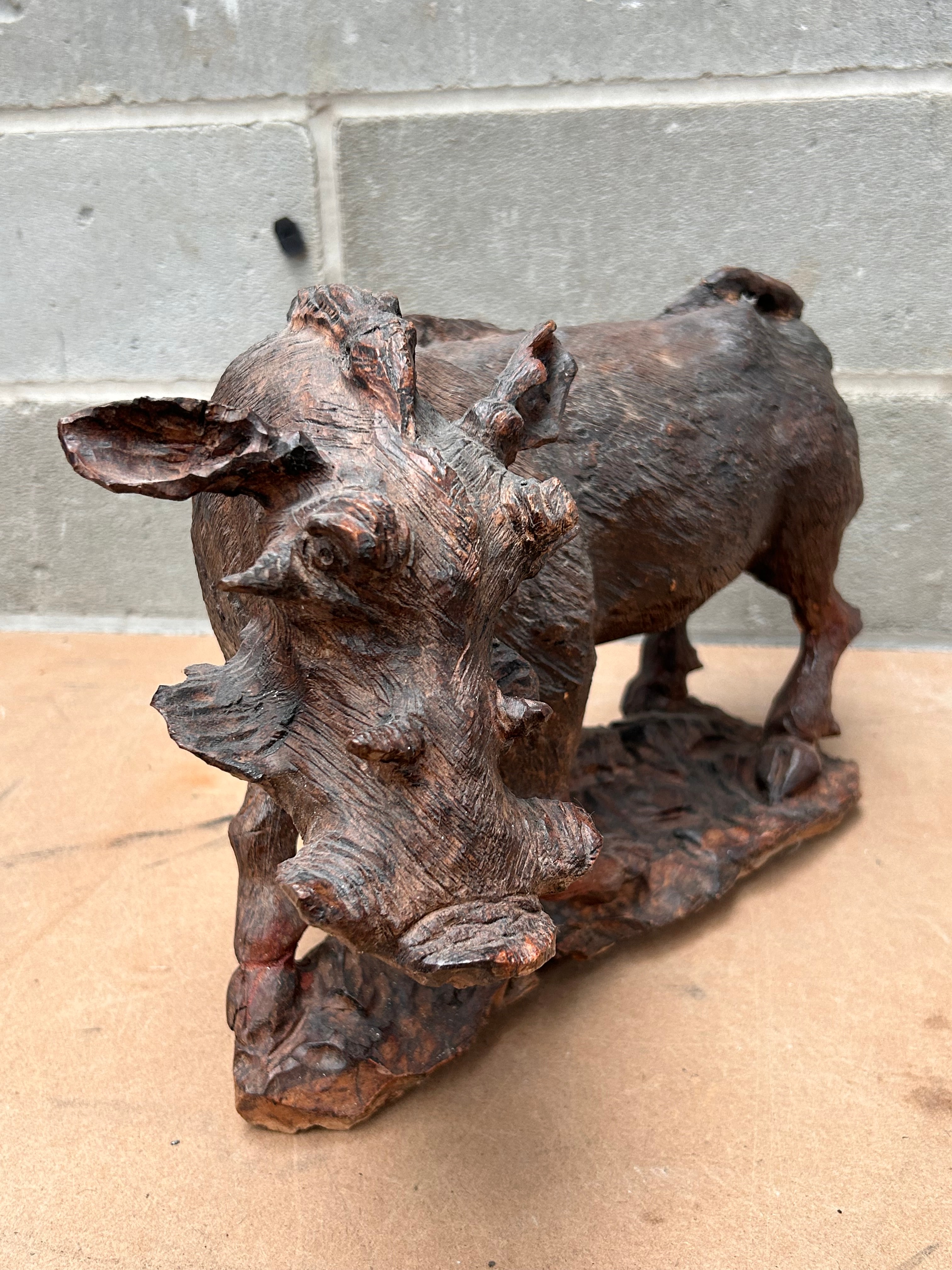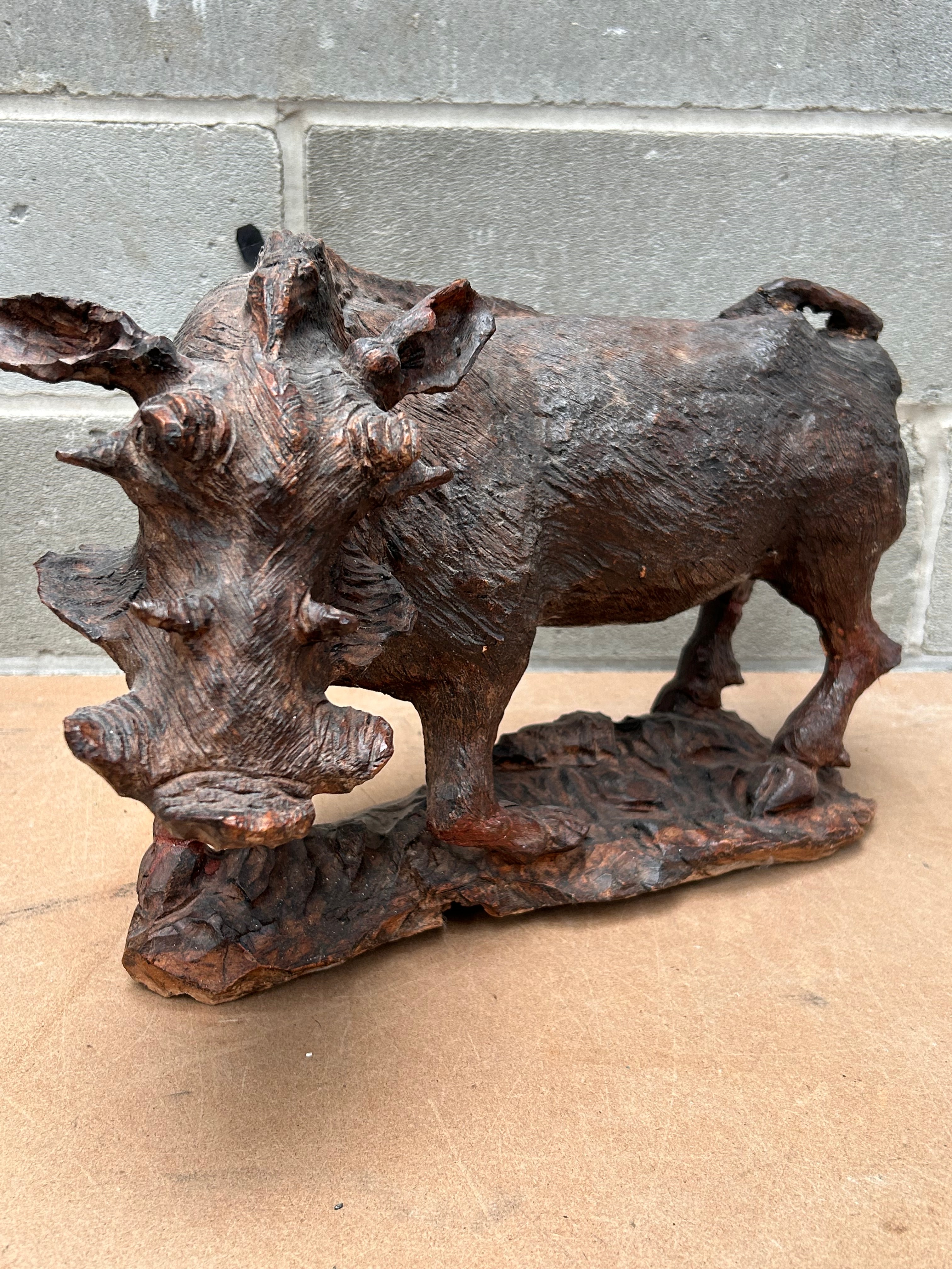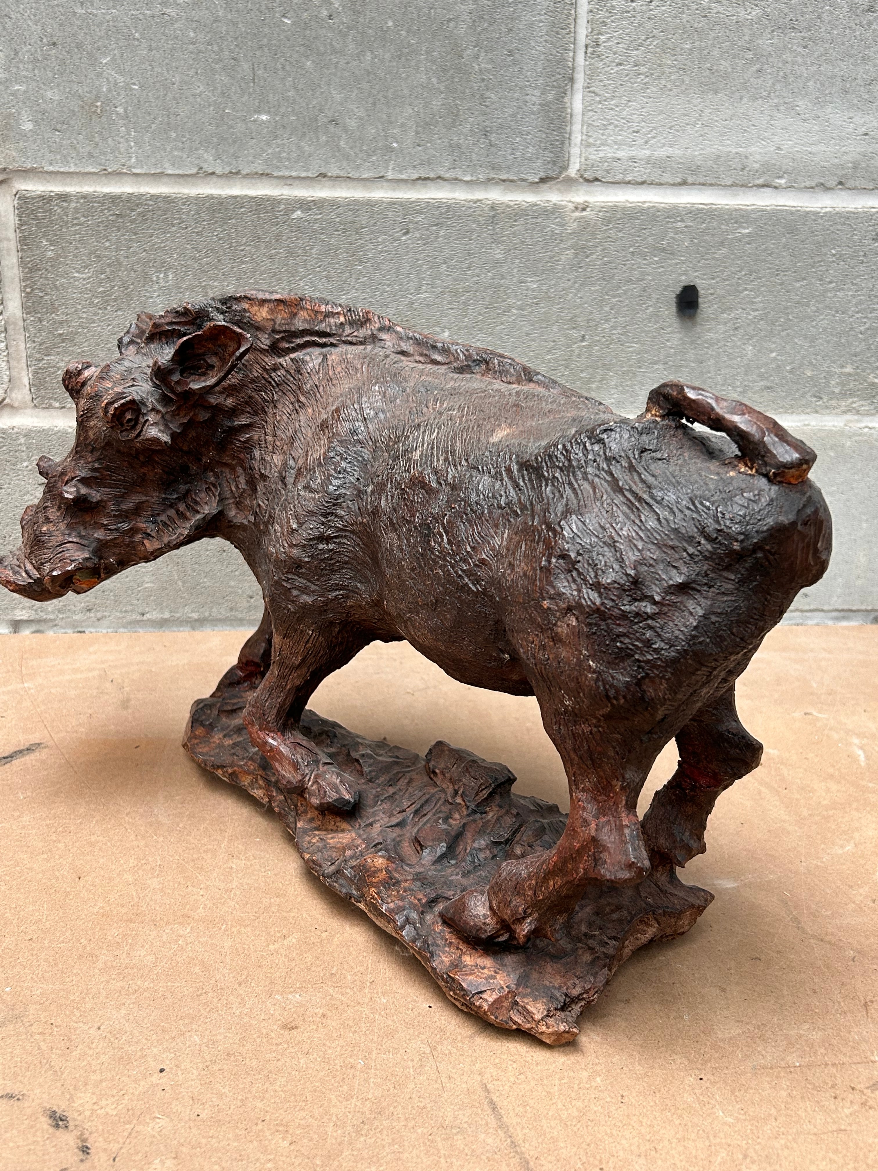 A carved wooden sculpture depicting a warthog in a naturalistic, rustic style, standing on an integrated base. The dark brown wooden material features a highly textured surface, mimicking coarse hair or skin. The animal’s distinctive features, including its tusks, prominent facial warts, and ears, are clearly rendered. No discernible text, signatures, or maker’s marks are visible.