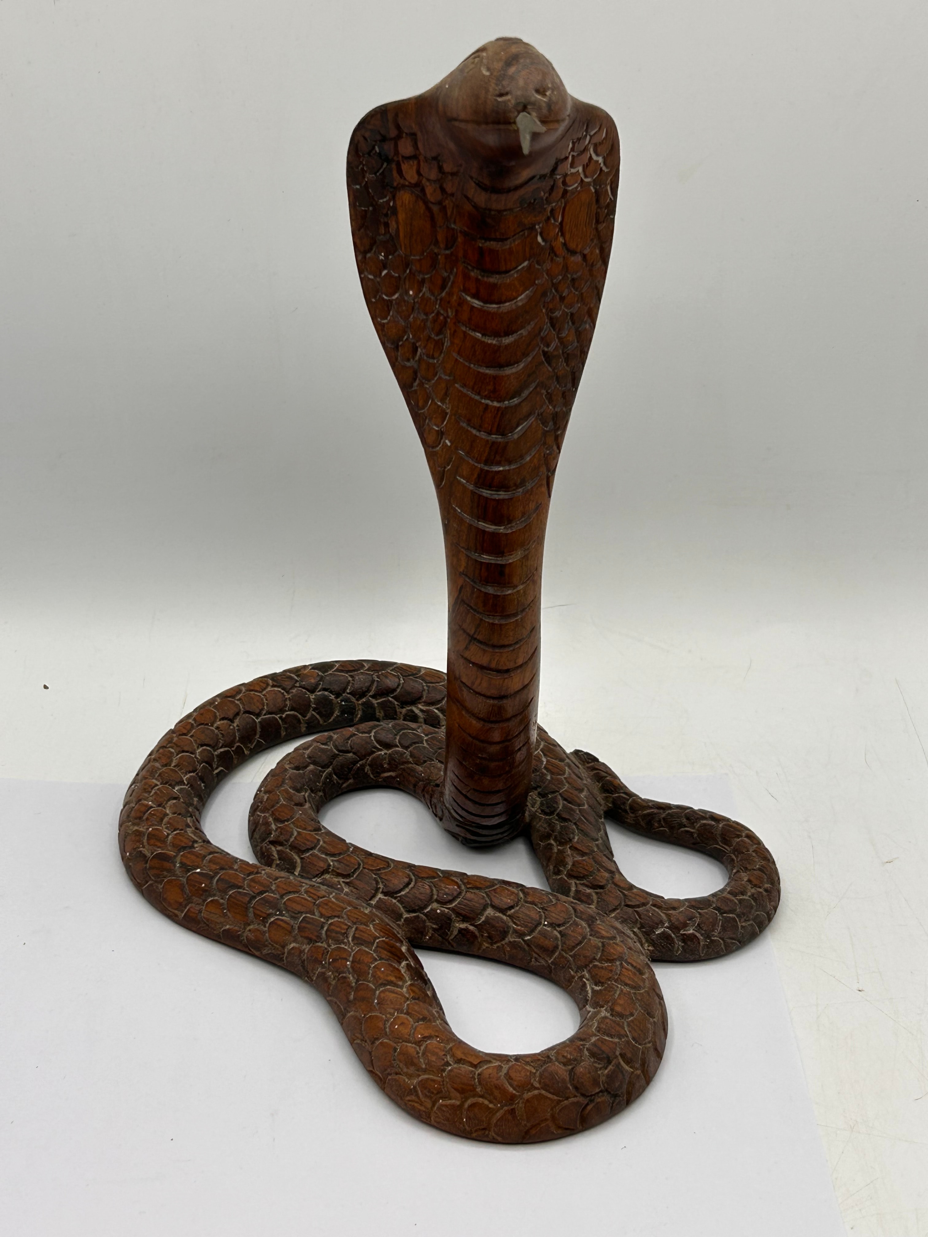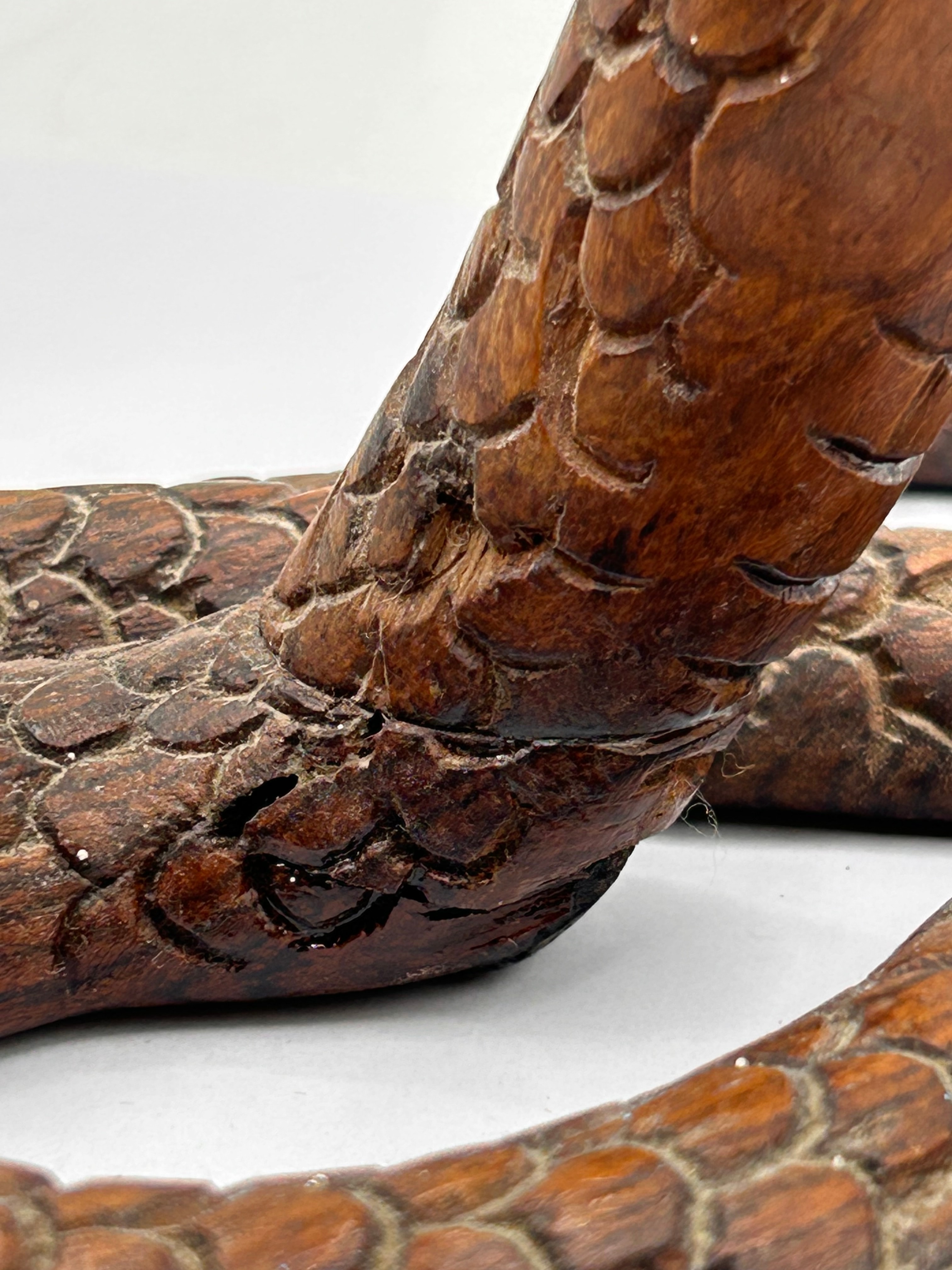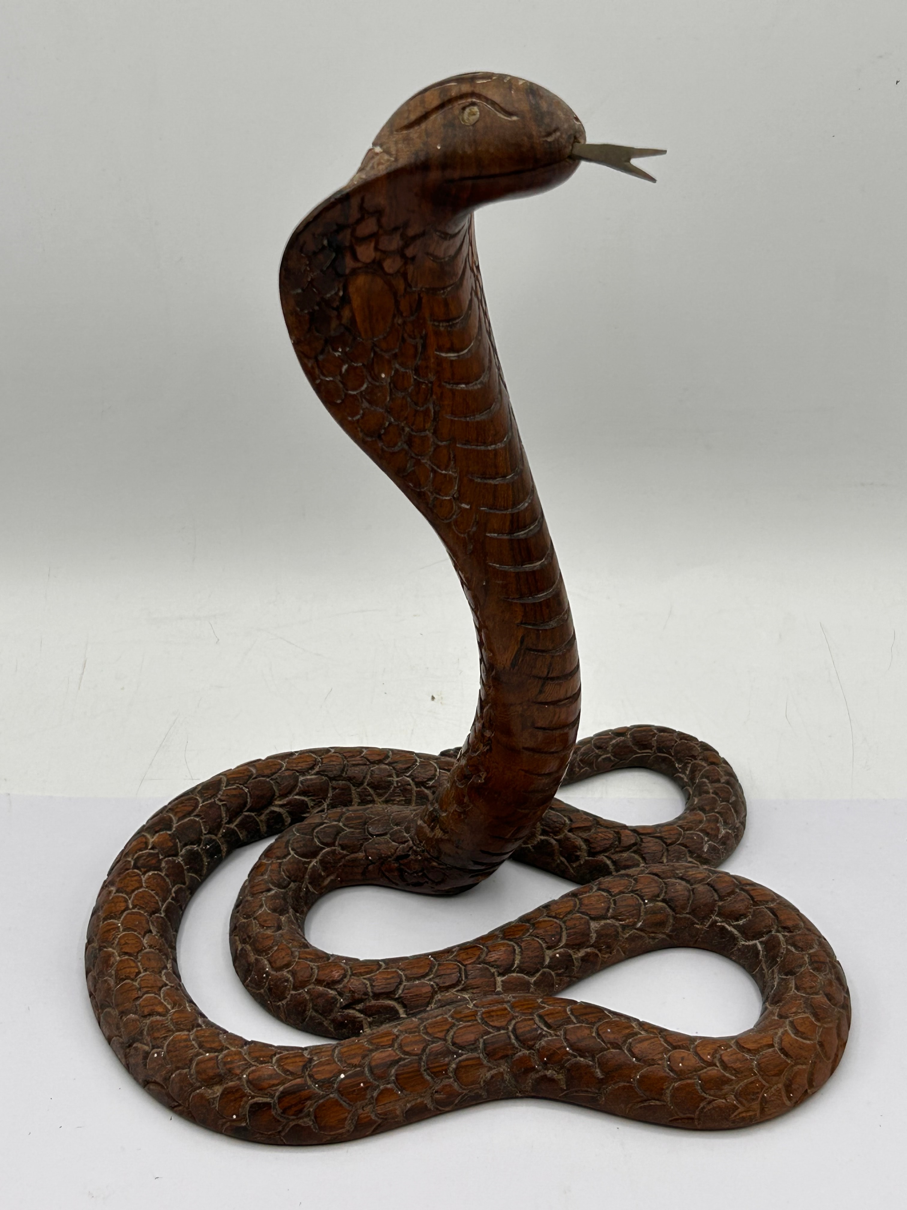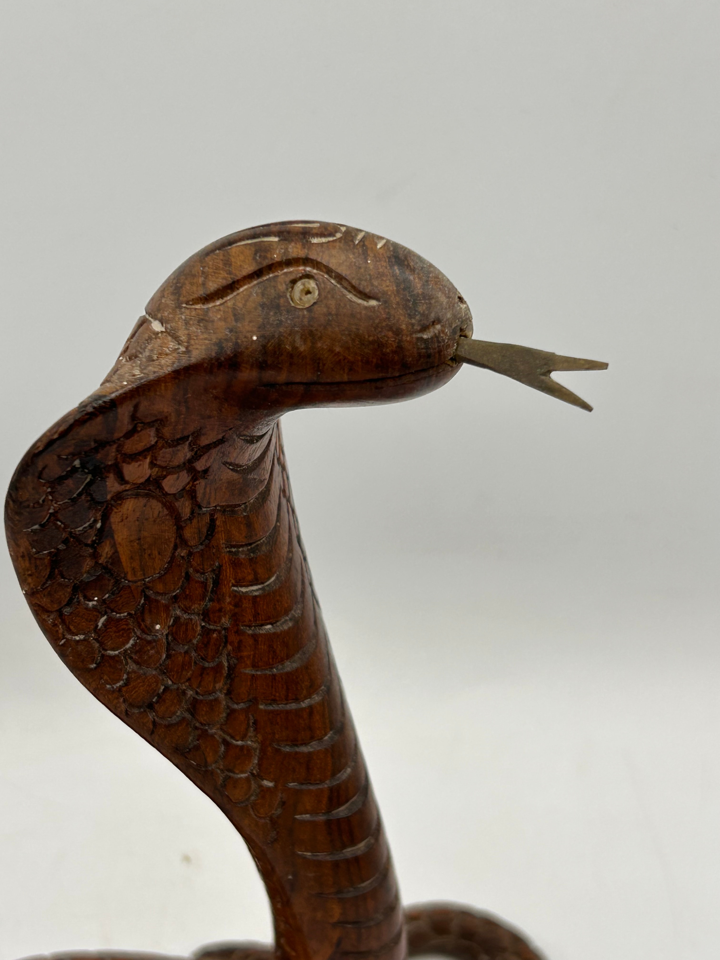This hand-carved dark brown wooden sculpture depicts a cobra in an upright, striking posture with its body coiled at the base. The piece features intricately carved scales across the body and hood, light-colored circular inlays for eyes, and a slender bifurcated metal tongue. Reflecting a decorative or folk art style, the object is of an undetermined period.