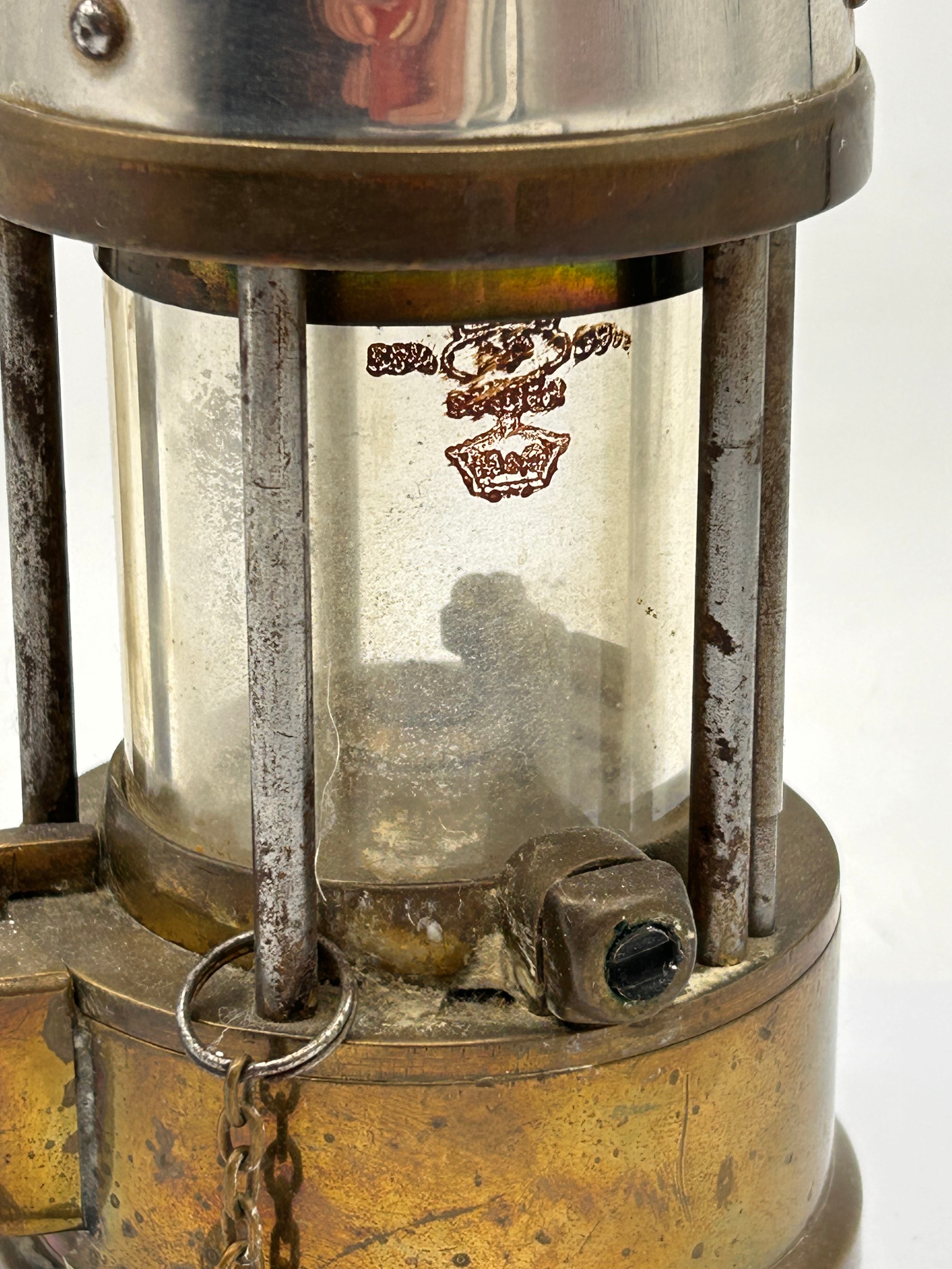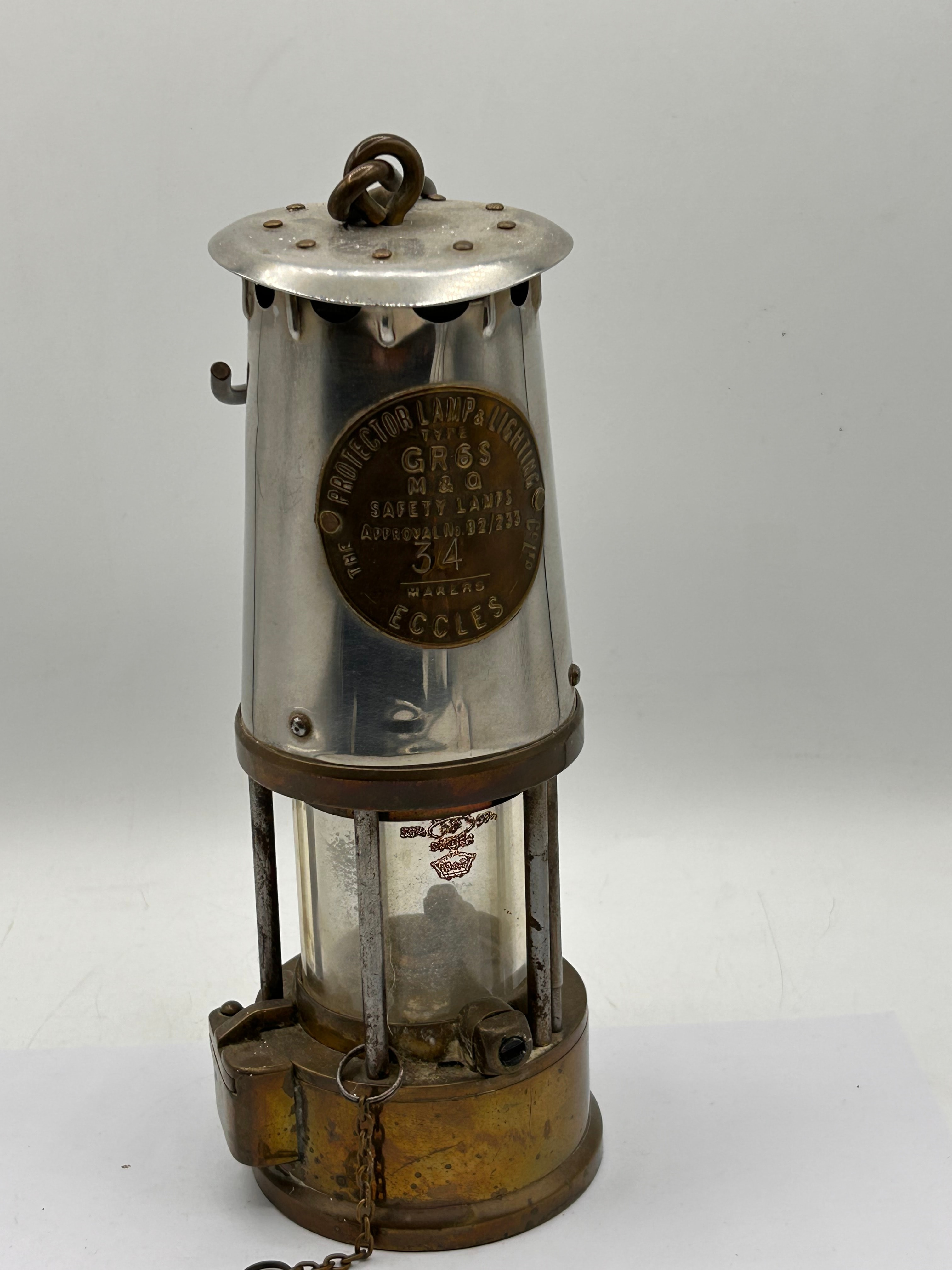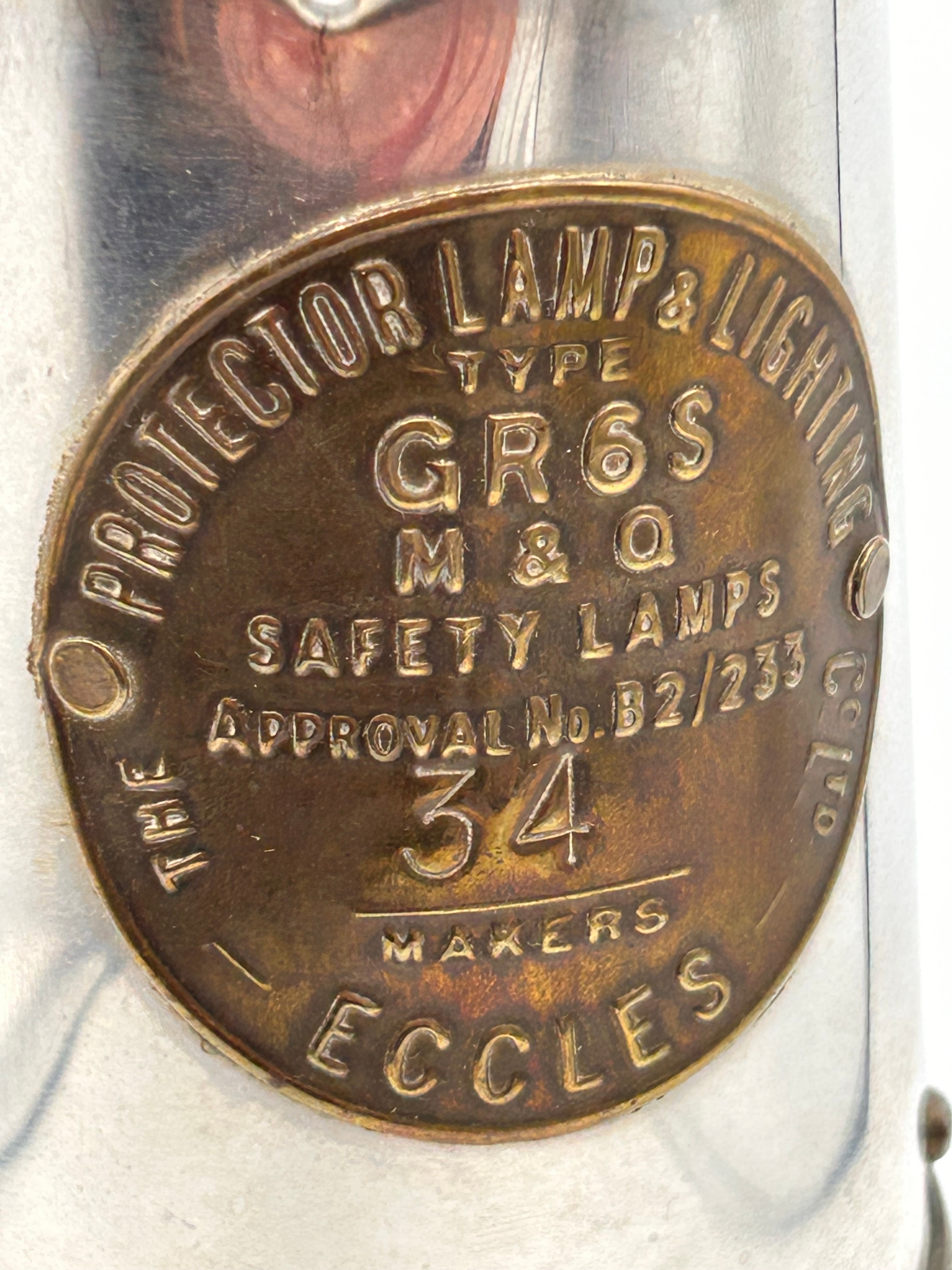 A Miners Safety Lamp by The Protector Lamp & Lighting Co Ltd, Eccles, Type GR6S. This industrial safety lamp is consistent with early-to-mid 20th-century design. It is primarily constructed from a silver-toned metal, likely nickel-plated steel or brass, for the upper section, and a patinated brass or bronze for the base and supporting bars, enclosing a clear glass cylinder. A prominent oval brass plaque on the upper body is inscribed with “THE PROTECTOR LAMP & LIGHTING CO LTD”, “TYPE GR6S”, “M & Q”, “SAFETY LAMPS”, “APPROVAL No. B2/233”, “34”, “MAKERS”, and “ECCLES”. The internal glass cylinder also features a faded mark including “GR S” and “THE PROTECTOR LAMP & LIGHTING CO LTD” beneath a crown motif.