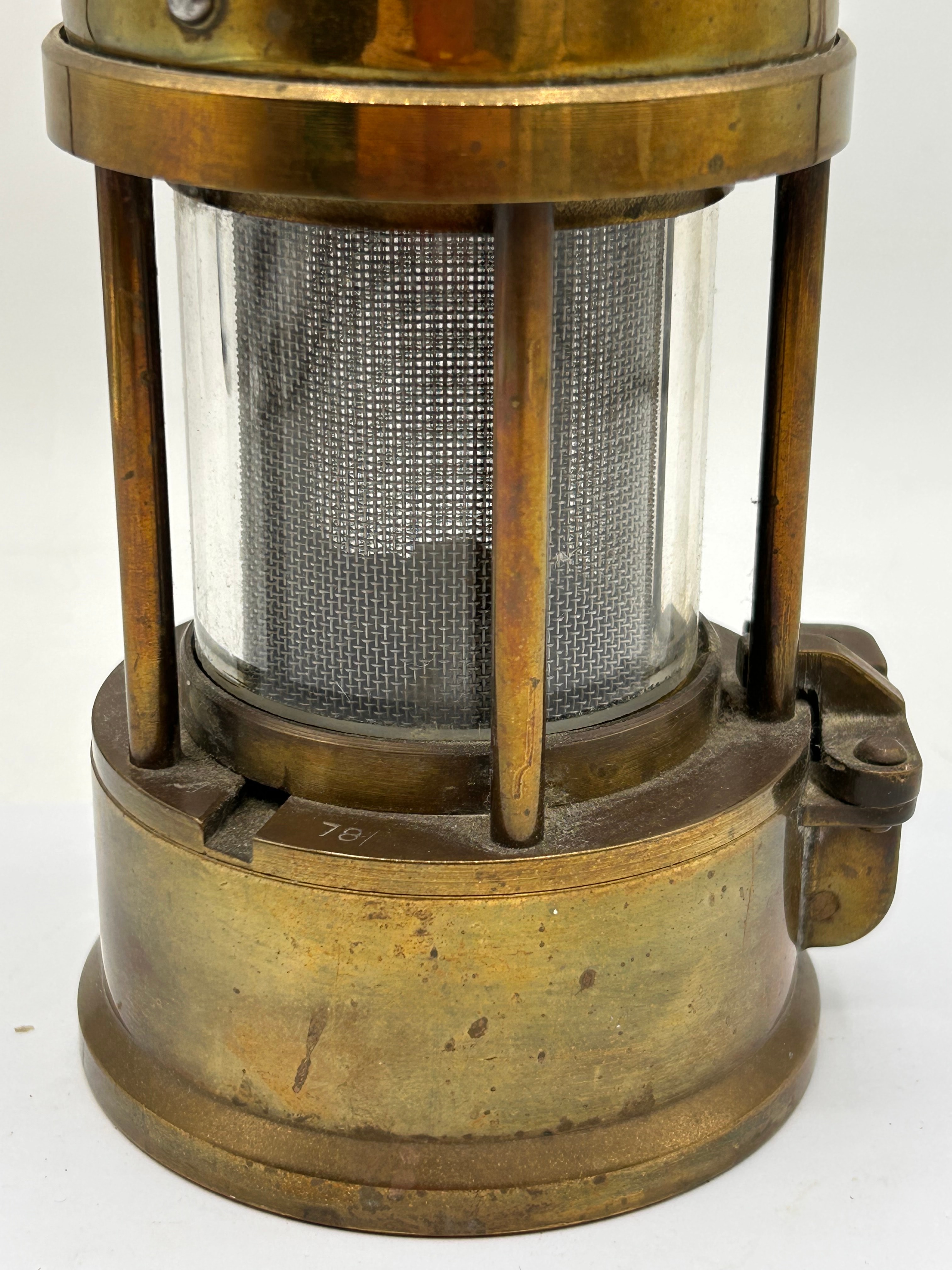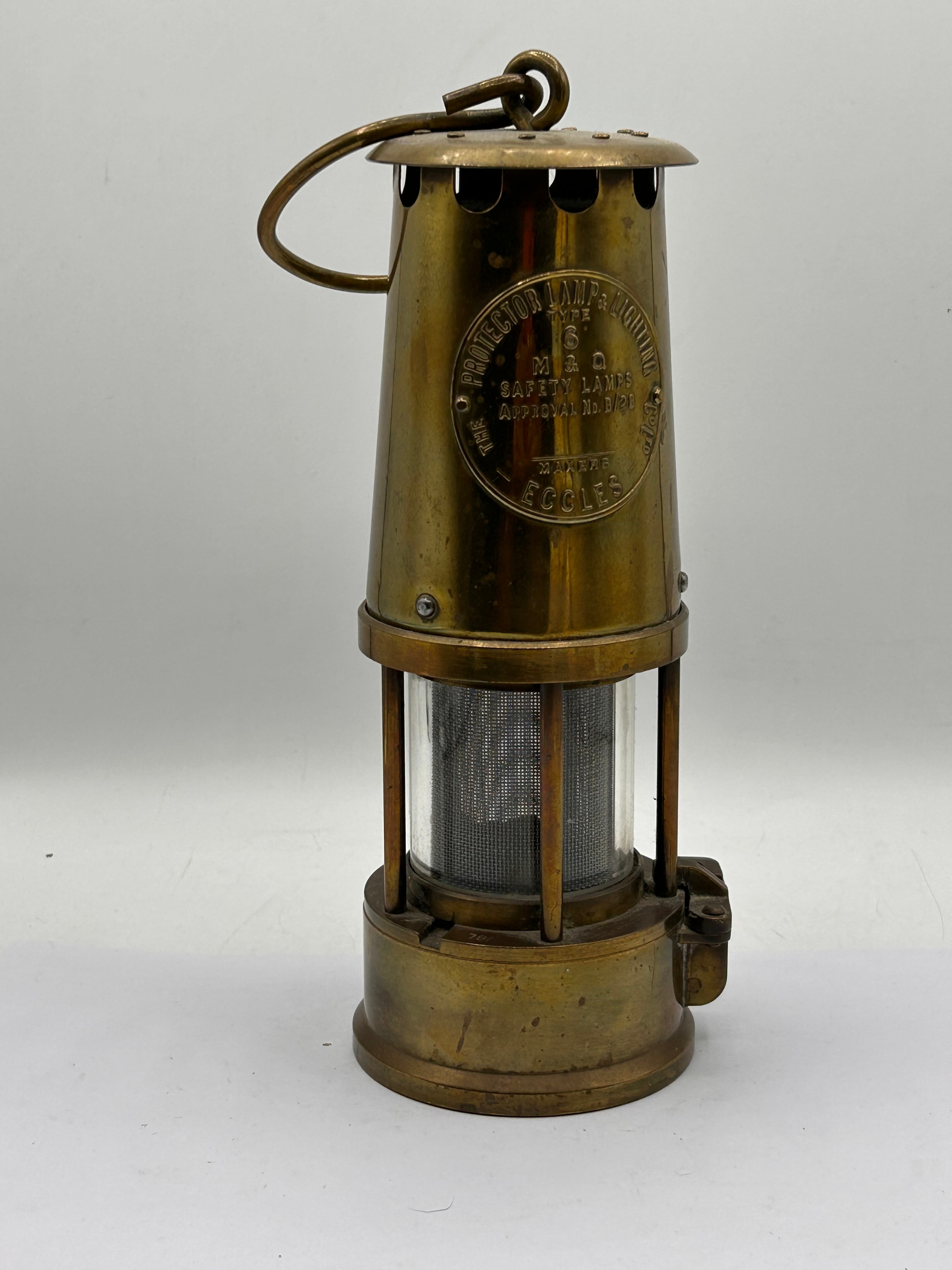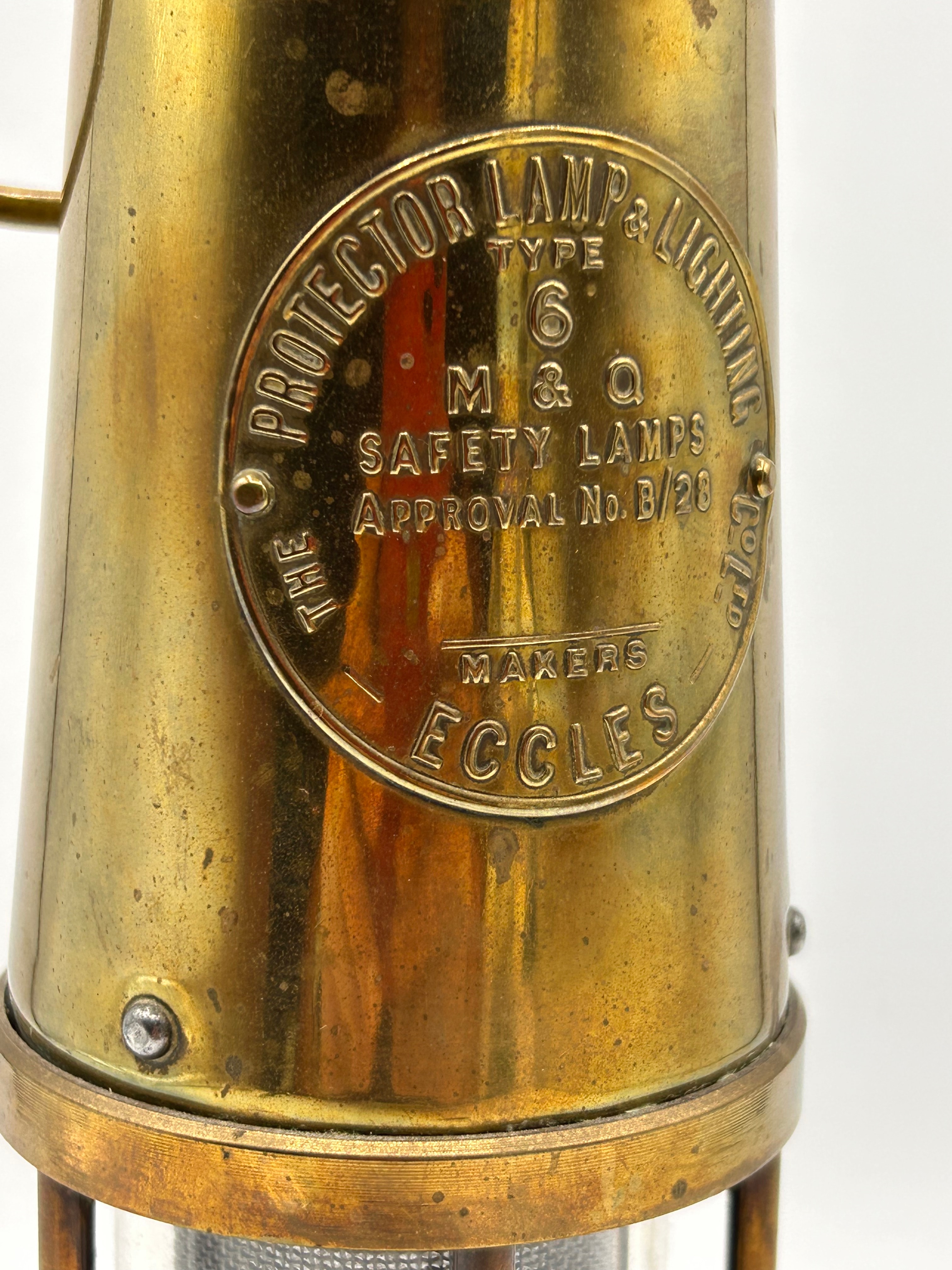 A brass miner’s safety lamp by The Protector Lamp & Lighting Co. Ltd., Eccles, Type 6. This lamp features a conical upper body with a fixed carrying handle, a central clear glass cylinder protecting an internal metal mesh, and a sturdy, stepped base. Engraved on the upper section is a circular marking reading “THE PROTECTOR LAMP & LIGHTING Co. Ltd.” which encircles further text including “TYPE 6”, “M & Q”, “SAFETY LAMPS”, “APPROVAL No. B/28”, and “MAKERS ECCLES”. A partial number, “78/”, is visible on the lower base.