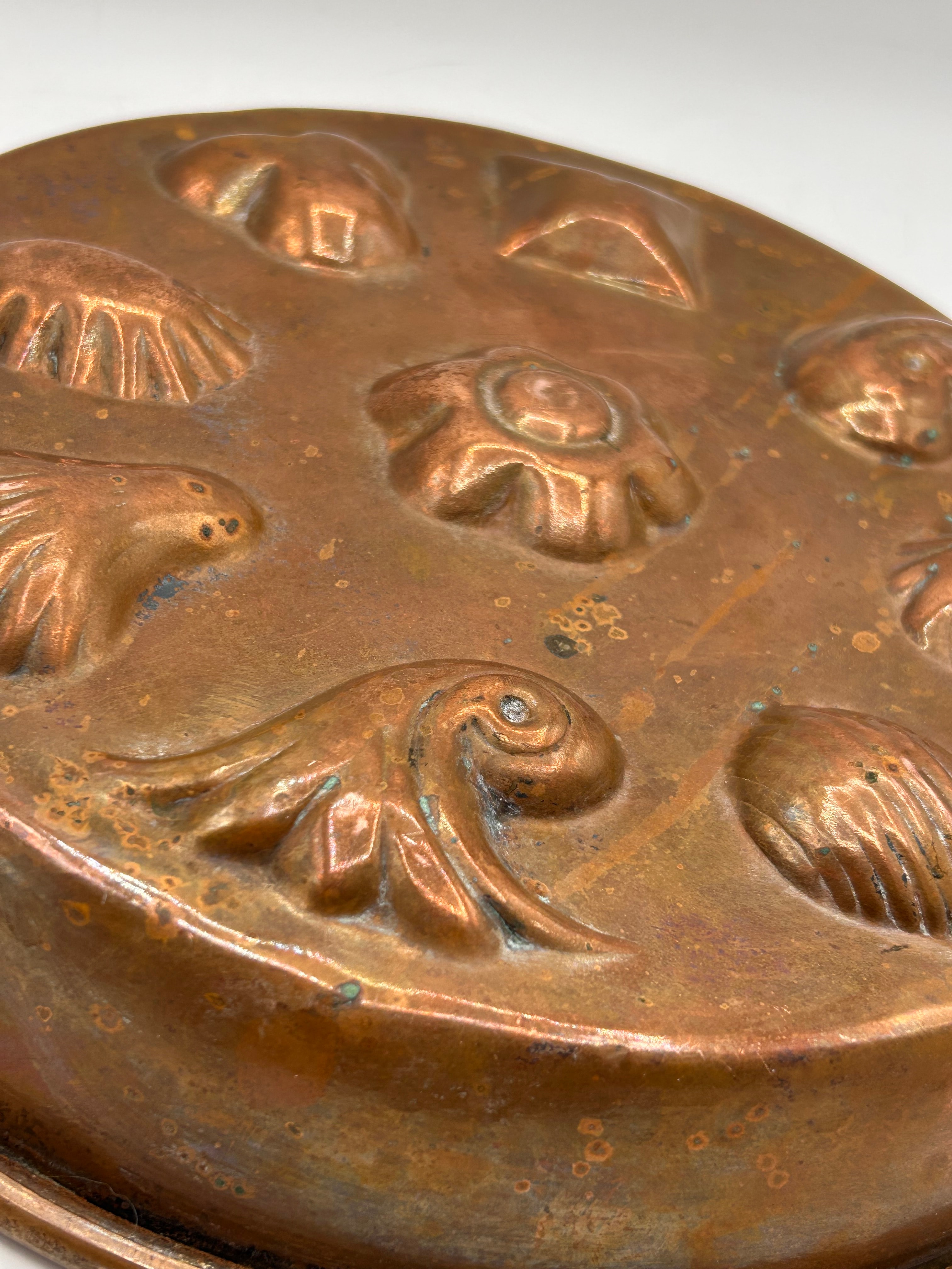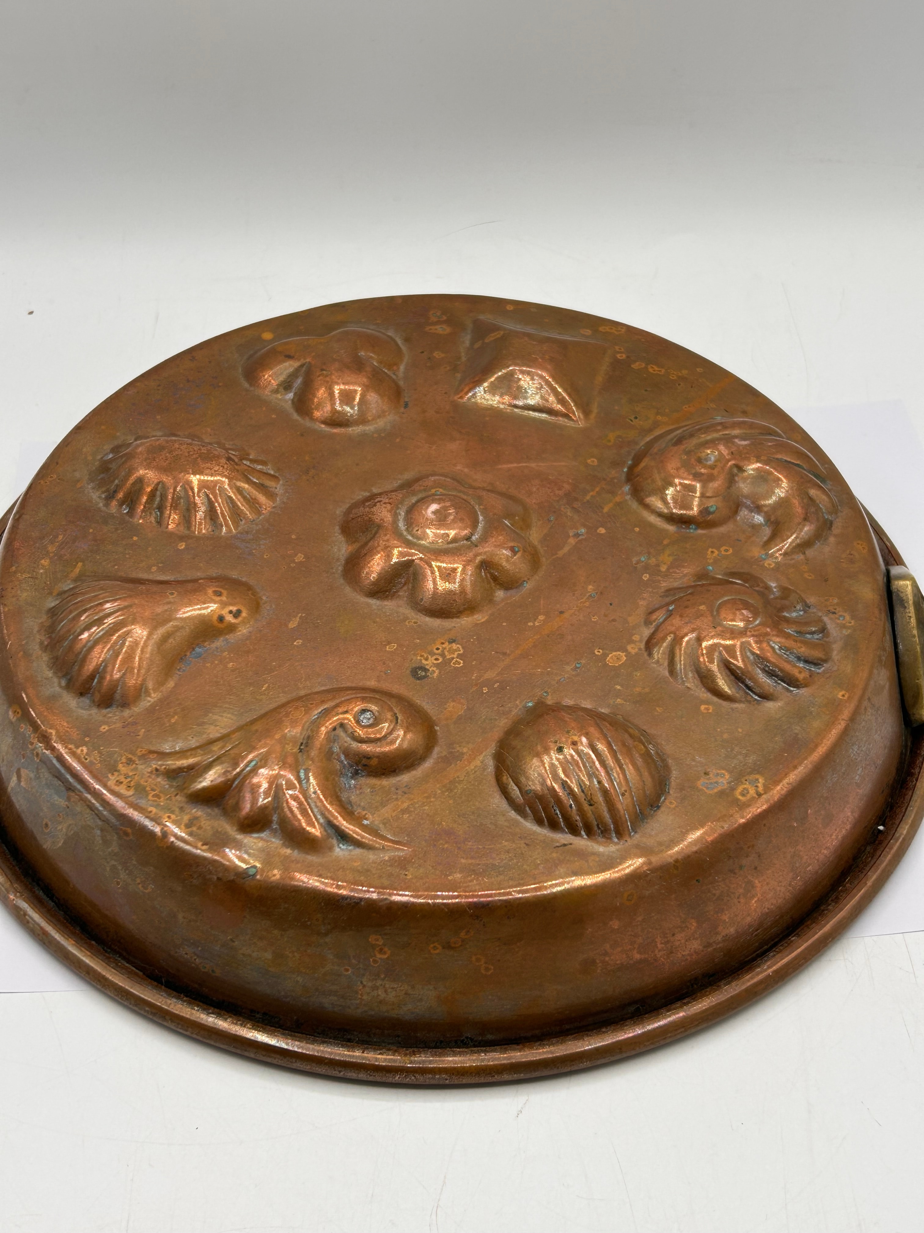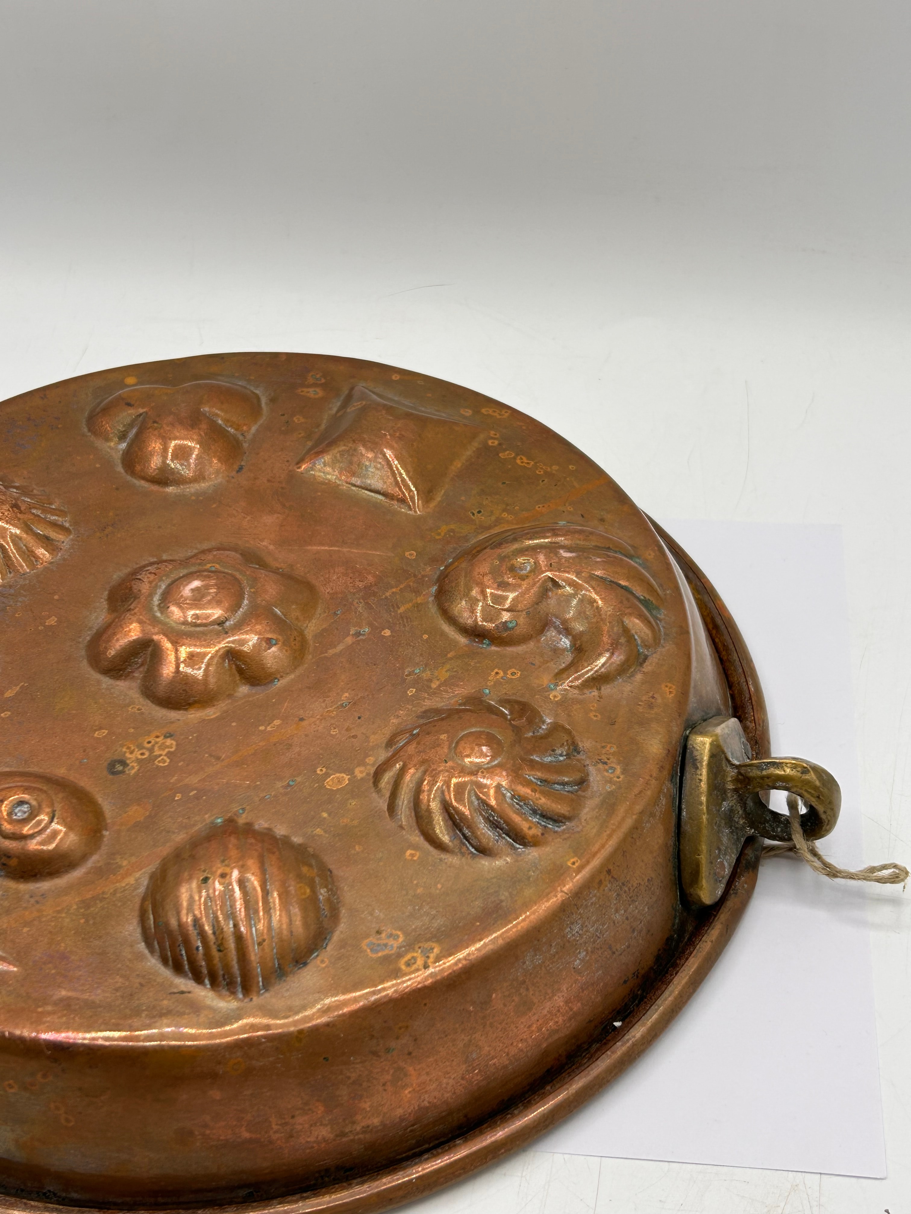 An antique round, multi-cavity baking or food mold, constructed from patinated copper. The surface exhibits a reddish-brown color with areas of green oxidation. A brass hanger loop with a string is attached to the rim. The mold features nine distinct, decorative depressions, including various shell motifs, a central rosette, a fish or bird, and geometric shapes such as a triangle and a square. The item presents an earlier style, consistent with age and use.
