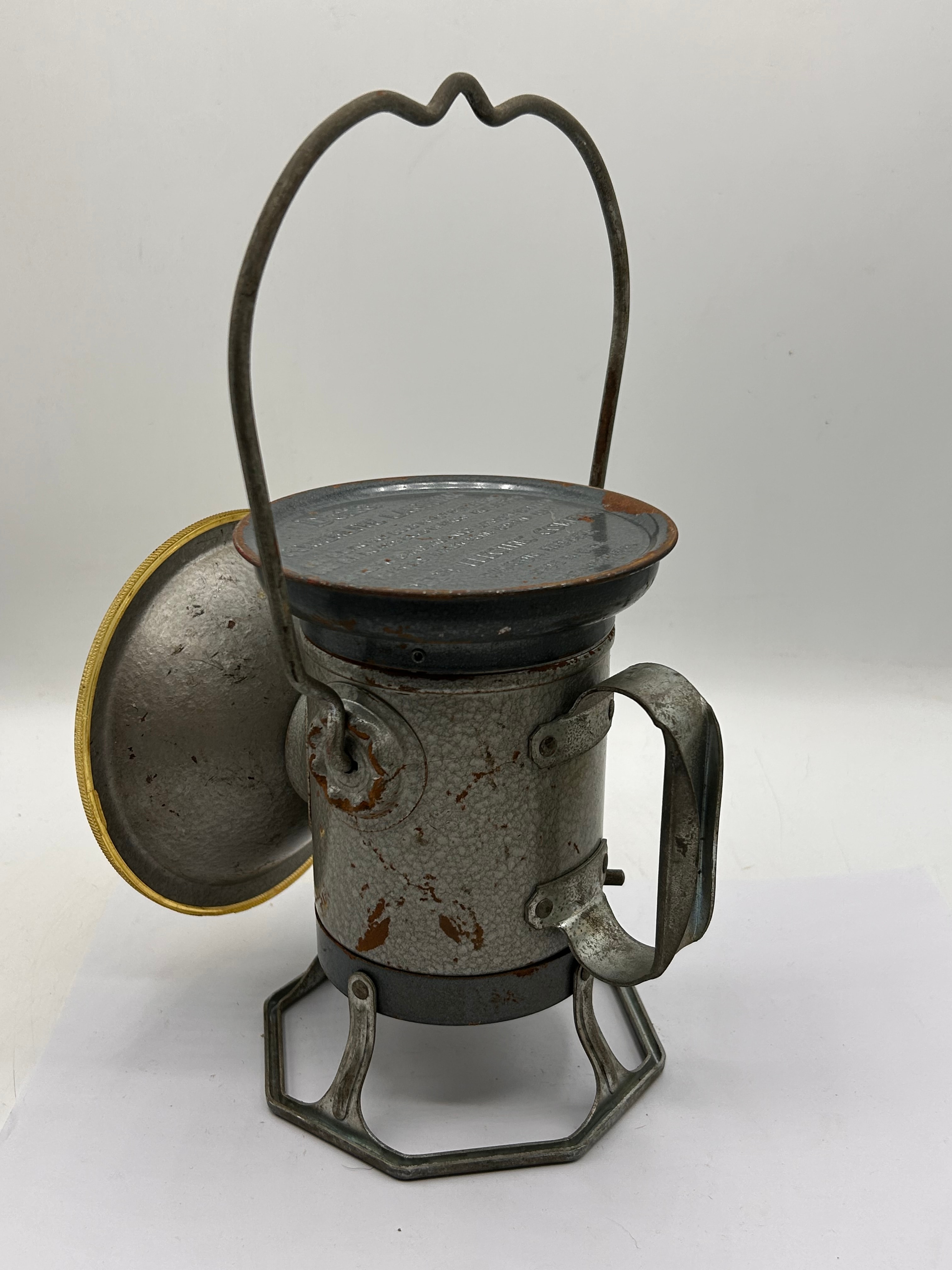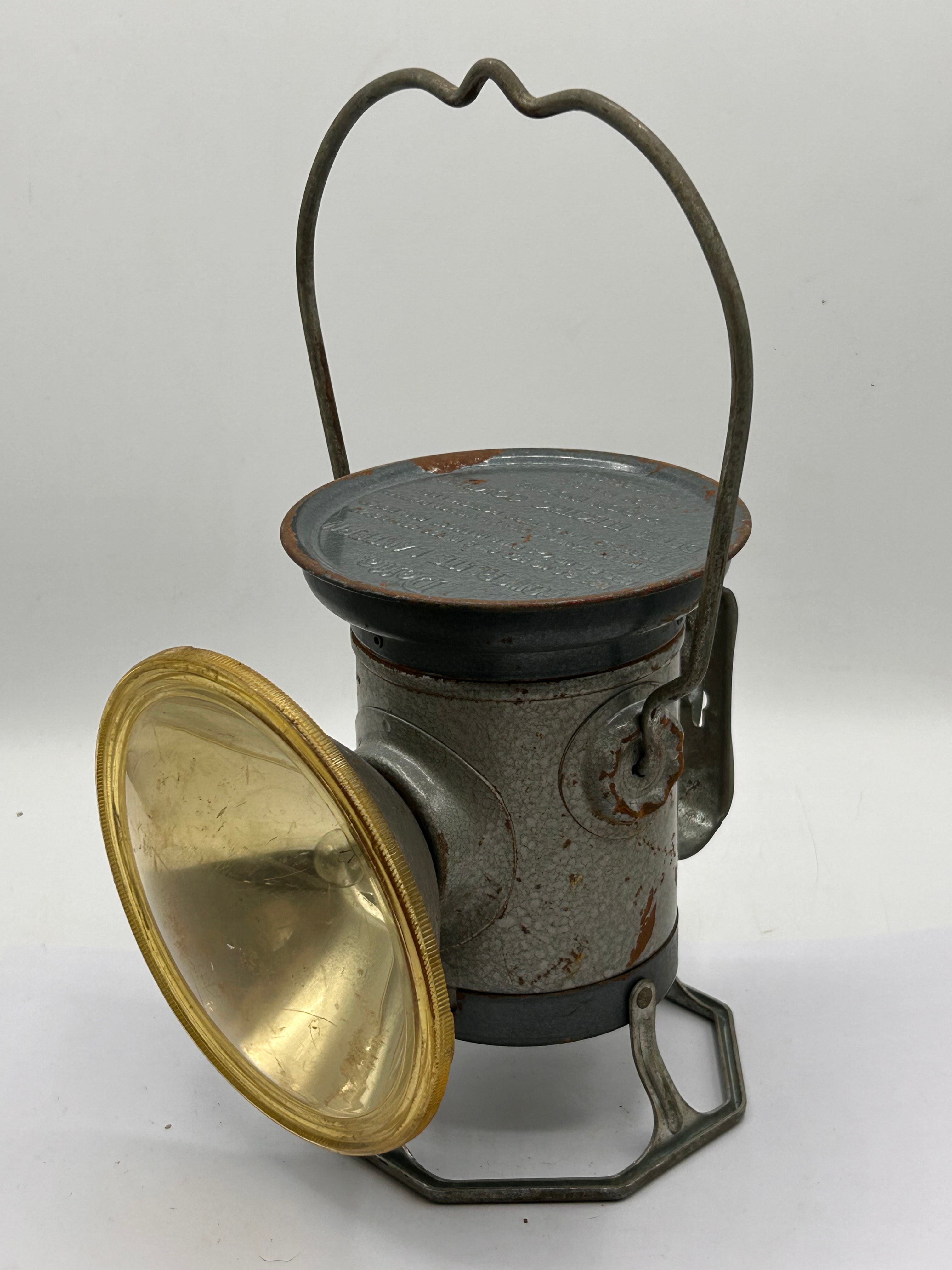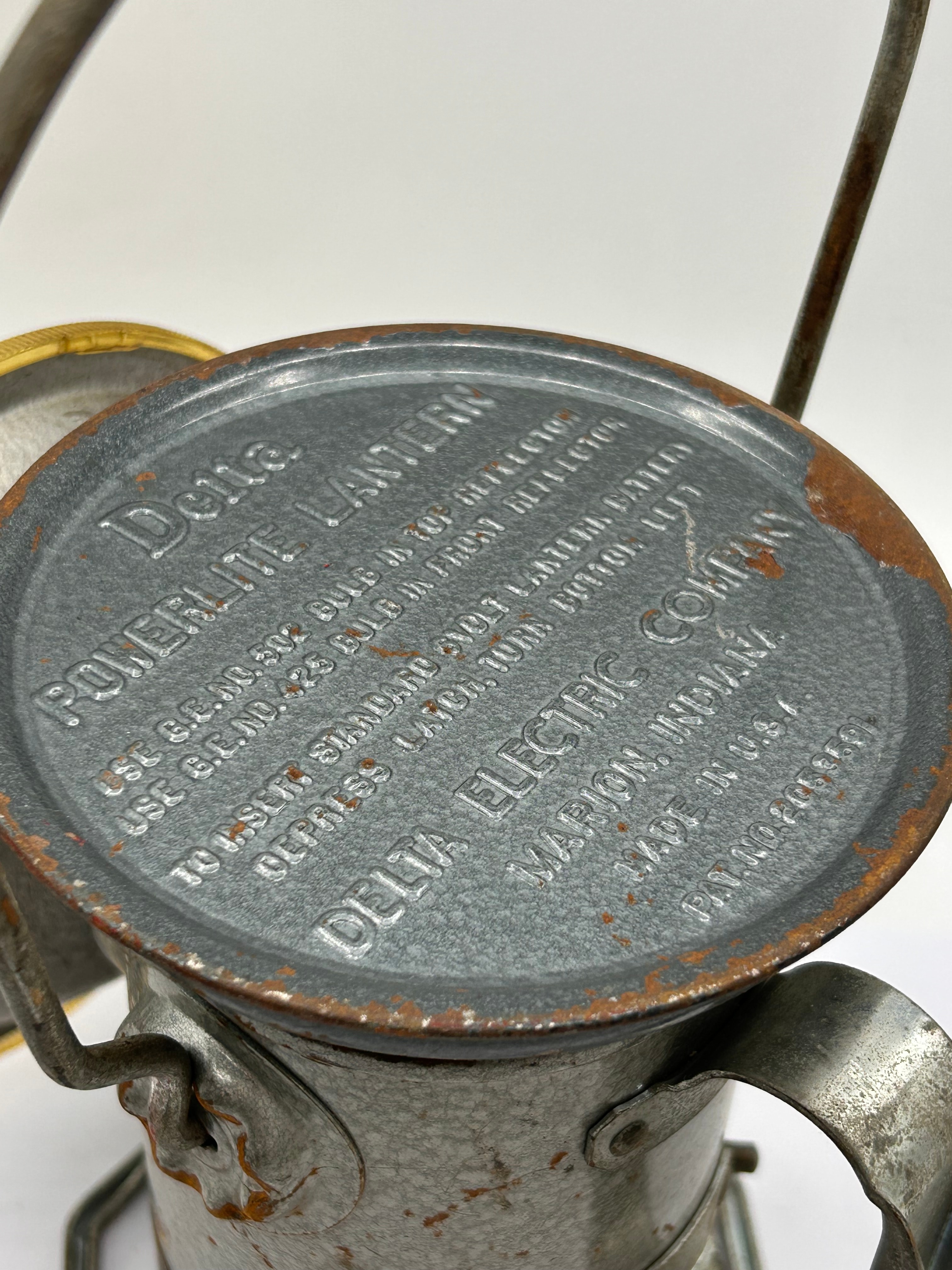 A vintage Delta Powerlite Lantern by the Delta Electric Company, Marion, Indiana, dating to the mid-20th century, likely the 1950s. This portable electric lantern features a utilitarian, industrial design, constructed primarily of metal with a speckled grey finish. It includes a hexagonal base, a swinging metal carrying handle, and a large, adjustable front reflector with a brass-toned rim. The top lid is embossed with ‘Delta POWERLITE LANTERN,’ instructions to ‘USE GE NO. 302 BULB & DRY BATTERY’ and for battery replacement, ‘DELTA ELECTRIC COMPANY MARION, INDIANA MADE IN U.S.A.,’ and ‘PAT. NO. 2008826.’