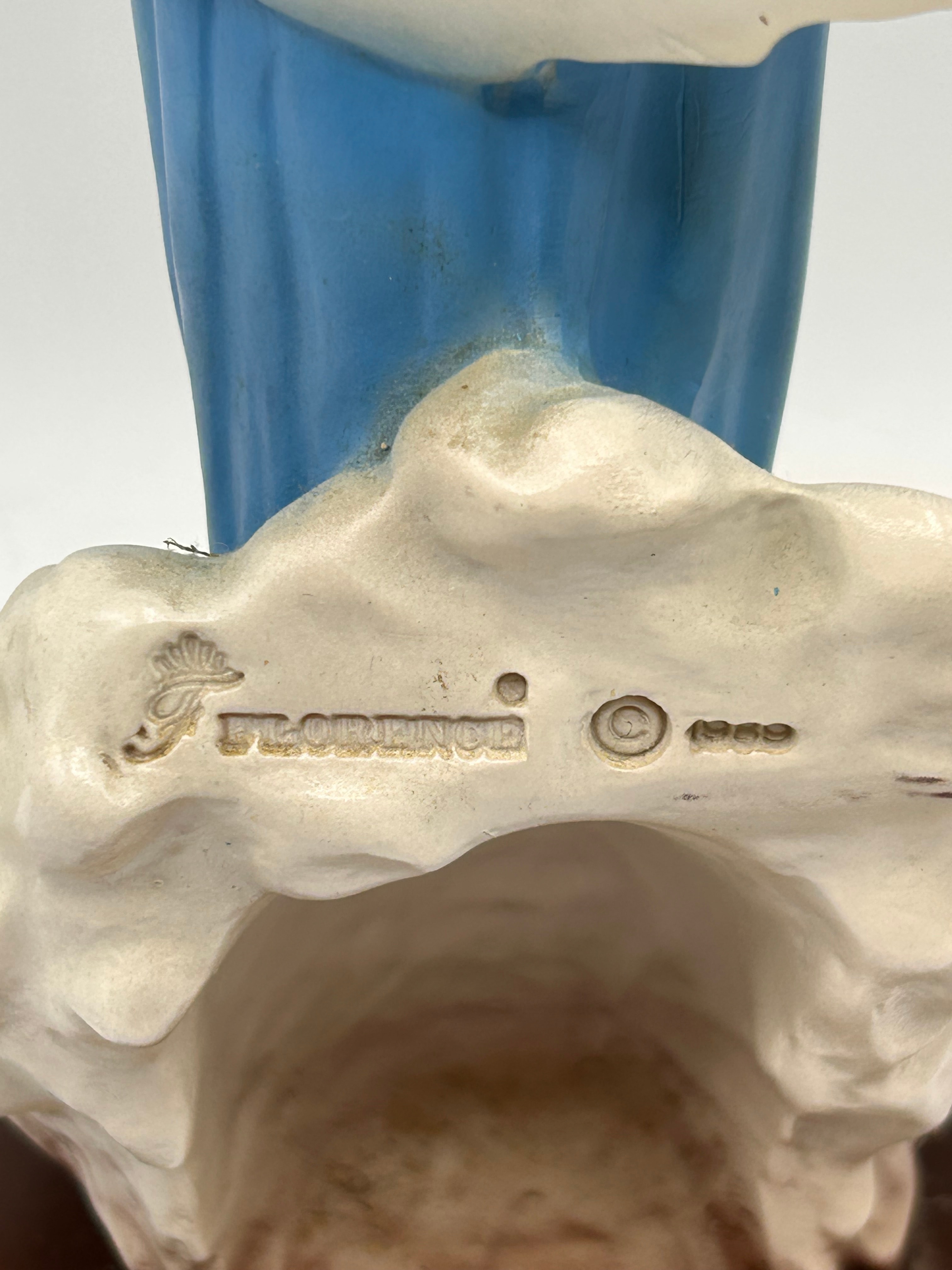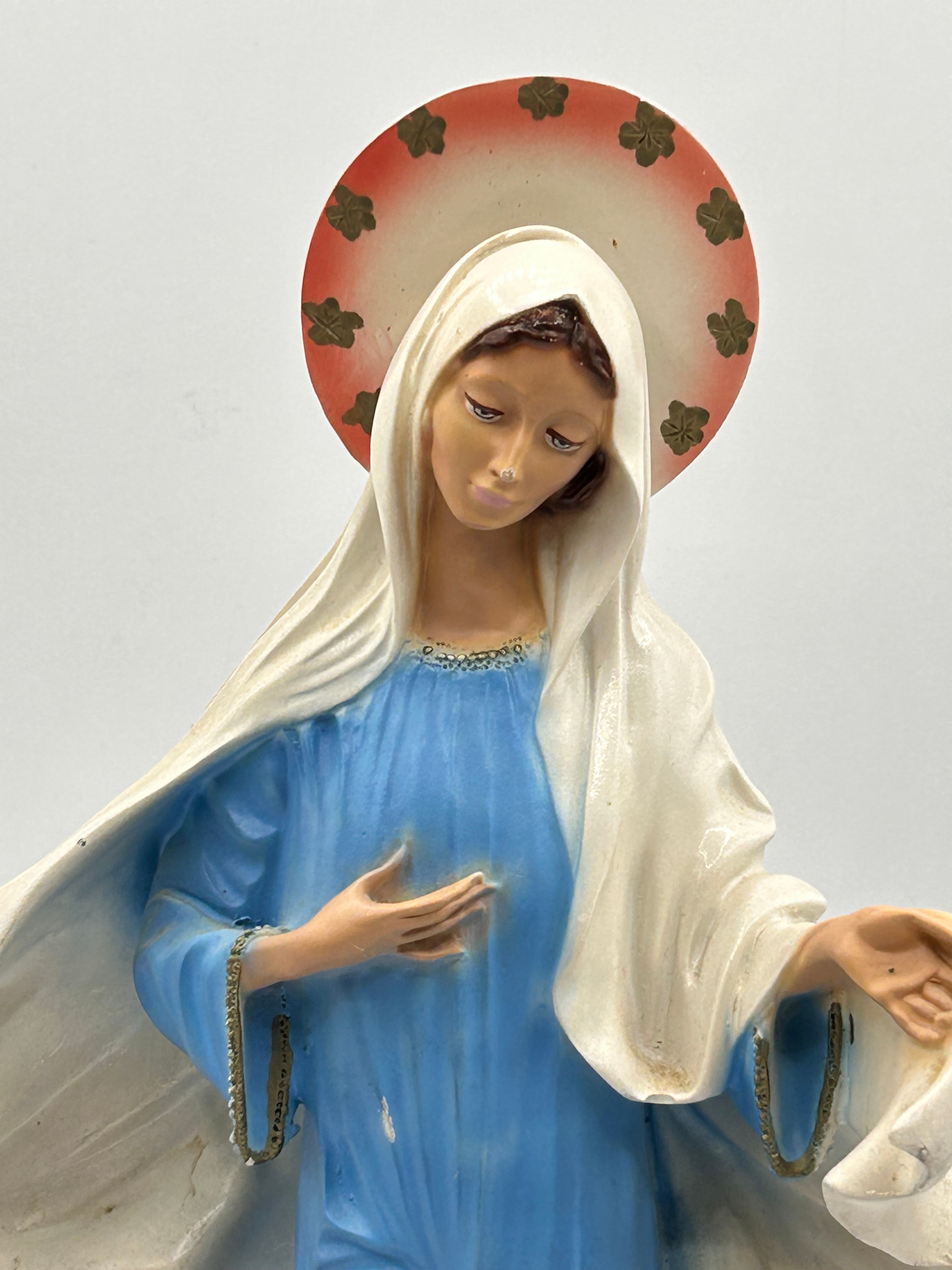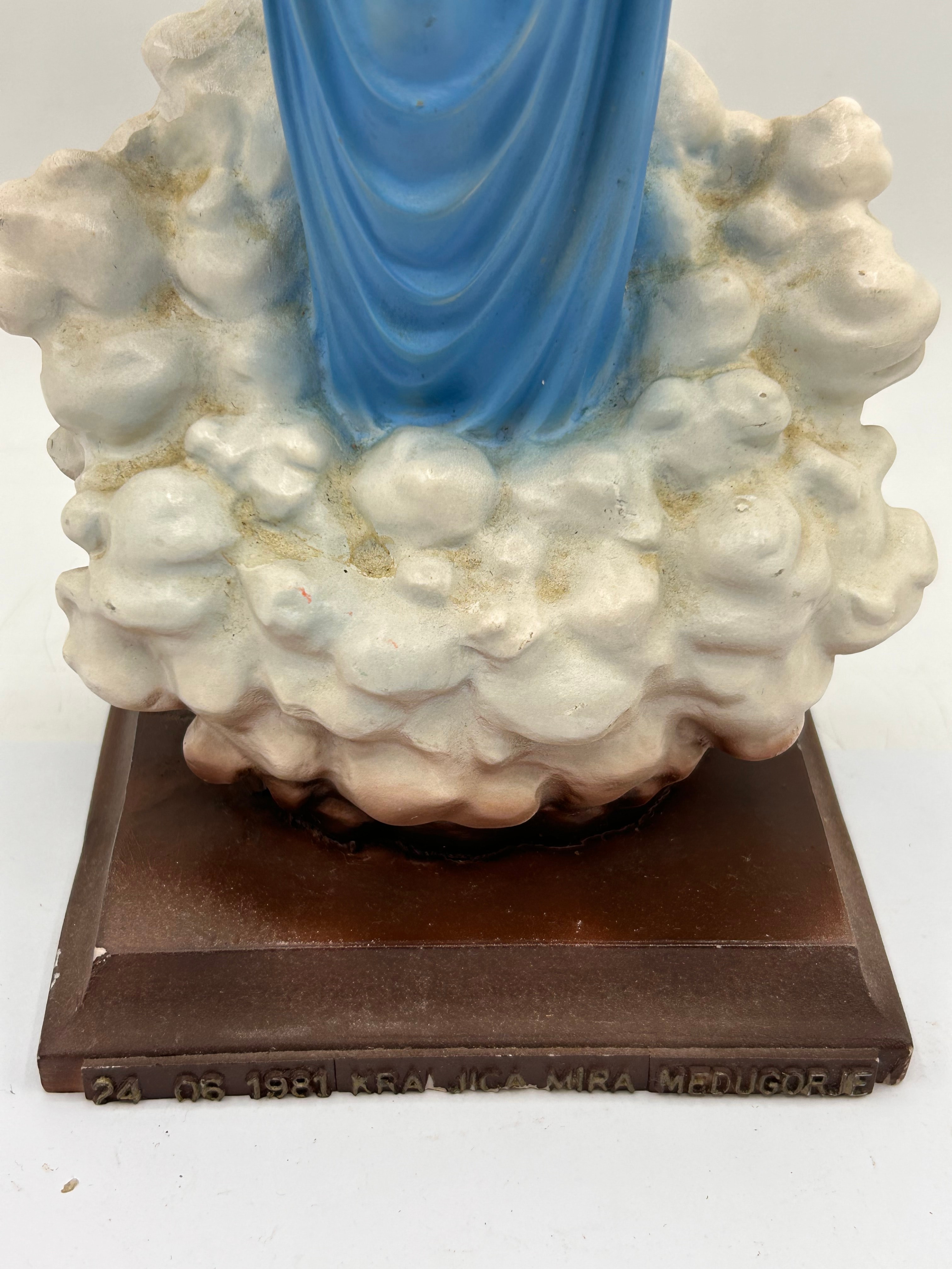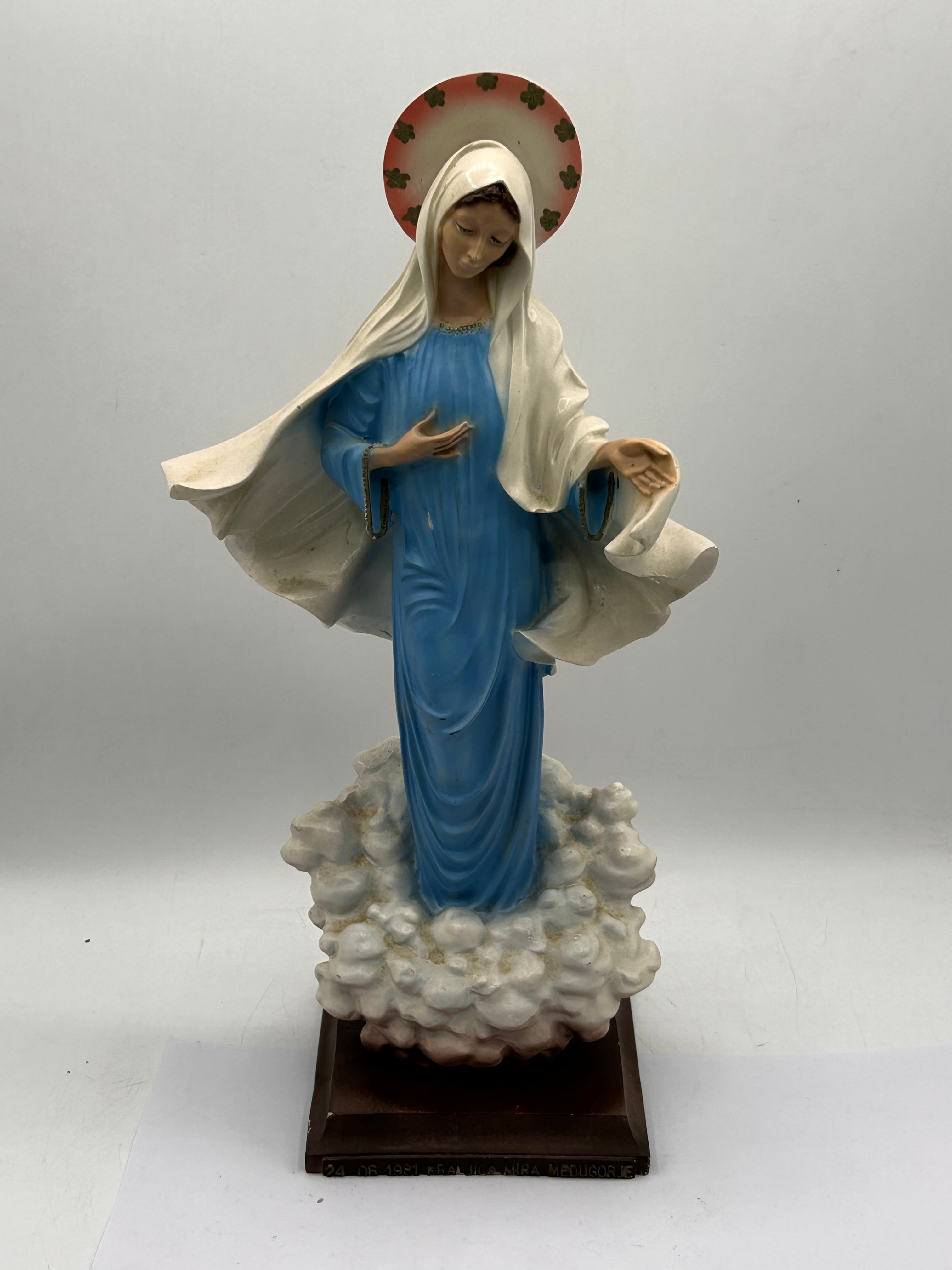 A polychrome religious devotional statue depicting the Virgin Mary, known as ‘Our Lady of Grace’. The figure stands on a base of clouds and is mounted on a rectangular dark brown plinth. She wears a blue tunic and a white mantle, with a red and cream halo adorned with green floral motifs. The material is a composite, likely resin or a similar cast material. The front of the plinth bears the inscription “24.06.1981 KRALJICA MIRA MEDUGORJE,” which translates to “June 24, 1981 QUEEN OF PEACE MEDUGORJE.” The underside of the cloud base is impressed with “FLORENCE” and “© 1988.”