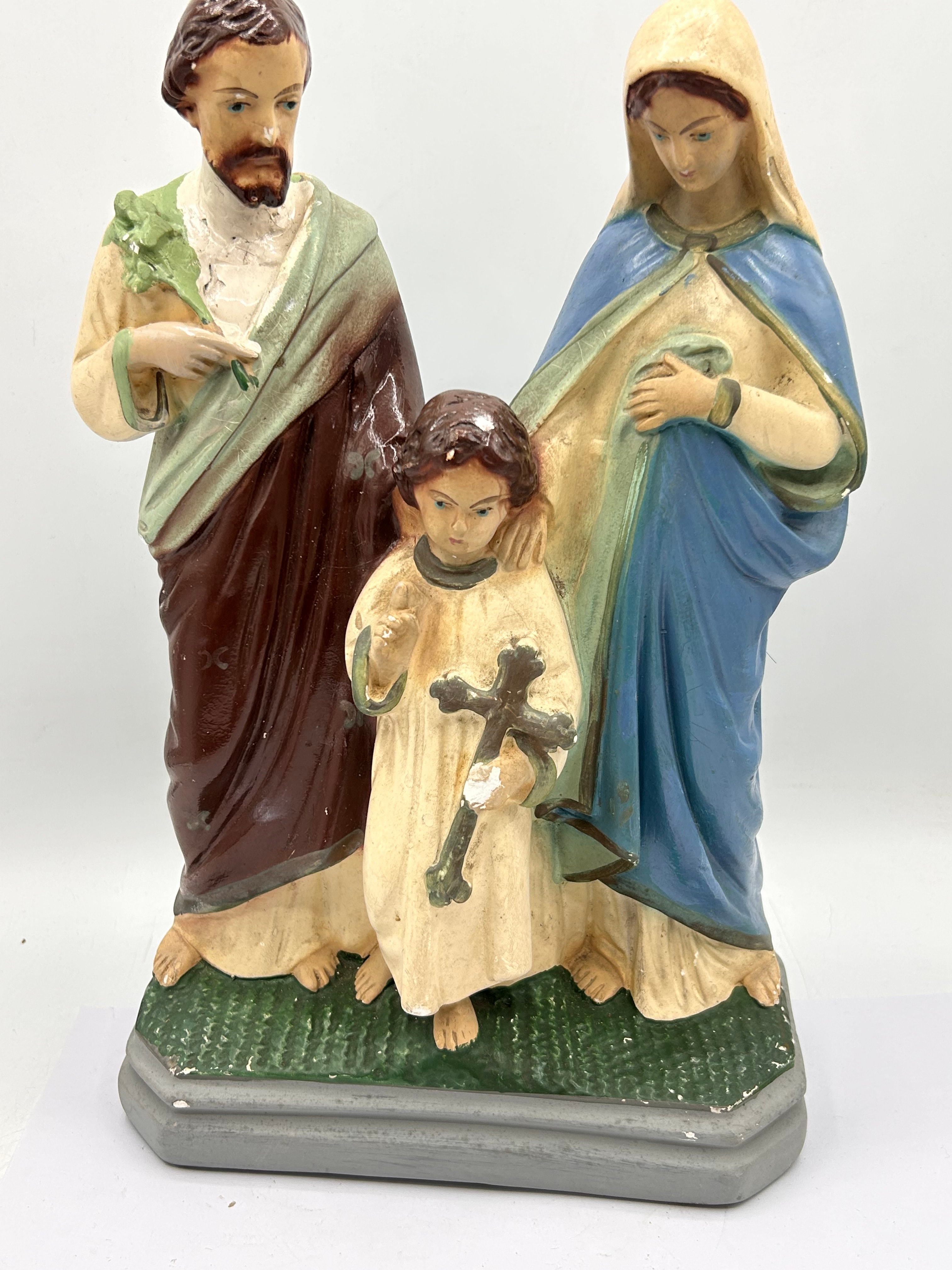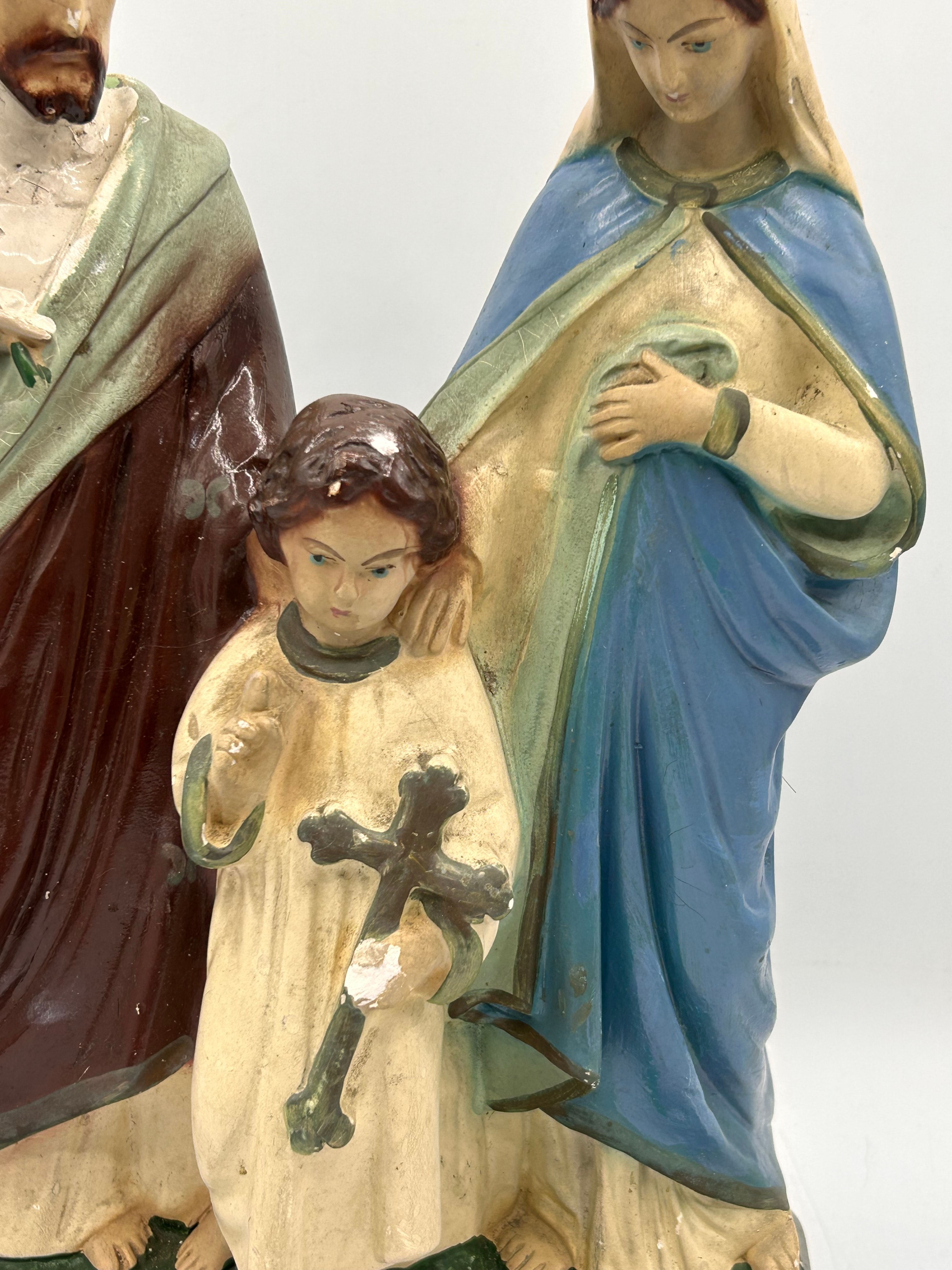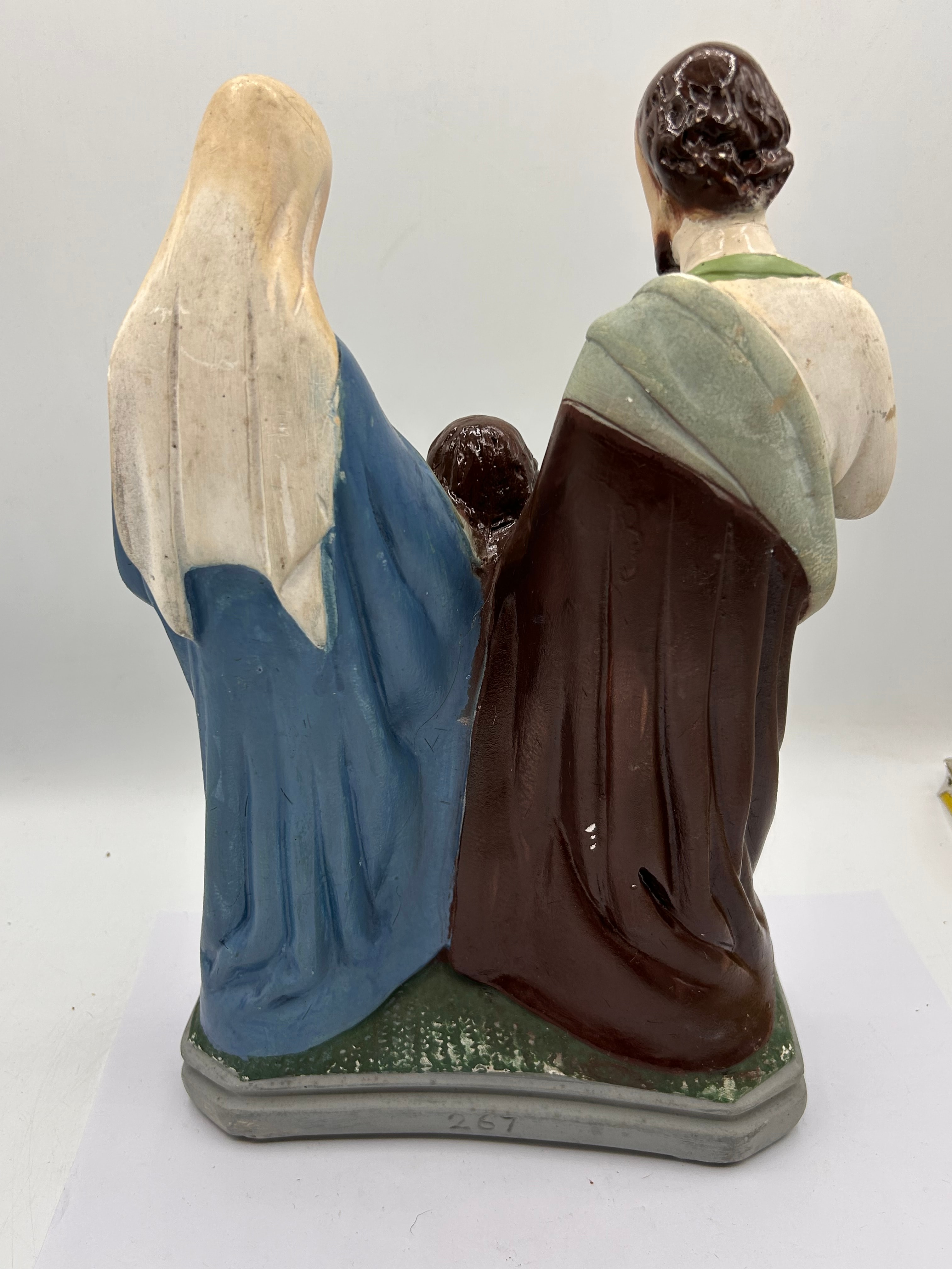 A vintage devotional figurine group depicting the Holy Family, crafted from painted plaster or a similar composite material. The group features three standing figures: a bearded male holding a lily or plant, a veiled female with her hand on the child’s shoulder, and a young child holding a small cross. The figures are rendered in a folk art style with muted paint in brown, blue, green, and cream tones, and are set upon an integrated green and grey rectangular base. The number “267” is inscribed on the back of the base.