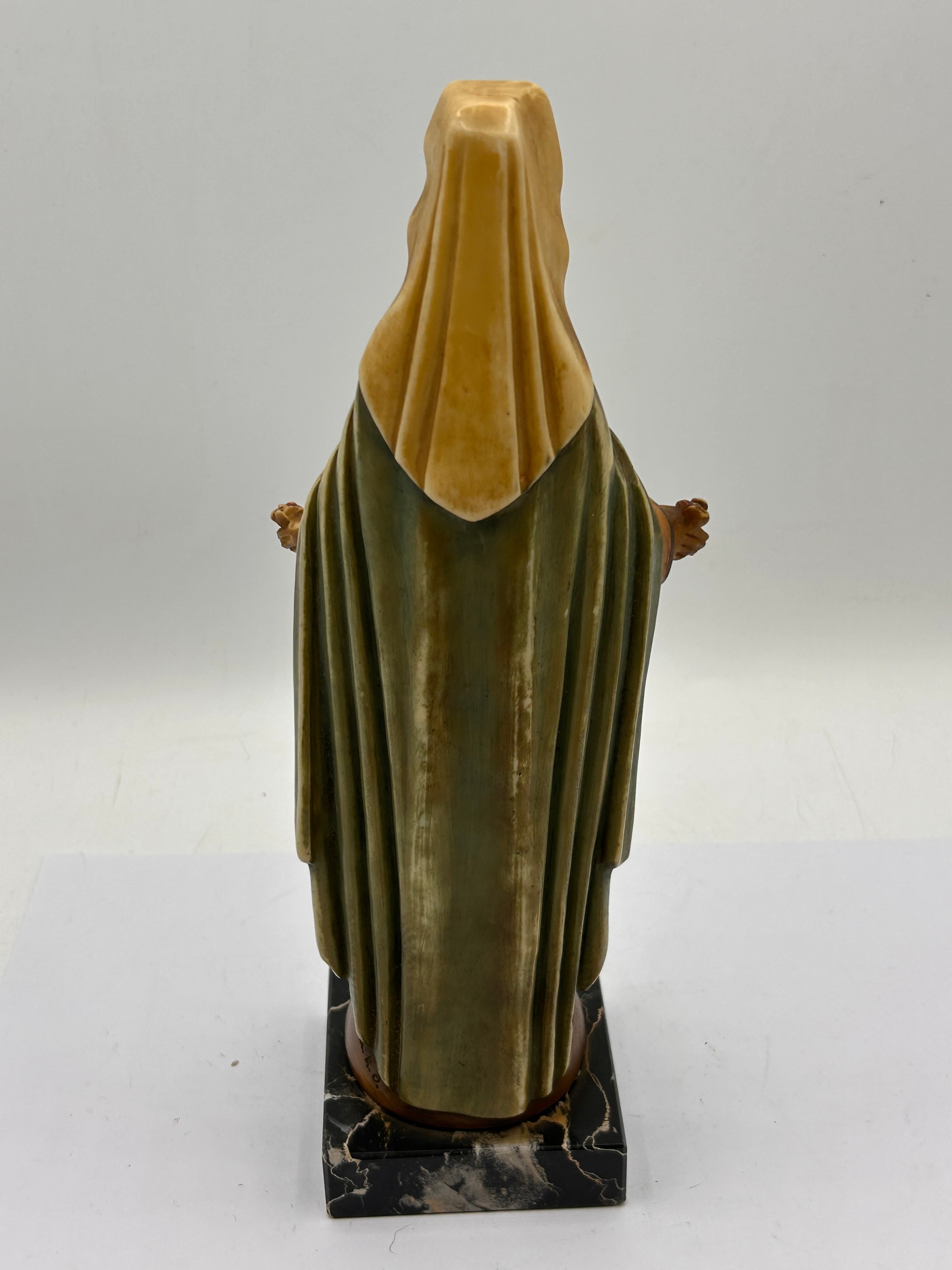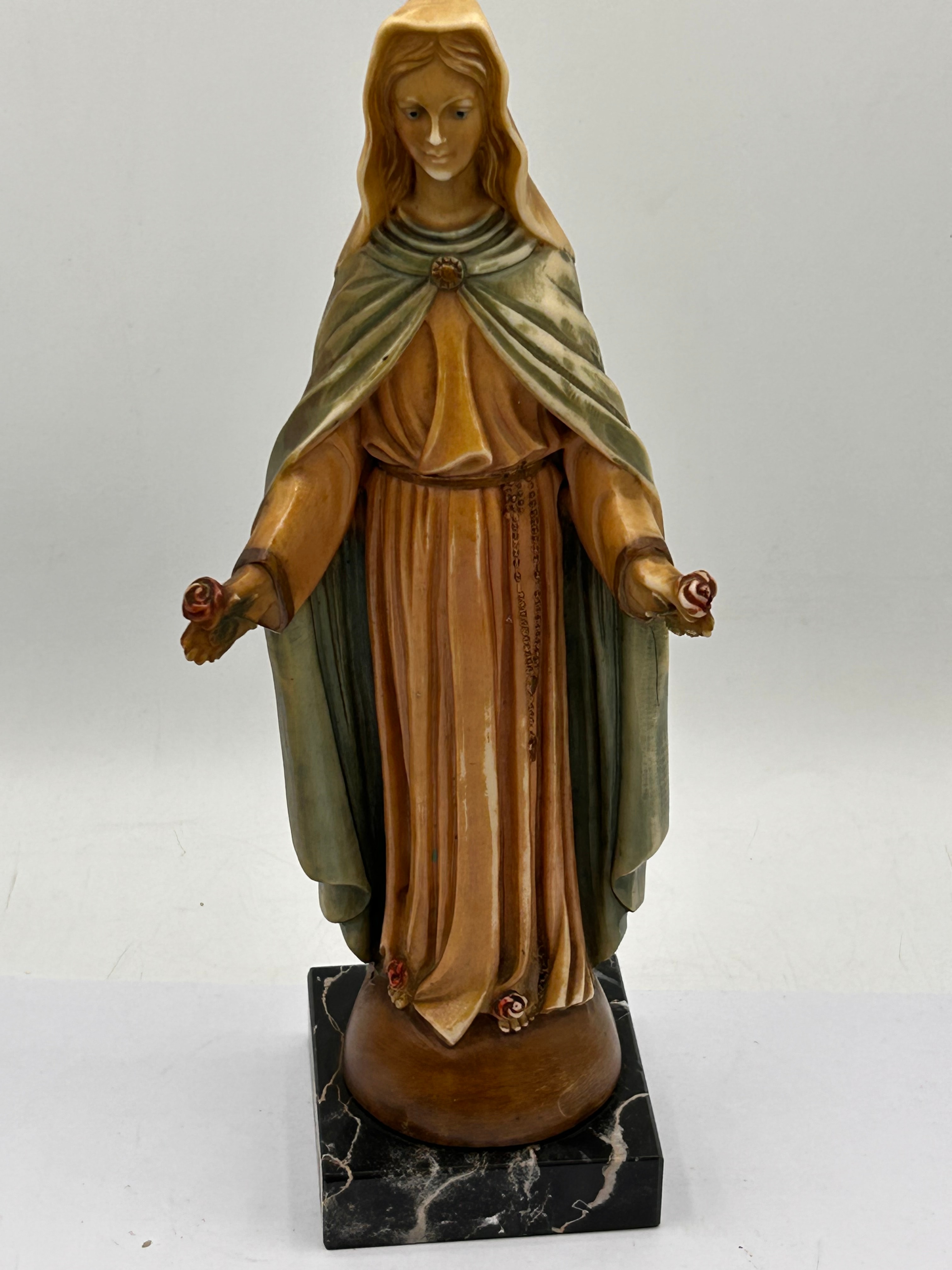 A polychrome religious figurine depicting a standing female figure, identified as the Virgin Mary, with outstretched arms each holding a small red rose. The figure is dressed in an orange-brown gown with a green-grey cloak, fastened by a brooch, and features a visible beaded chain detail. Fashioned from a molded material, likely resin or composite, the piece exhibits a faux-wood appearance on exposed skin areas. It is mounted on a rectangular black marble base with white veining. No visible text or markings are apparent.