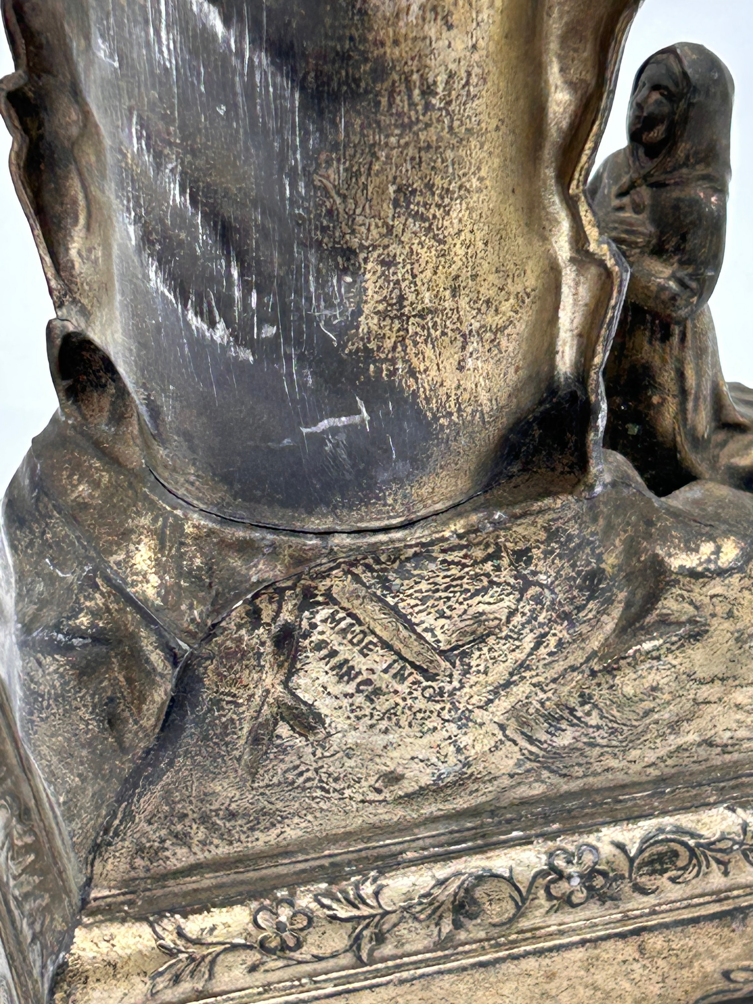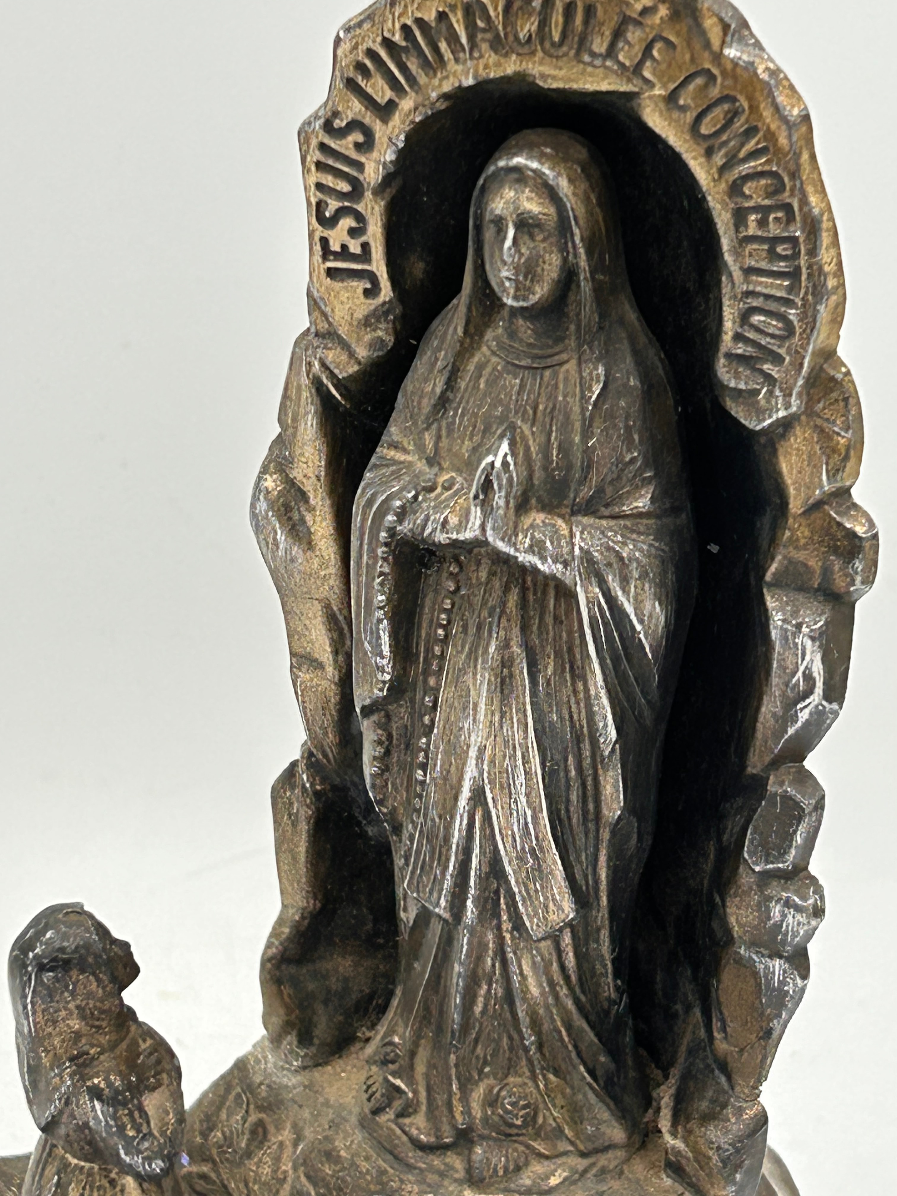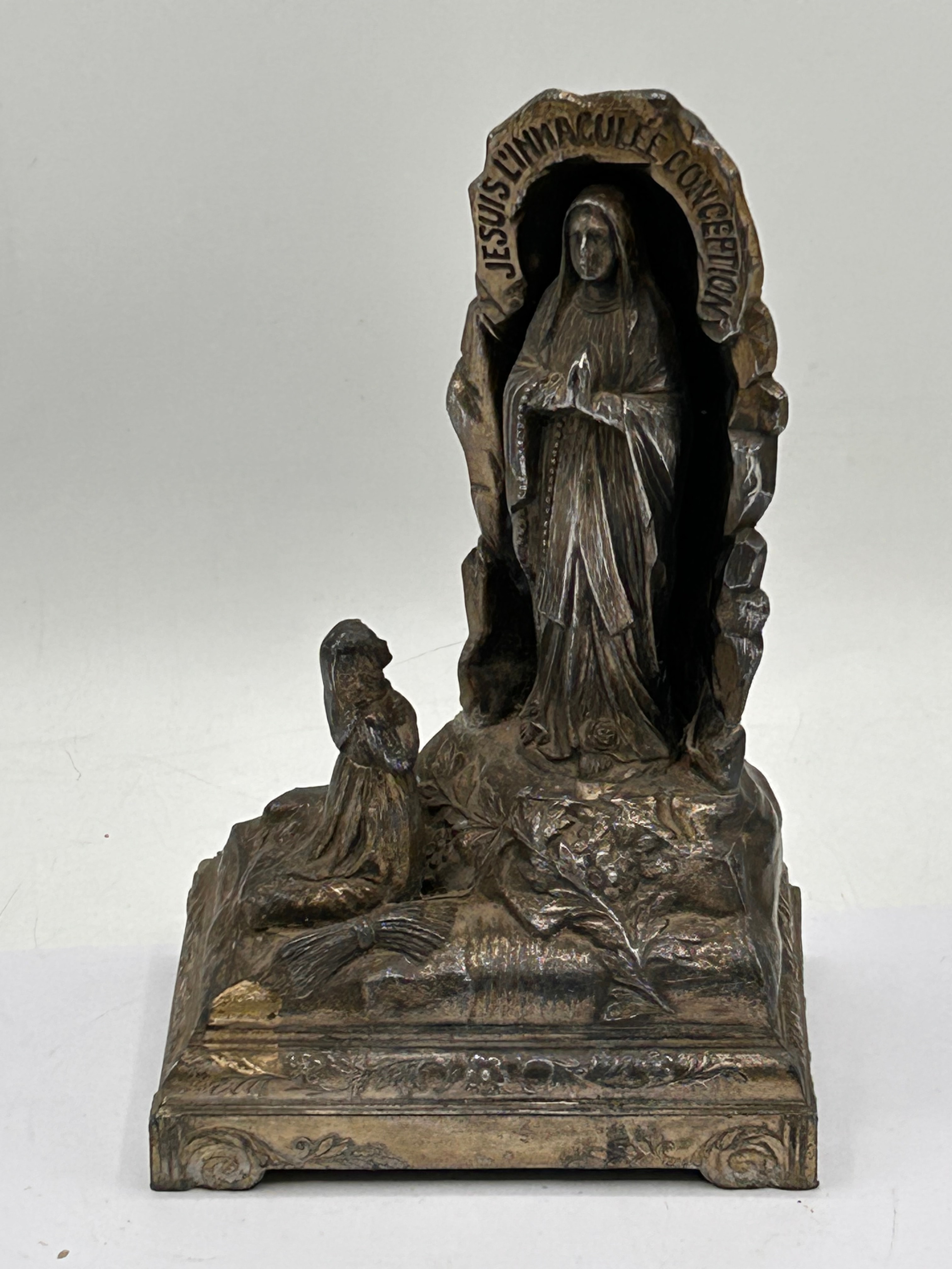 An antique French devotional statuette, cast from spelter or a similar base metal, depicting the Virgin Mary standing within a grotto, with Saint Bernadette kneeling in adoration to her left. The arch above the Virgin is inscribed with “JESUIS L’IMMACULEE CONCEPTION” (I am the Immaculate Conception). The rear of the base bears the marking “MADE IN FRANCE.”