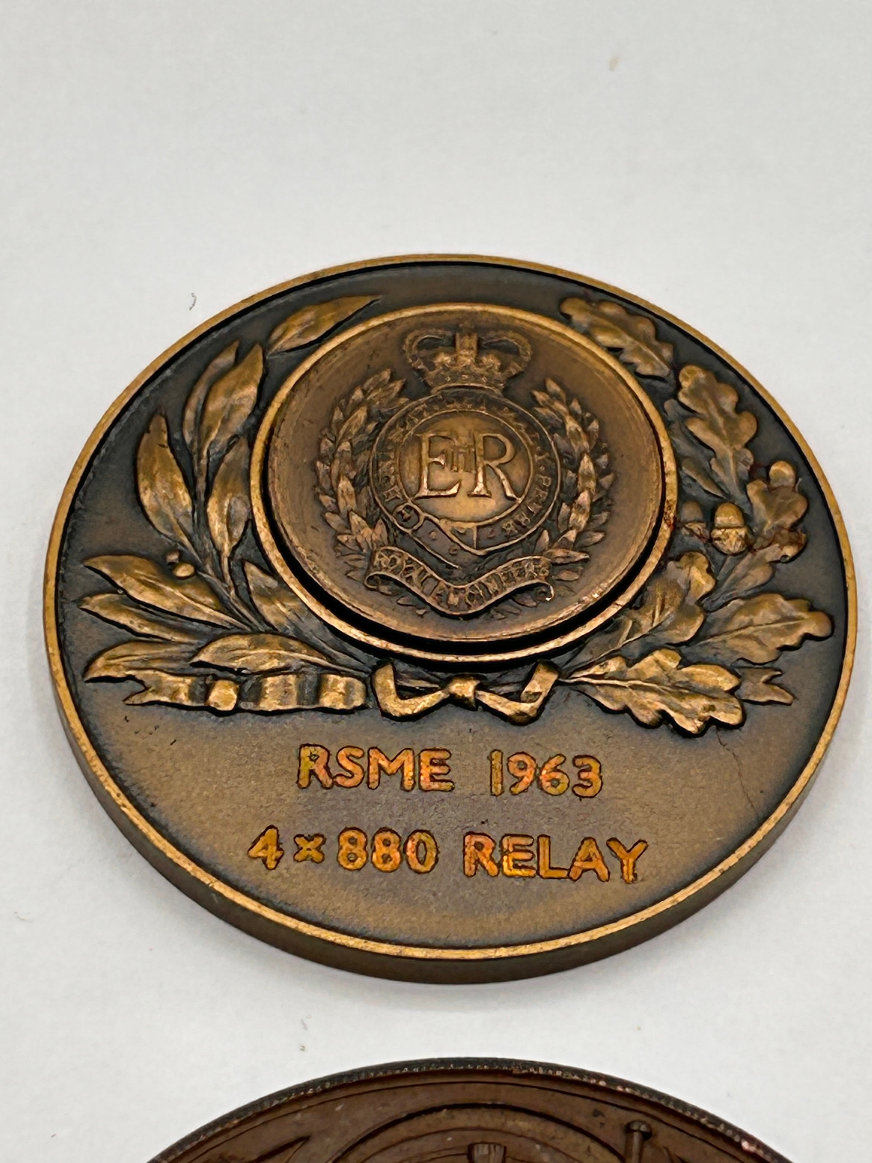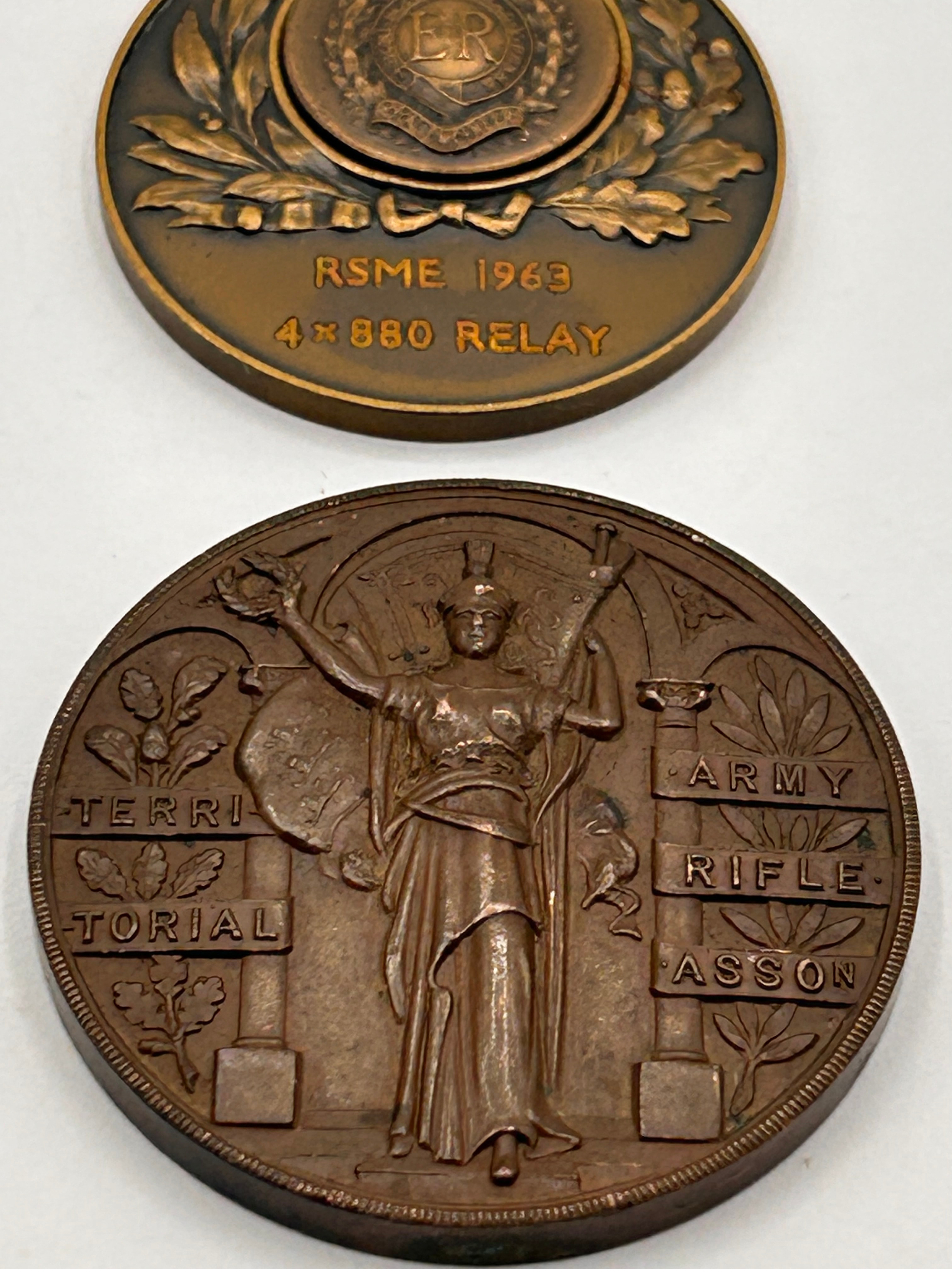 A pair of circular bronze-toned commemorative medals, dated 1963. The upper medal’s obverse features a crowned “ER” monogram, indicating Elizabeth Regina, encircled by a wreath and a scroll bearing the motto “HONI SOIT QUI MAL Y PENSE” (Shame on him who thinks evil of it), all set against a larger field of oak leaves and acorns; below this, it is inscribed “RSME 1963” and “4 x 880 RELAY”, signifying an award from the Royal School of Military Engineering. The lower medal’s reverse depicts an allegorical female figure holding a wreath and torch, flanked by architectural elements and foliage, with text reading “TERRITORIAL” on the left and “ARMY RIFLE ASSON” (Association) on the right, indicating an award from the Territorial Army Rifle Association.