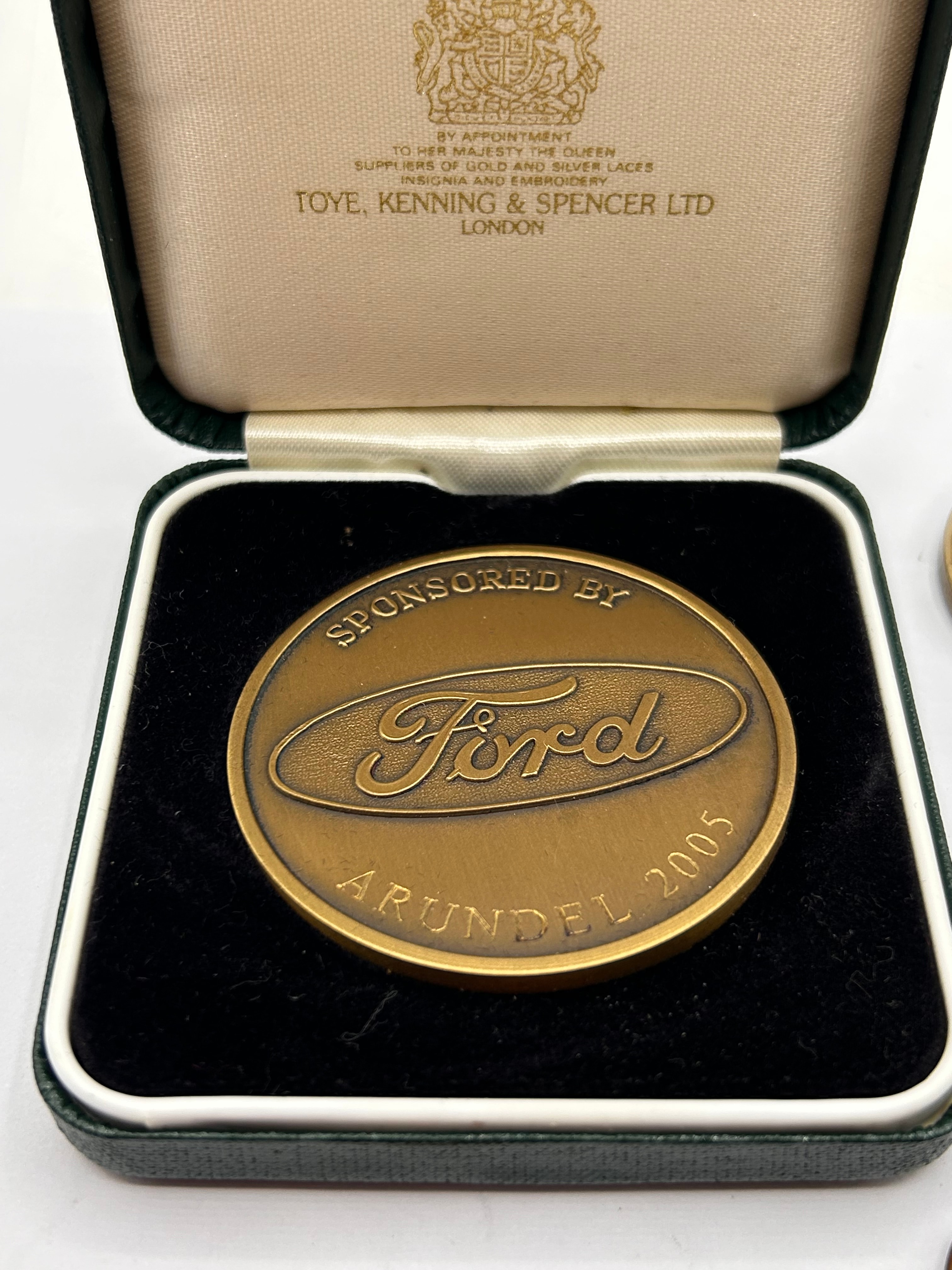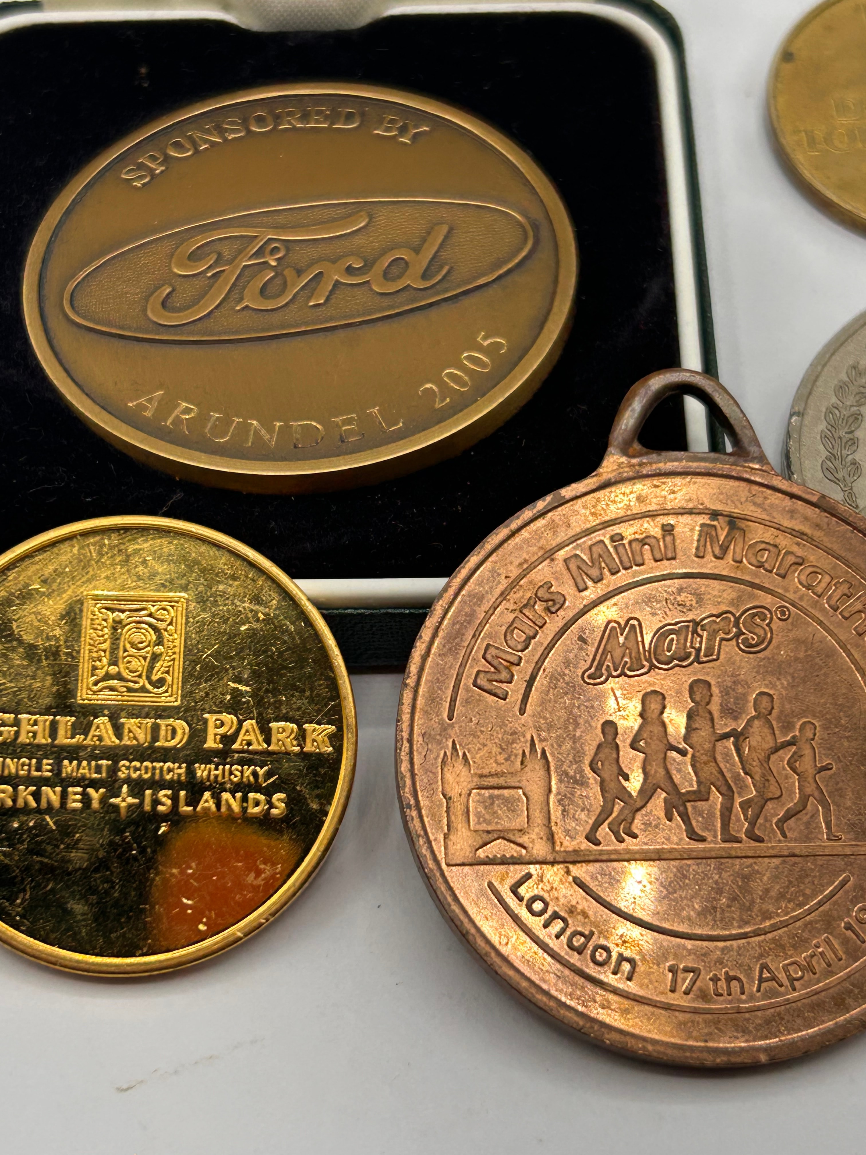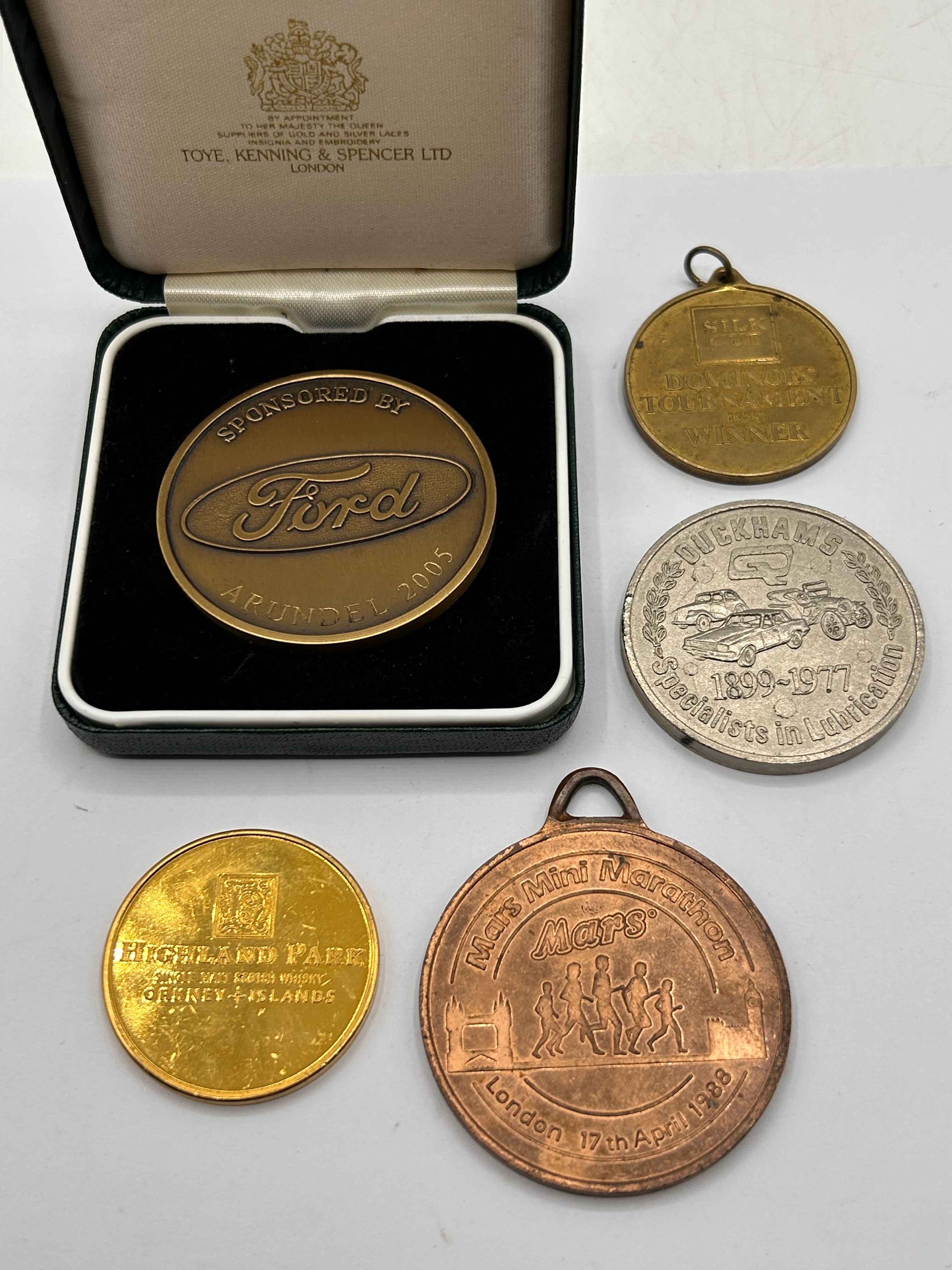 A collection of five assorted commemorative medals and coins, primarily crafted from various base metals including bronze, brass-toned, and silver-toned alloys. The largest item is a bronze-toned medal, dated 2005 and marked “SPONSORED BY Ford ARUNDEL,” presented in a dark green velvet-lined case bearing the royal warrant of “TOYE, KENNING & SPENCER LTD LONDON.” The other four, uncased, include a gold-toned “SILK CUT DOMINOES TOURNAMENT 1985 WINNER” medal with a loop; a silver-toned medal commemorating “DUCKHAMS Q Specialists in Lubrication 1899-1977” with embossed classic cars; a gold-toned “HIGHLAND PARK SINGLE MALT SCOTCH WHISKY ORKNEY ISLANDS” coin; and a bronze-toned “Mars Mini Marathon London 17th April 1988” medal with a loop, depicting runners and Tower Bridge. The items span various modern periods, from 1977 (commemorated) to 2005.