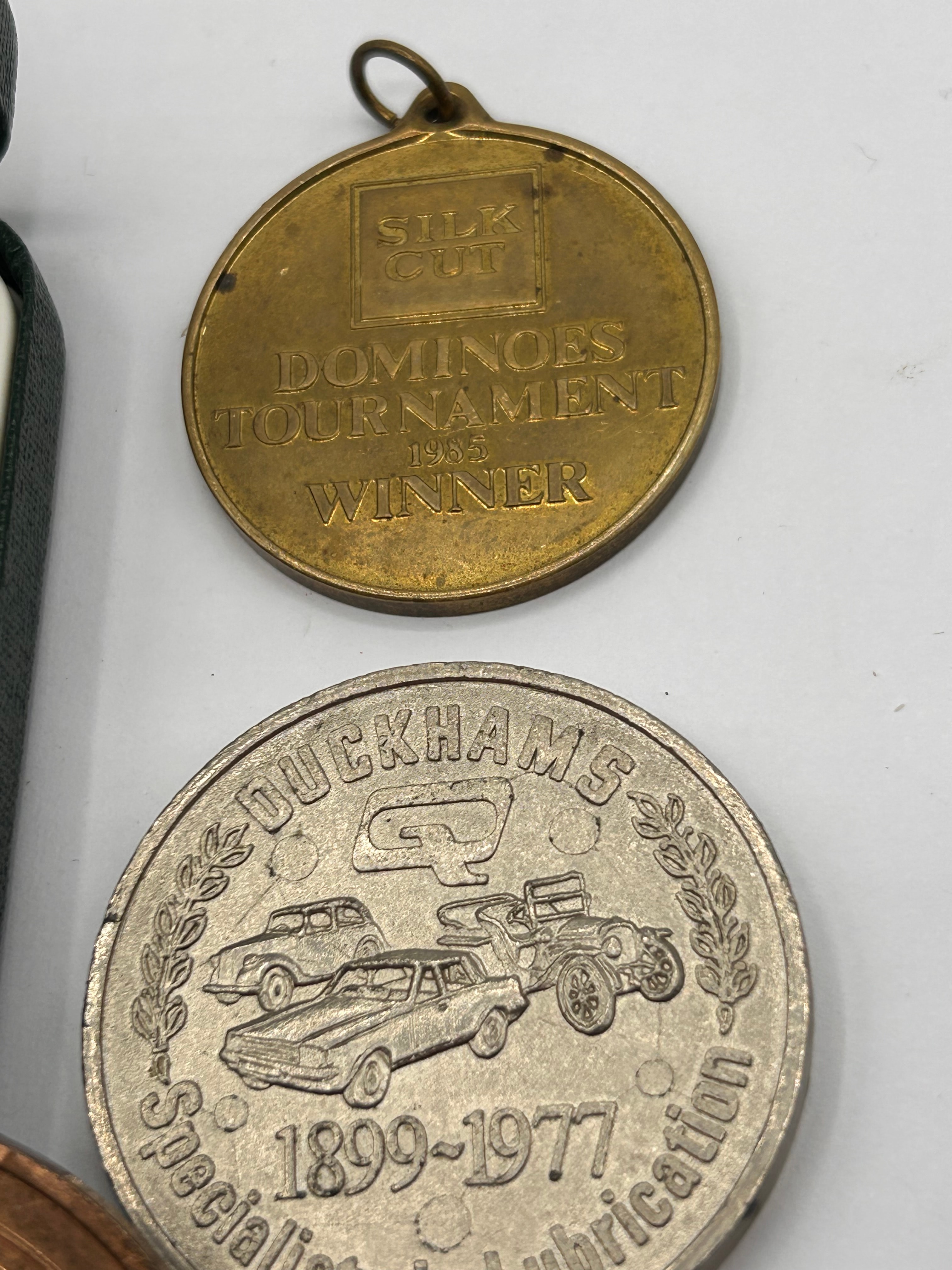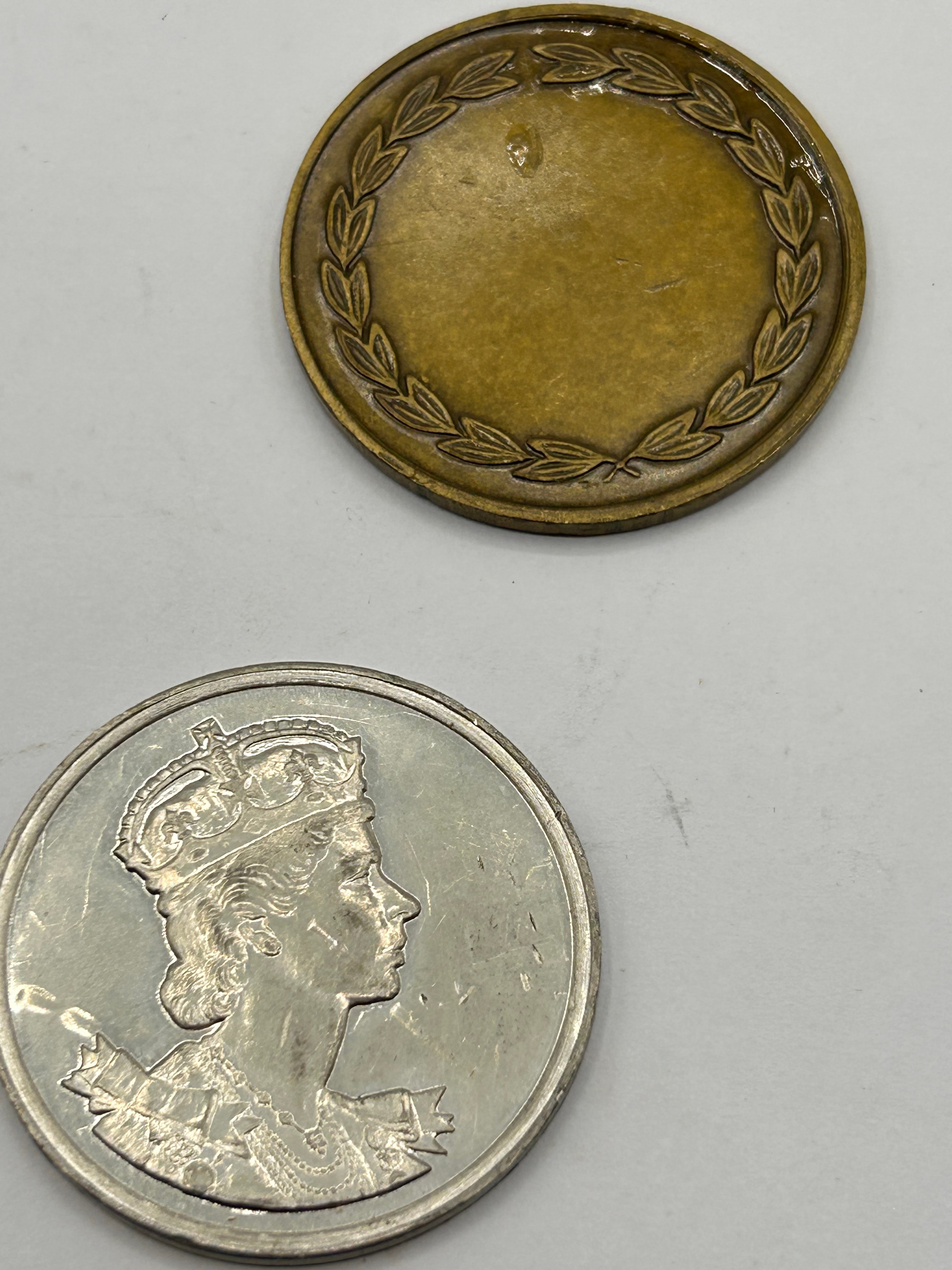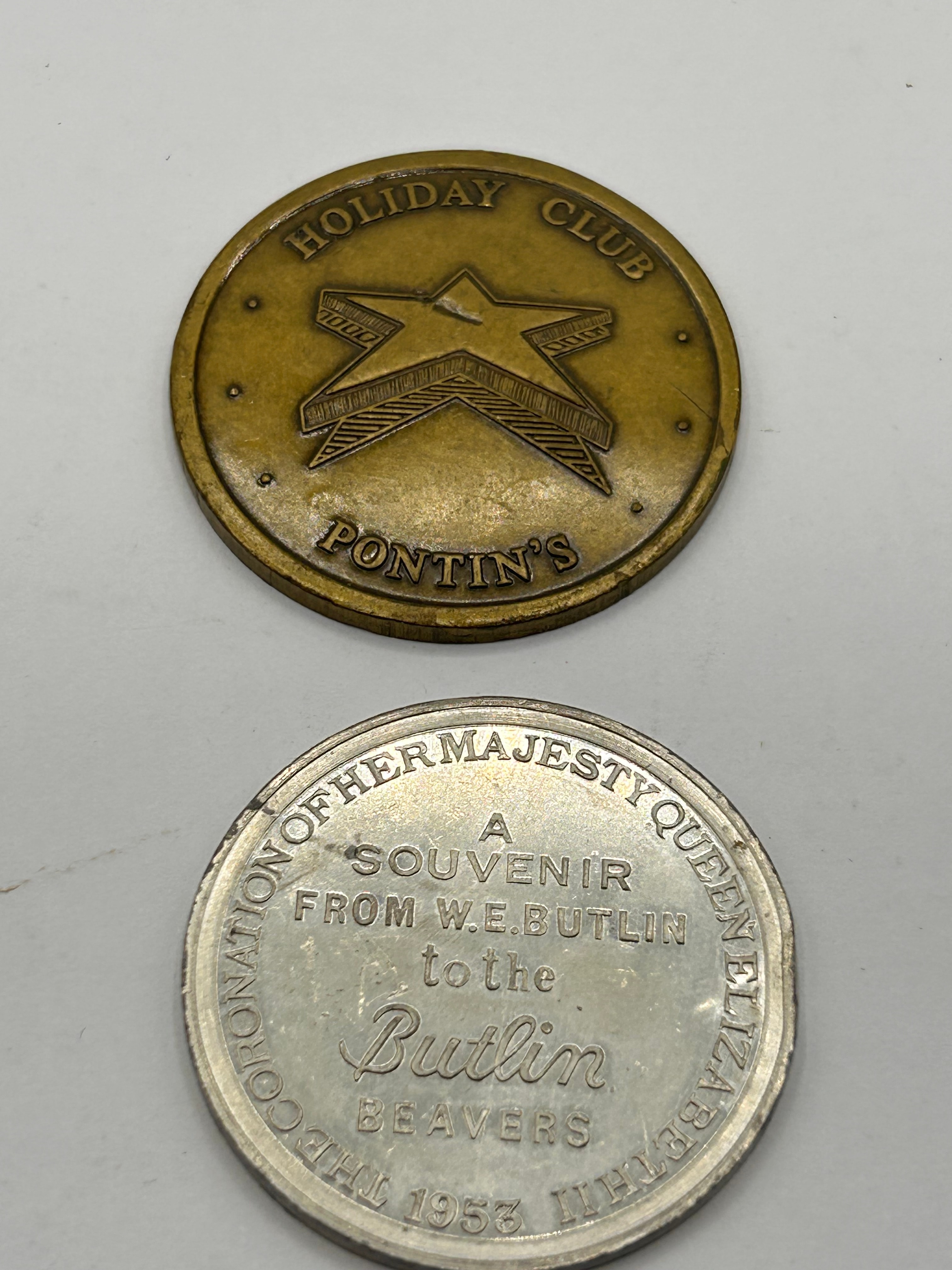 A pair of British commemorative tokens, crafted from base metals. The first, a silver-toned token (likely nickel-plated or aluminum), commemorates the Queen’s Silver Jubilee of 1977, issued by Duckhams. It features three classic cars and is inscribed ‘DUCKHAMS Q 1899-1977 Specialists in Lubrication’. The second token, also silver-toned (likely nickel-plated or aluminum), is a souvenir commemorating the ‘CORONATION OF HER MAJESTY QUEEN ELIZABETH II 1953’, inscribed ‘A SOUVENIR FROM W.E. BUTLIN to the Butlin BEAVERS’.