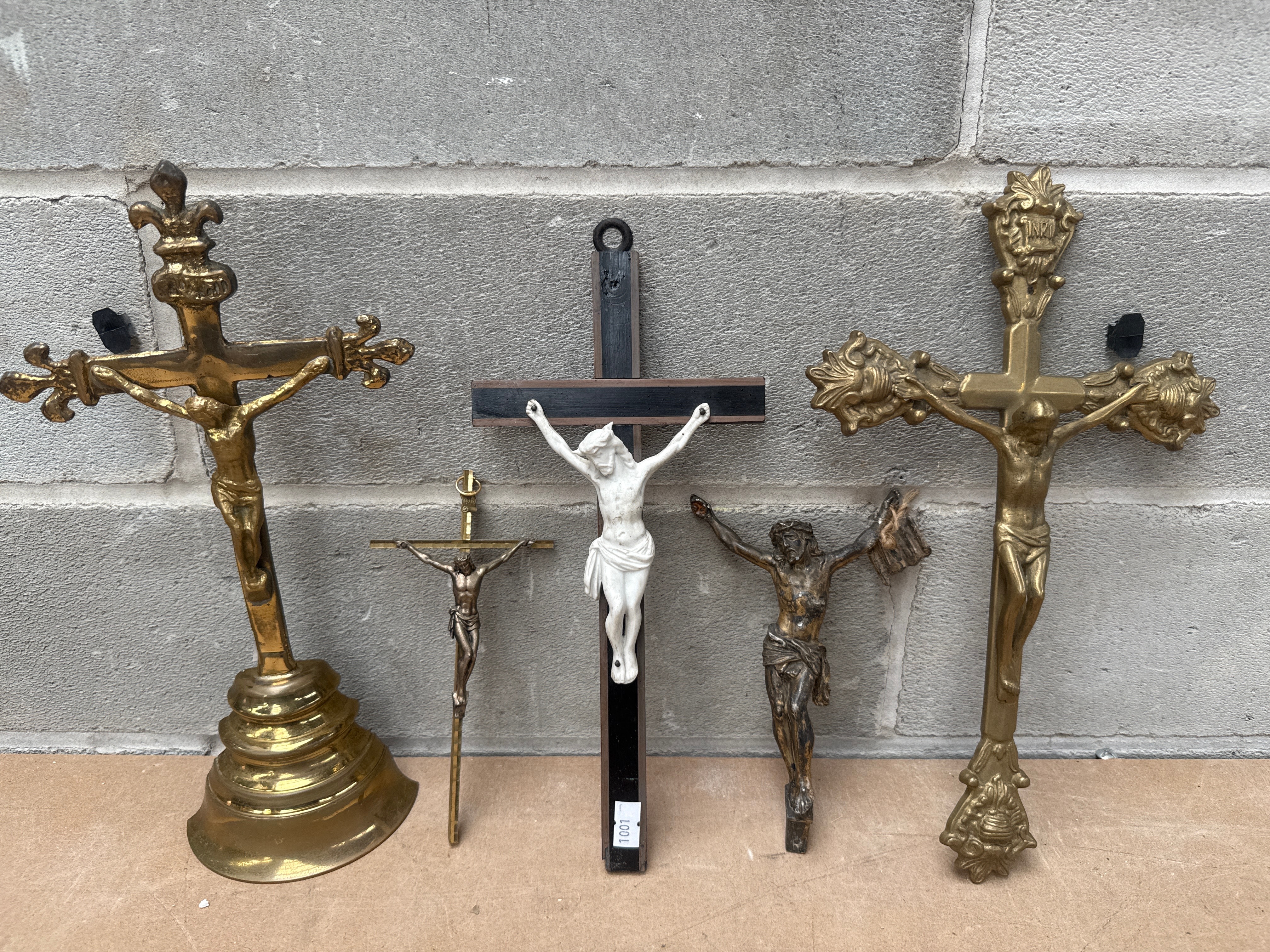 A group of five religious crucifixes, varying in size, material, and style. The lot includes two prominent pieces, crafted from brass or bronze, featuring elaborate decorative elements such as fleur-de-lis motifs and scrollwork. The crucifix on the right clearly bears the inscription ‘INRI’ on a plaque above Christ’s head, which translates to “Iesus Nazarenus Rex Iudaeorum” (Jesus of Nazareth, King of the Jews). A third smaller crucifix, likely brass or bronze, stands towards the left. The central crucifix comprises a white figure of Christ, possibly plaster or resin, affixed to a dark-stained wooden cross, displaying a white sticker with the number ‘1001’ on its base. The final piece features a dark-toned metal corpus, potentially bronze or pewter, mounted on a plainer cross.