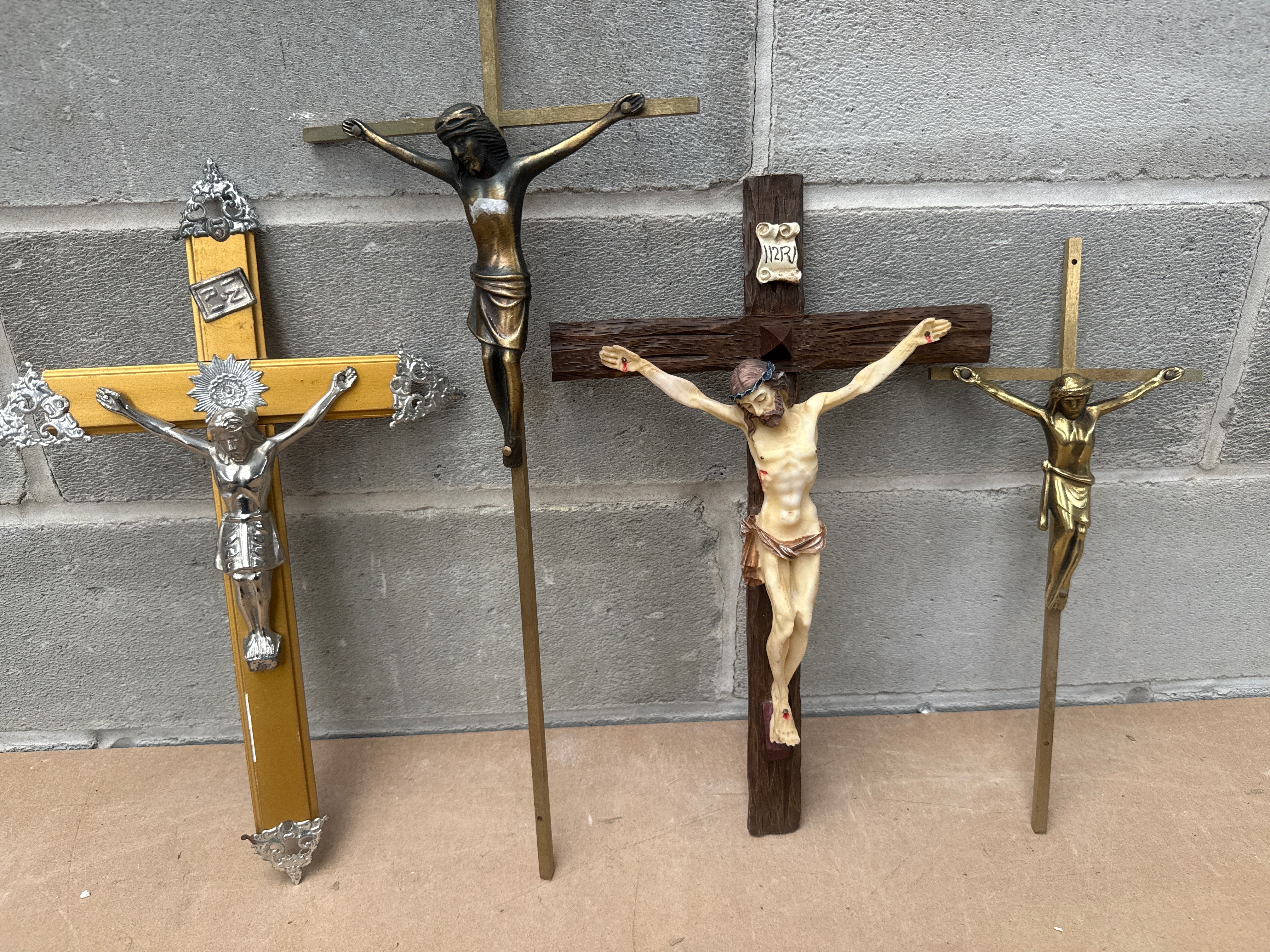 This lot comprises four religious devotional crucifixes, each featuring a corpus of Christ mounted on a cross, exhibiting variations in materials and style. One crucifix has a yellow-stained wooden cross adorned with ornate silver-tone metal caps and a matching silver-tone metal corpus. A second piece features a plain, light-colored wooden cross with a bronze-tone metal corpus, notable for a rectangular white marking on its chest. The third crucifix presents a dark brown, textured cross, likely crafted from resin or wood, displaying a detailed polychrome, flesh-toned corpus with painted wounds; a scroll above the corpus clearly shows the inscription “INRI,” translating from Latin as “Iesus Nazarenus Rex Iudaeorum” (“Jesus of Nazareth, King of the Jews”). The final crucifix consists of a simple light-colored wooden cross supporting a gold-tone metal corpus.