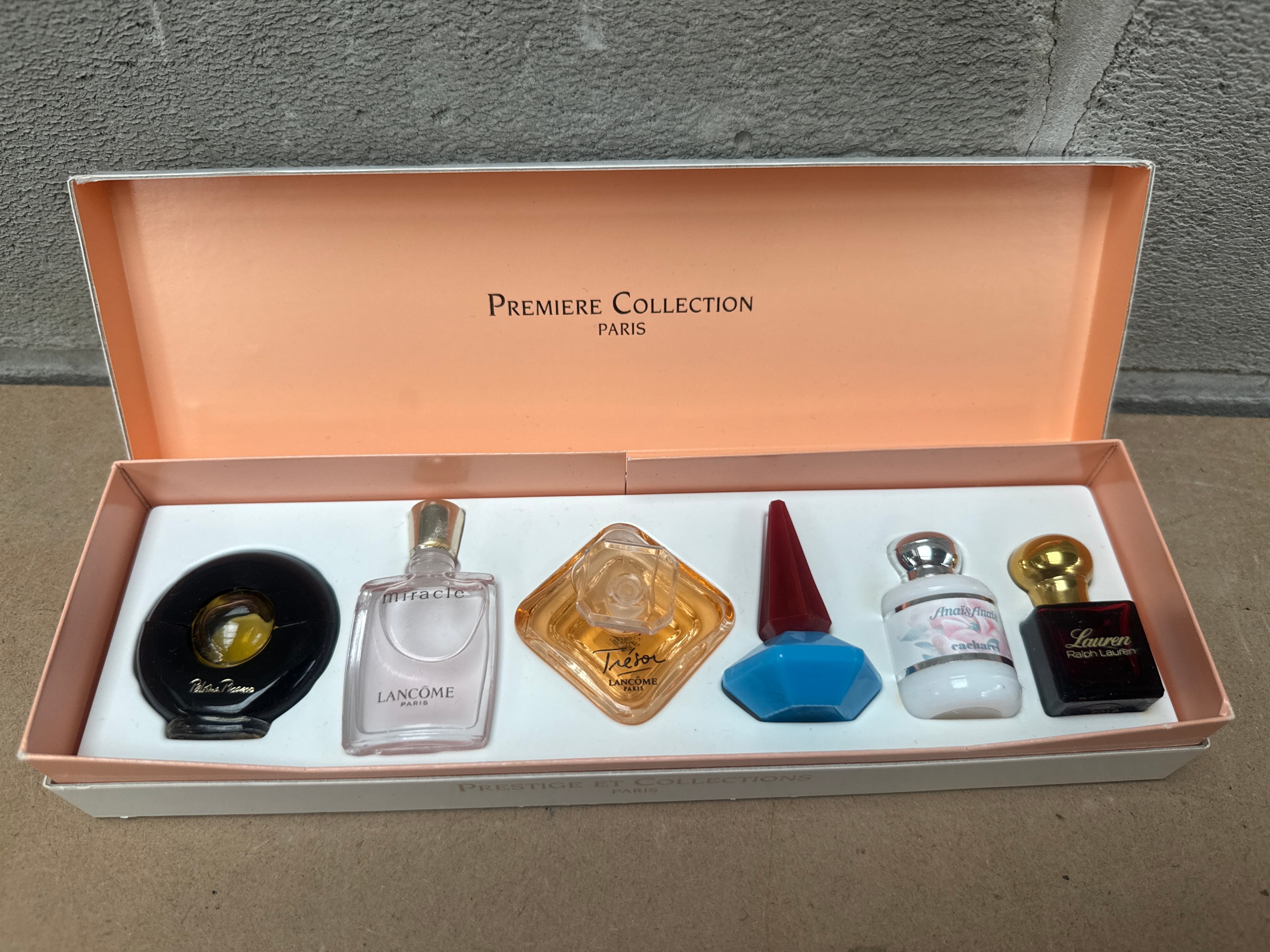 A contemporary designer miniature perfume collection, presented in a “PREMIERE COLLECTION PARIS” branded cardboard box with a hinged lid. The set features six glass miniature bottles with various plastic and metal caps, securely nestled within a fitted paperboard tray. The fragrances include Paloma Picasso, Lancôme’s Miracle and Trésor, Cacharel’s Anaïs Anaïs, and two Ralph Lauren scents (one identified as Lauren, the other a distinctive blue and red bottle). The box exterior also shows “PRESTIGE ET COLLECTIONS”.