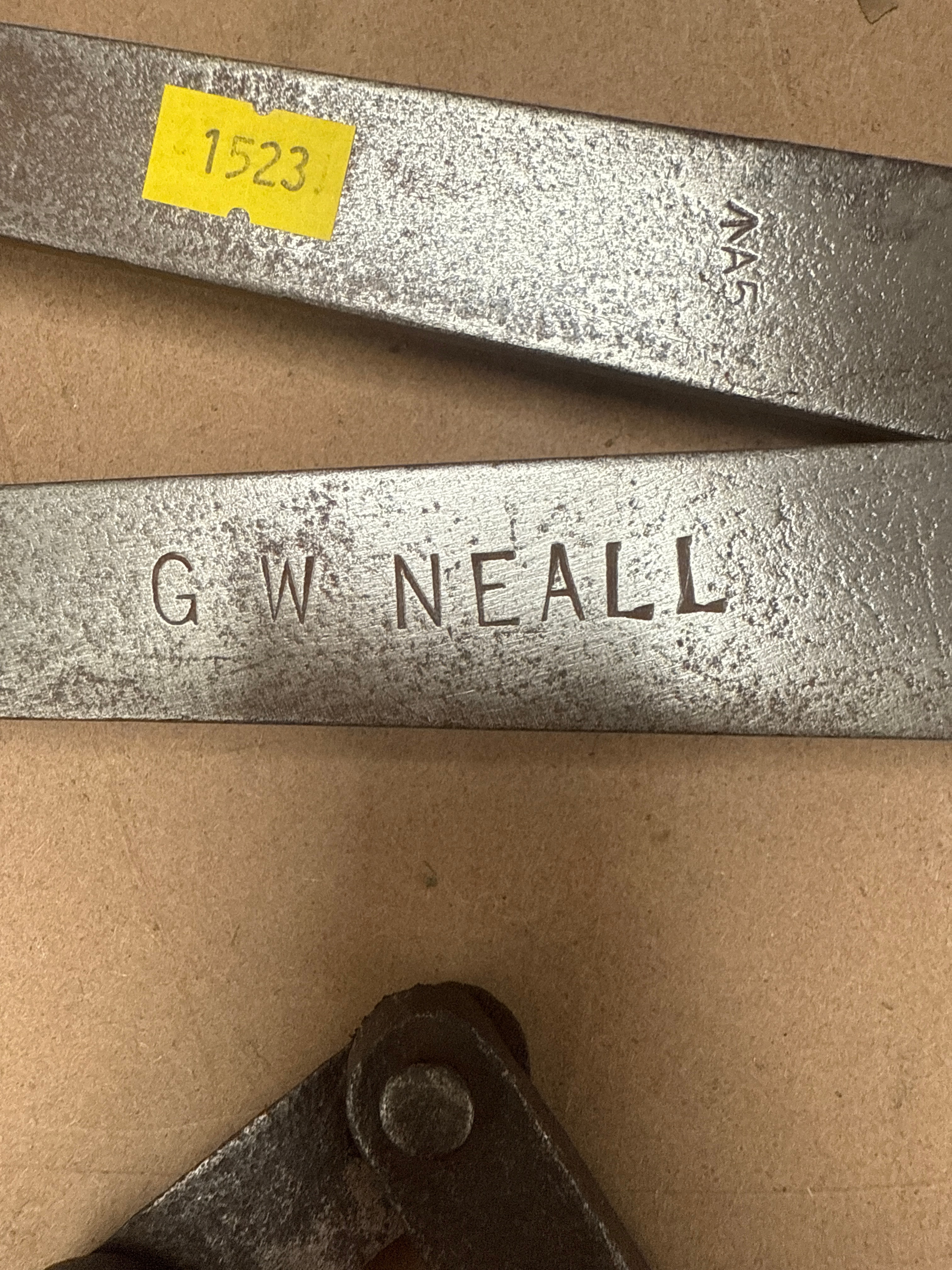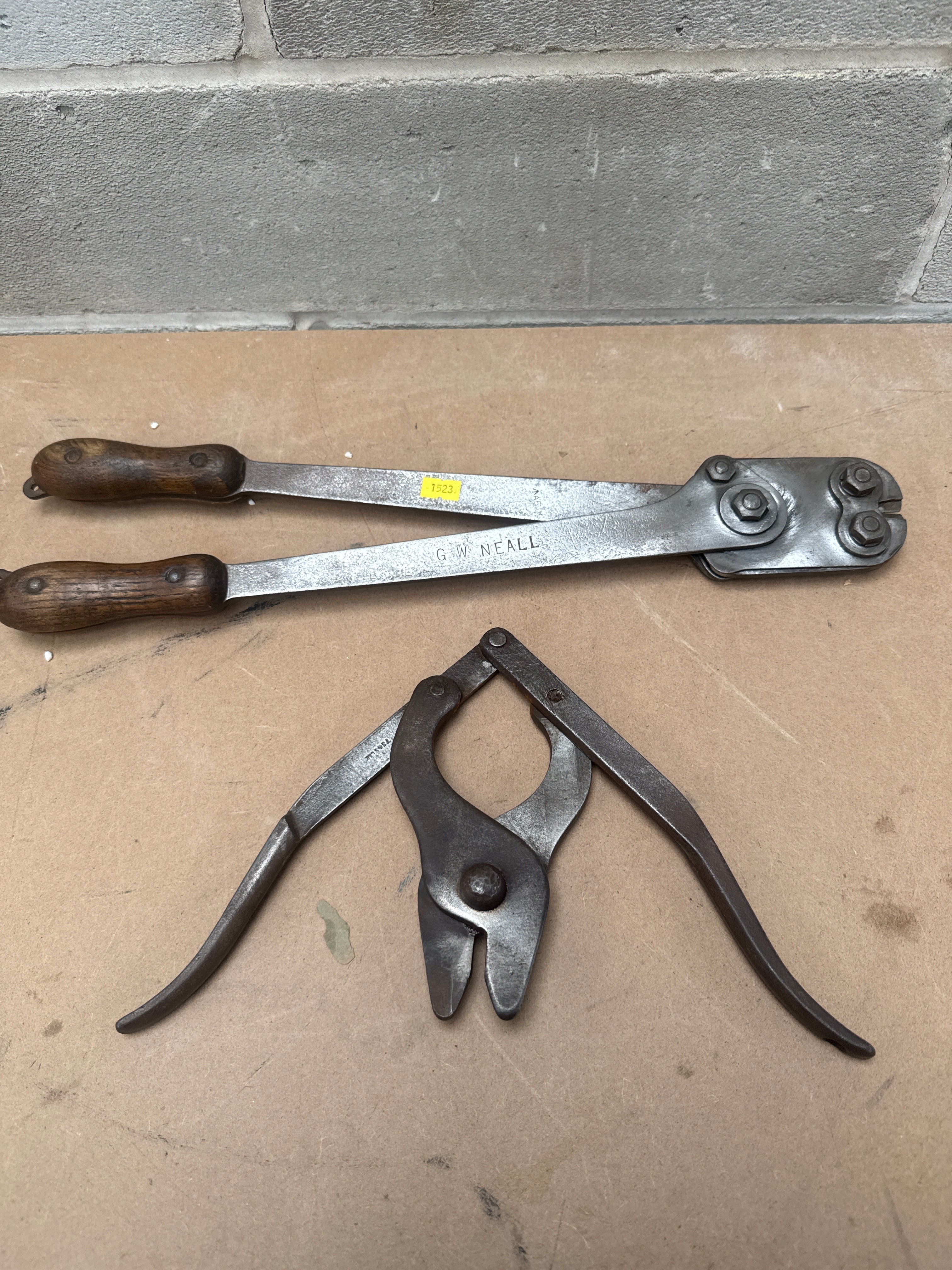 A pair of vintage metal hand tools. The larger tool, likely a crimping or clinching device, is constructed from steel or iron with wooden handle grips. It is visibly stamped ‘G W NEALL’ on one arm and bears a yellow inventory sticker with the number ‘1523’ on the opposing arm, with an additional ‘NAS’ marking visible near the riveted head. The smaller tool is a robust pair of dark metal pliers or nippers, possibly forged steel or cast iron, featuring a simple pivot mechanism and broad jaws. Both tools suggest a utilitarian style from an earlier period.