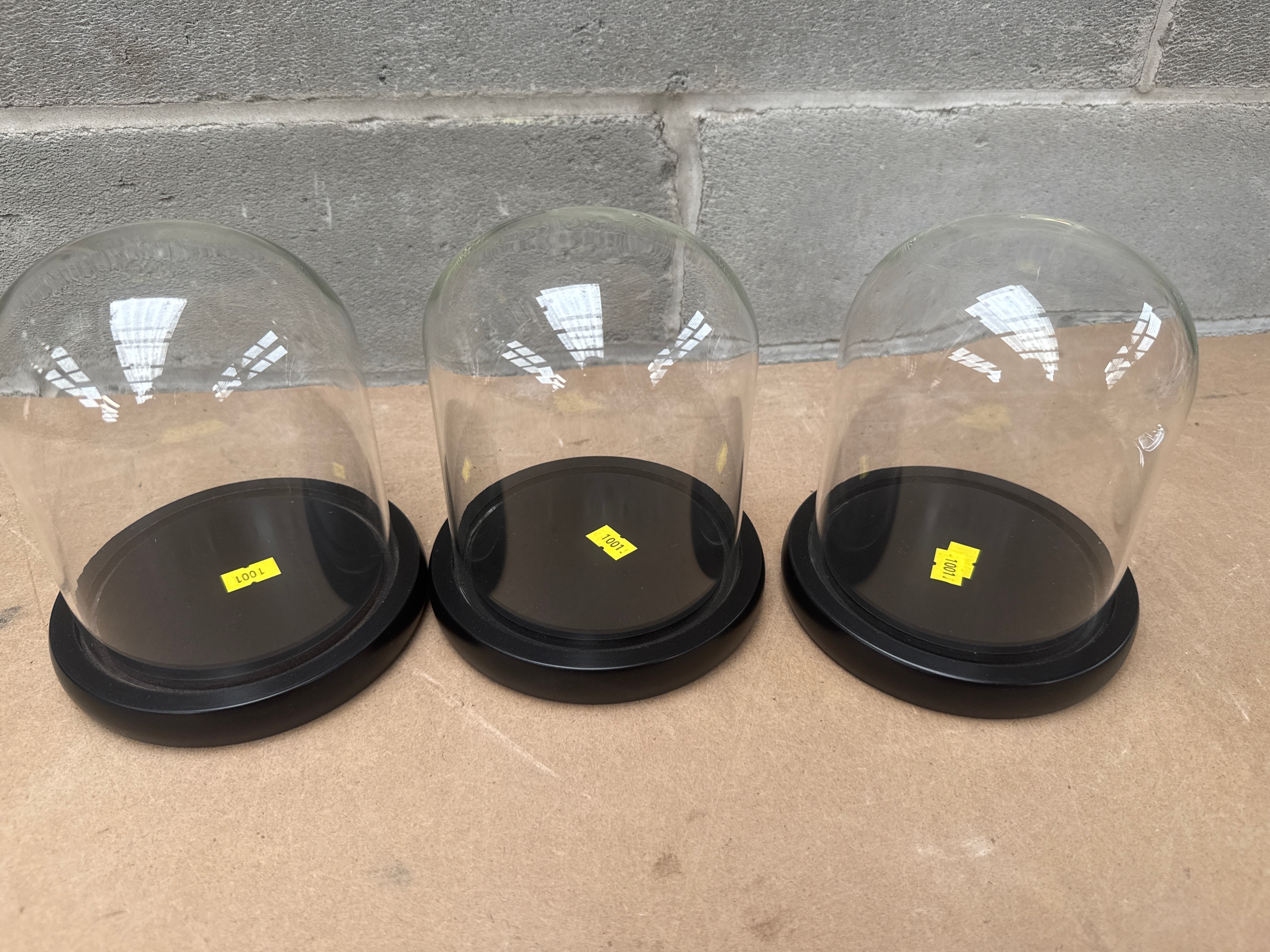 Three CYS Excel Glass Display Dome Cloches. Each features a clear, bell-shaped glass dome resting securely on a flat, round, black-finished base, likely constructed from wood, composite, or plastic. Each black base prominently displays a yellow rectangular adhesive label bearing the numeric inscription ‘1001’. The material is Glass.