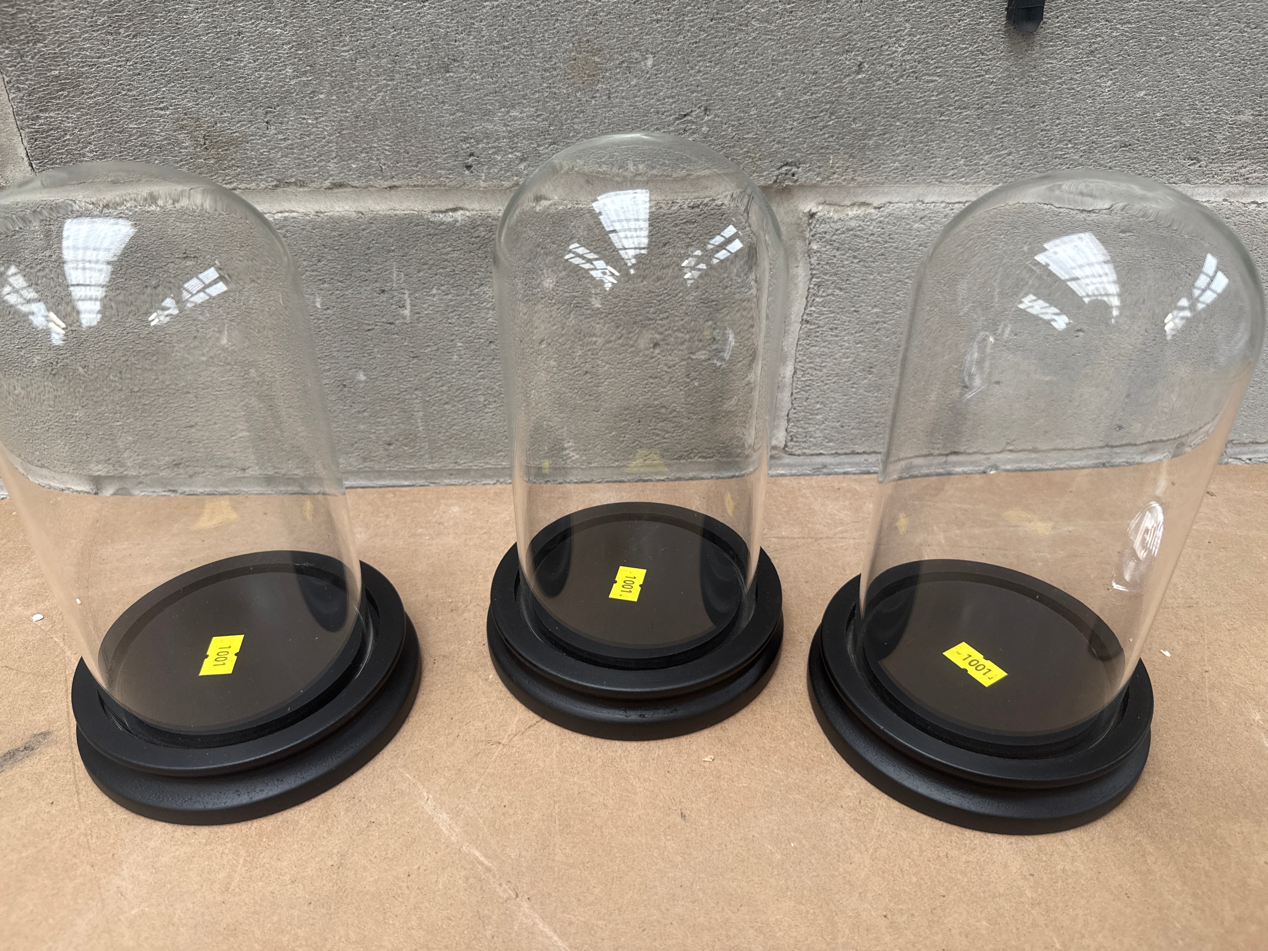 A lot comprising three identically styled display cloches, each featuring a clear, domed glass bell of Glass set upon a tiered, circular base of dark, likely painted wood or plastic. The design suggests a contemporary or modern reproduction aesthetic, lacking distinctive period-specific embellishments. Each base bears a yellow adhesive label marked “1001,” which appears to be an inventory or lot number.