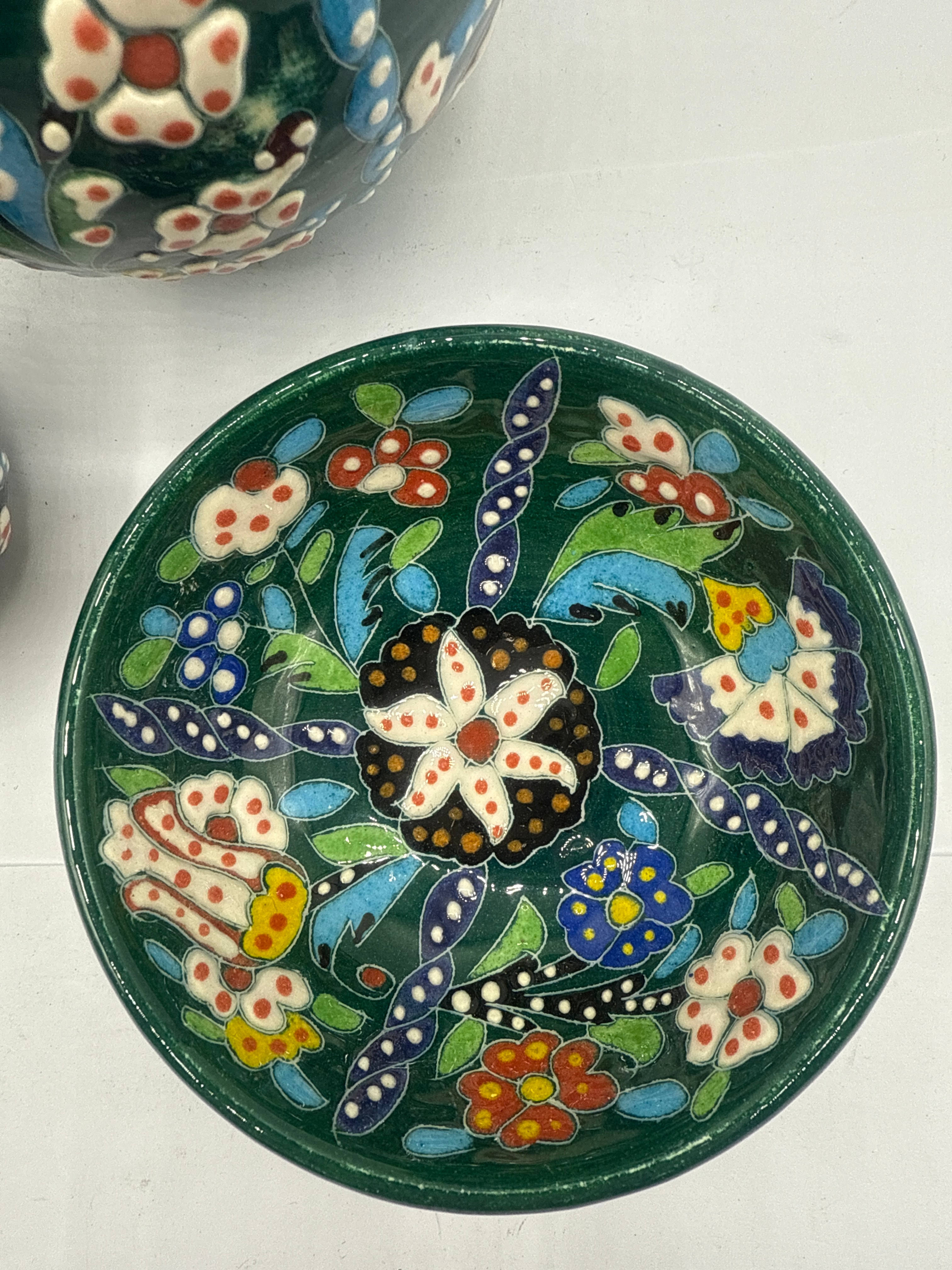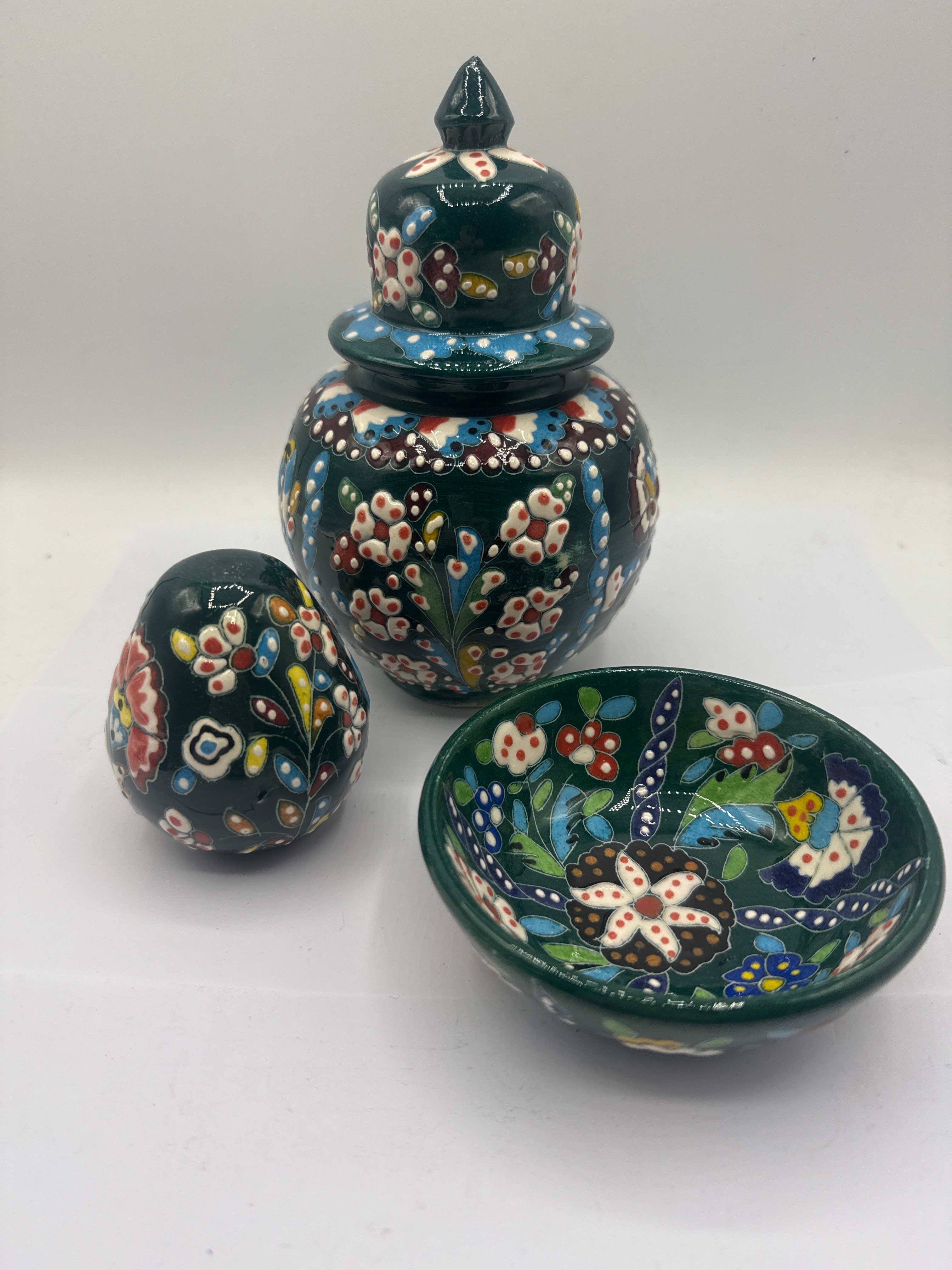 A group of three Turkish Iznik ceramic items, comprising a lidded jar with a domed cover and finial, an egg-shaped decorative object, and a small shallow bowl. Each piece is uniformly decorated with vibrant hand-painted floral and foliate motifs, accented with small dots, on a deep green ground. The color palette primarily features white, red, yellow, and various shades of blue, outlined in black. The style evokes traditional folk art pottery.