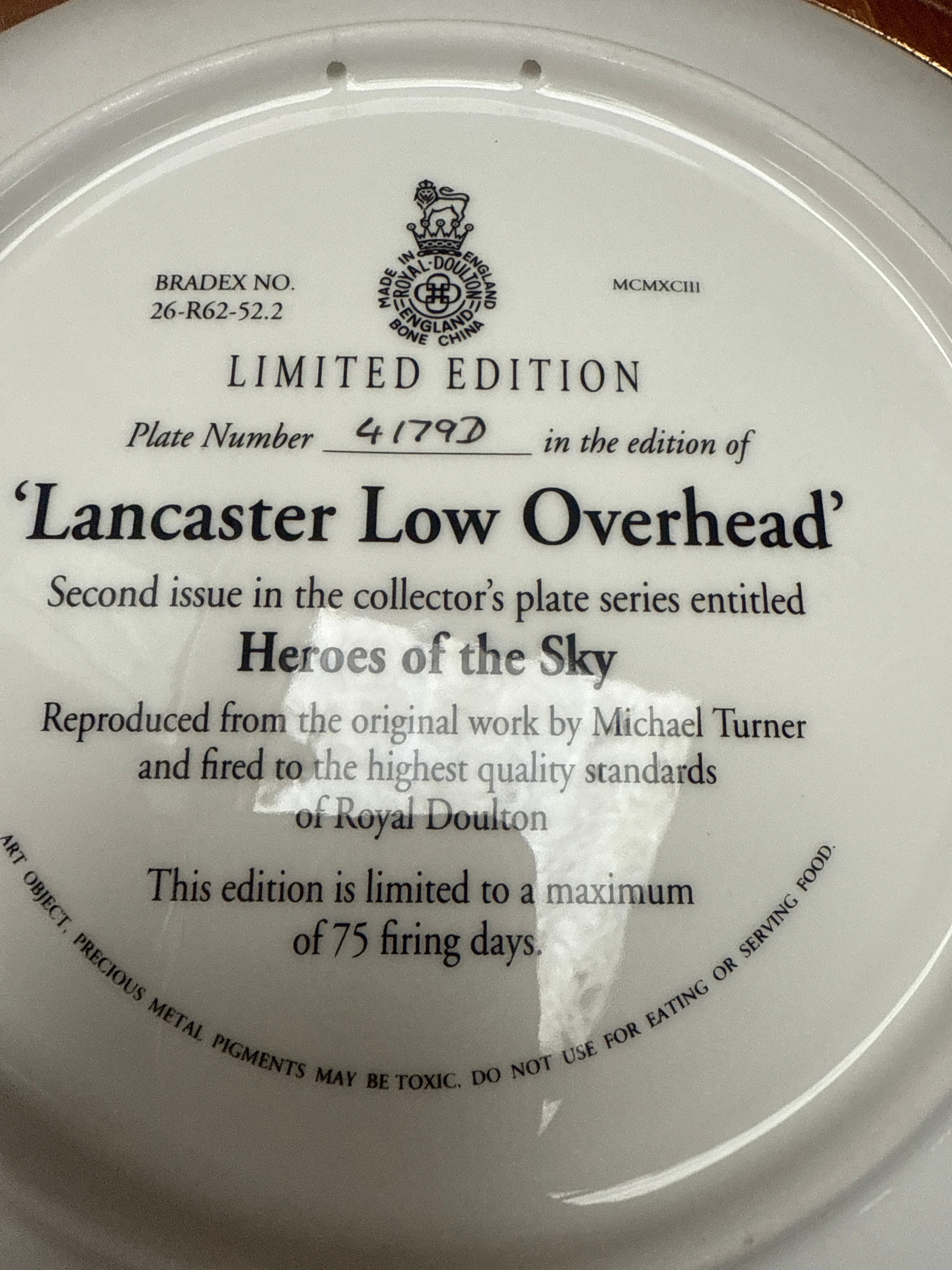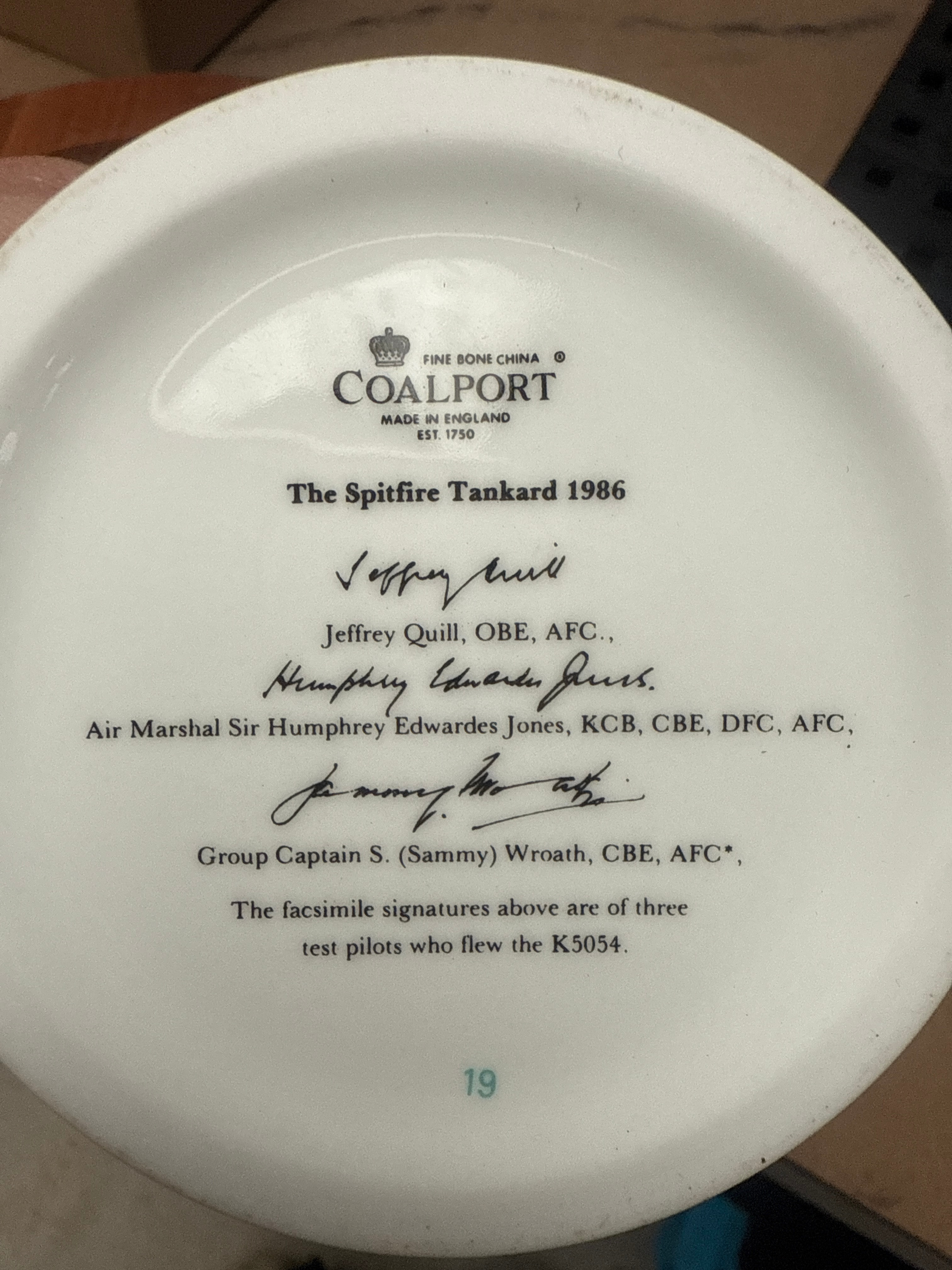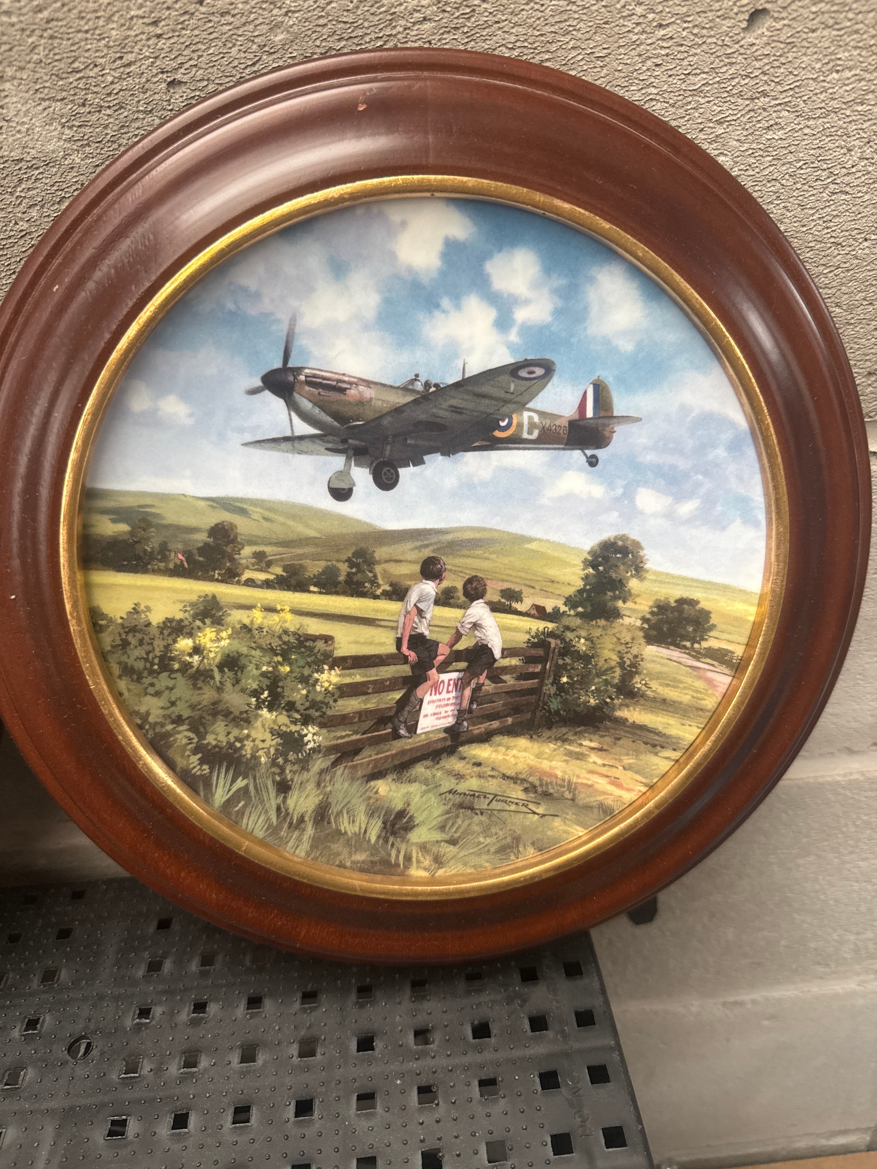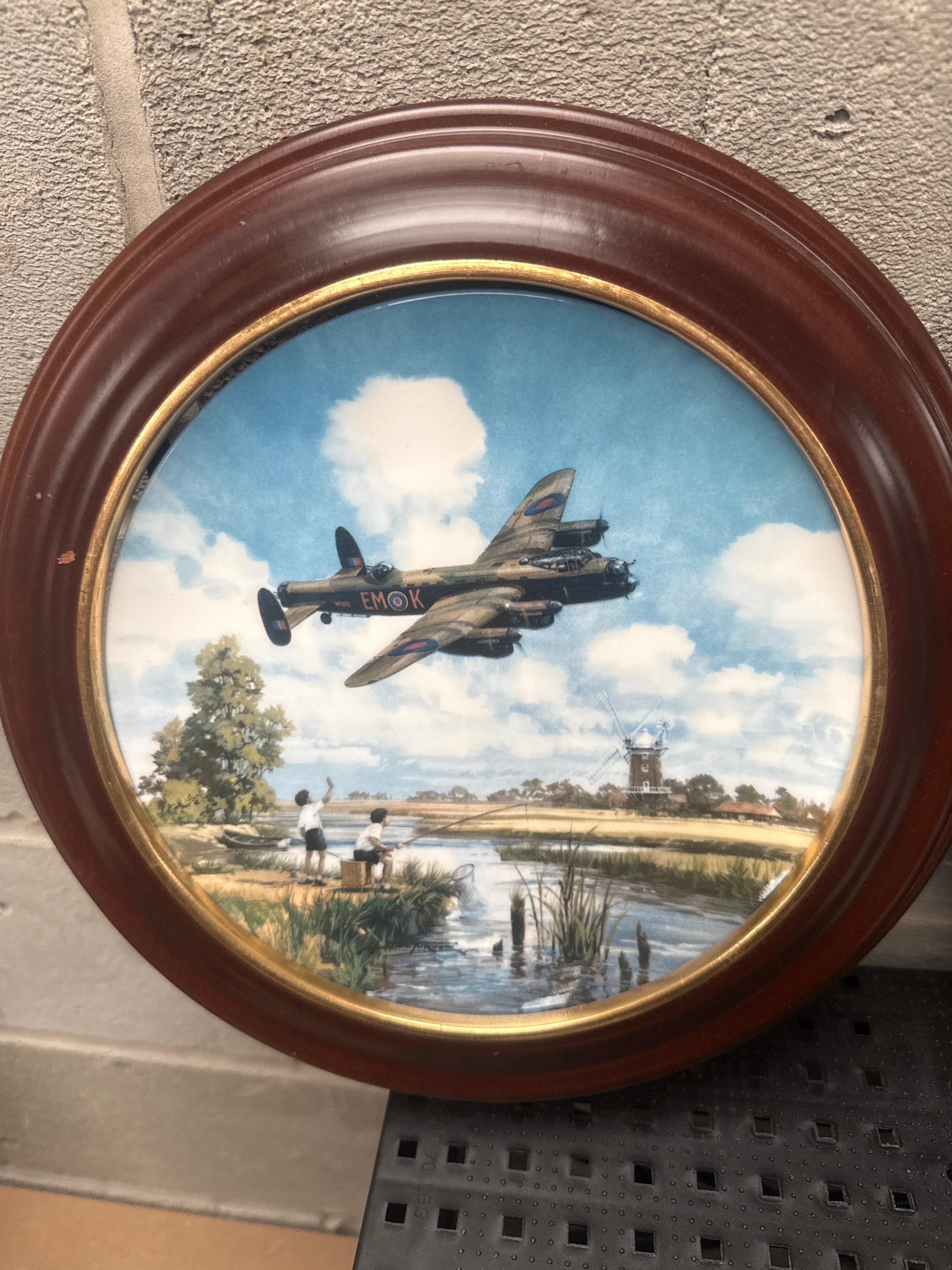 An alarm pocket watch style clock, featuring a yellow metal case and a white dial with both Roman and Arabic numerals. Accompanying this are a pair of Royal Doulton ‘Heroes of the Sky’ limited edition collector’s plates from 1993, framed in dark wood. These depict a Lancaster bomber (marked “EMOK”) and a Supermarine Spitfire aircraft (marked “526”) over pastoral scenes. The bomber plate is titled ‘Lancaster Low Overhead’ and both are reproductions of work by Michael Turner. Further included are two bone china tankards: one Coalport ‘The Spitfire Tankard 1986’ featuring aircraft and facsimile signatures of three test pilots (Jeffrey Quill, Humphrey Edwardes Jones, Sammy Wroath), and another with a monochrome Gothic architectural design. The collection is completed by a polished wooden miniature golf bag on wheels, and a red metal and wood model of a San Francisco cable car, marked “POWELL & HYDE S.F.” and “THE SAN FRANCISCO, CAL.”.