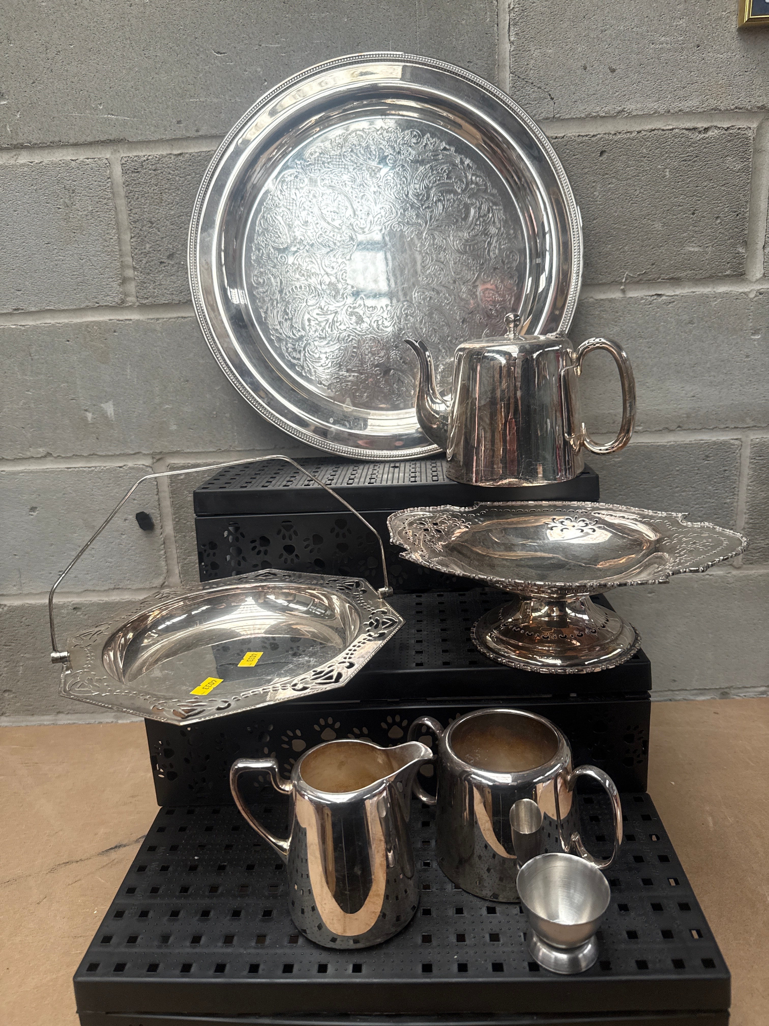 A 7-piece WM Rogers silver plate tea and coffee service. The collection includes a large round embossed tray, a traditional teapot or coffee pot, a footed serving dish with a scalloped and pierced rim, an octagonal handled basket, an open sugar bowl, a creamer, and a small lidded pot. Each piece is crafted from reflective silver-colored metal, featuring extensive floral and scrollwork designs, indicative of a traditional style, consistent with mid-20th century production.