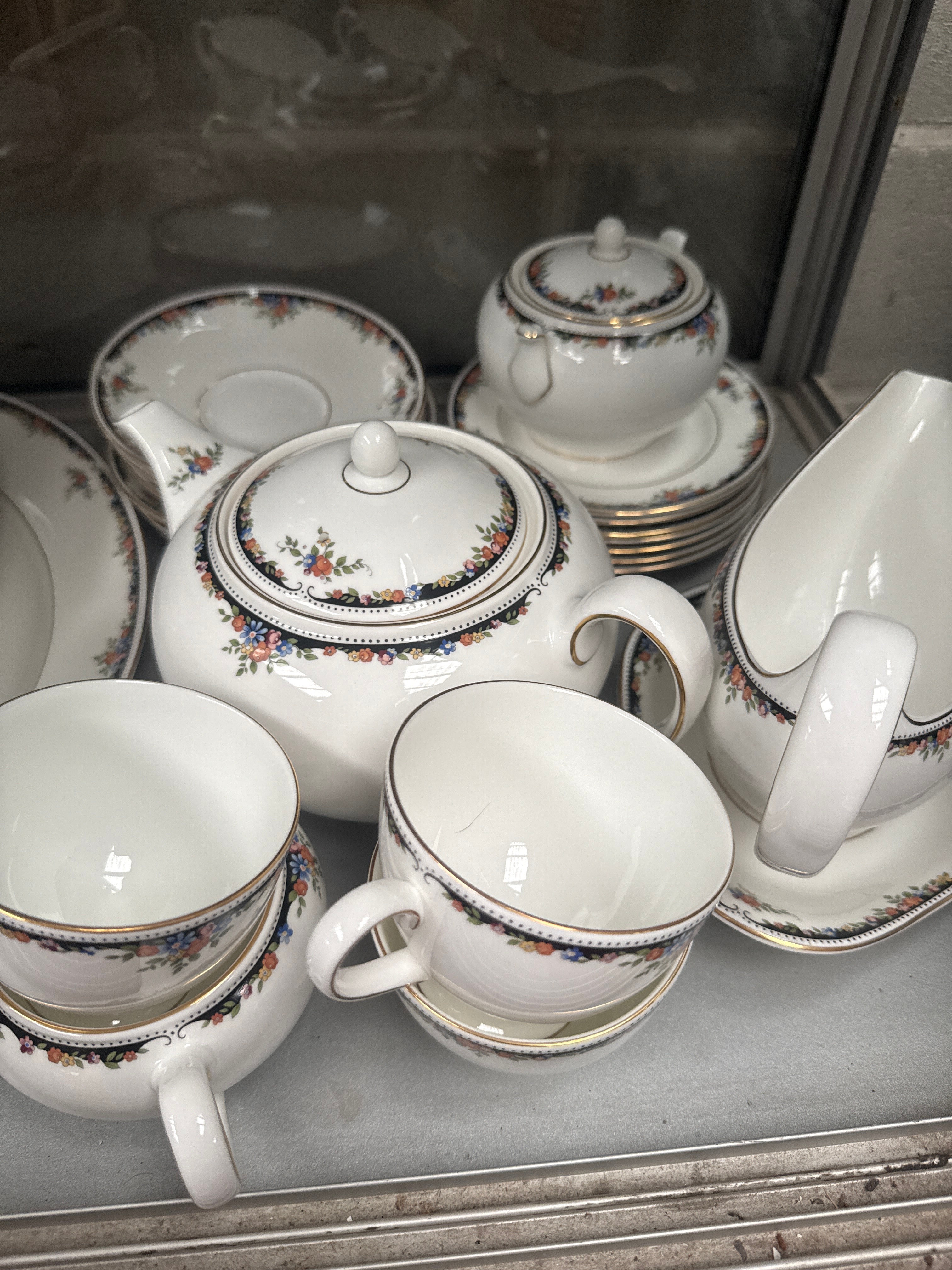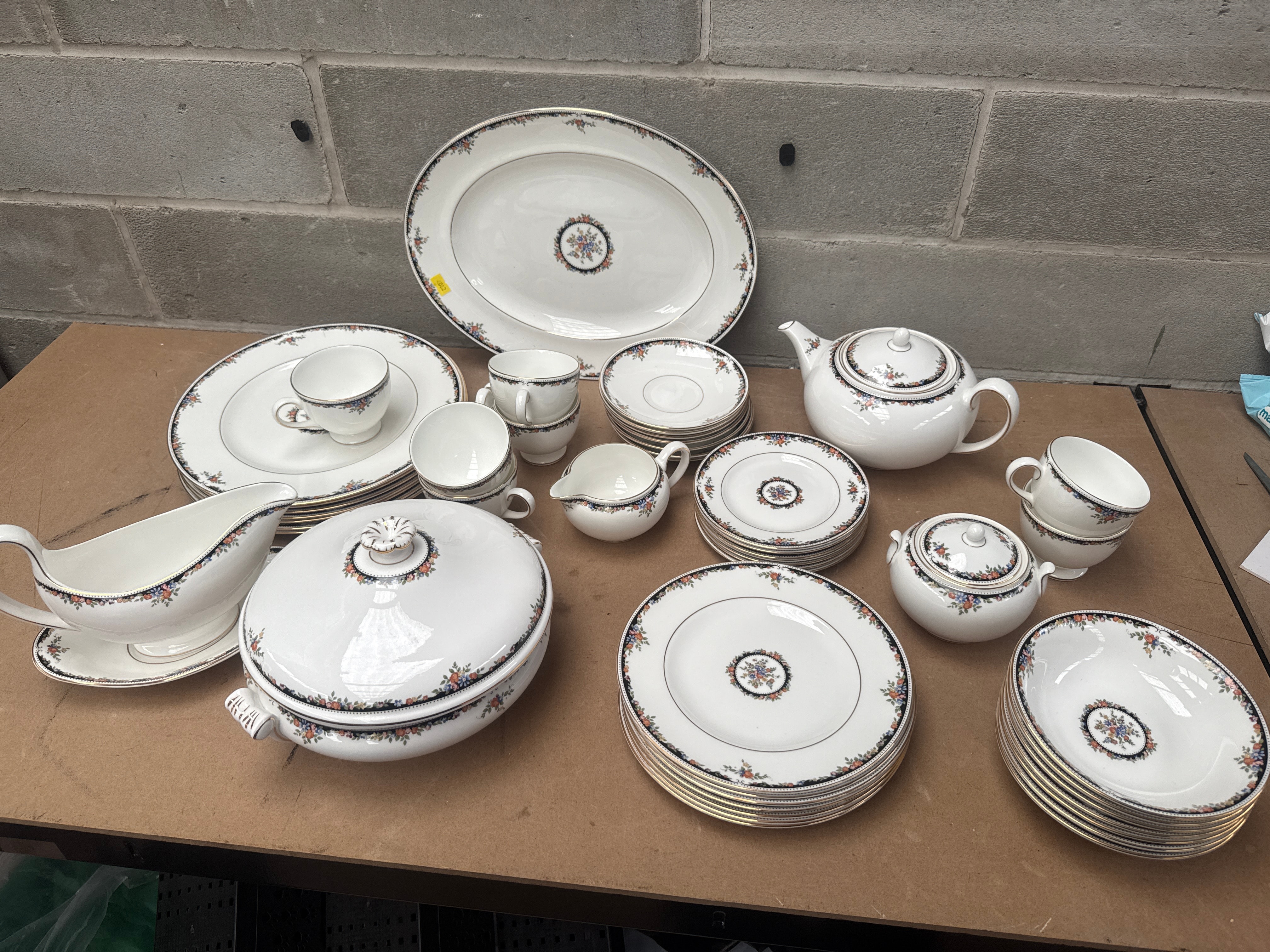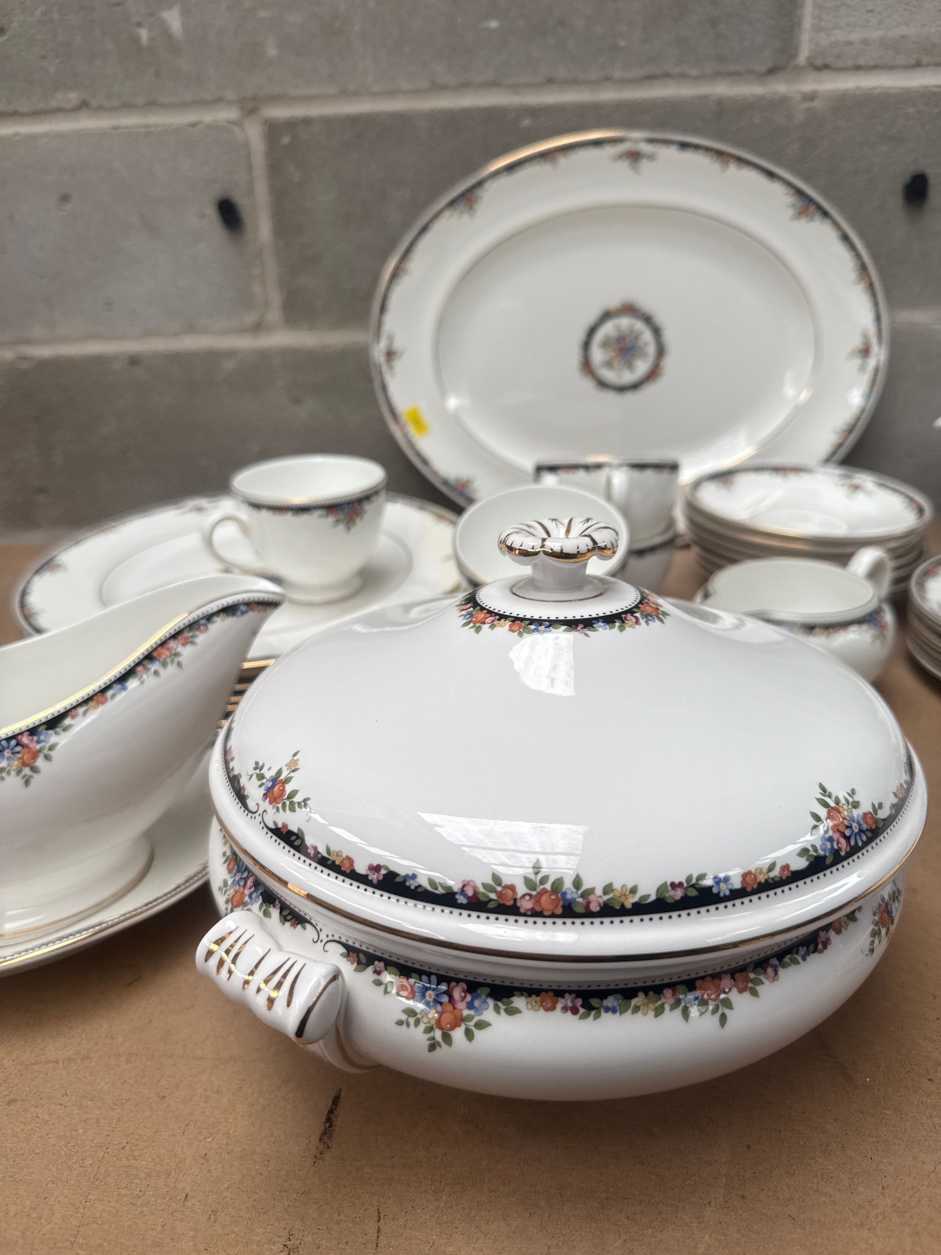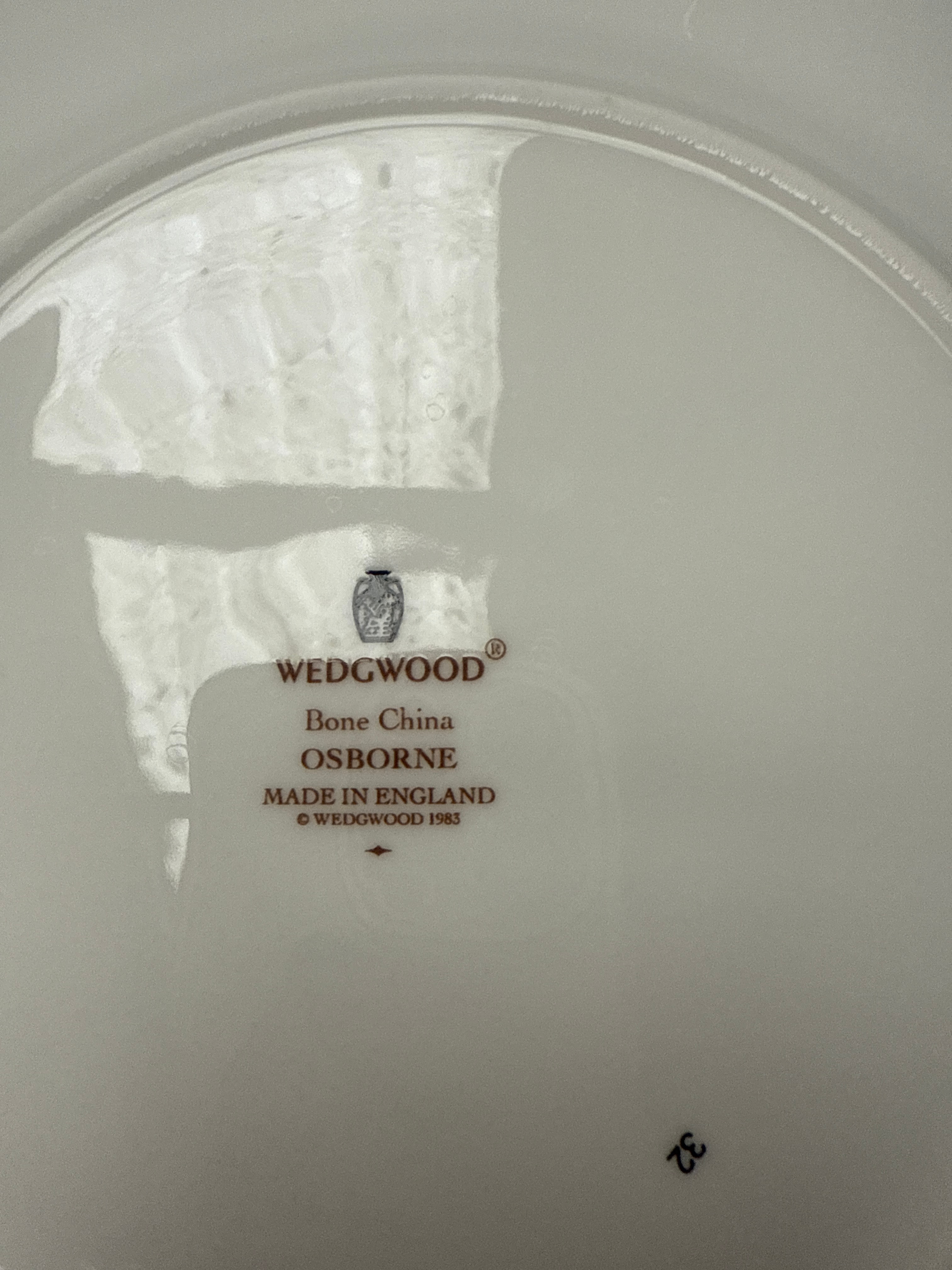 A set of Wedgwood ‘Osborne’ bone china dinnerware and tea service, manufactured in England in 1983. The set features a classic white ground decorated with a traditional floral motif, incorporating colorful garlands, dark blue-black bands, and delicate gold trim. Individual pieces typically display a central floral medallion and a matching border pattern. The collection comprises an oval serving platter, a lidded soup tureen, a gravy boat with underplate, a teapot, a lidded sugar bowl, a creamer, a collection of dinner plates, side plates, teacups, and saucers.